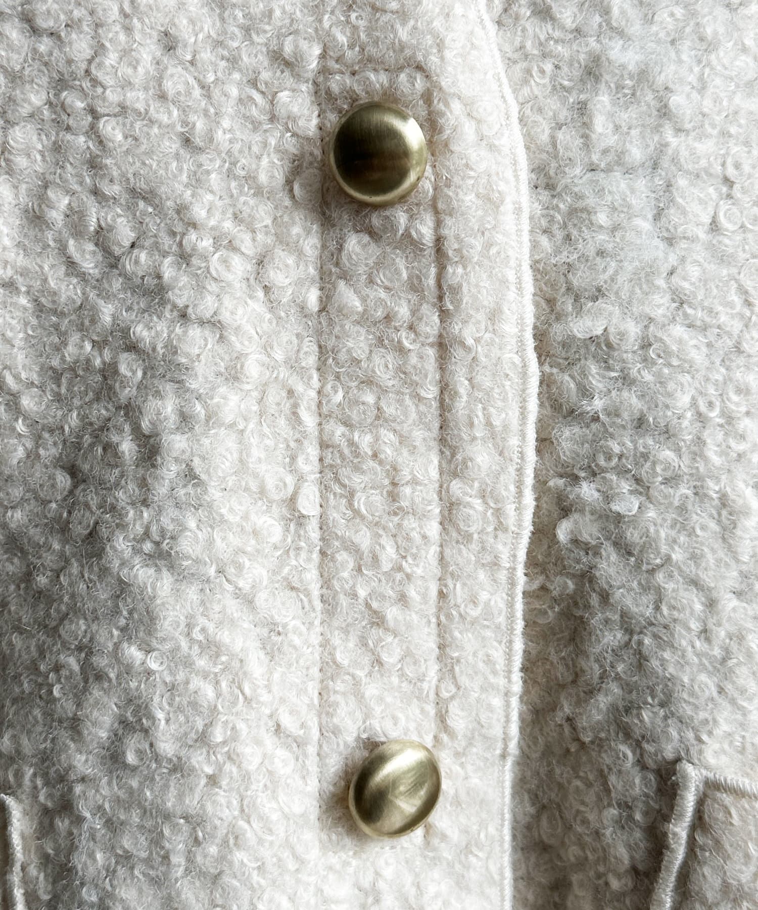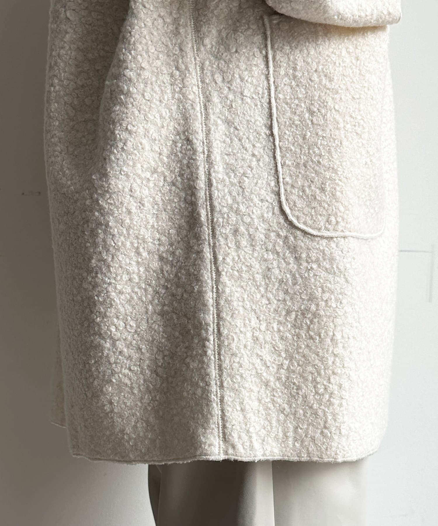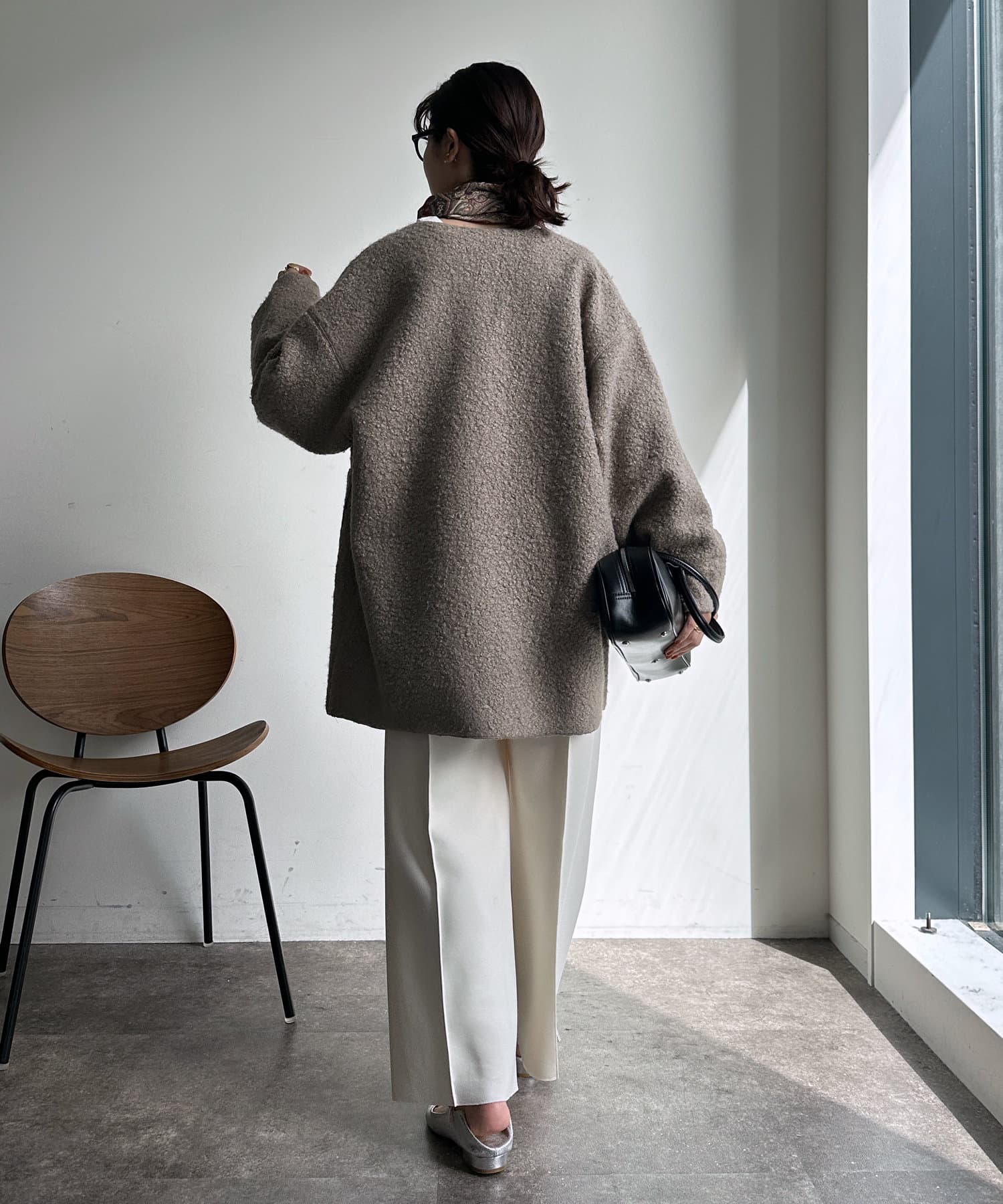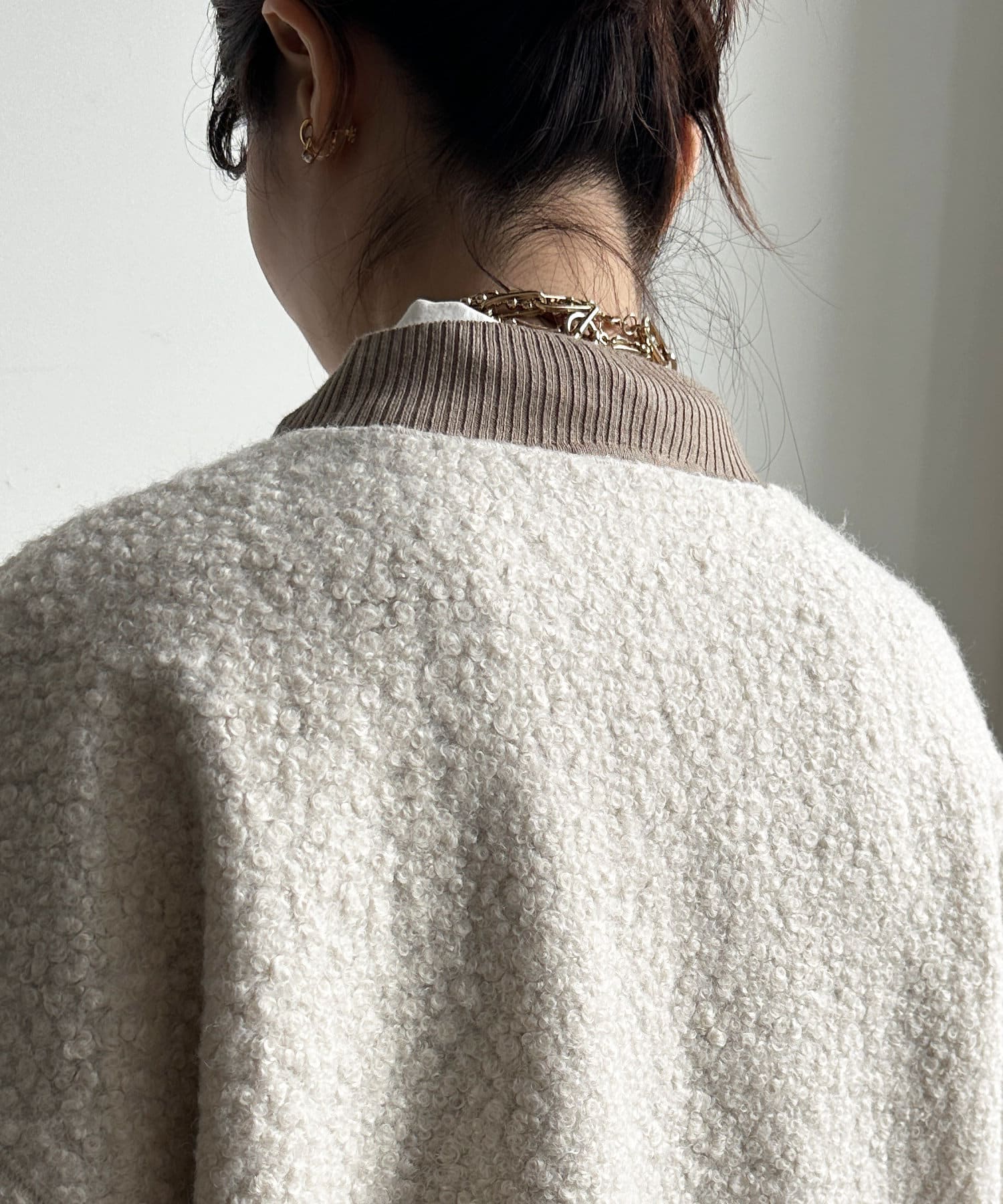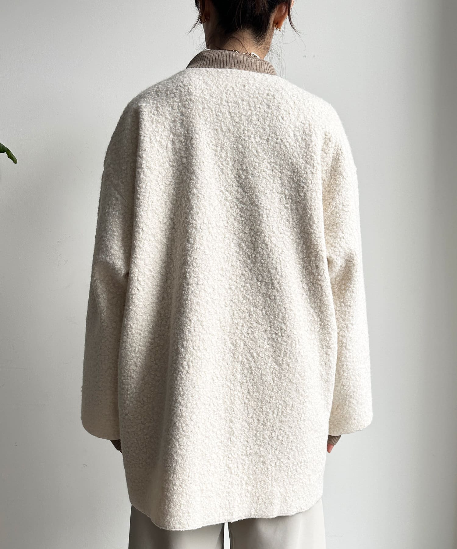 すっきりとしたノーカラーのデザインと、もこもことしたブークレーの表面感ある素材が魅力の1着。
