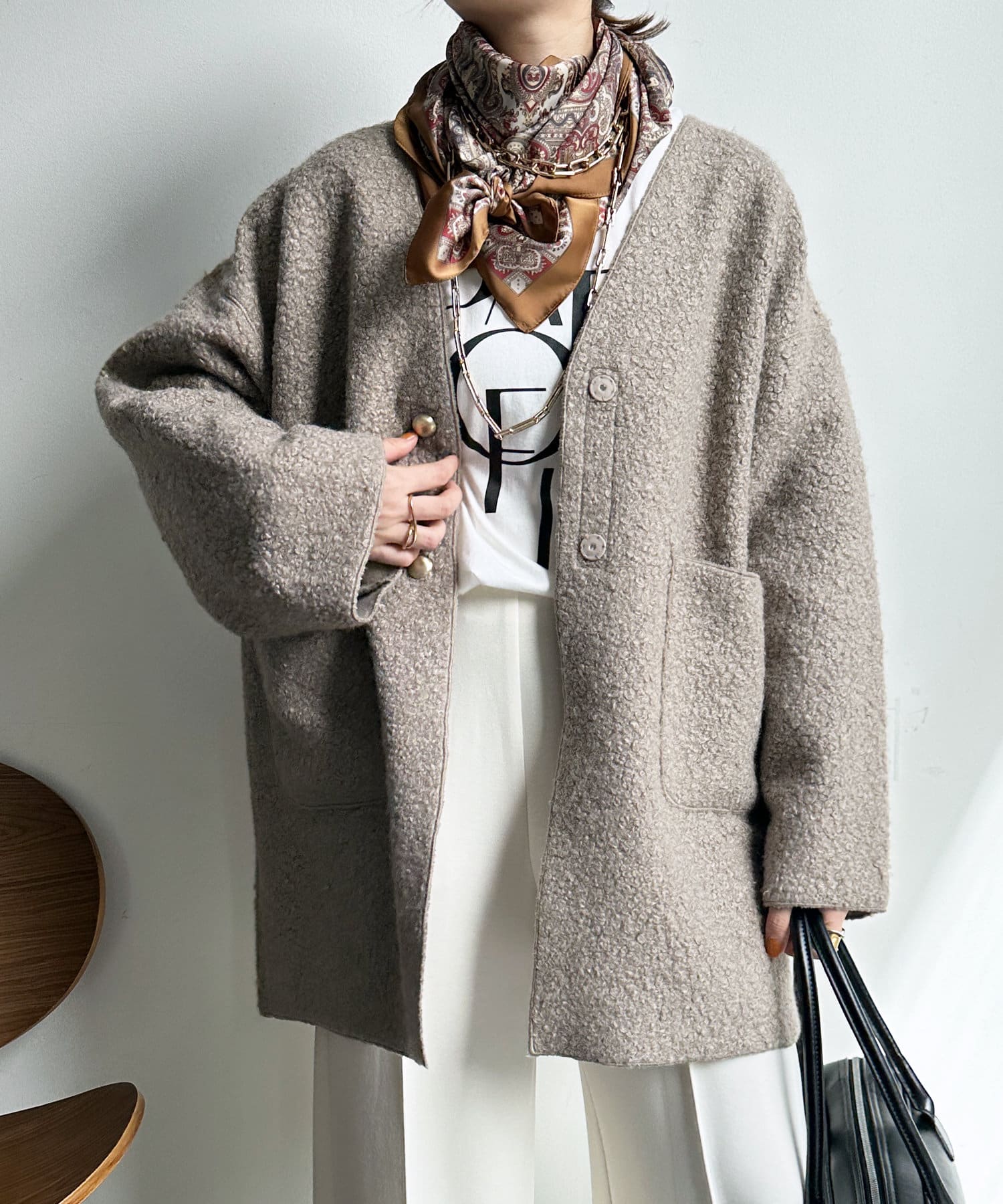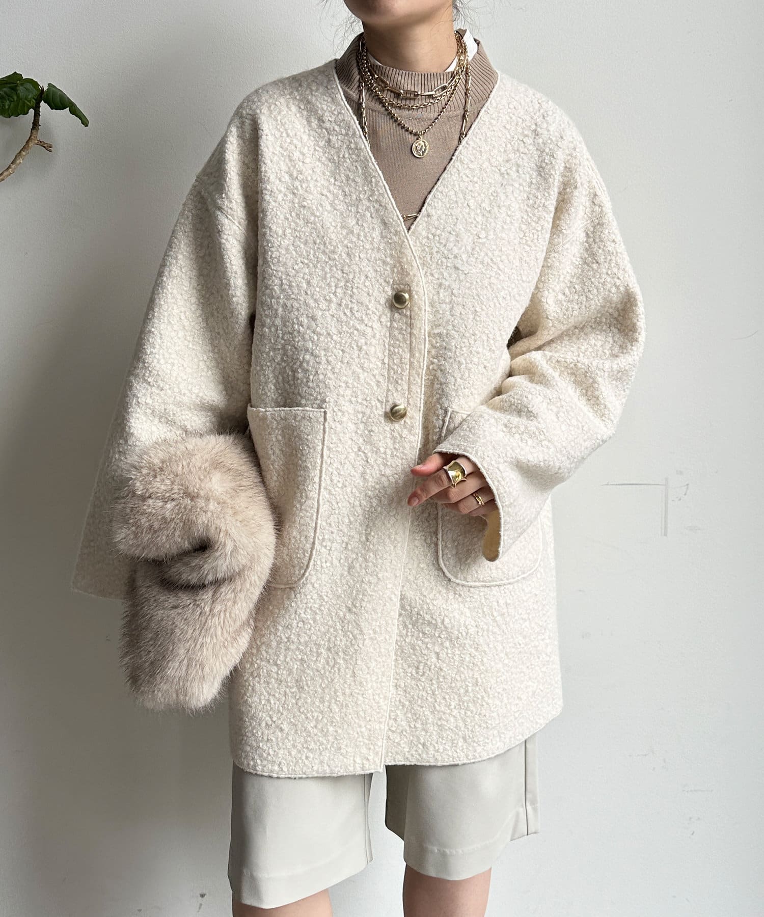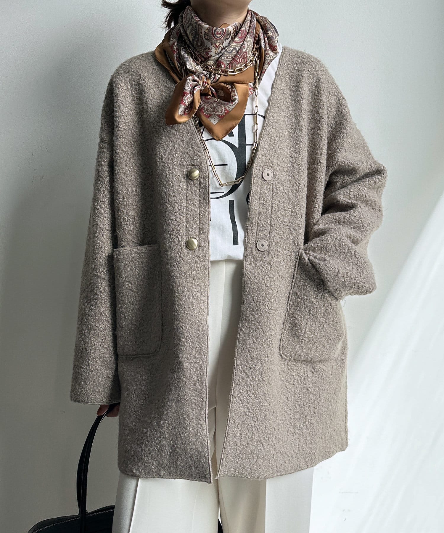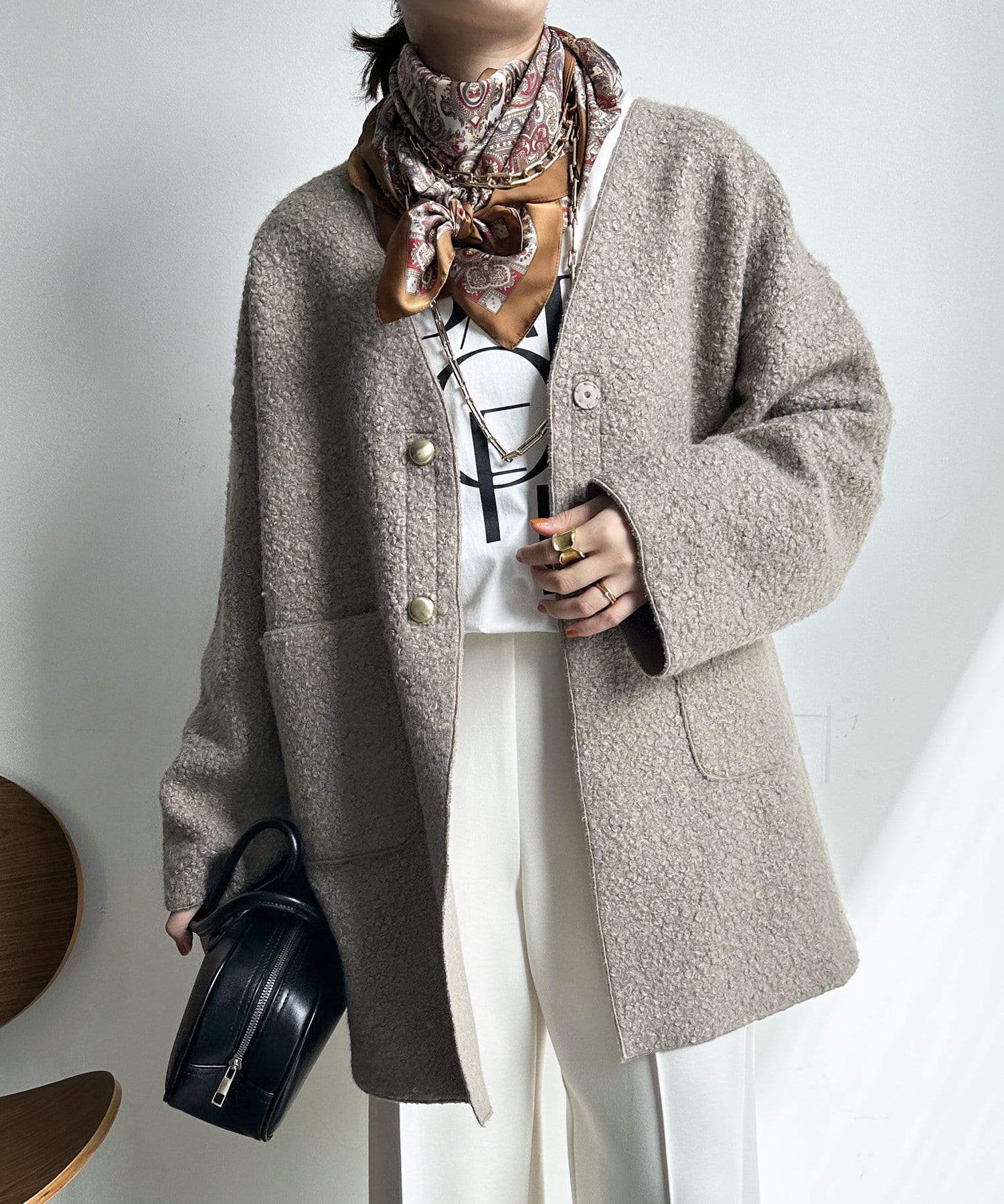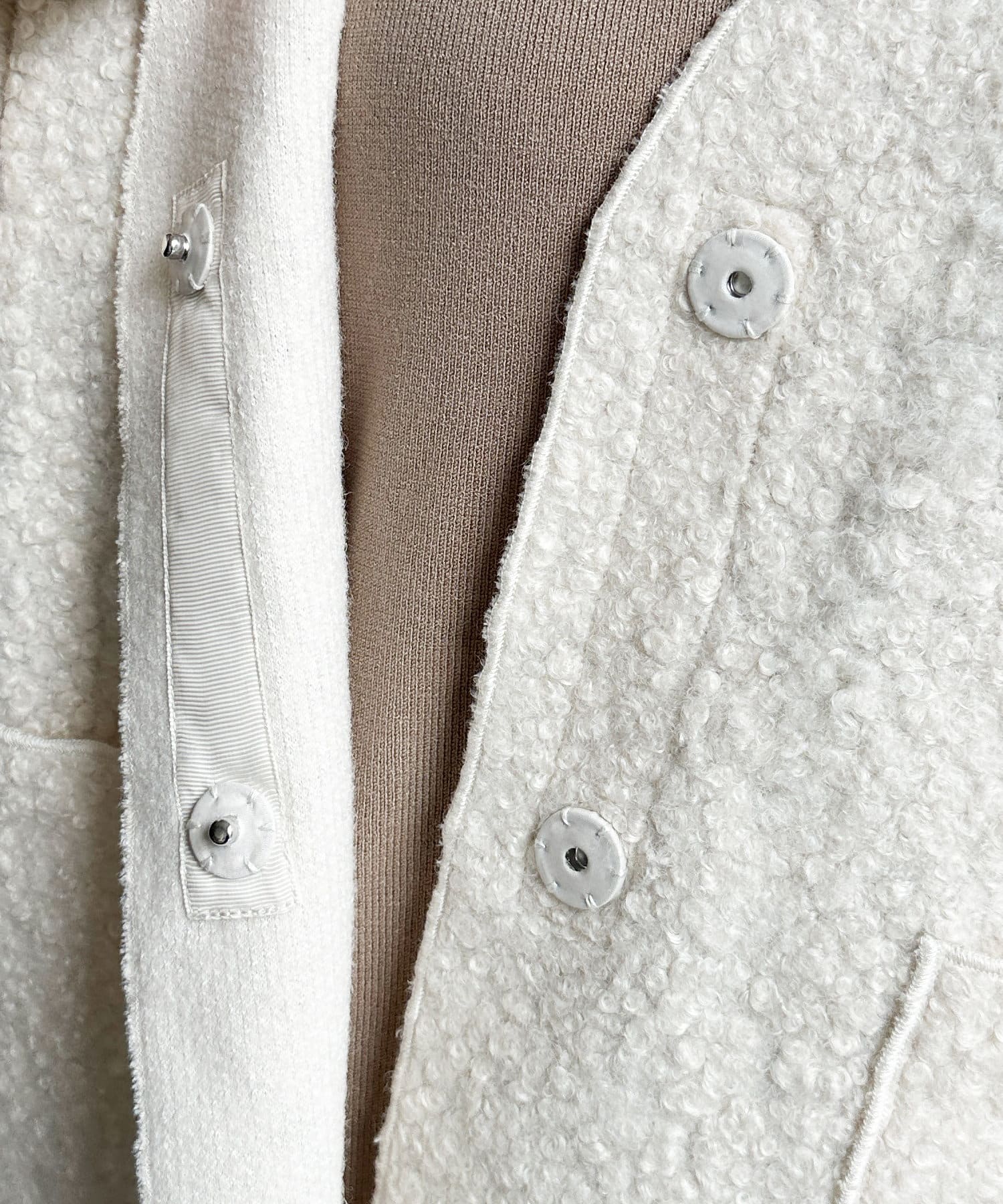 すっきりとしたノーカラーのデザインと、もこもことしたブークレーの表面感ある素材が魅力の1着。