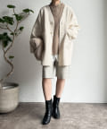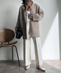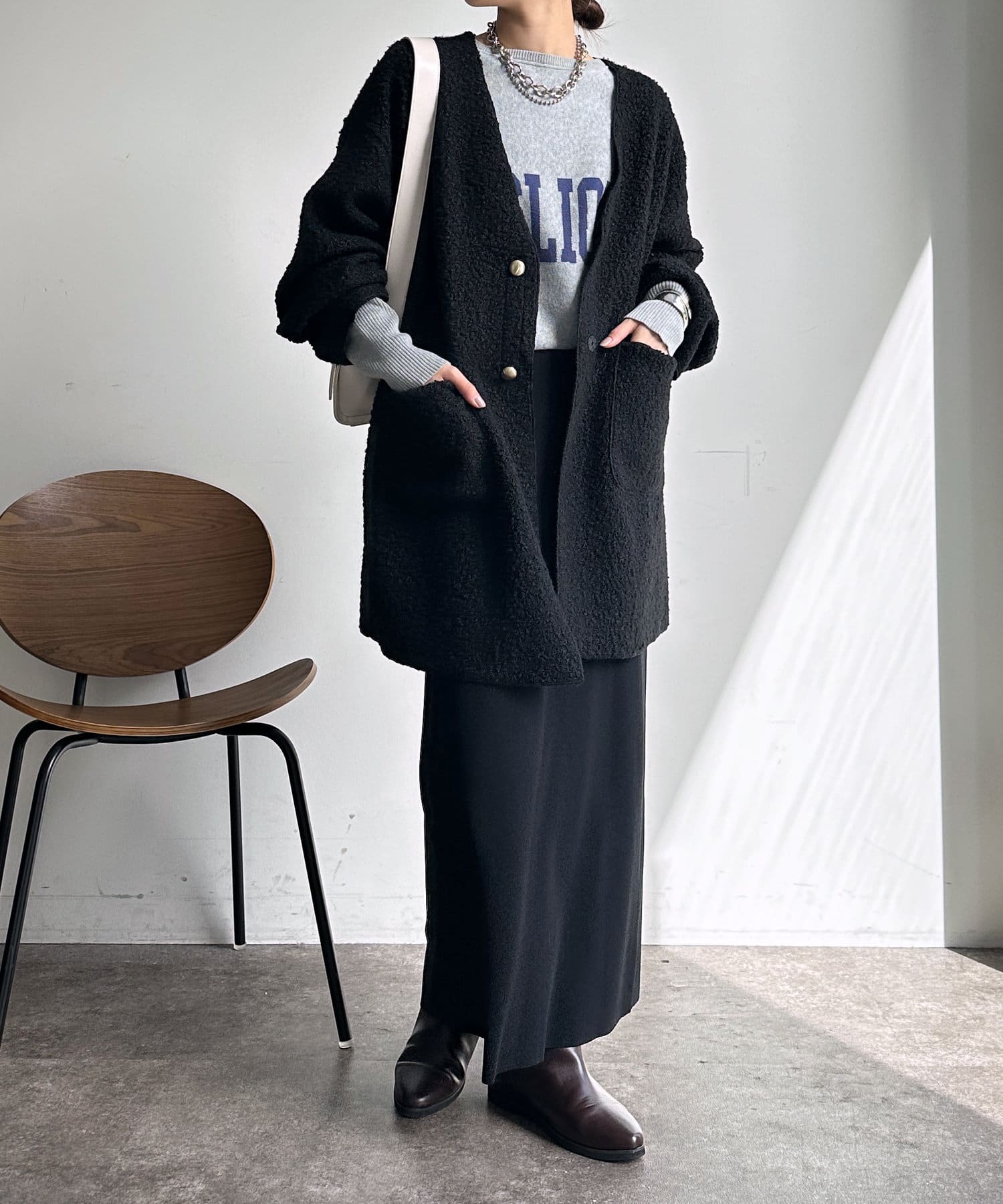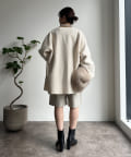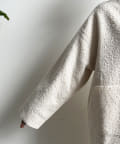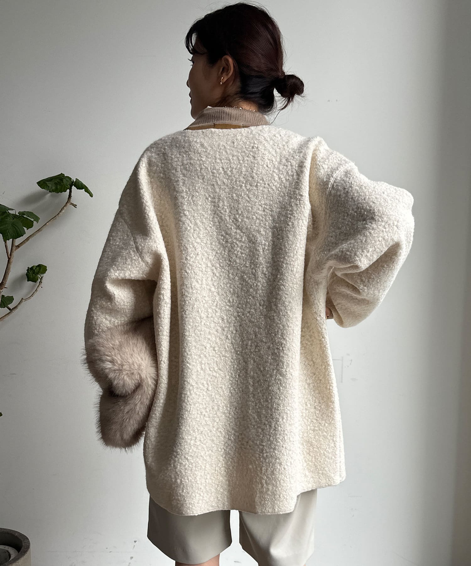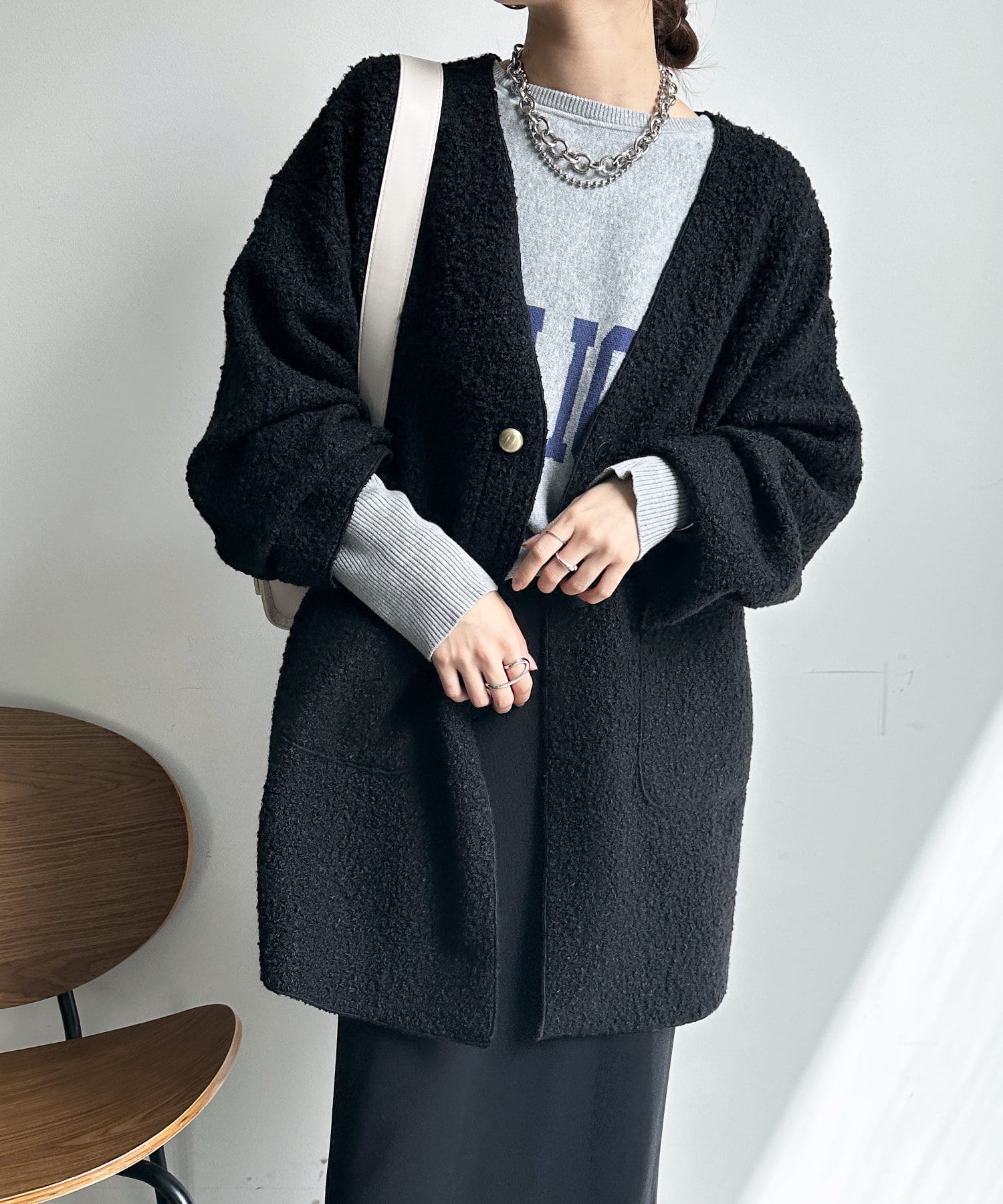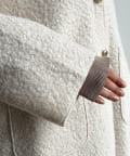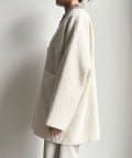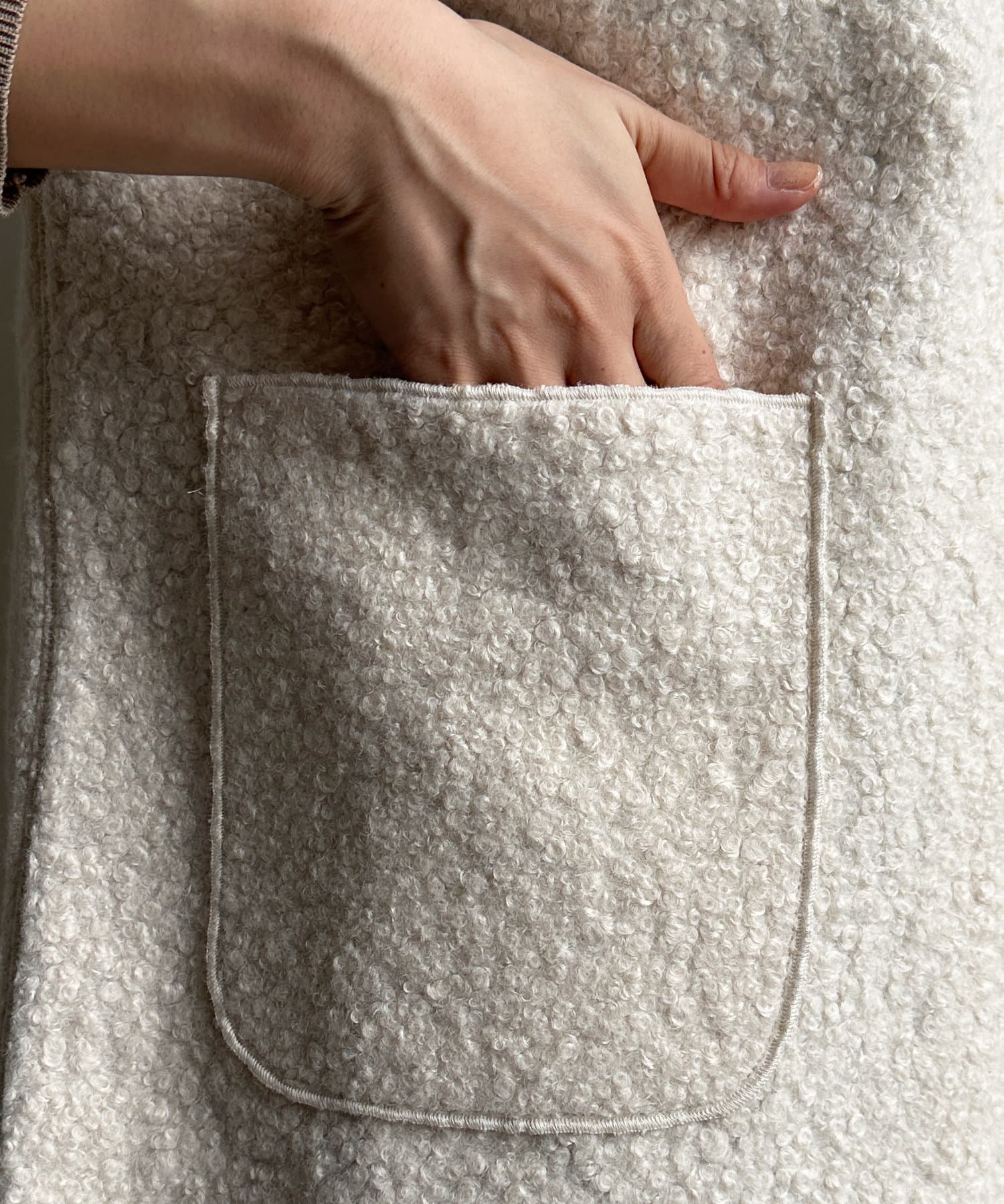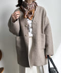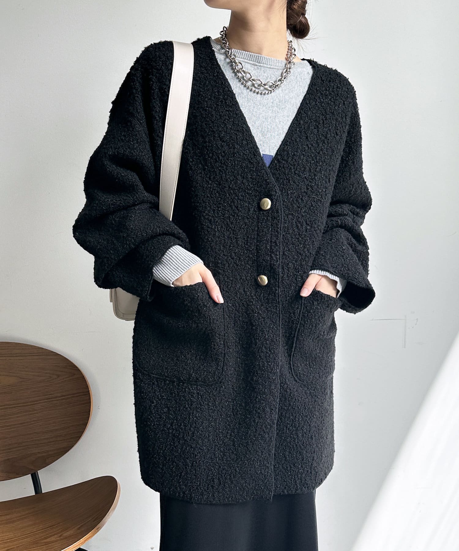 すっきりとしたノーカラーのデザインと、もこもことしたブークレーの表面感ある素材が魅力の1着。