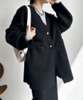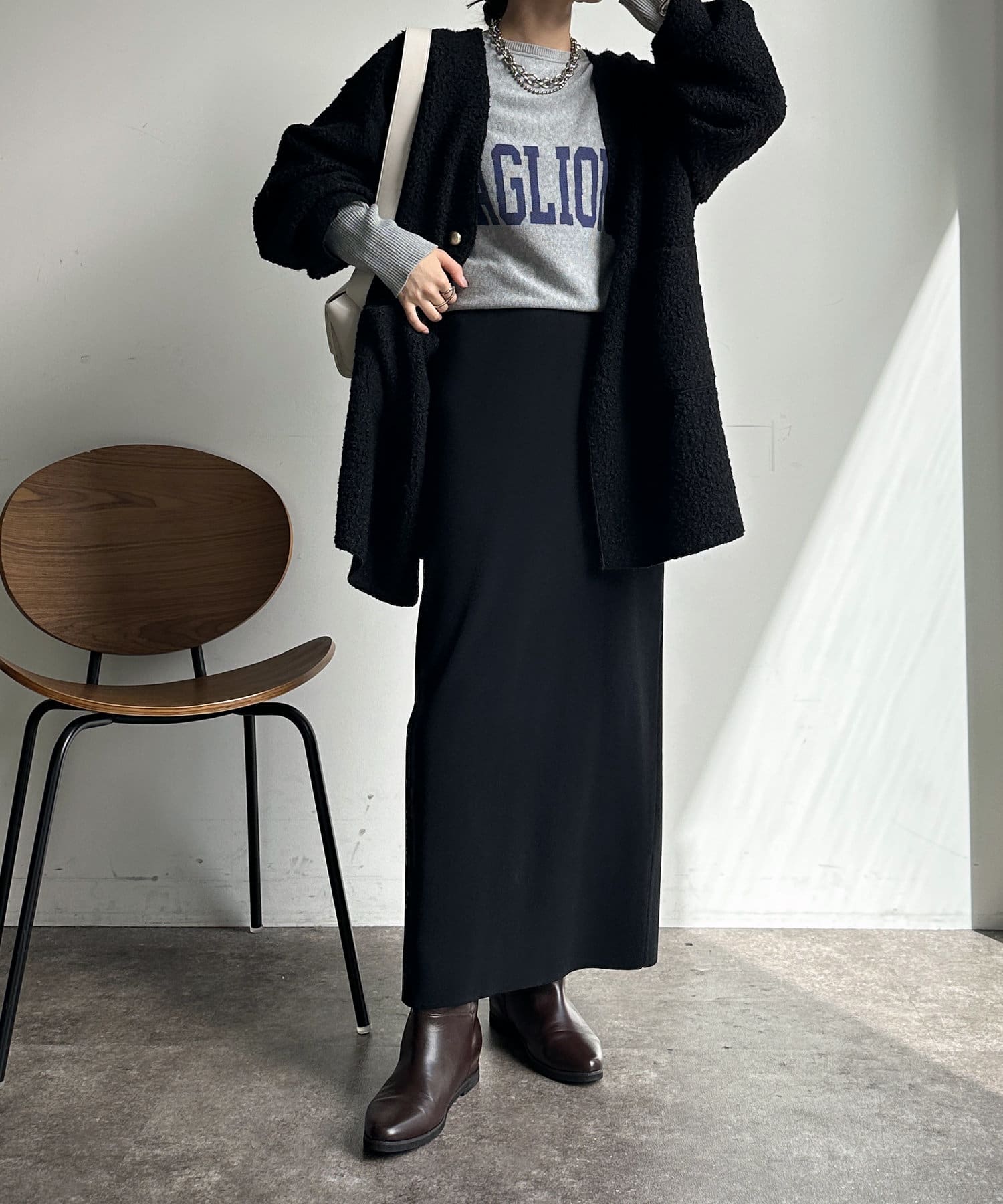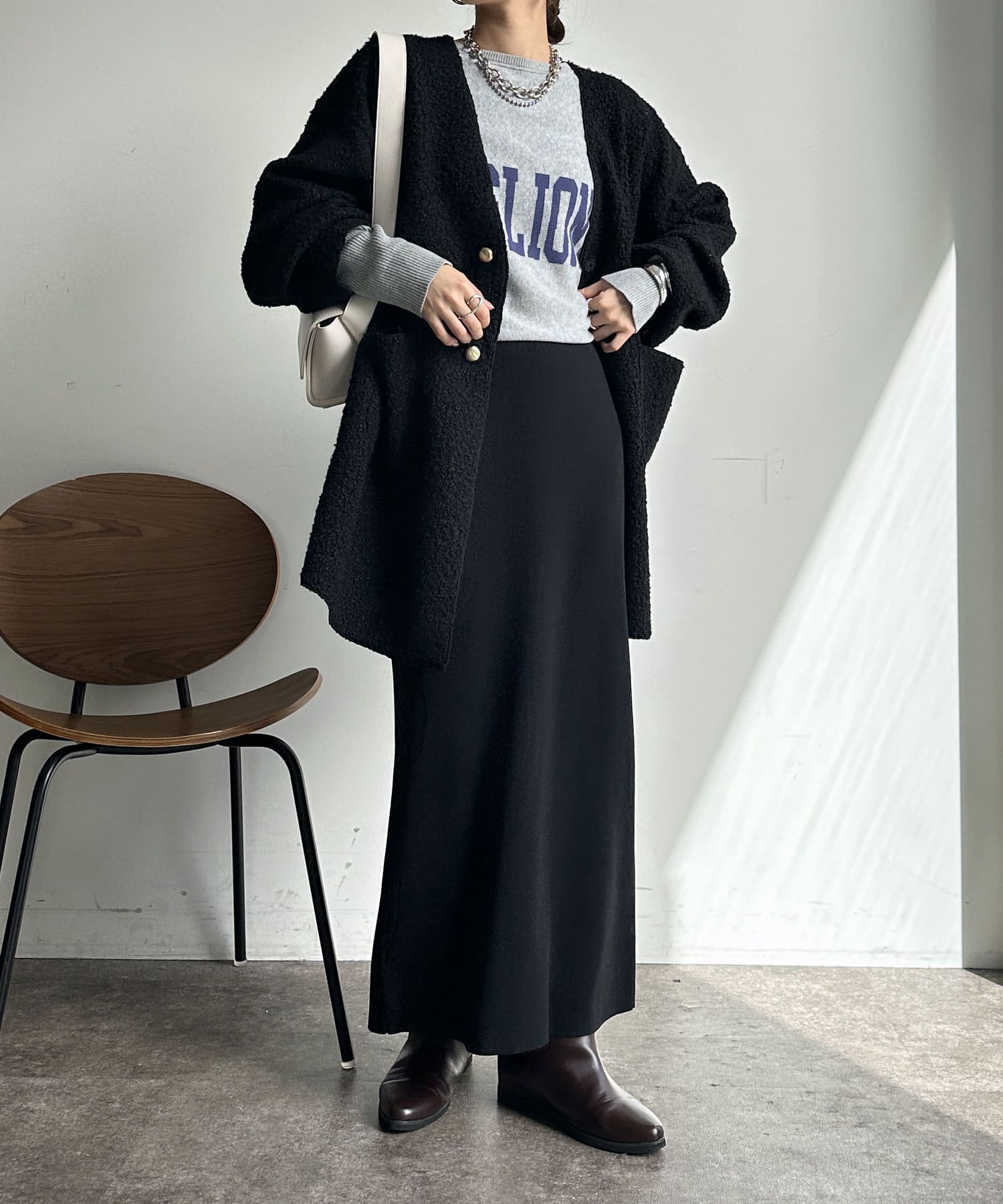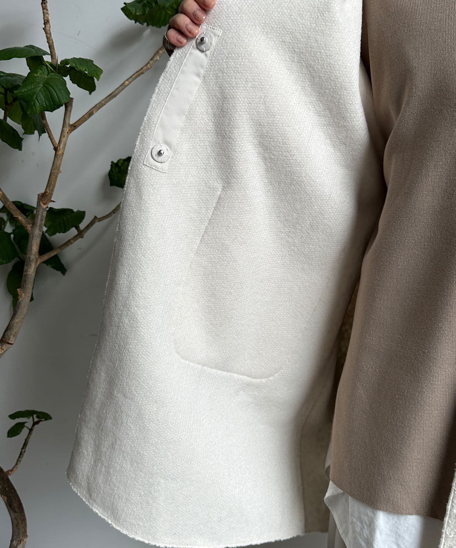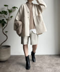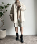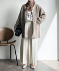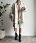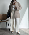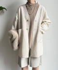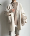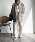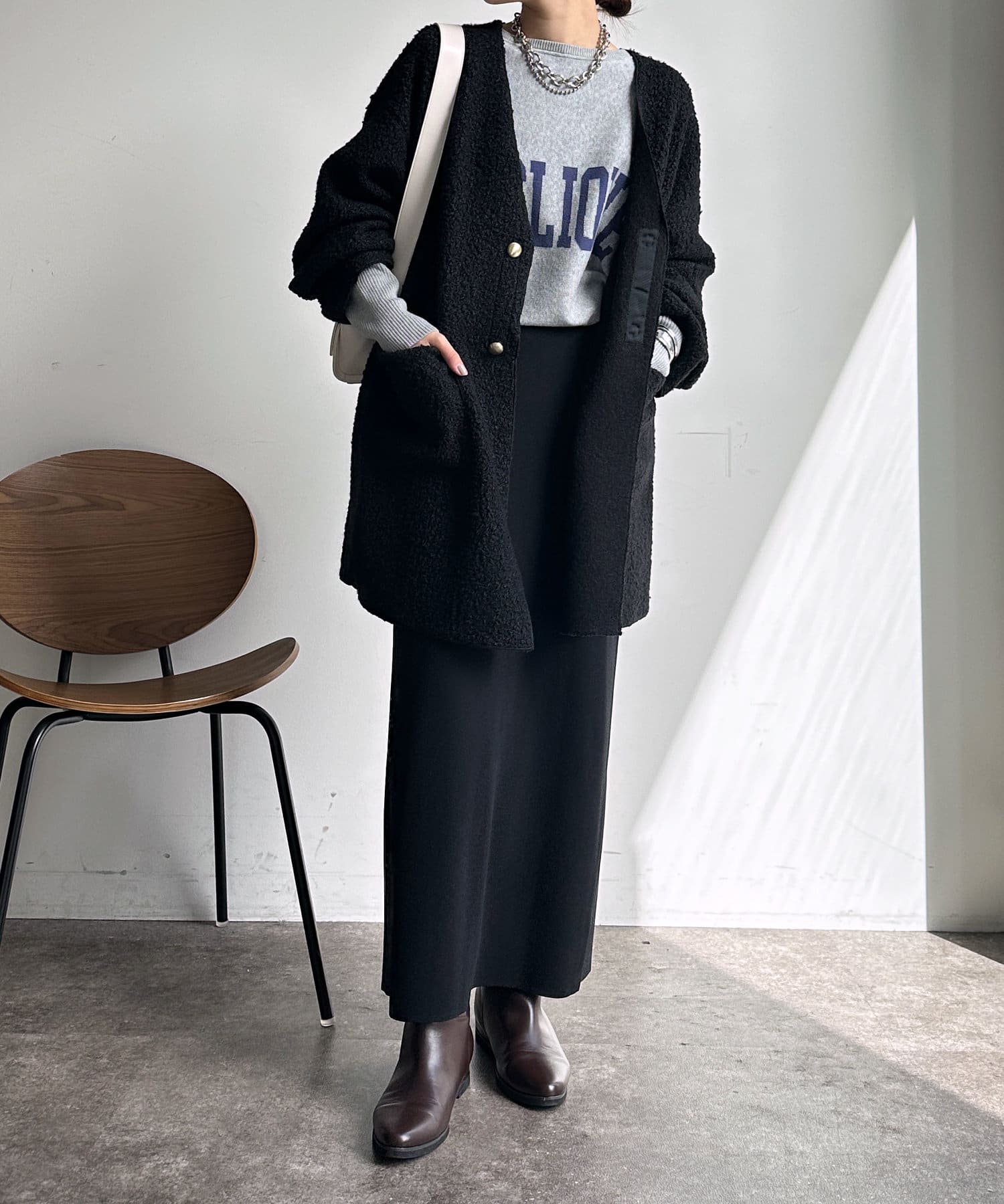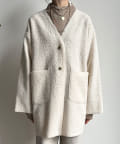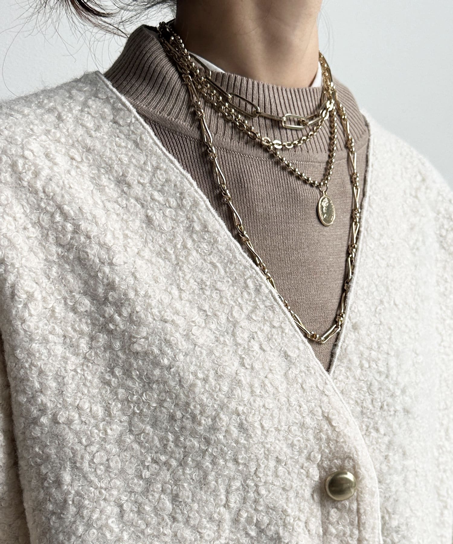 すっきりとしたノーカラーのデザインと、もこもことしたブークレーの表面感ある素材が魅力の1着。
