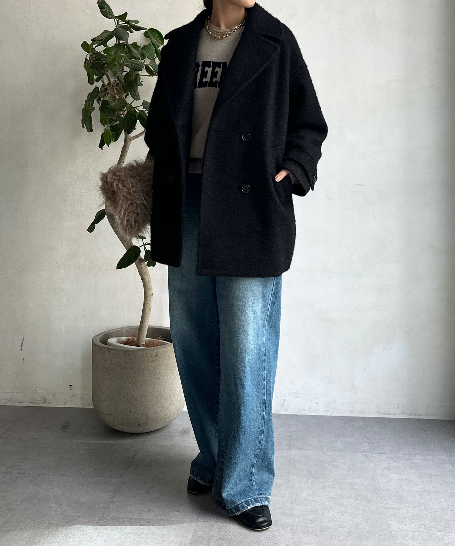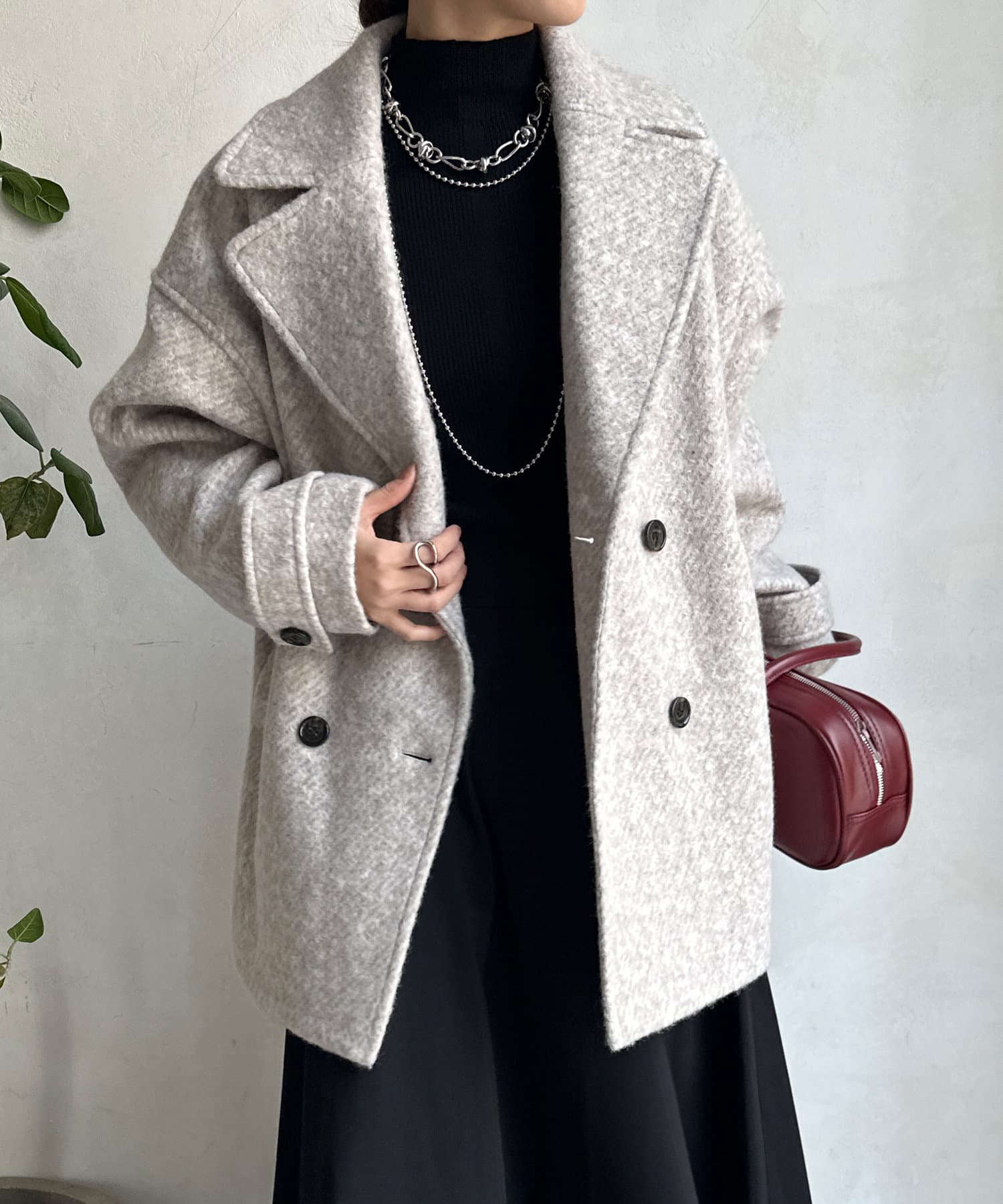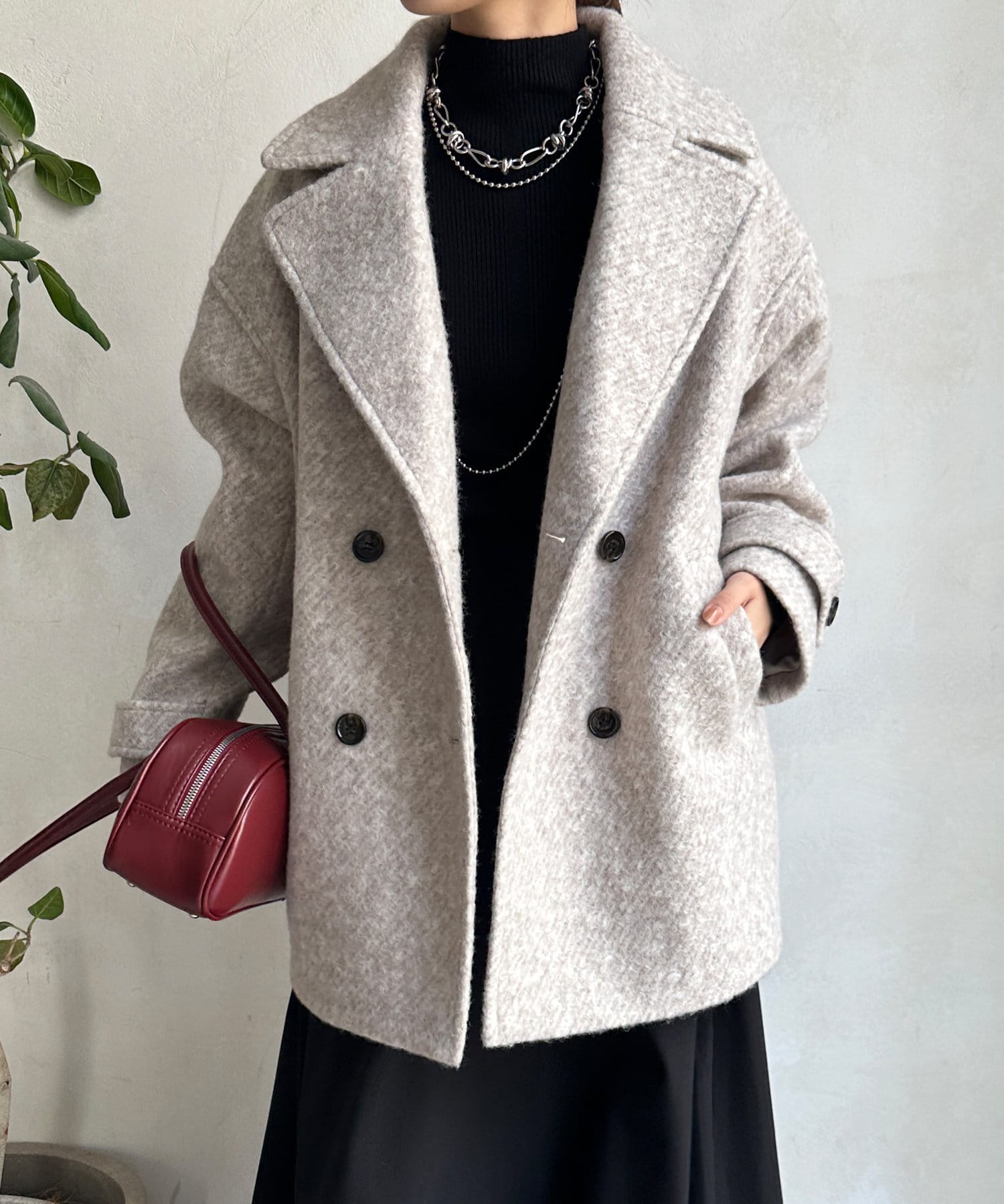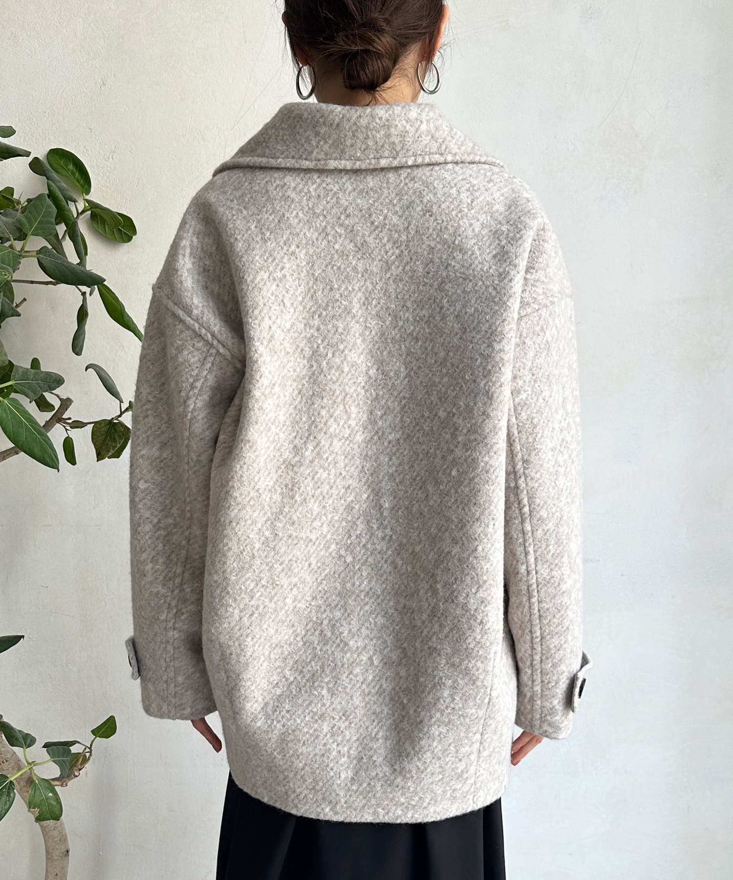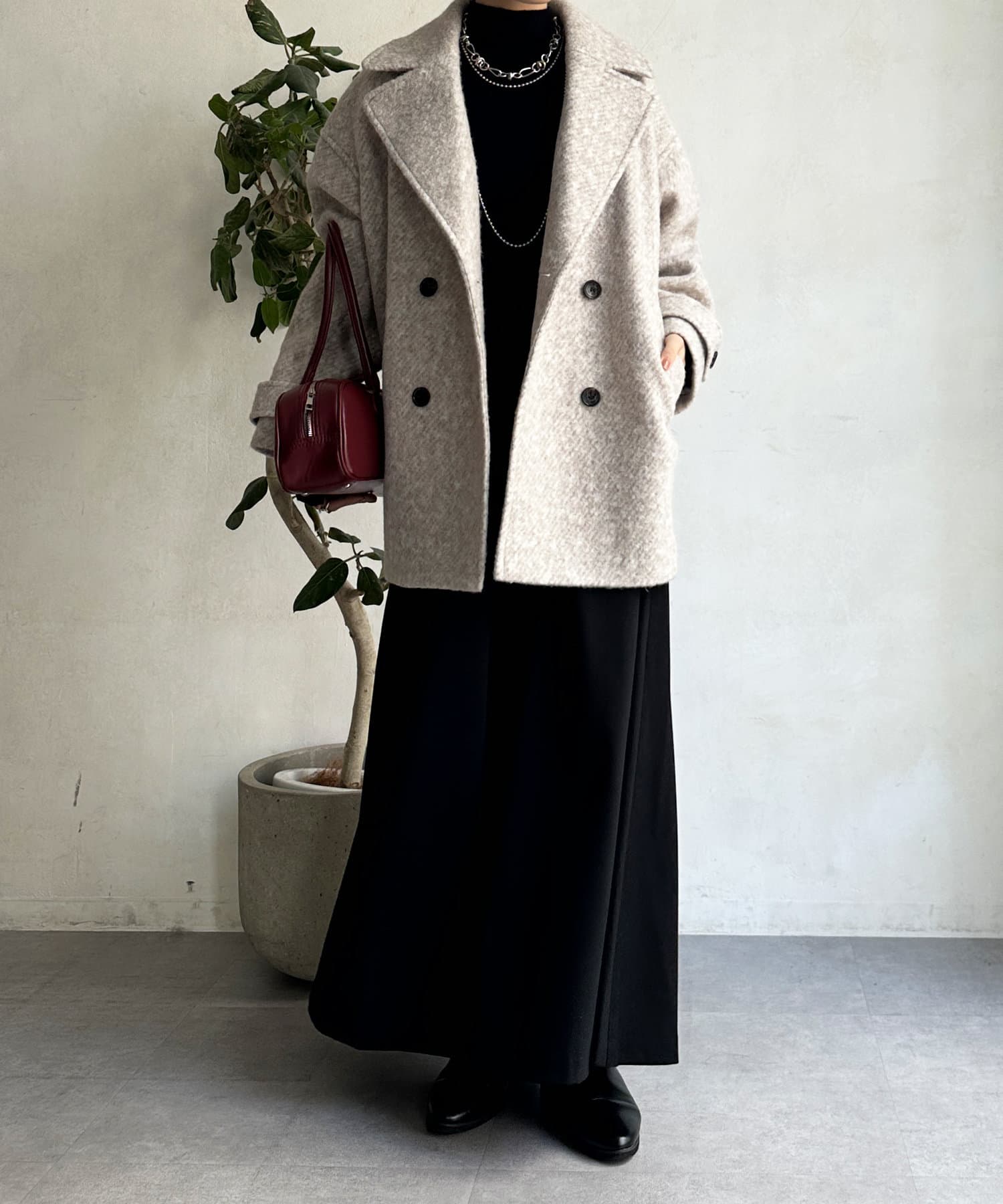 大きめの襟とリラックスしたシルエットがポイントのハーフ丈Pコート。