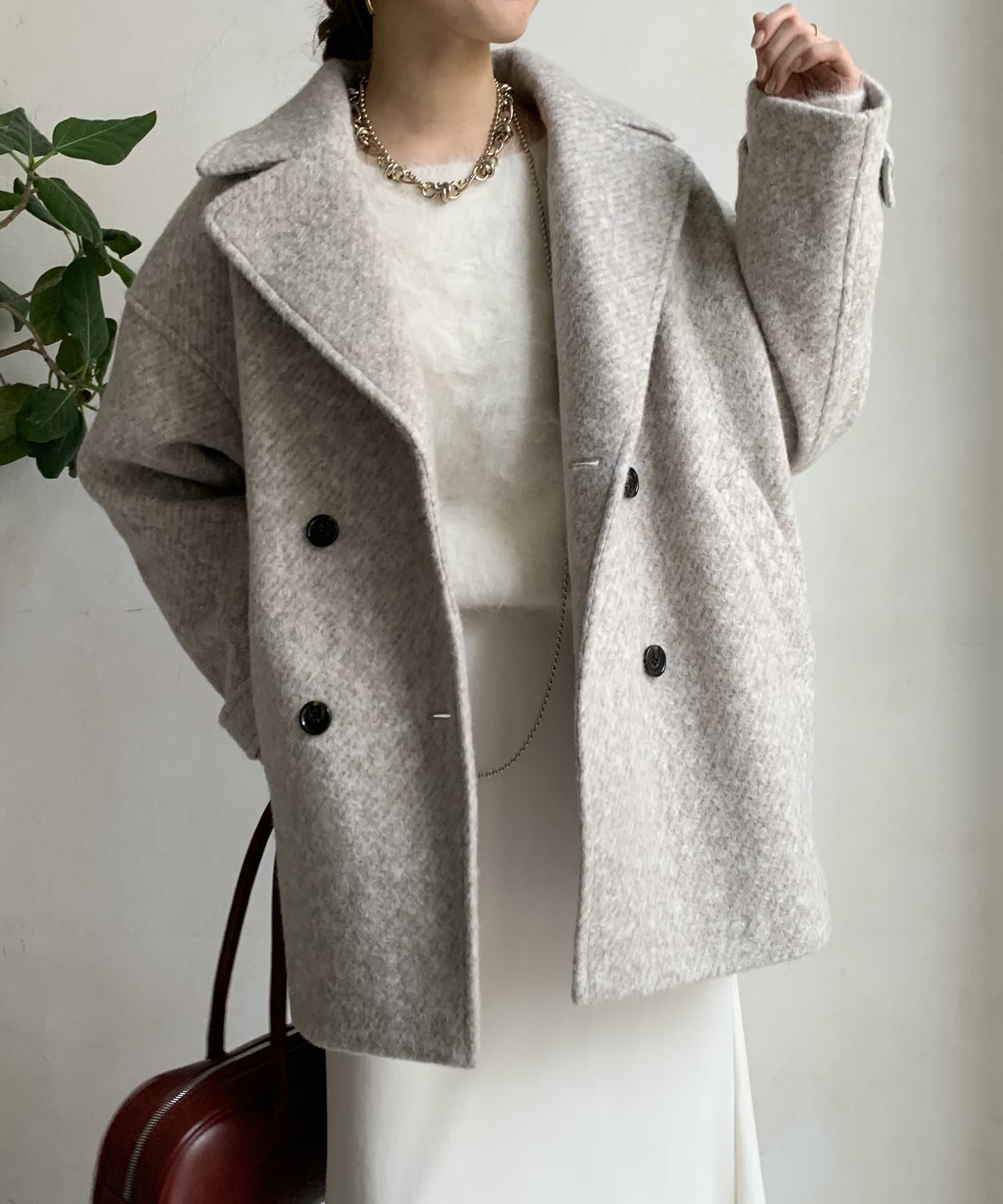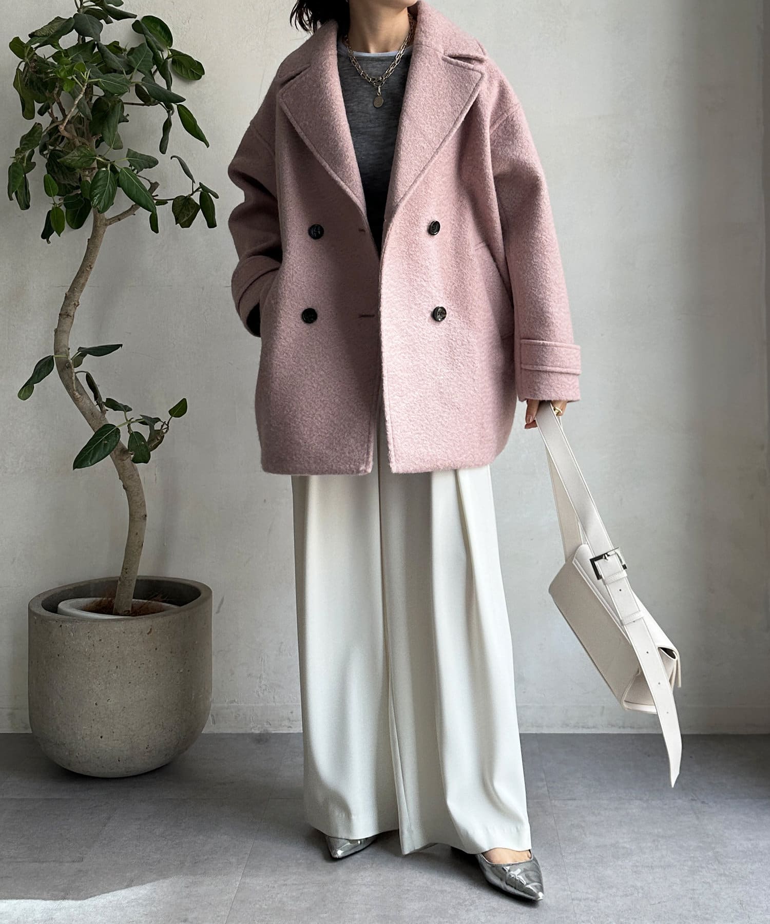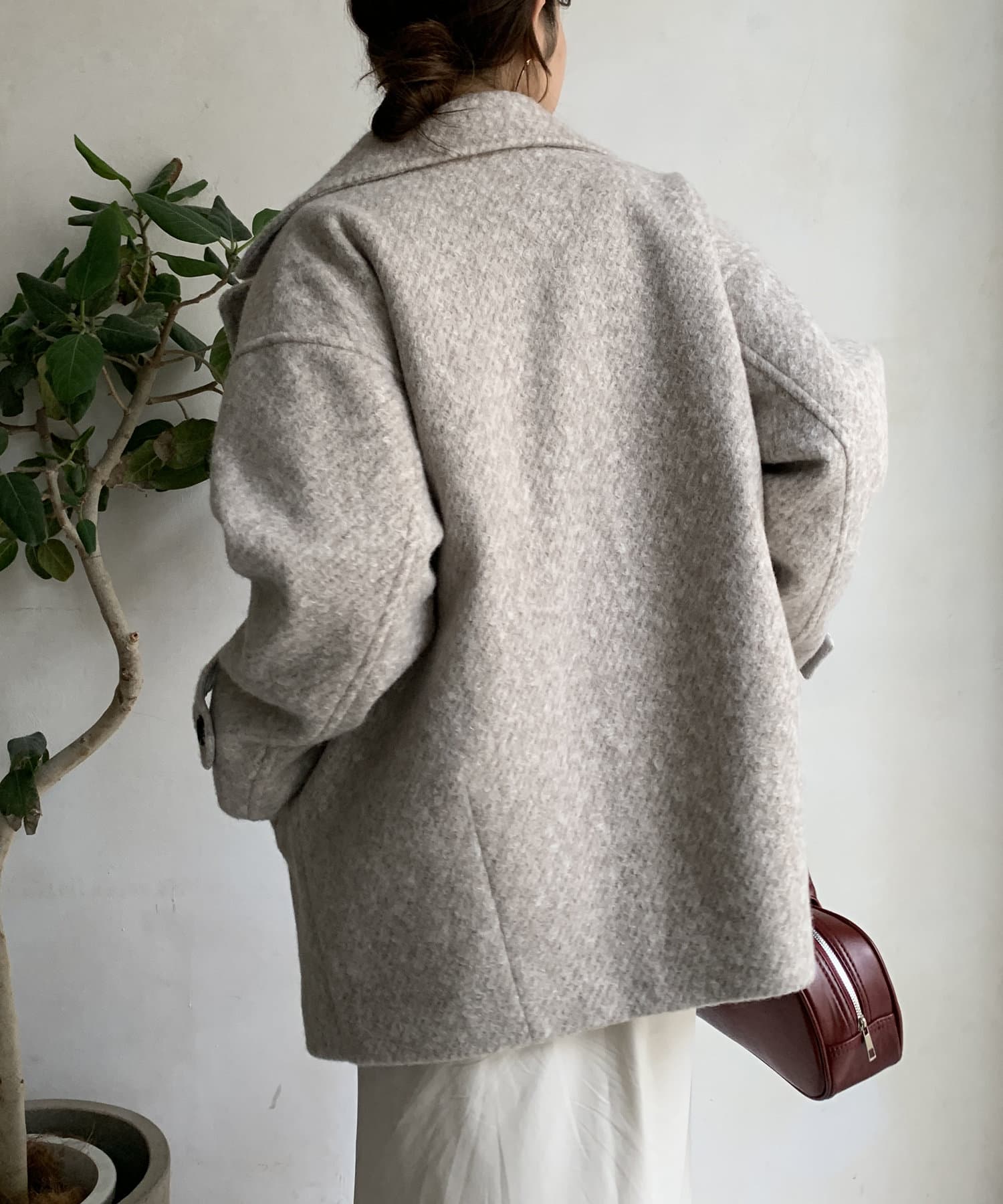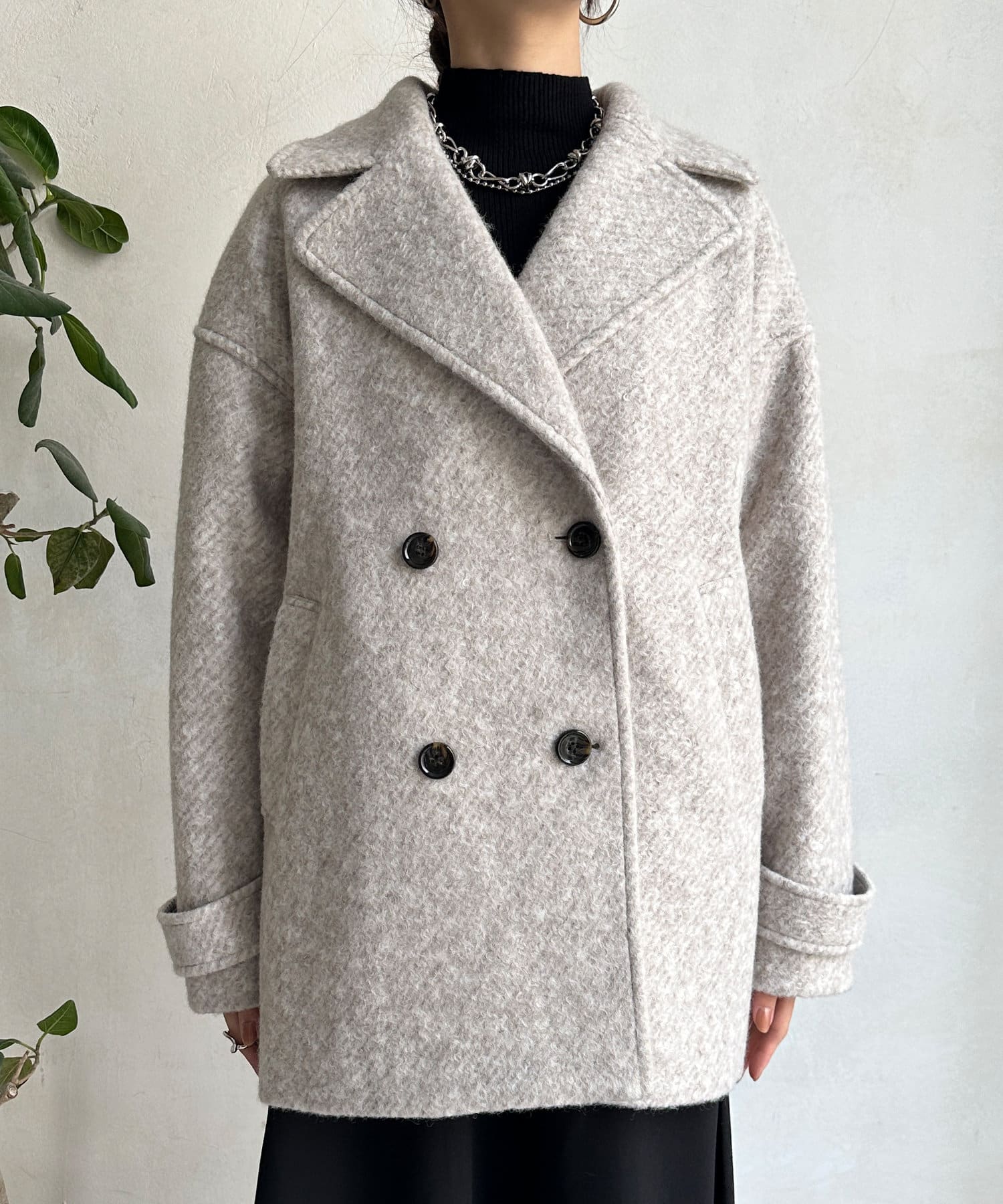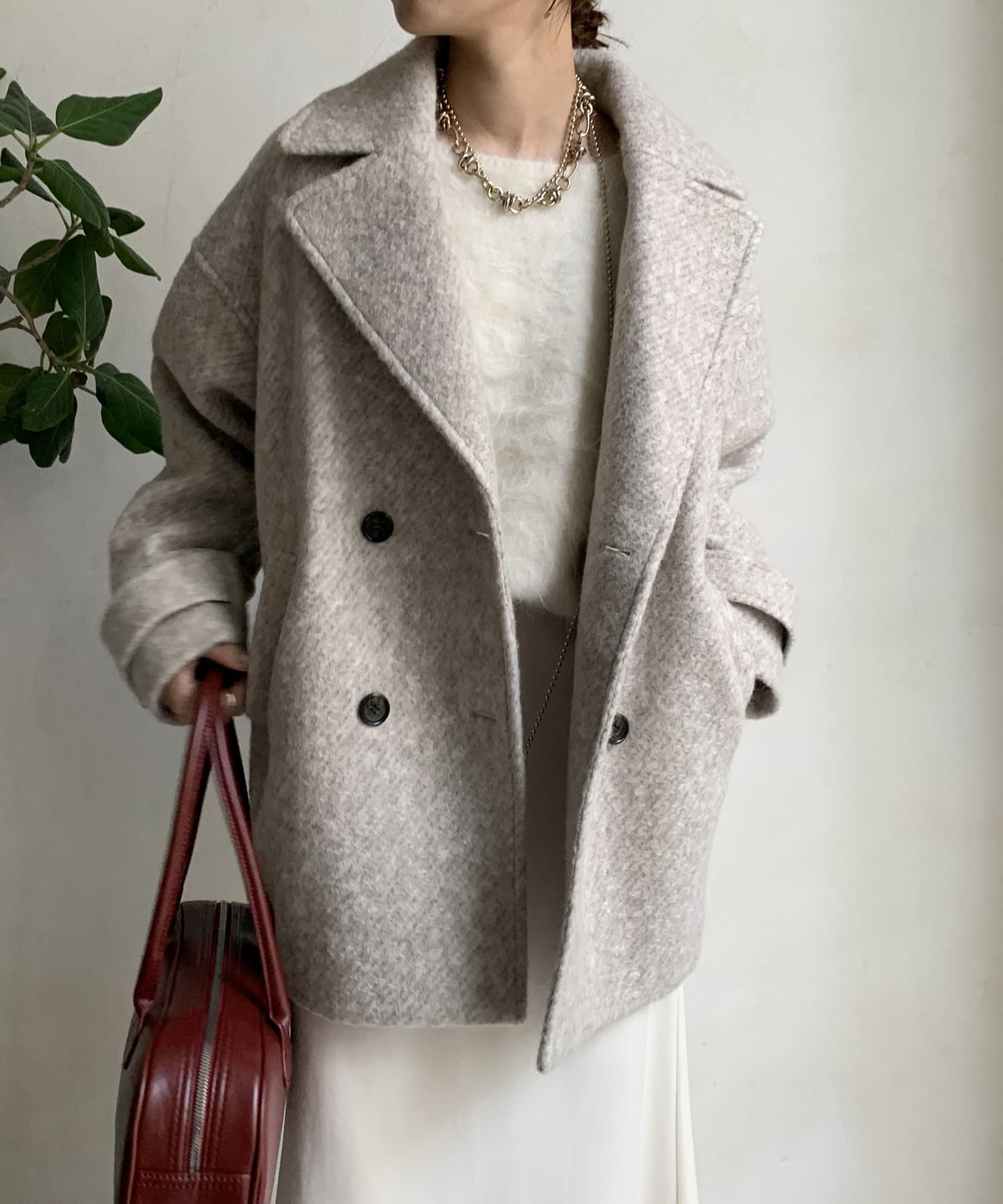 大きめの襟とリラックスしたシルエットがポイントのハーフ丈Pコート。