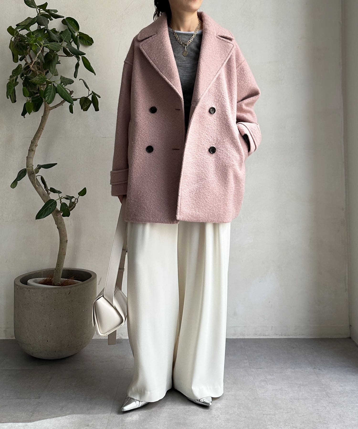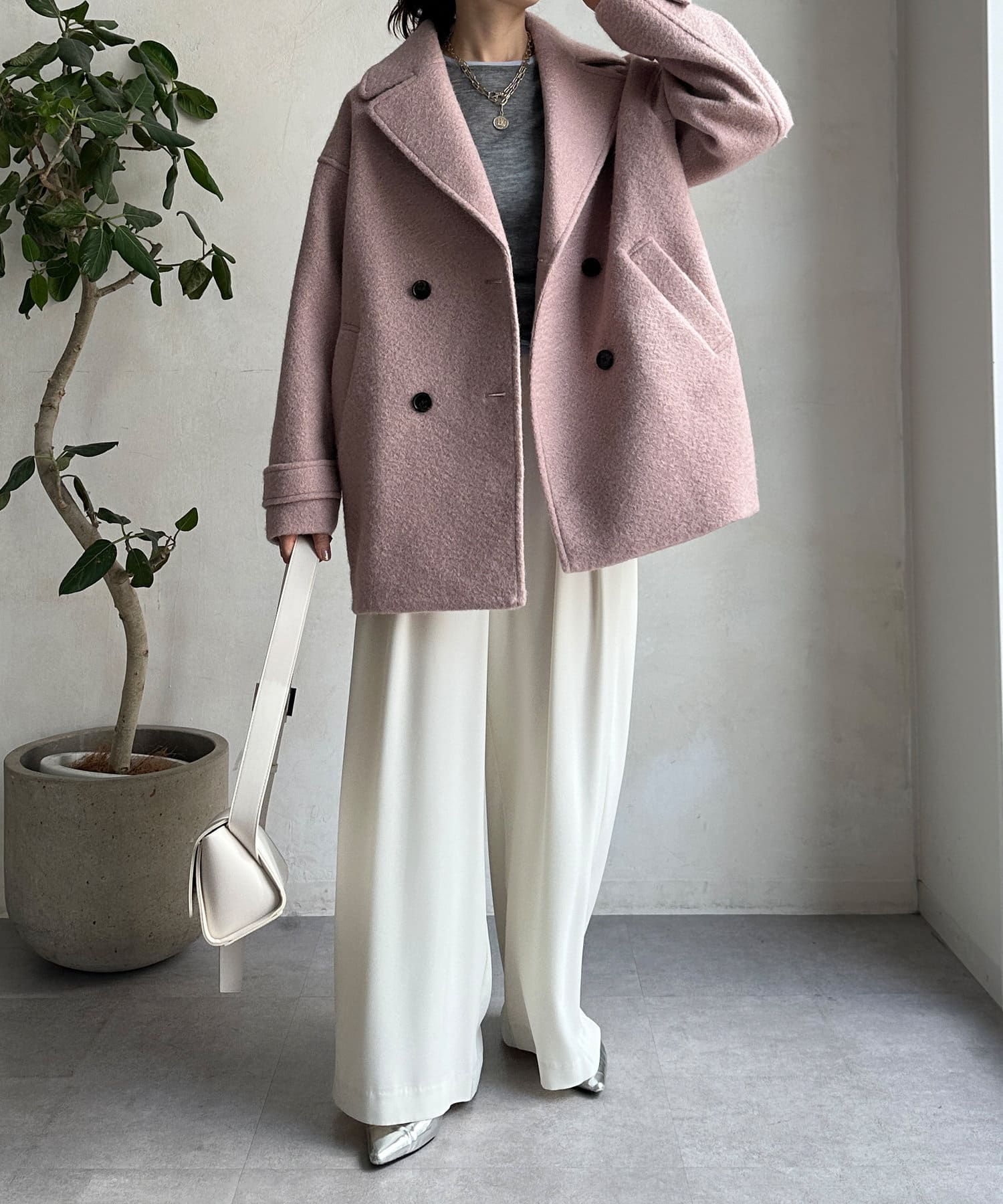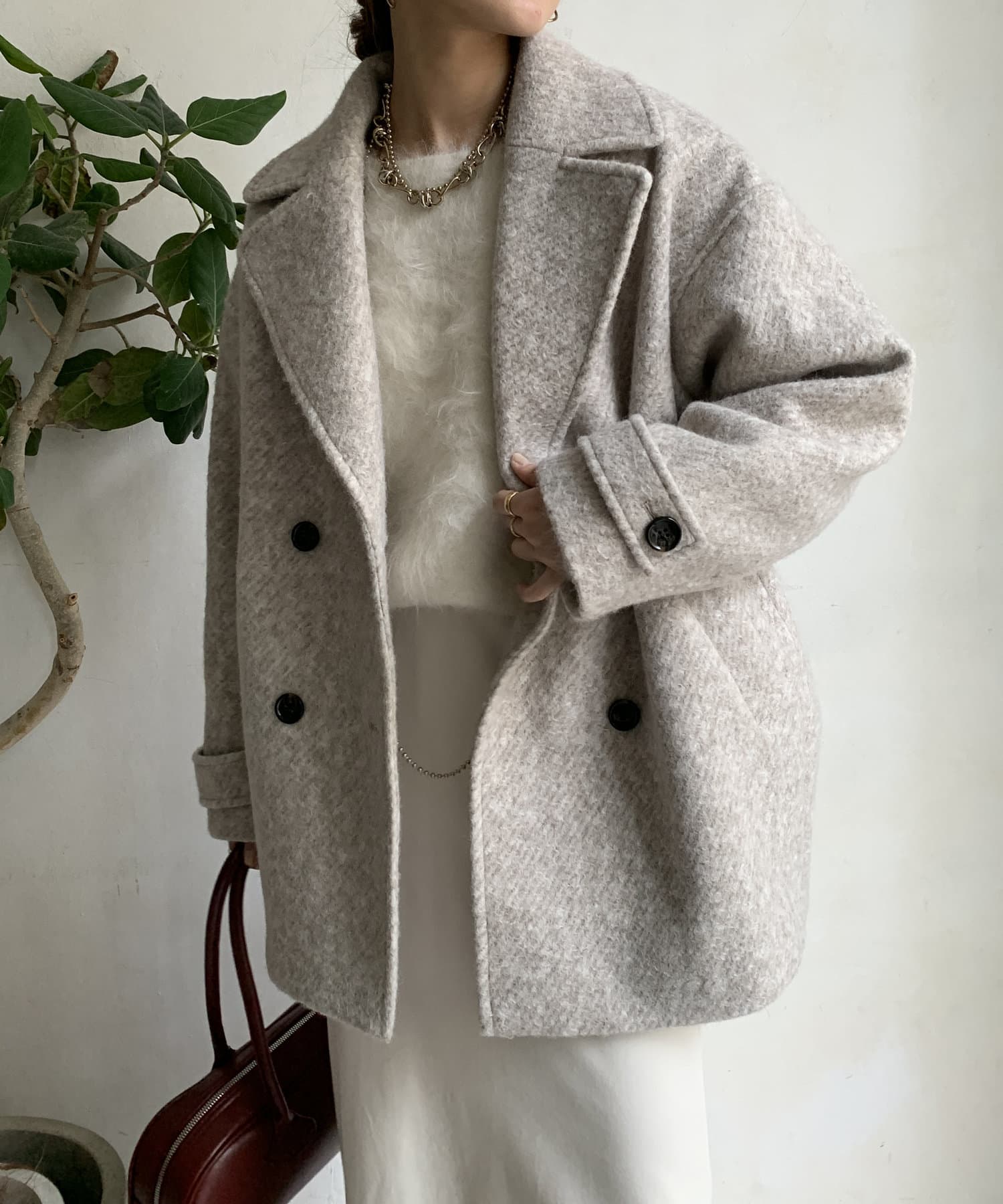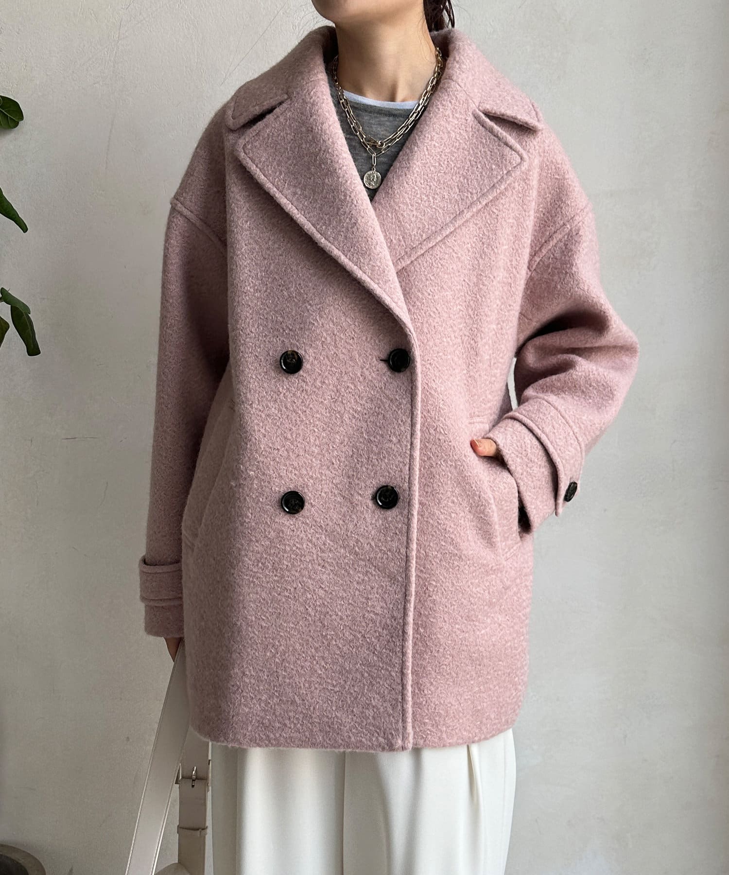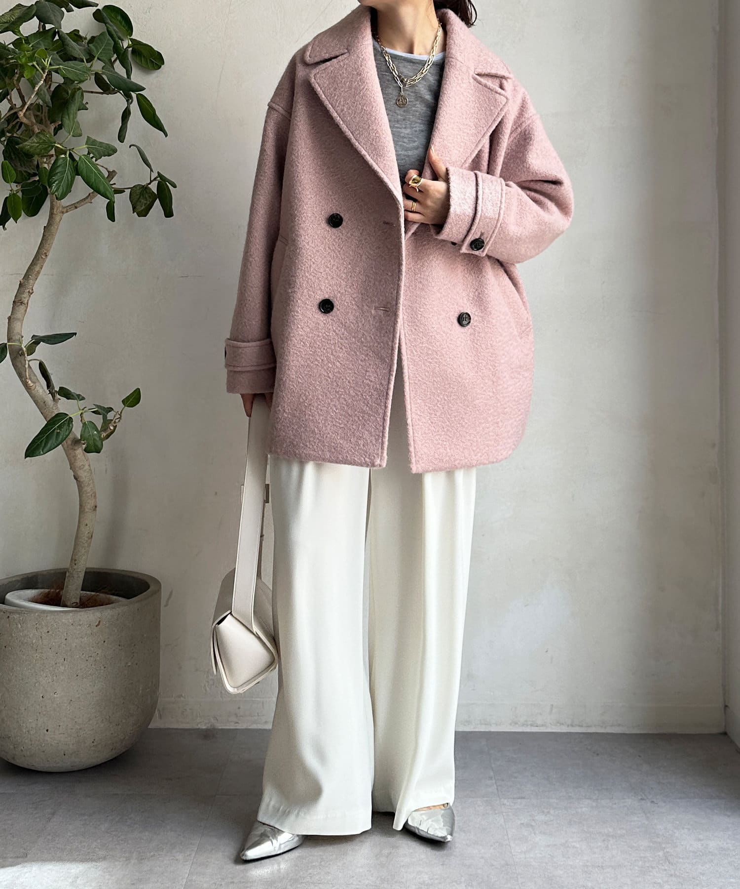 大きめの襟とリラックスしたシルエットがポイントのハーフ丈Pコート。