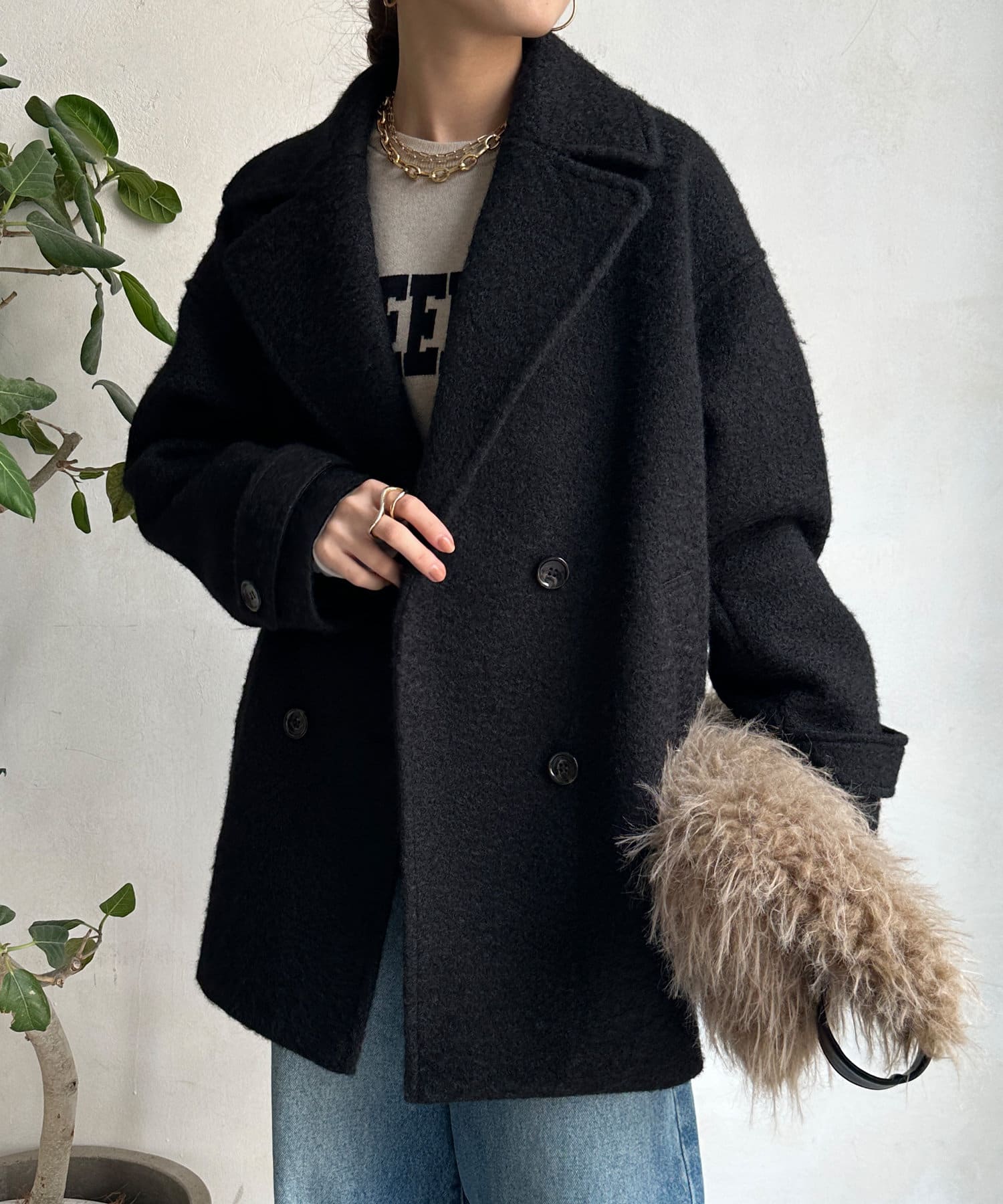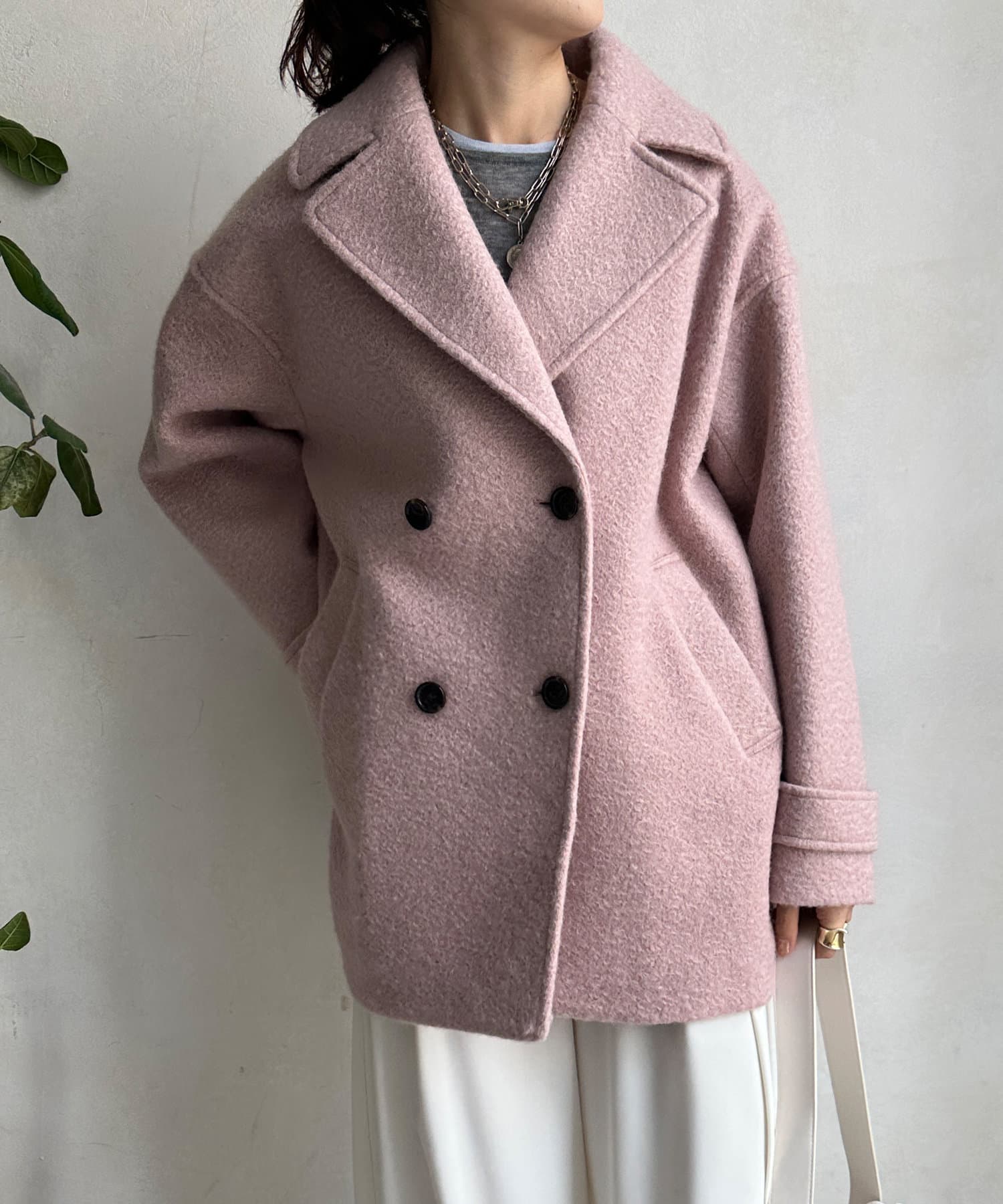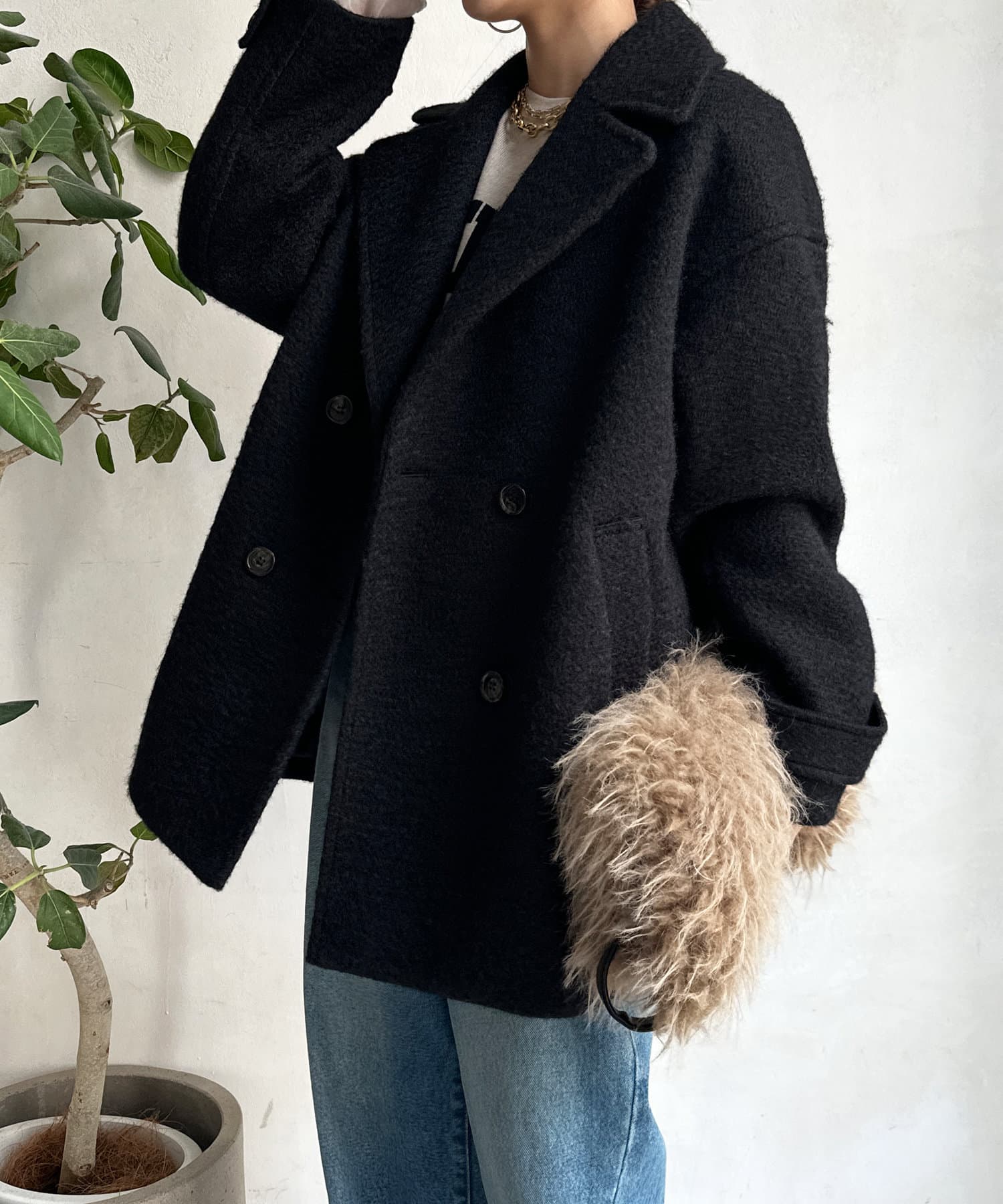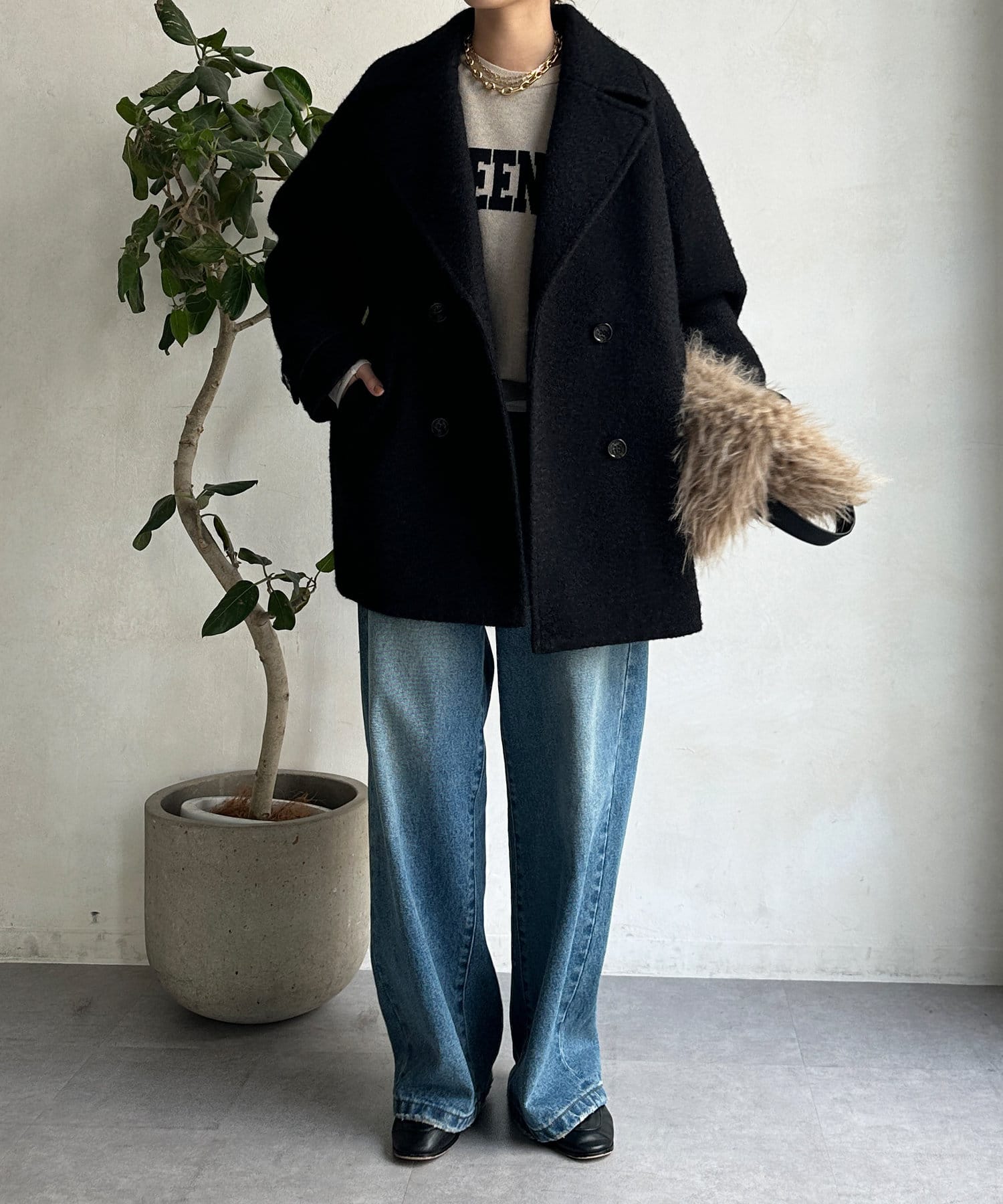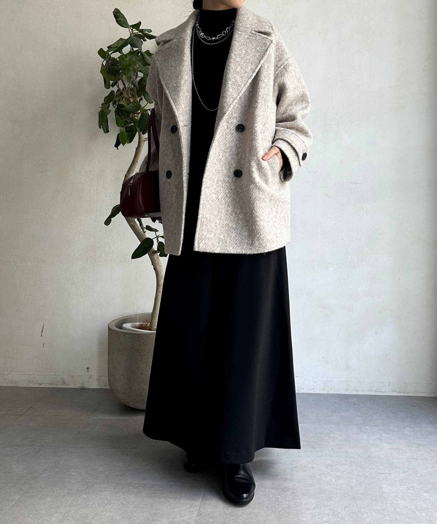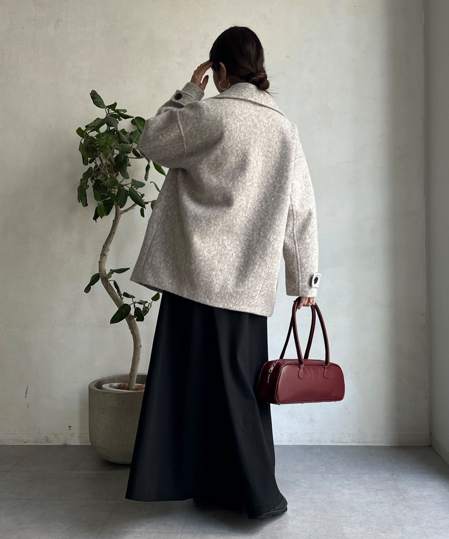大きめの襟とリラックスしたシルエットがポイントのハーフ丈Pコート。