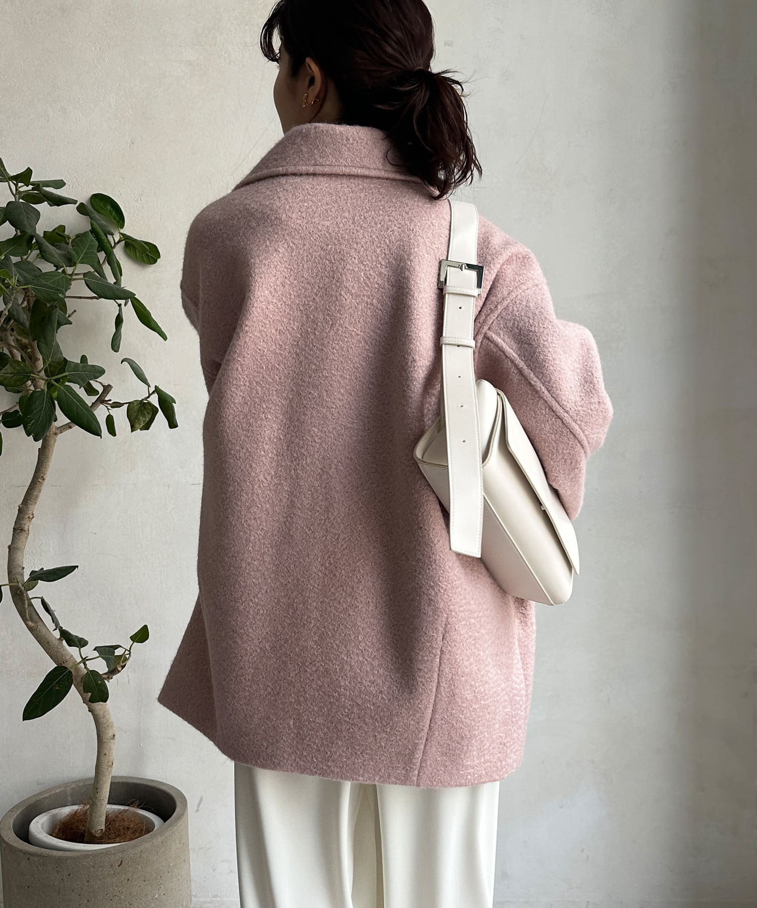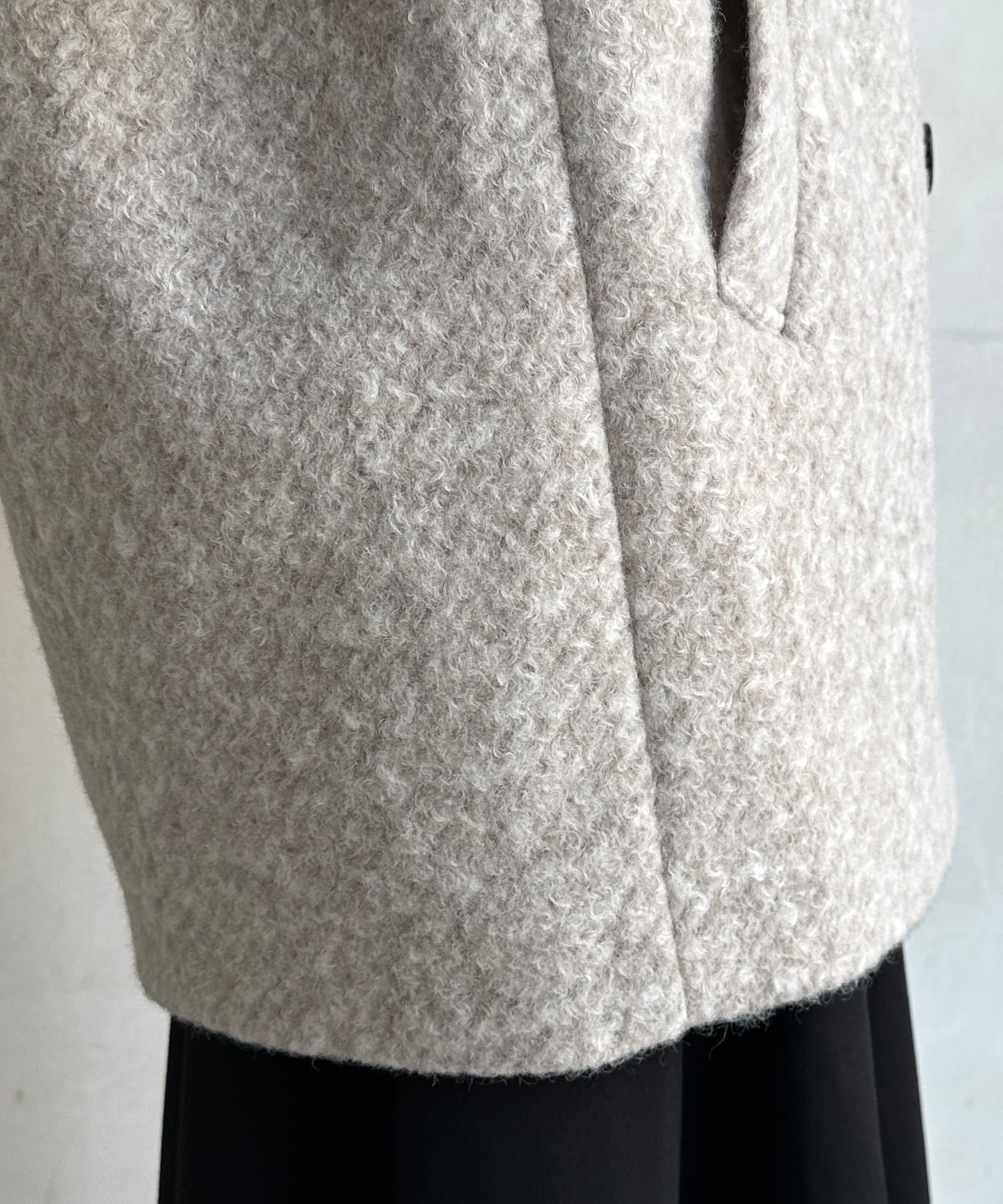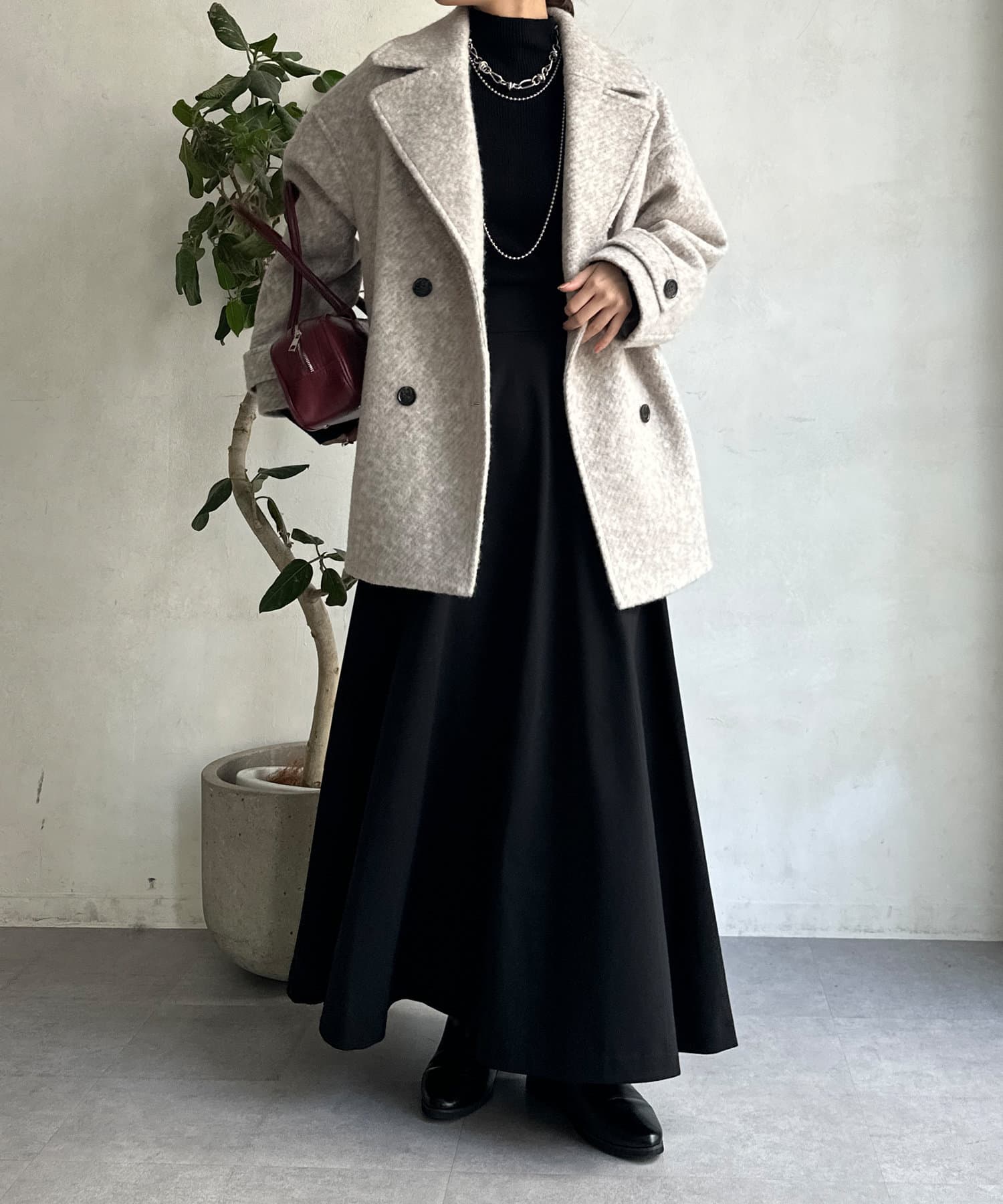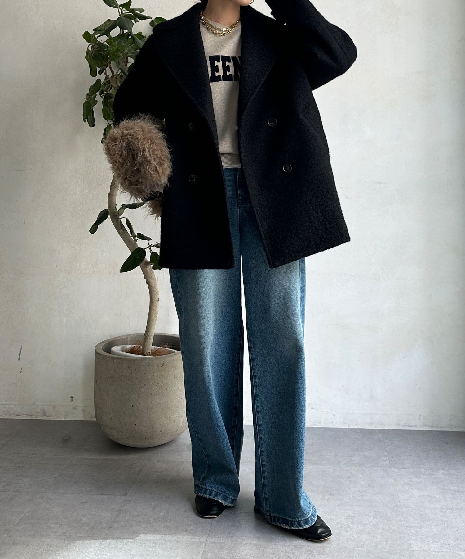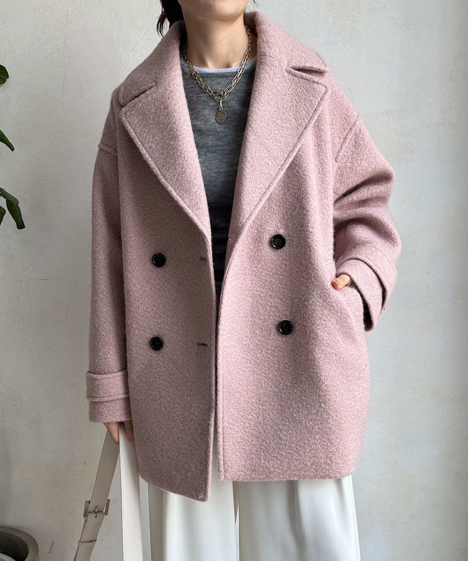 大きめの襟とリラックスしたシルエットがポイントのハーフ丈Pコート。