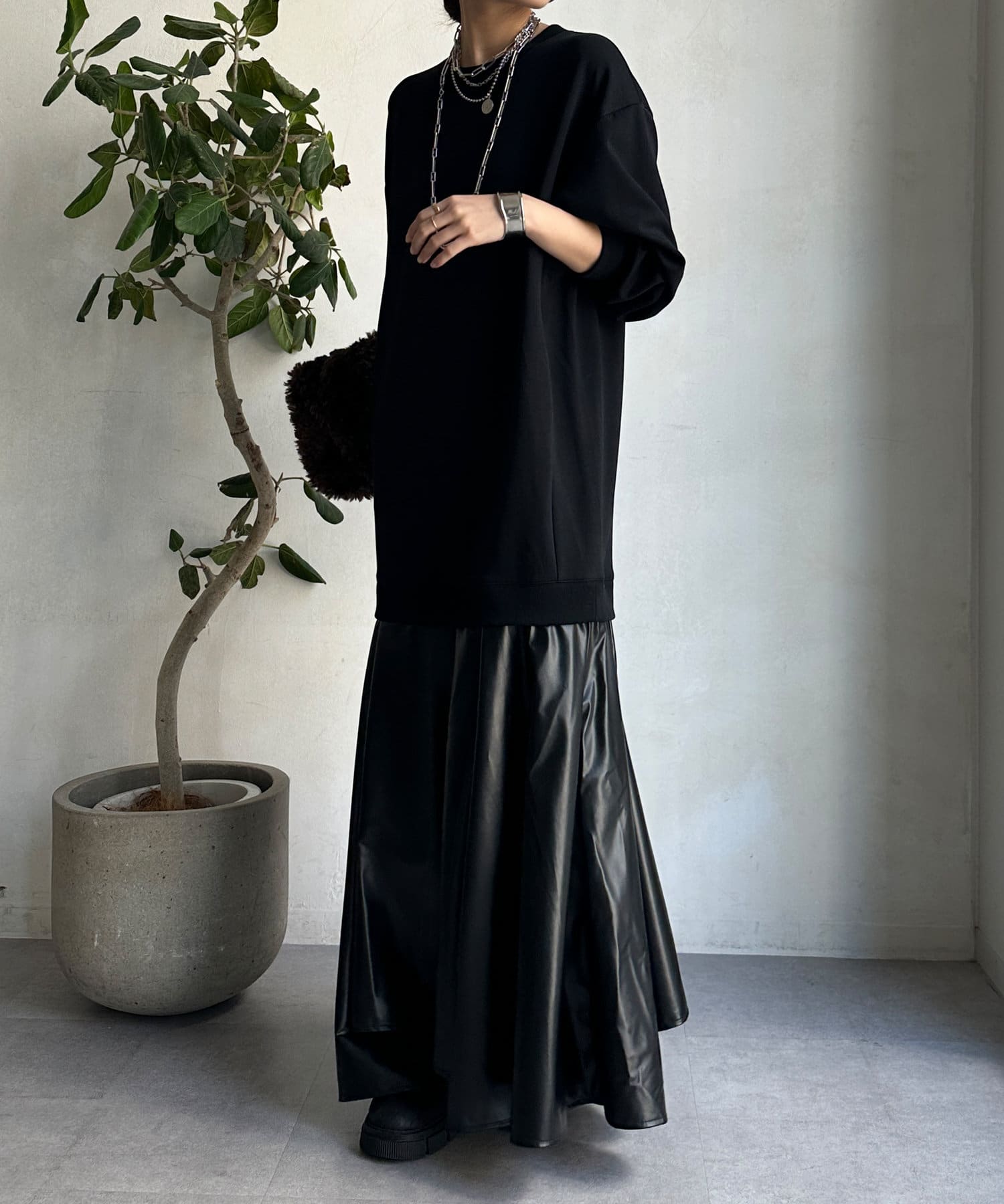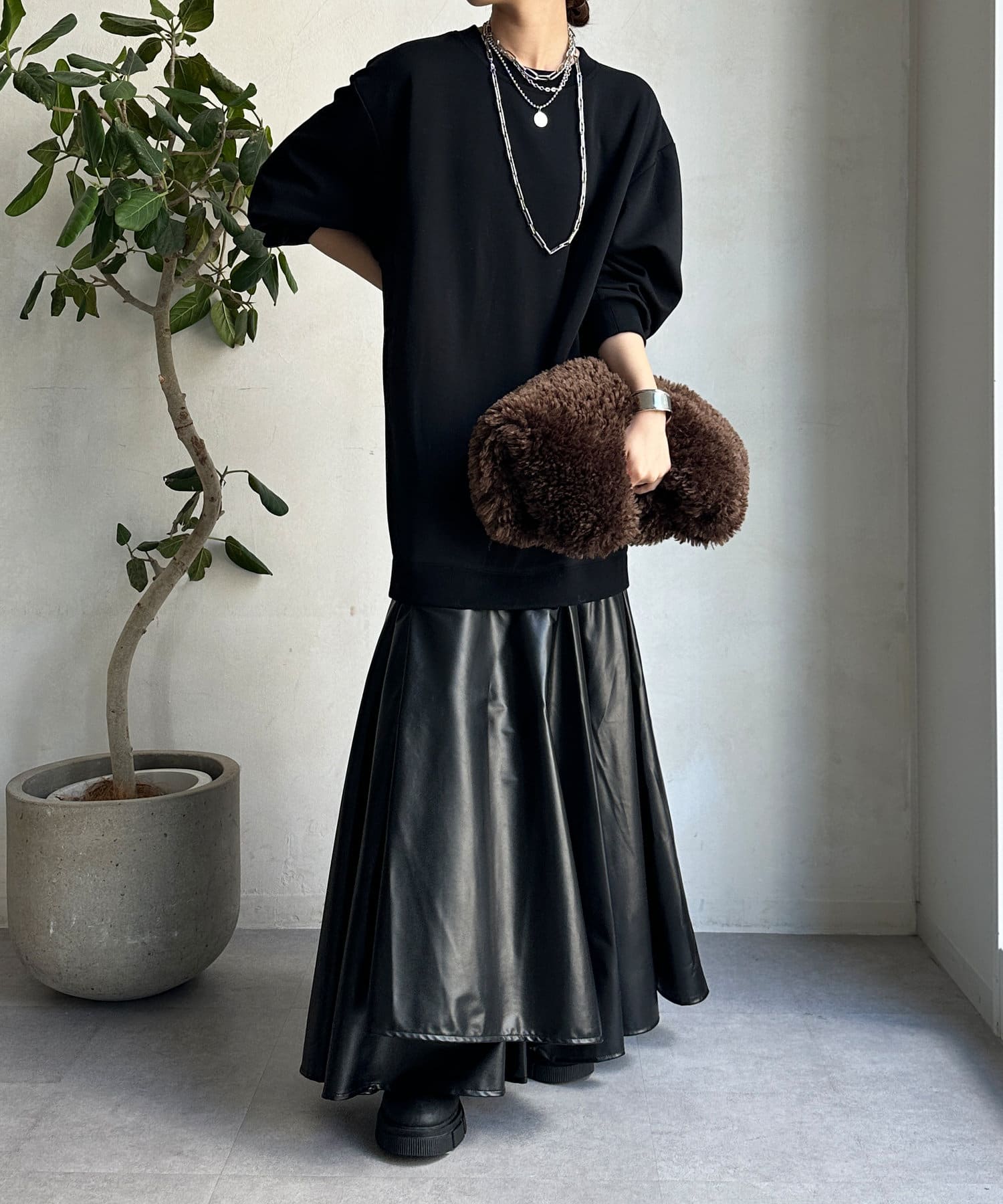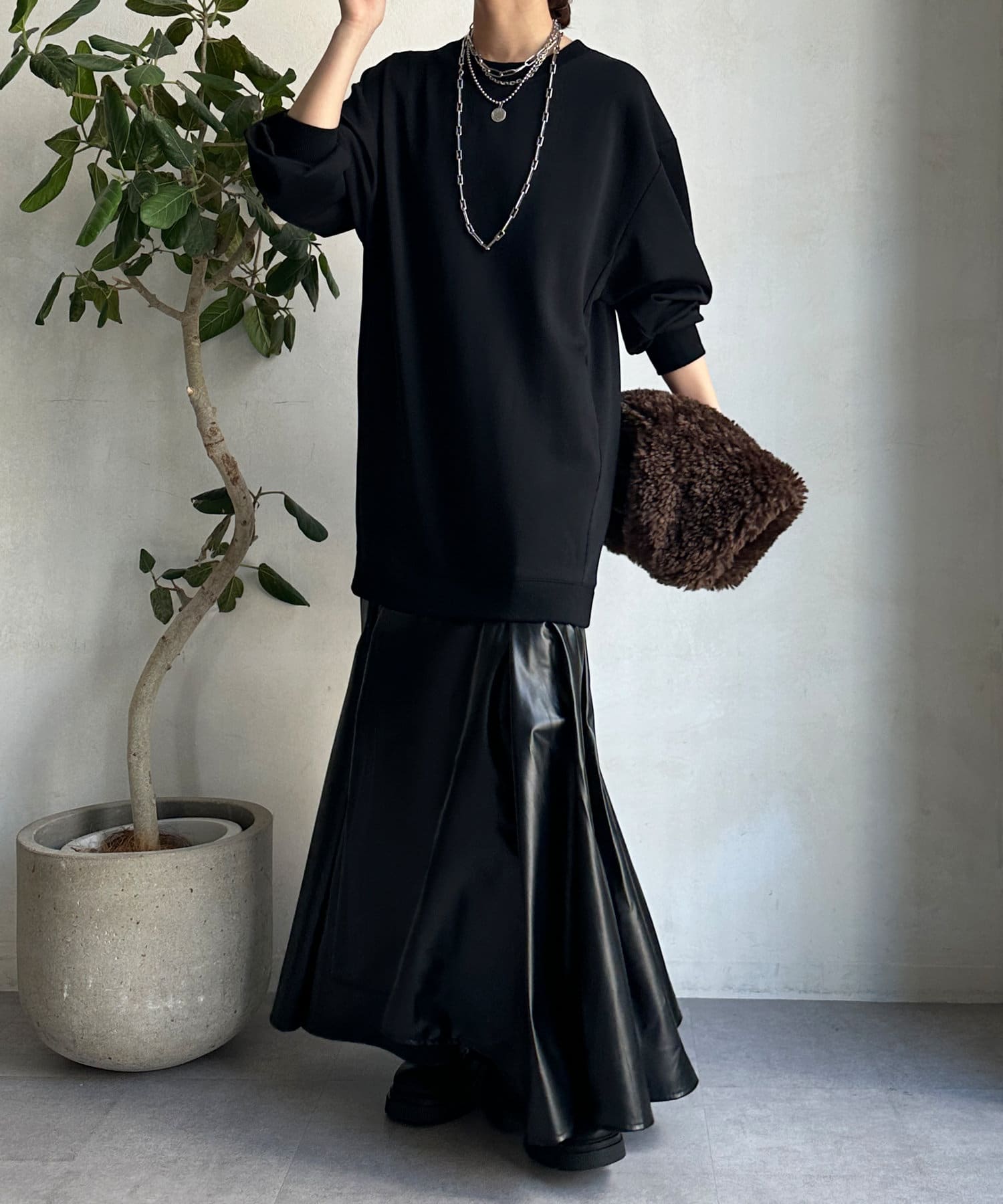 別々でコーディネートするにはなかなか難しく感じてしまう、ゆるっとシルエット+ロングスカートの組み合わせですがこれさえ着ておけば問題解決。