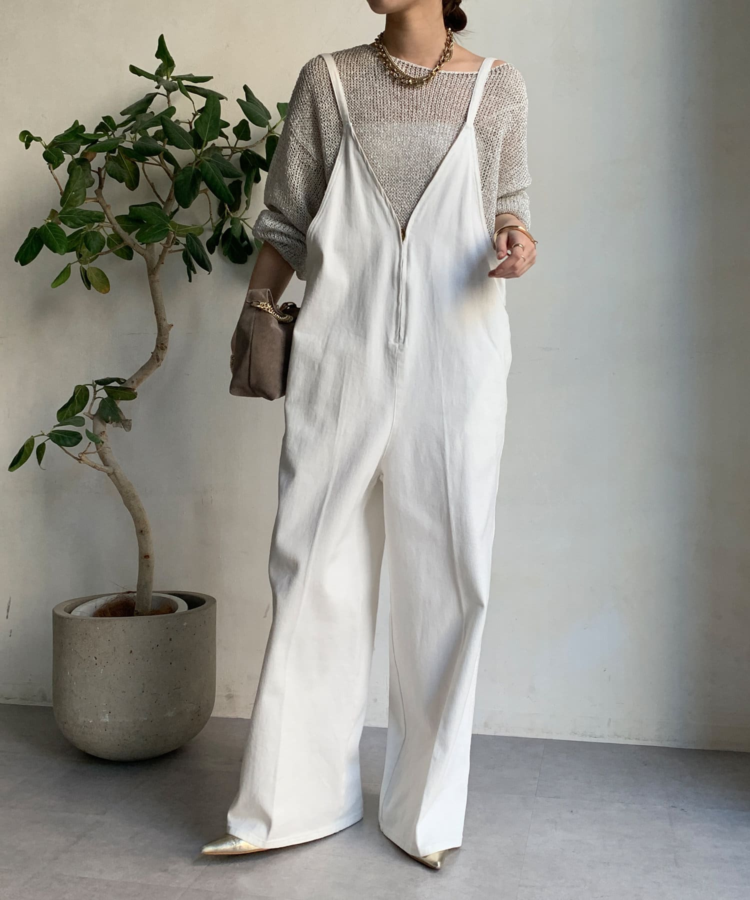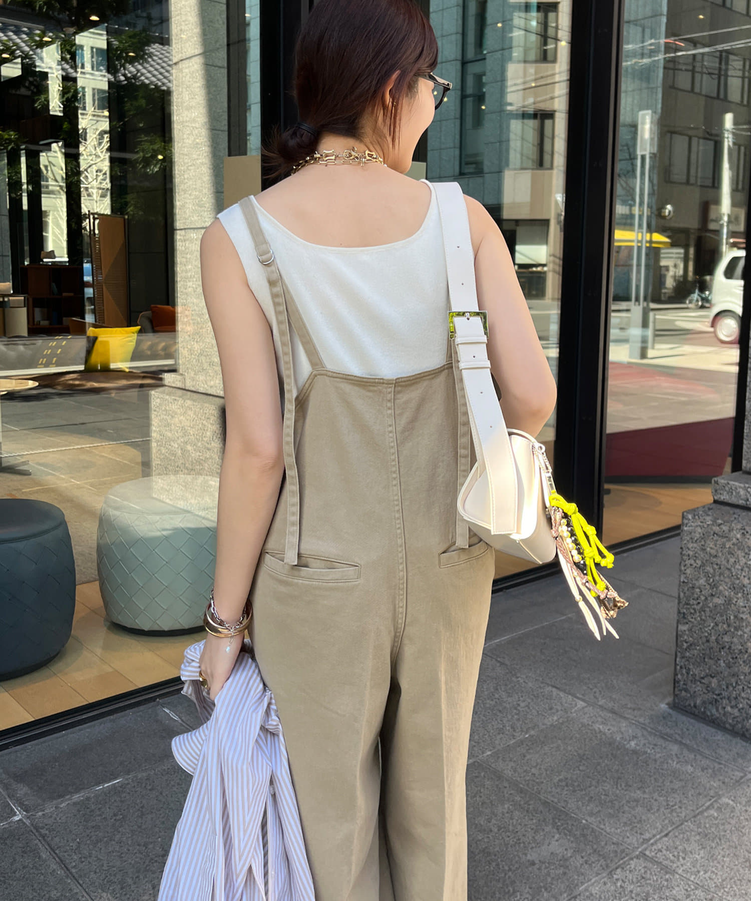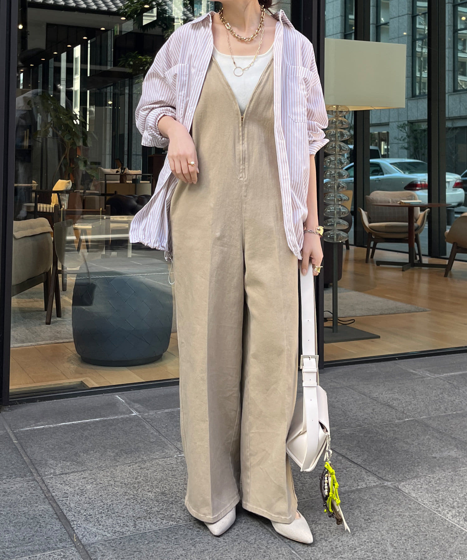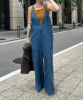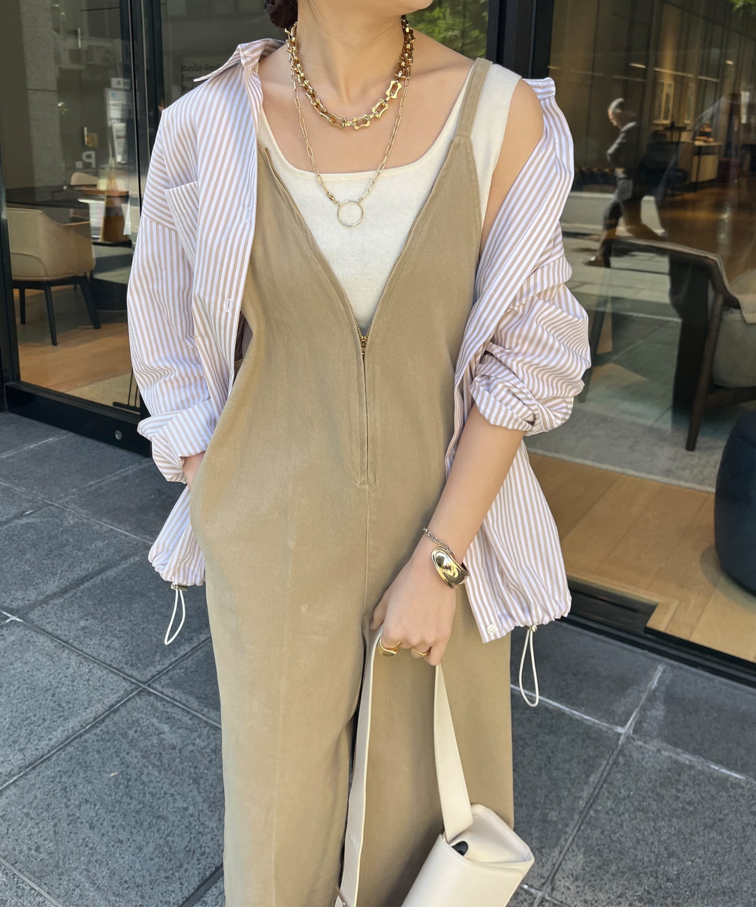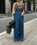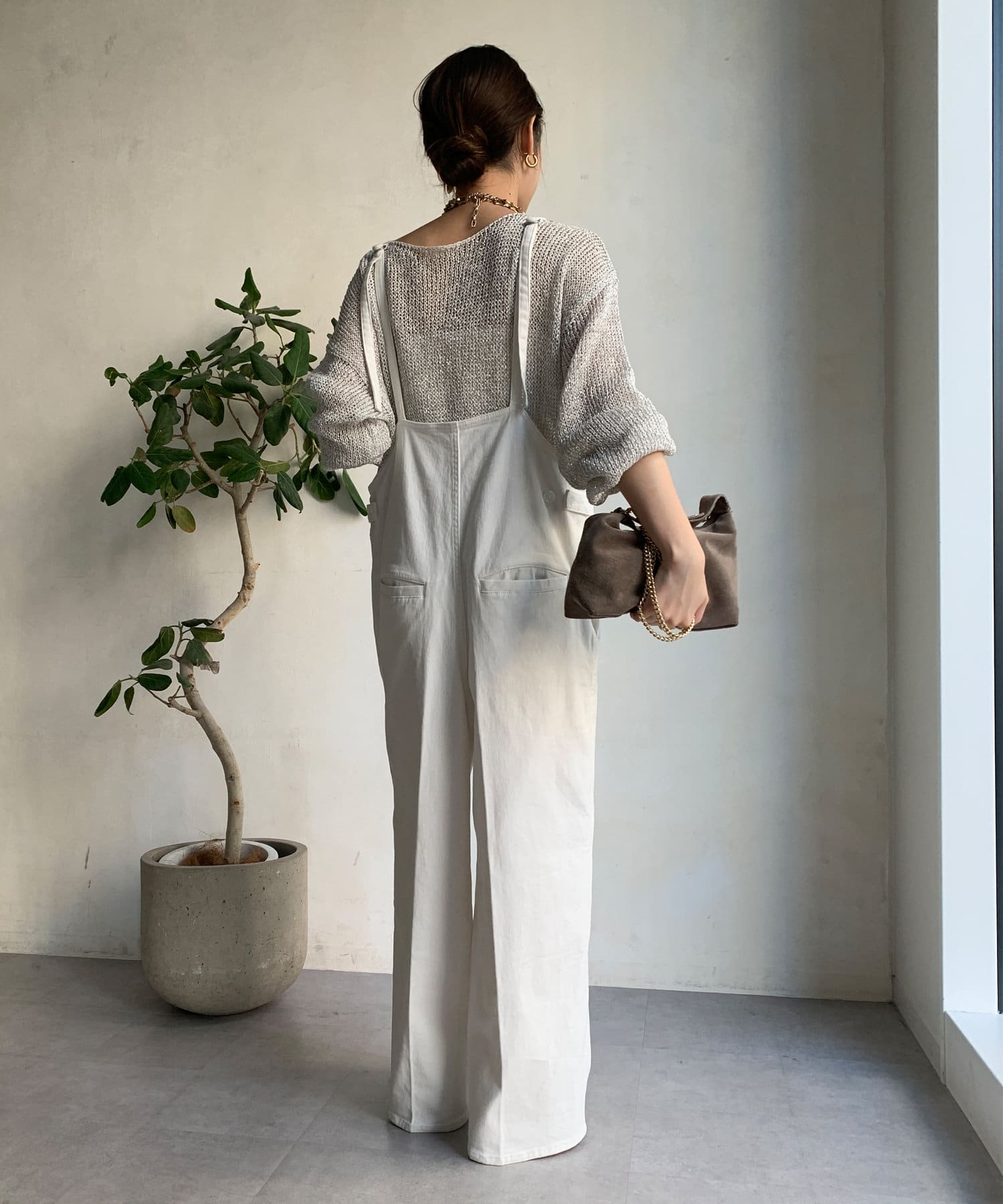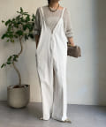 ストレスフリーにゆるっと着られるサロペットに女性らしさを垣間見せる華奢な肩紐がバランスの良い1着。