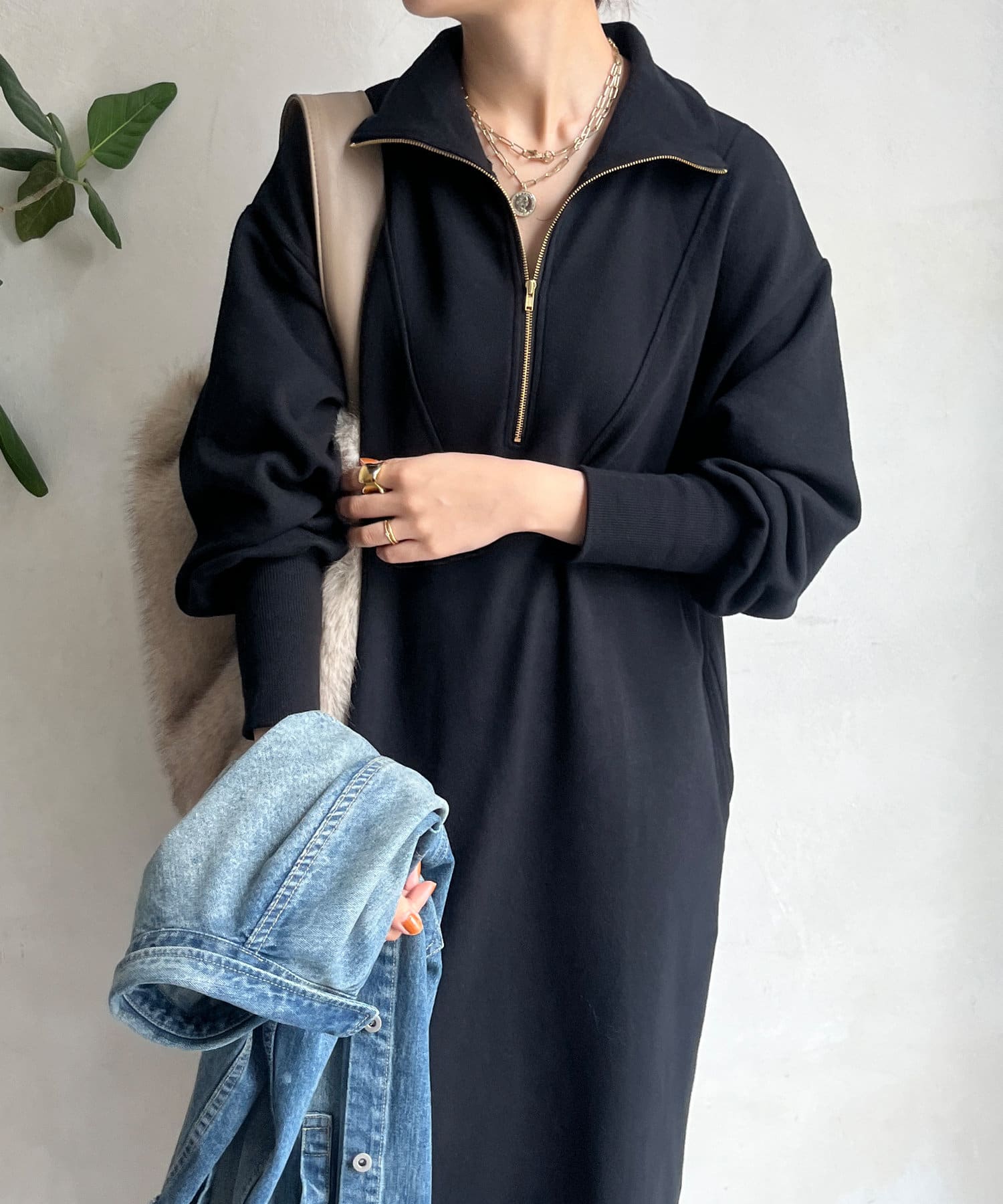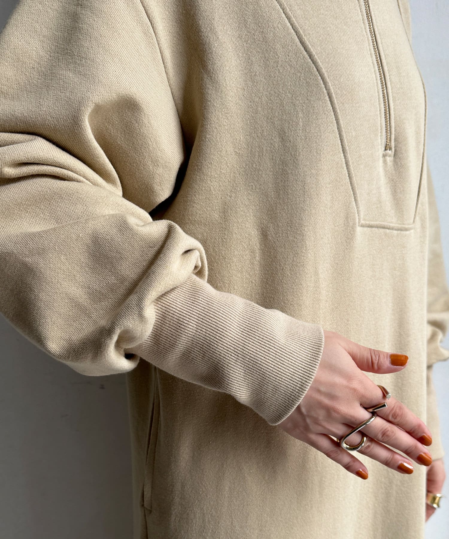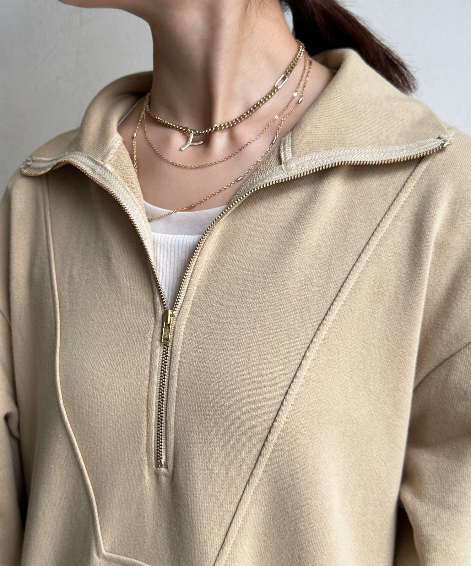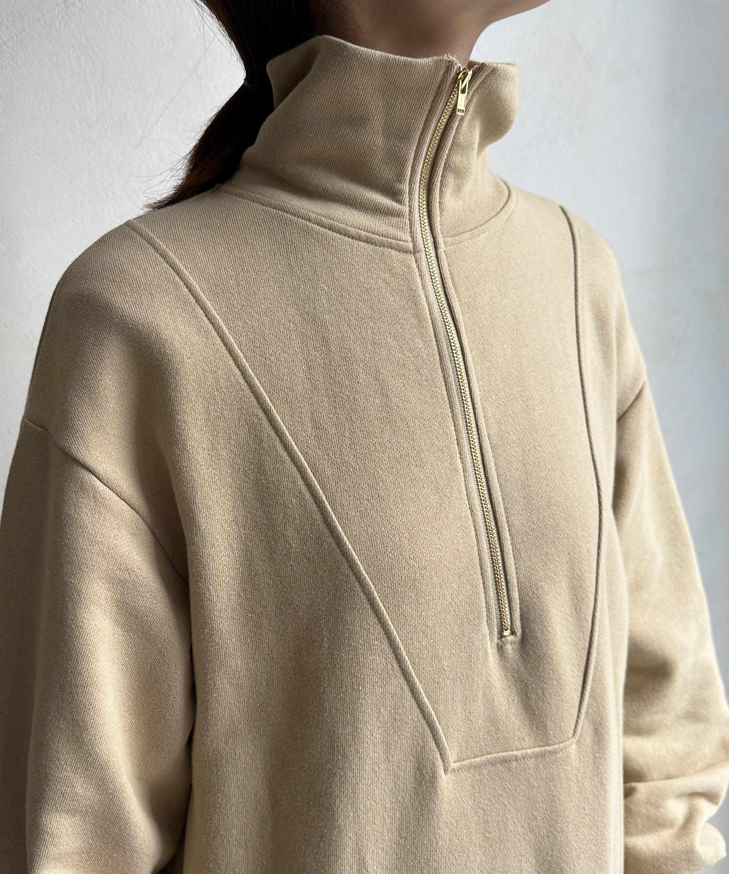 目を惹くハーフジップのデザインは、ざっくりと開けて襟のようにして着るのがおすすめ。お顔周りをすっきりと見せてくれます。