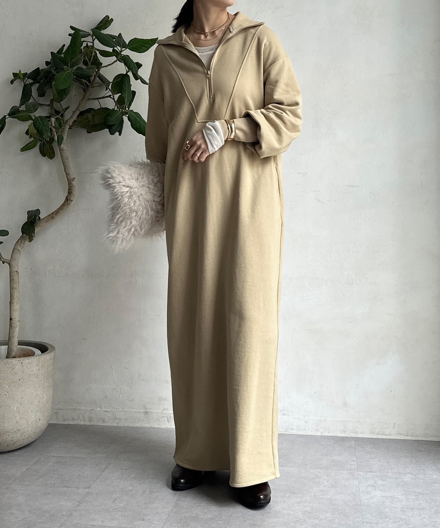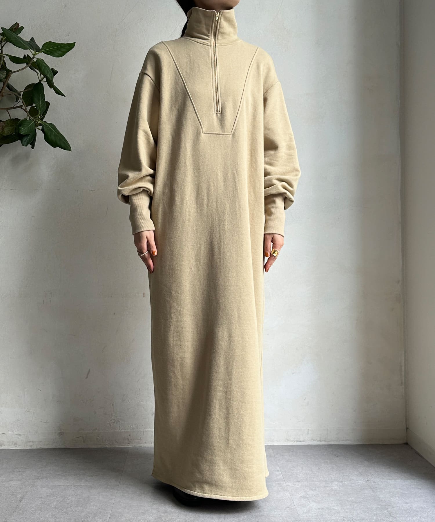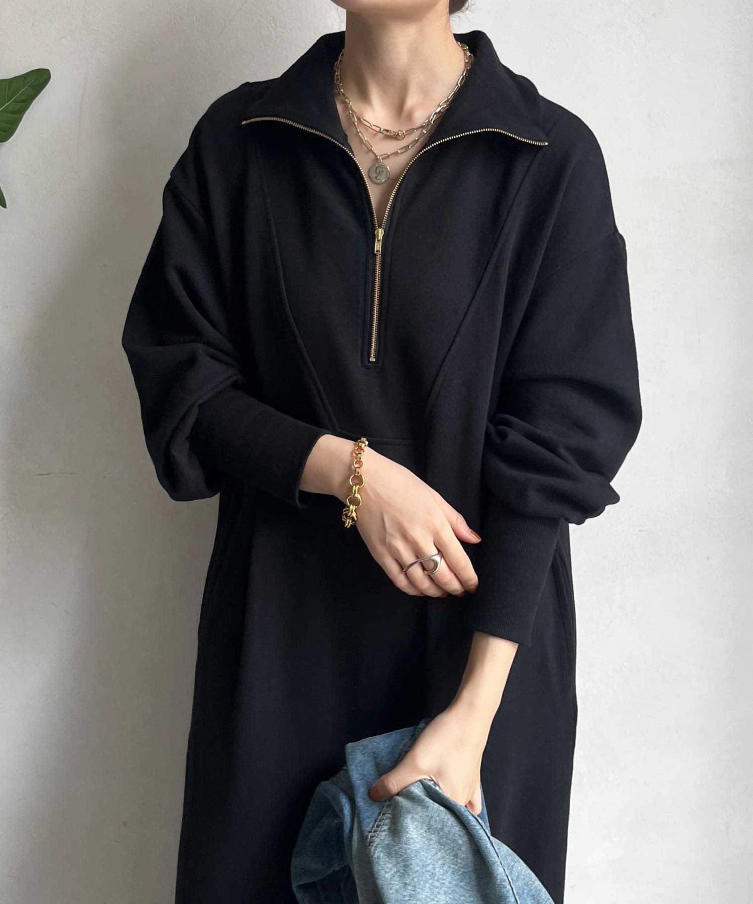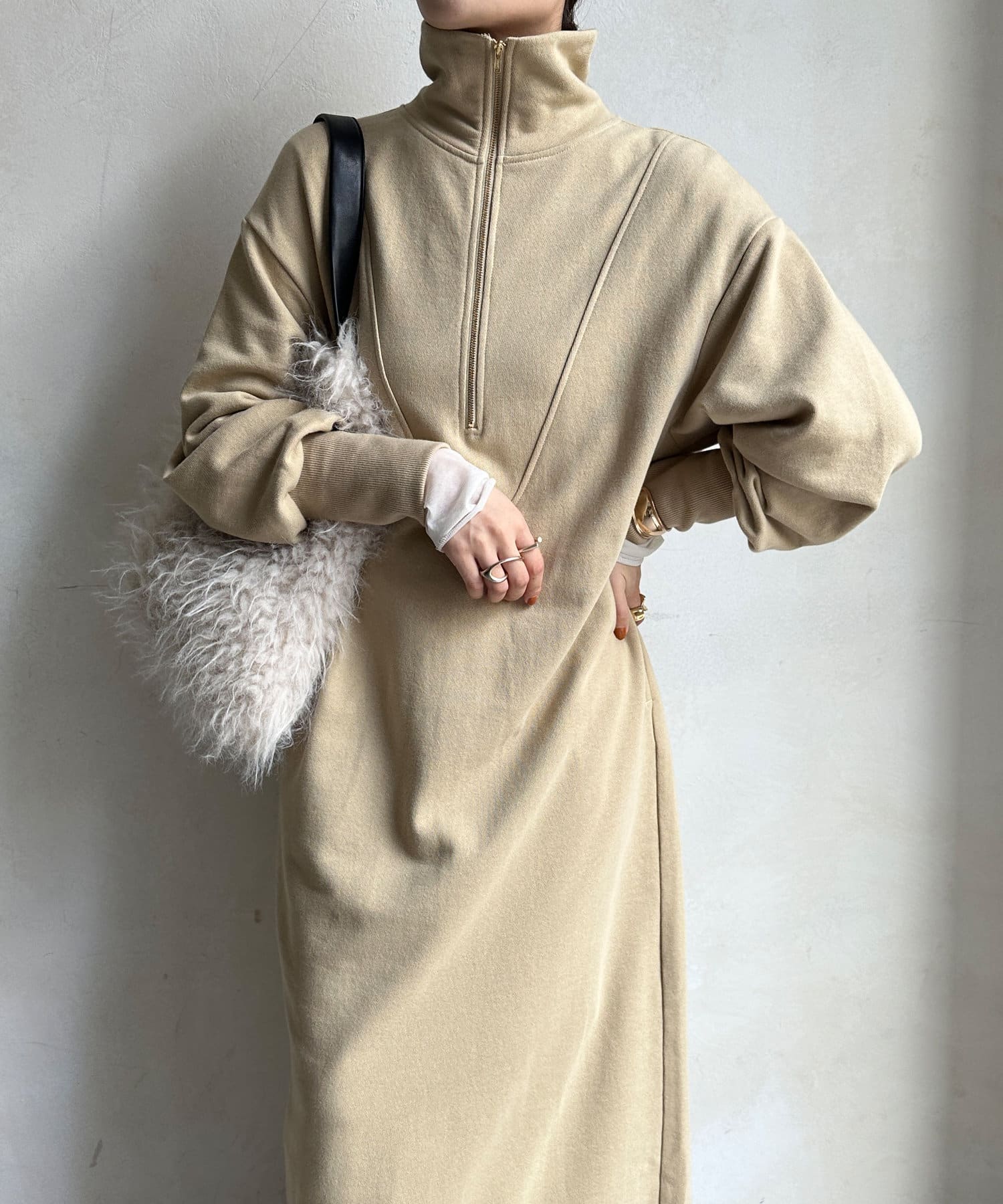 目を惹くハーフジップのデザインは、ざっくりと開けて襟のようにして着るのがおすすめ。お顔周りをすっきりと見せてくれます。