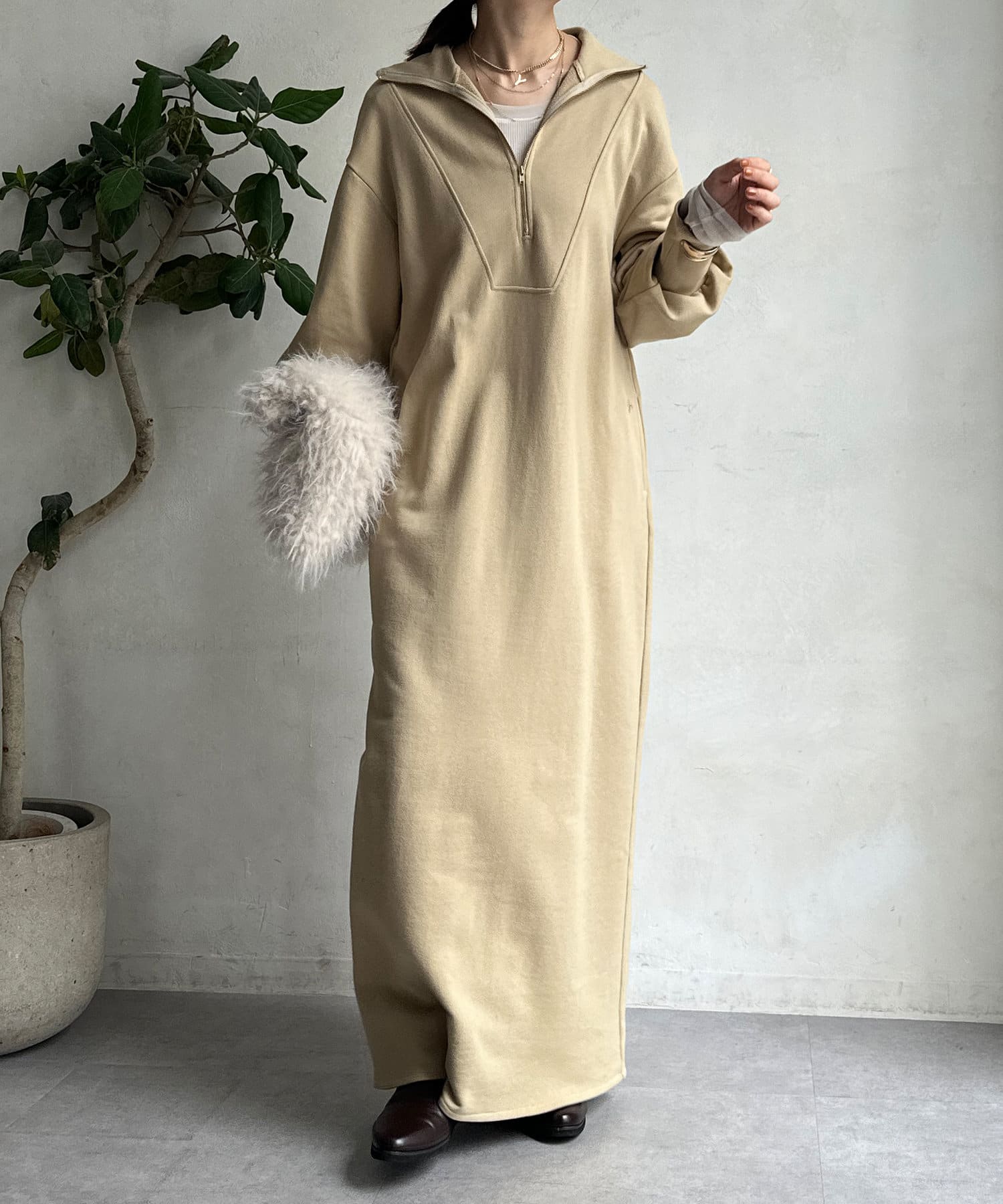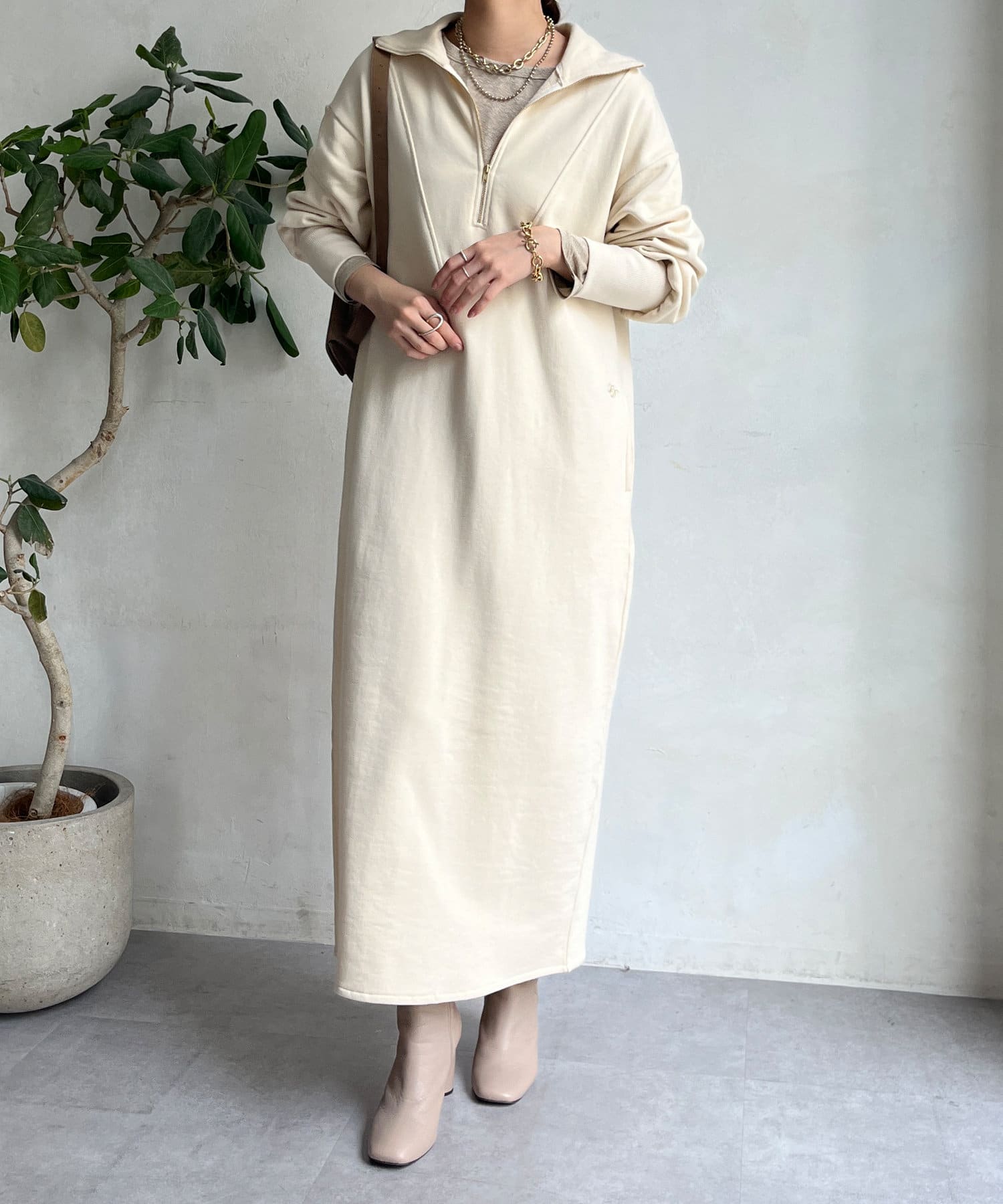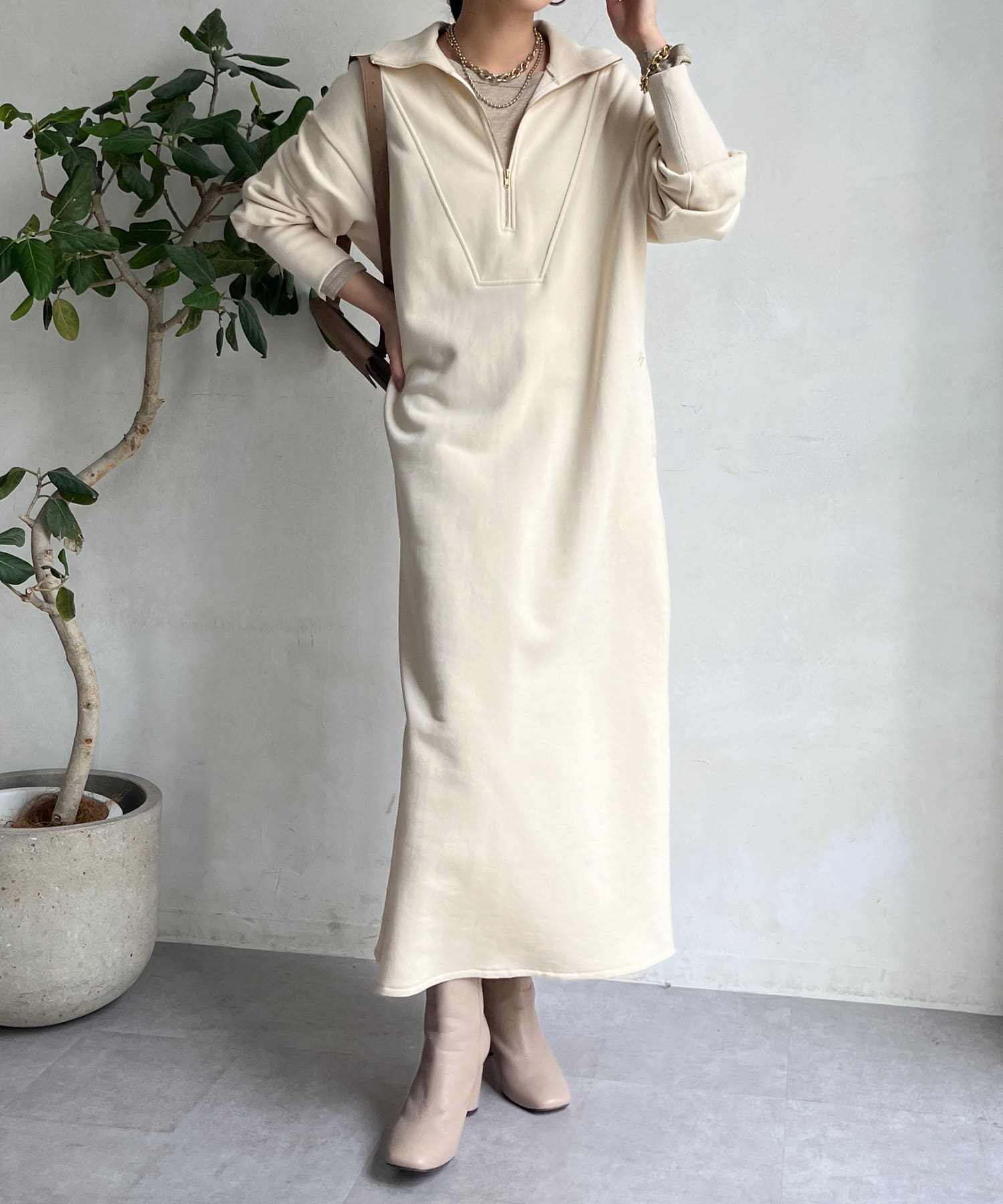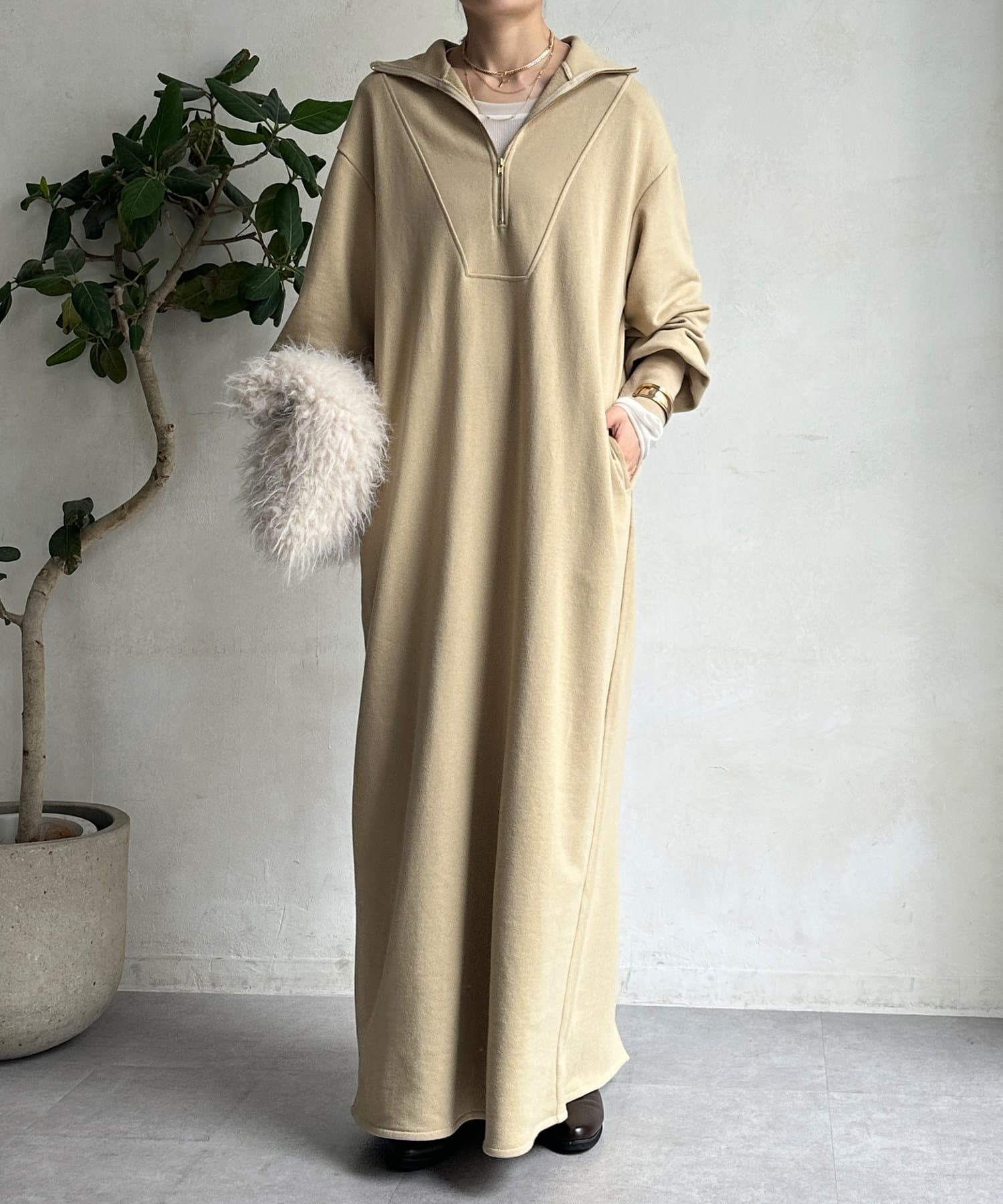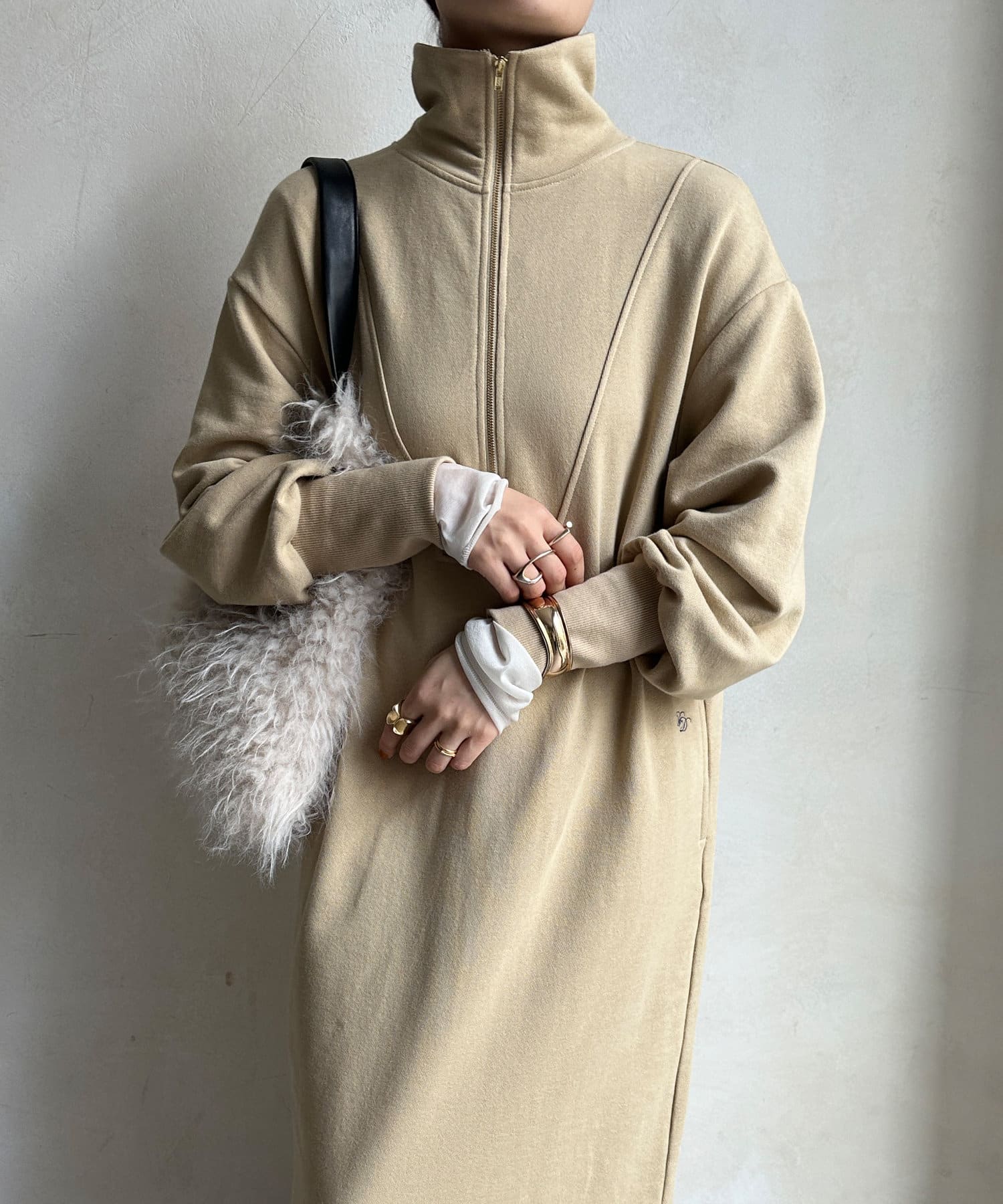 目を惹くハーフジップのデザインは、ざっくりと開けて襟のようにして着るのがおすすめ。お顔周りをすっきりと見せてくれます。