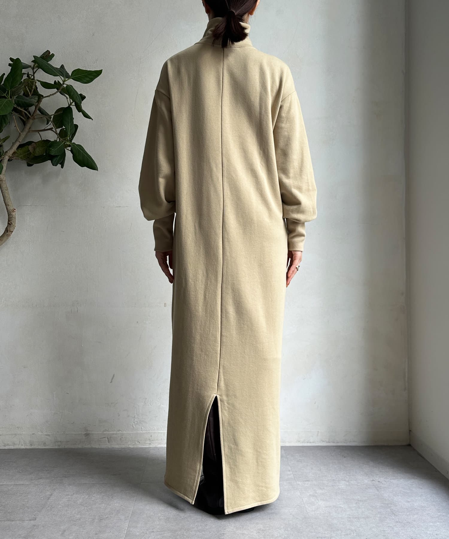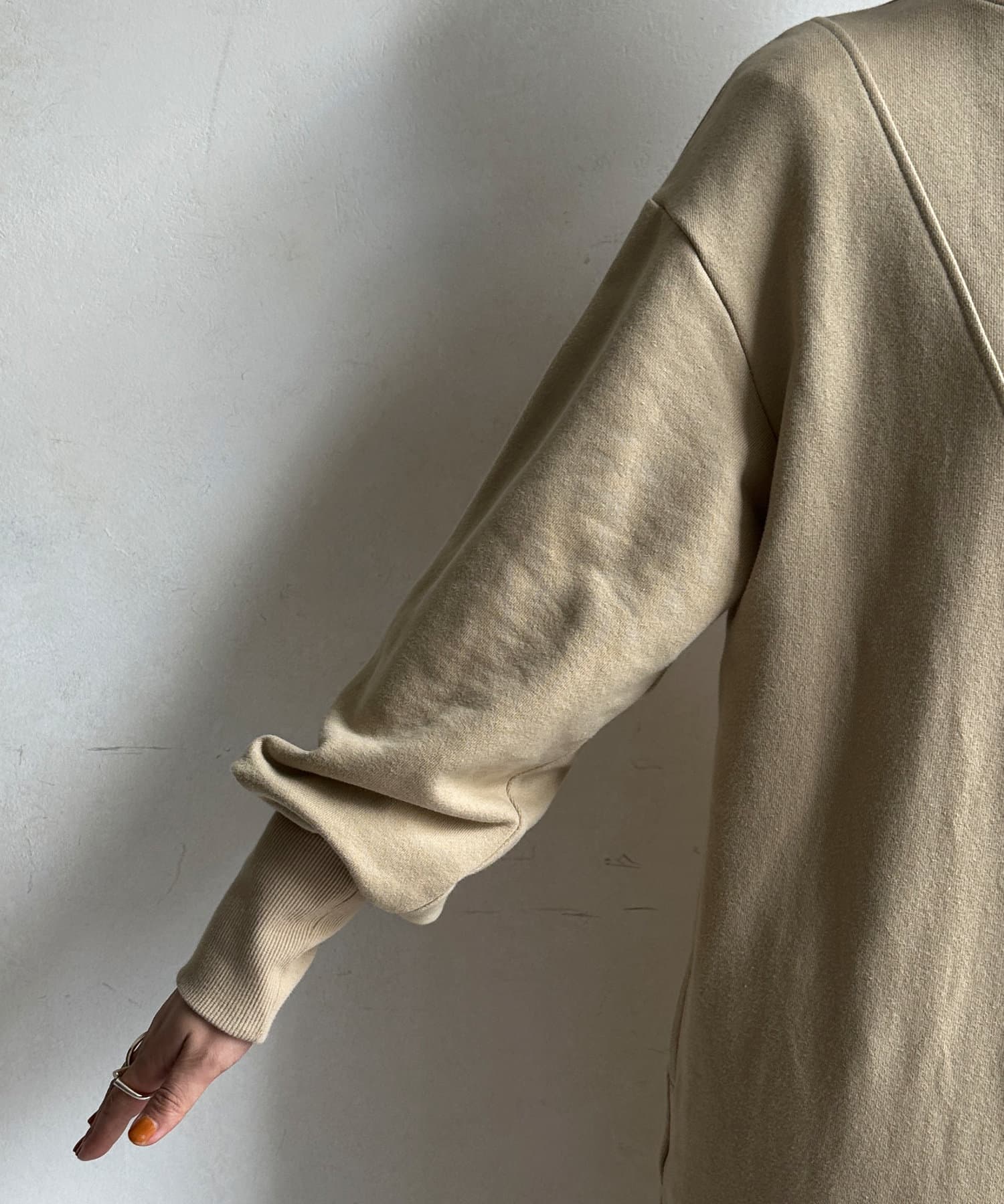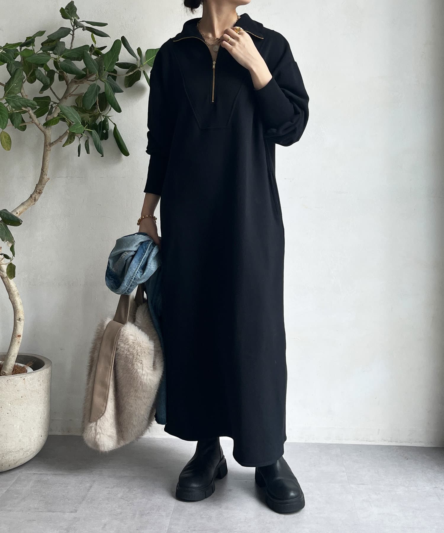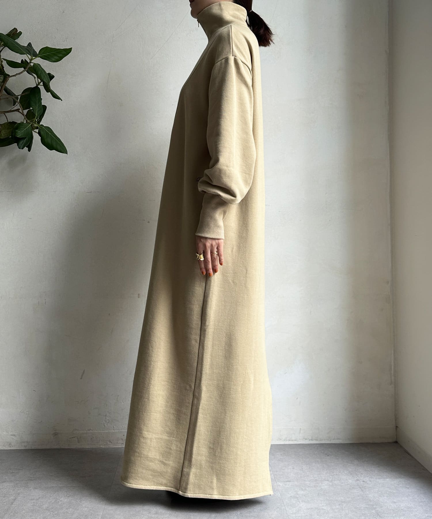 目を惹くハーフジップのデザインは、ざっくりと開けて襟のようにして着るのがおすすめ。お顔周りをすっきりと見せてくれます。