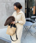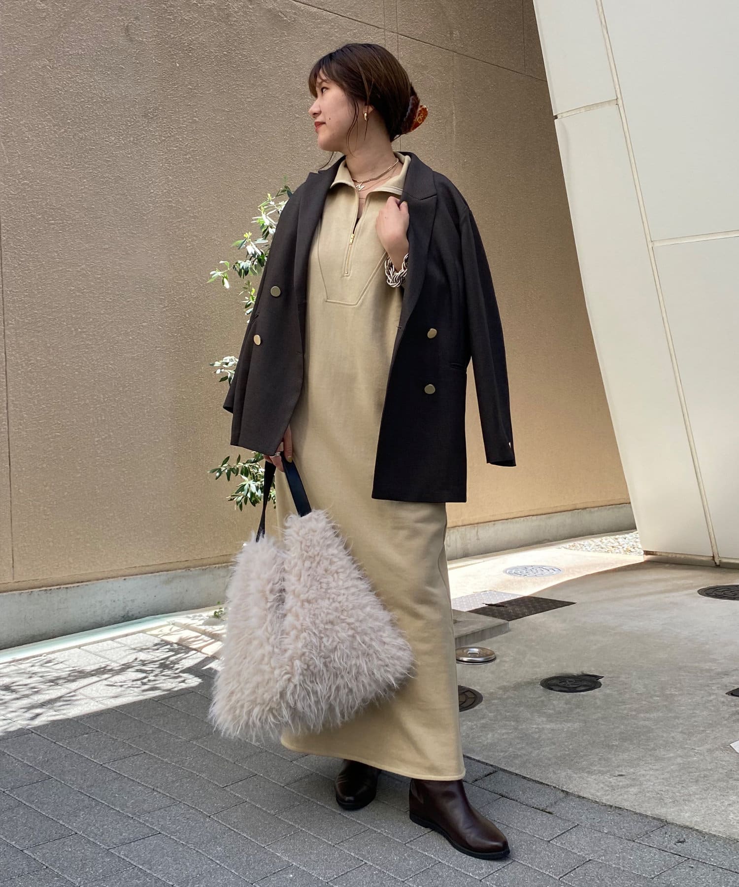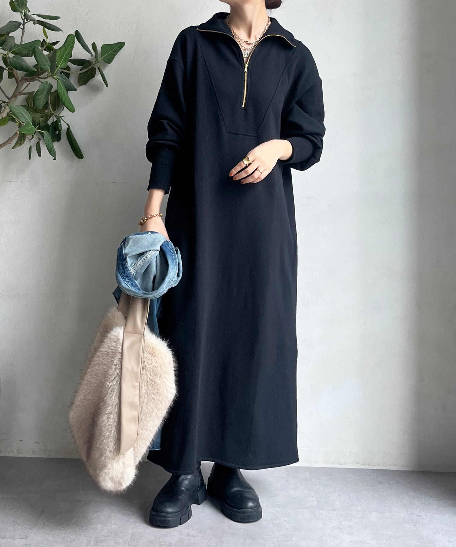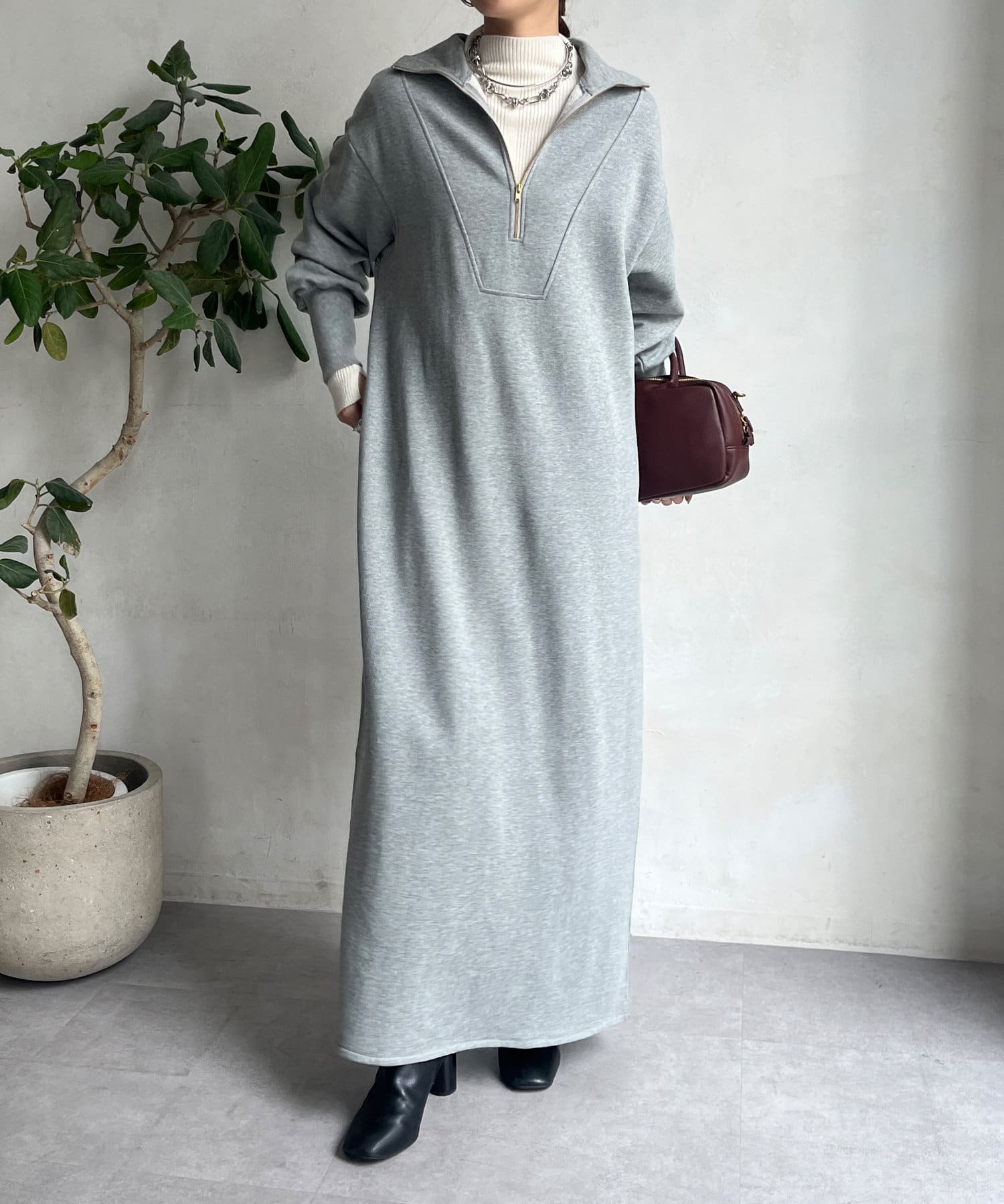 目を惹くハーフジップのデザインは、ざっくりと開けて襟のようにして着るのがおすすめ。お顔周りをすっきりと見せてくれます。