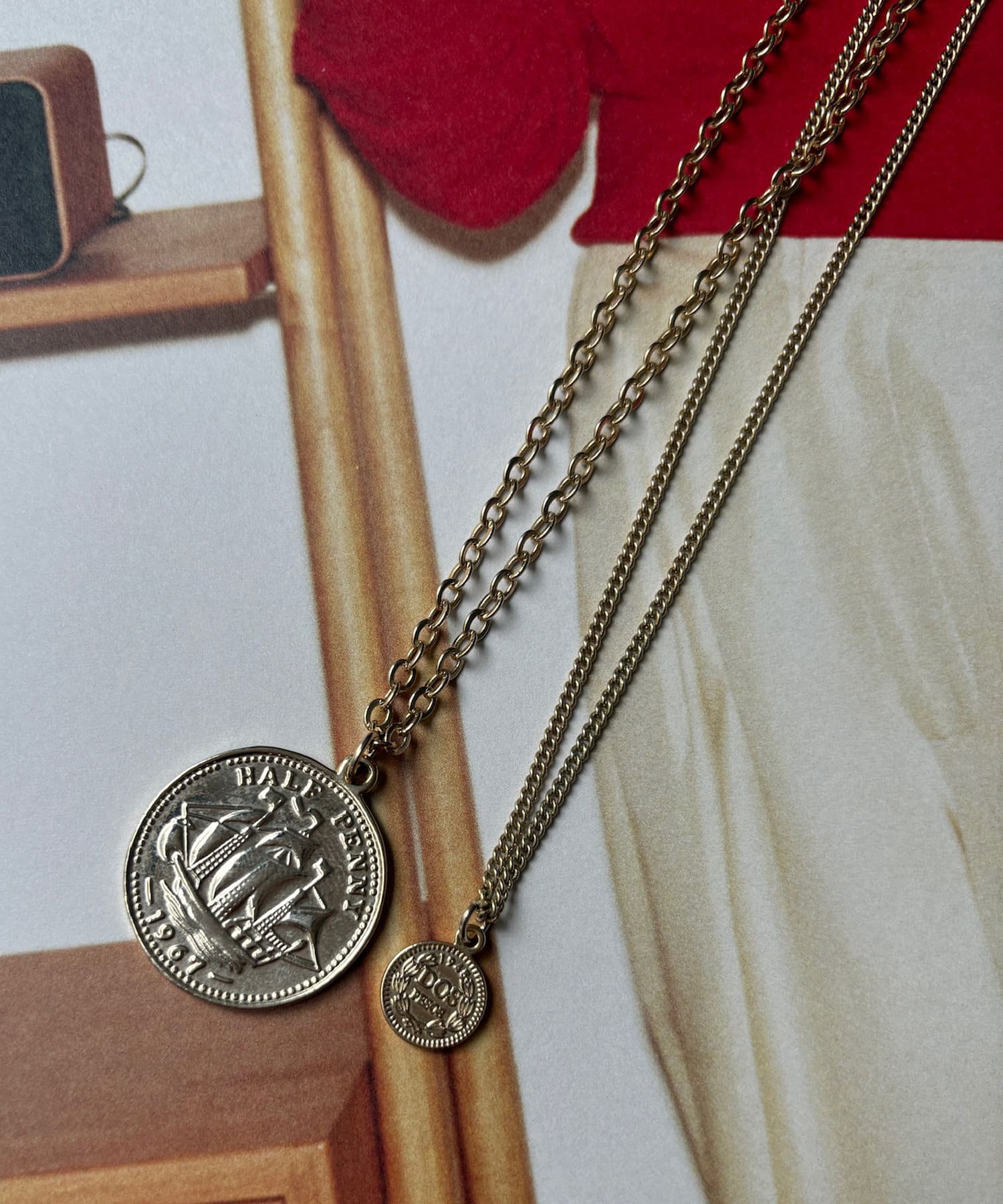 ロングチェーン+トレンドのコインネックレスはシンプルなコーディネートのアクセントにぴったり。