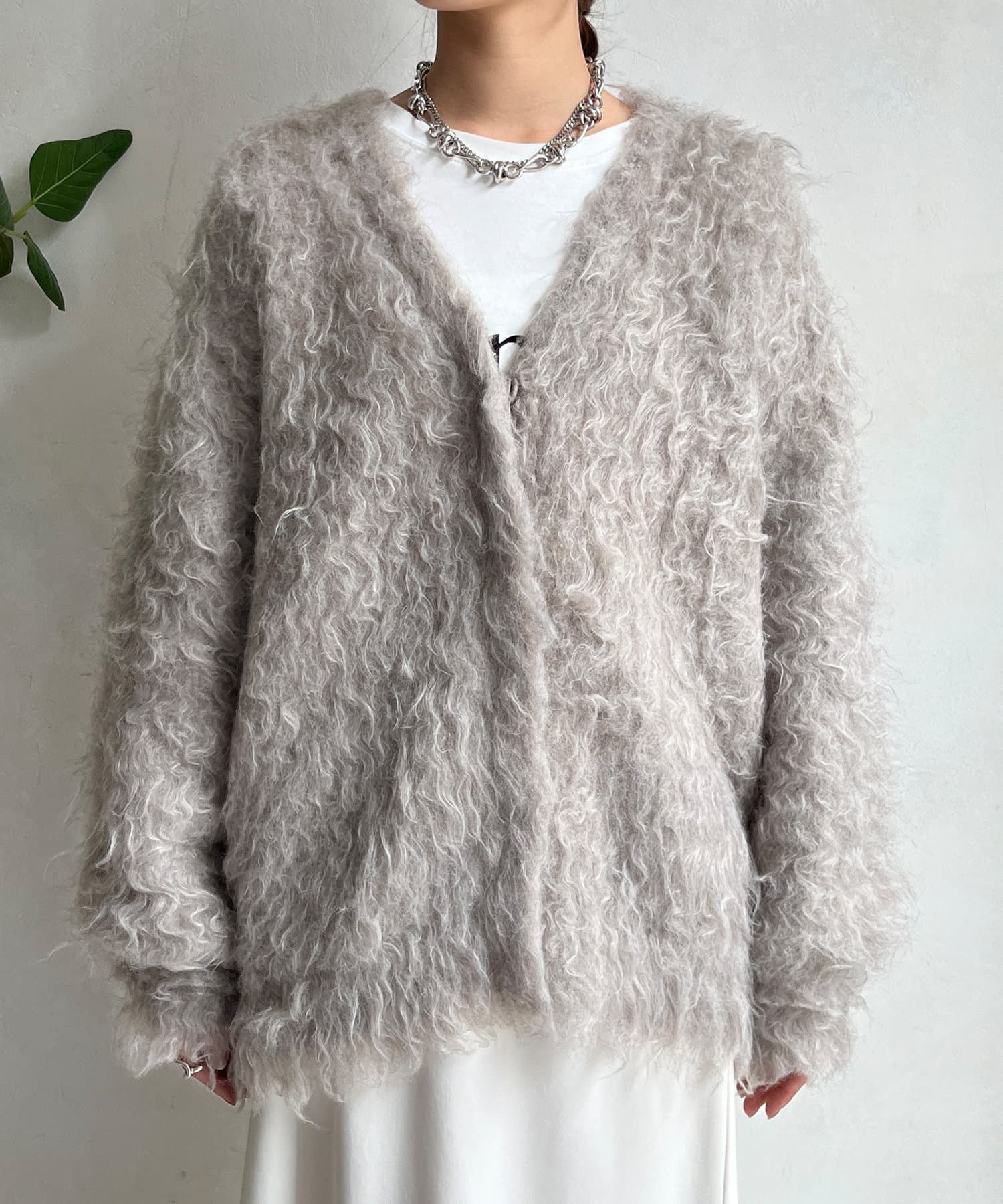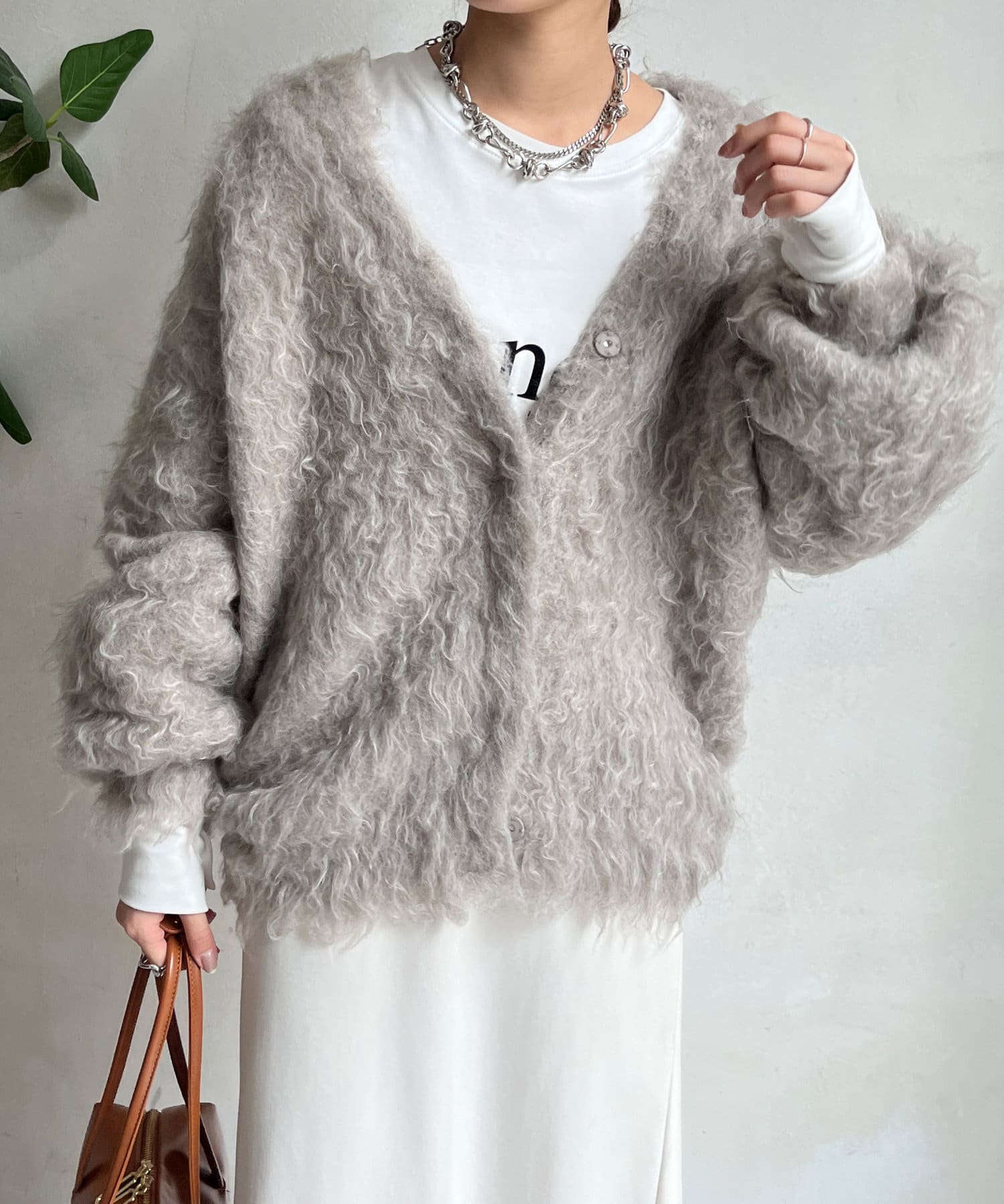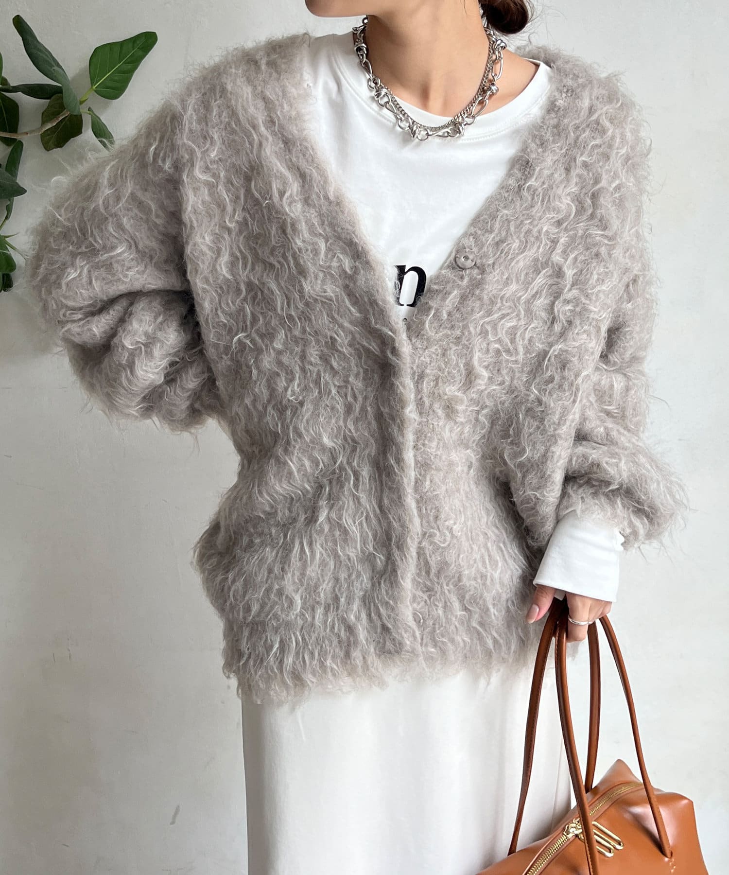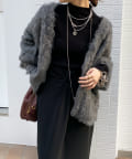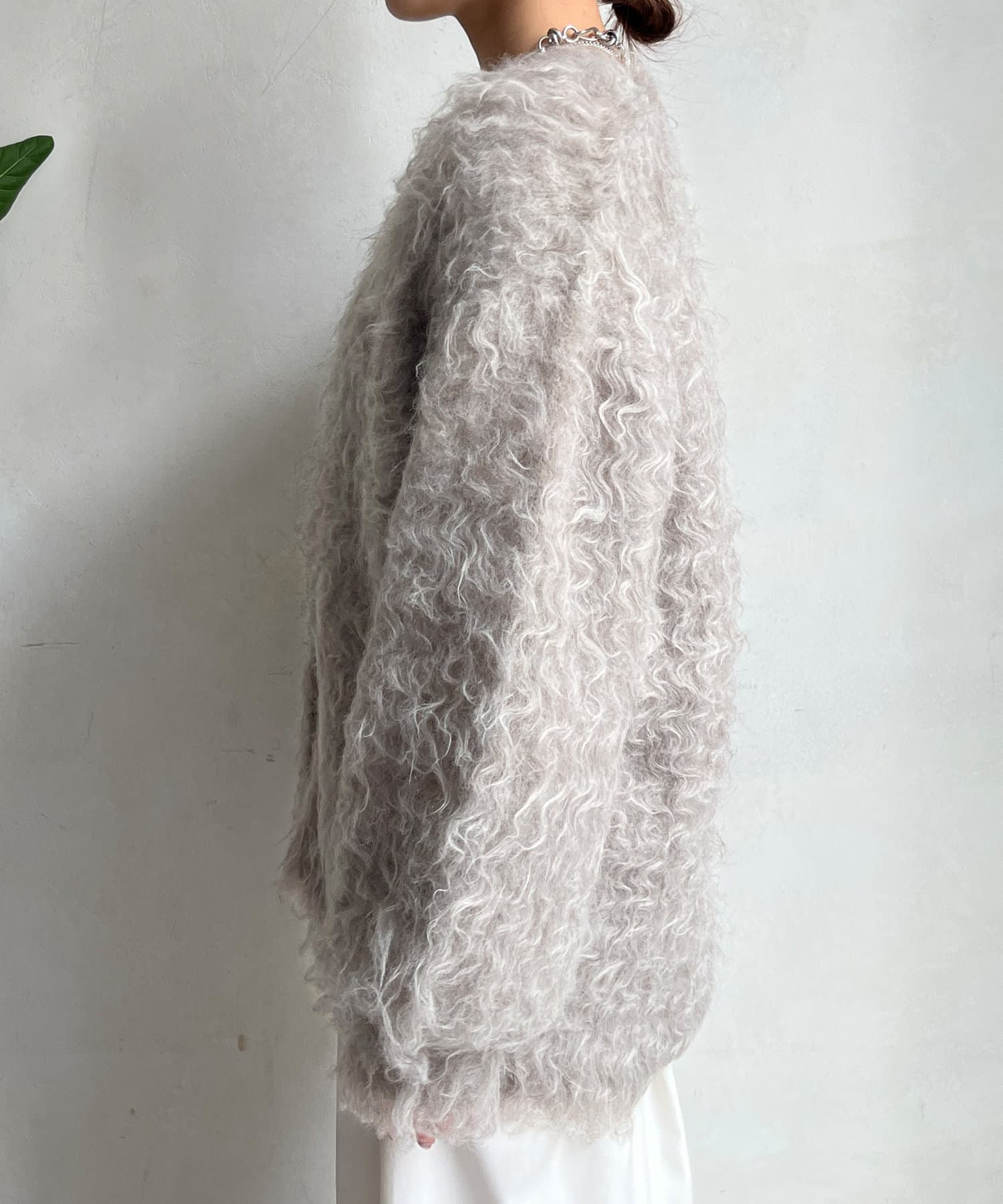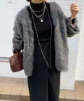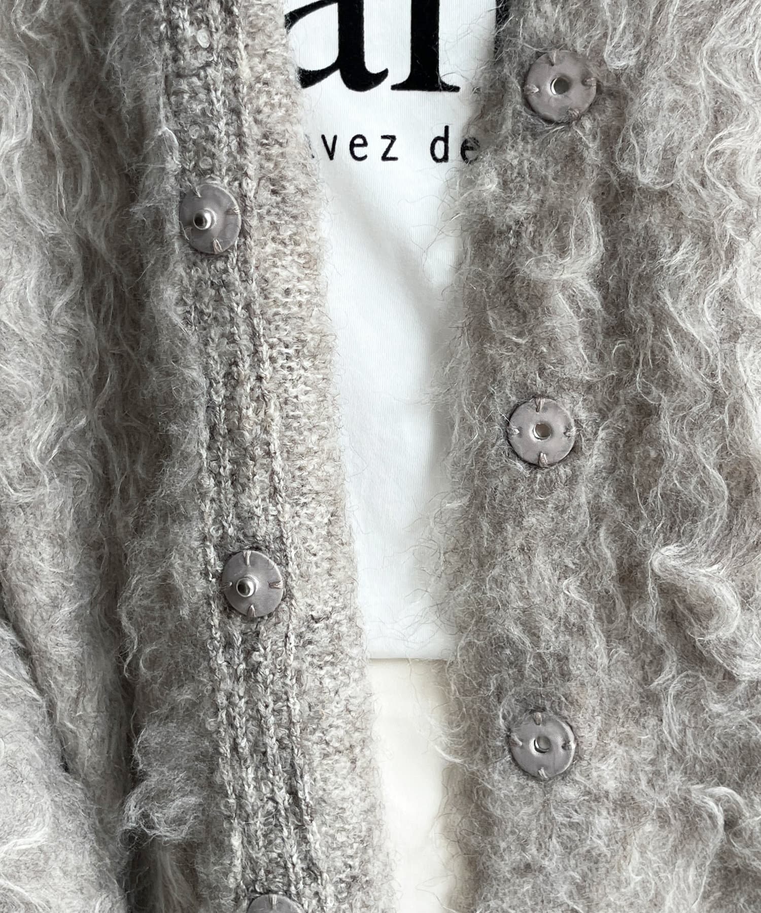 今年気になる毛足感のあるシャギーで仕上げたニットカーディガン。