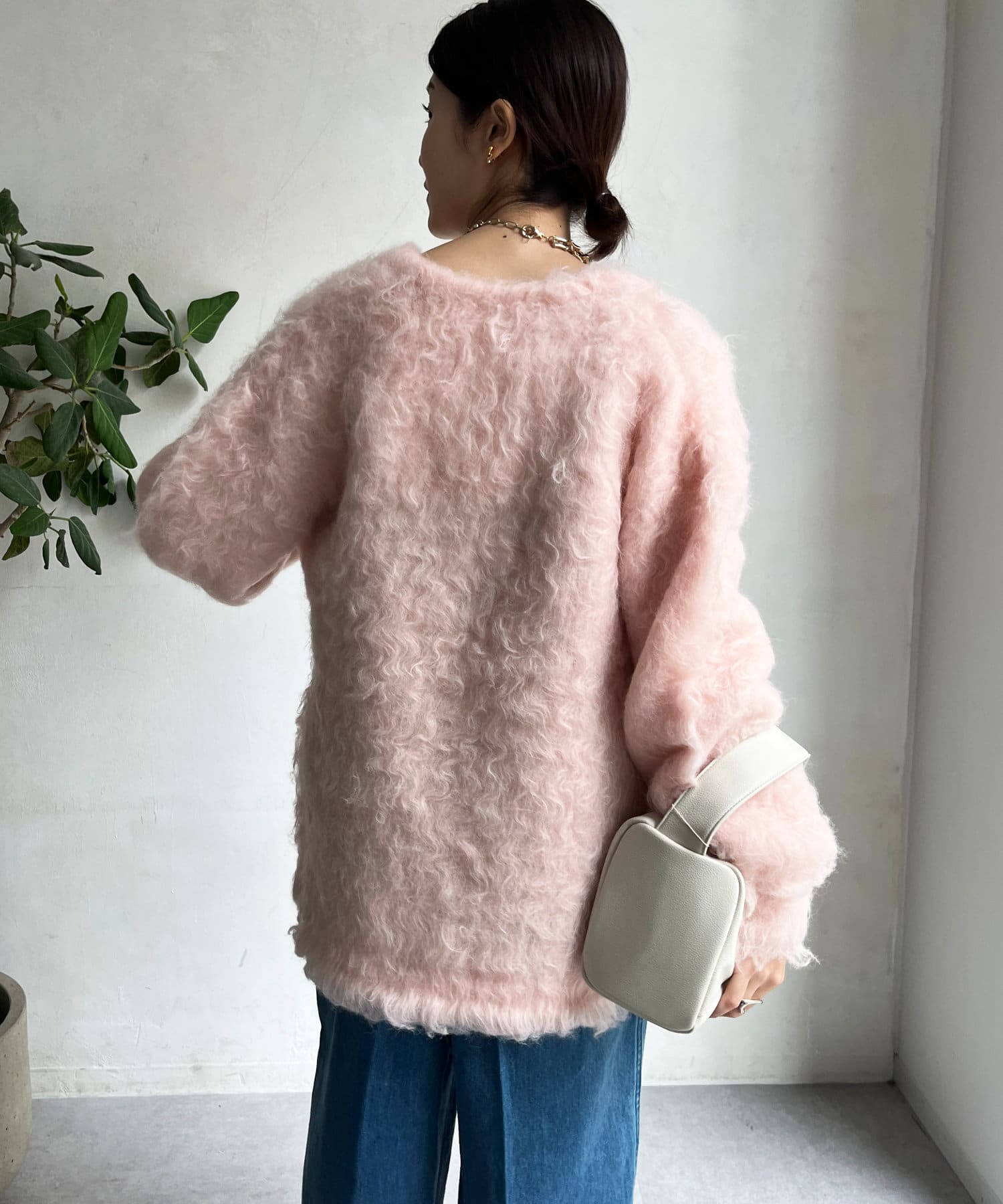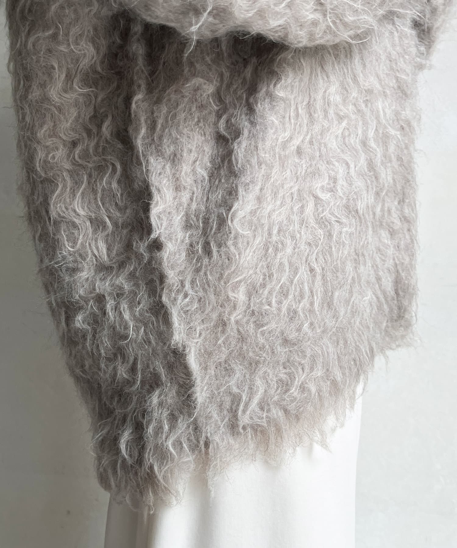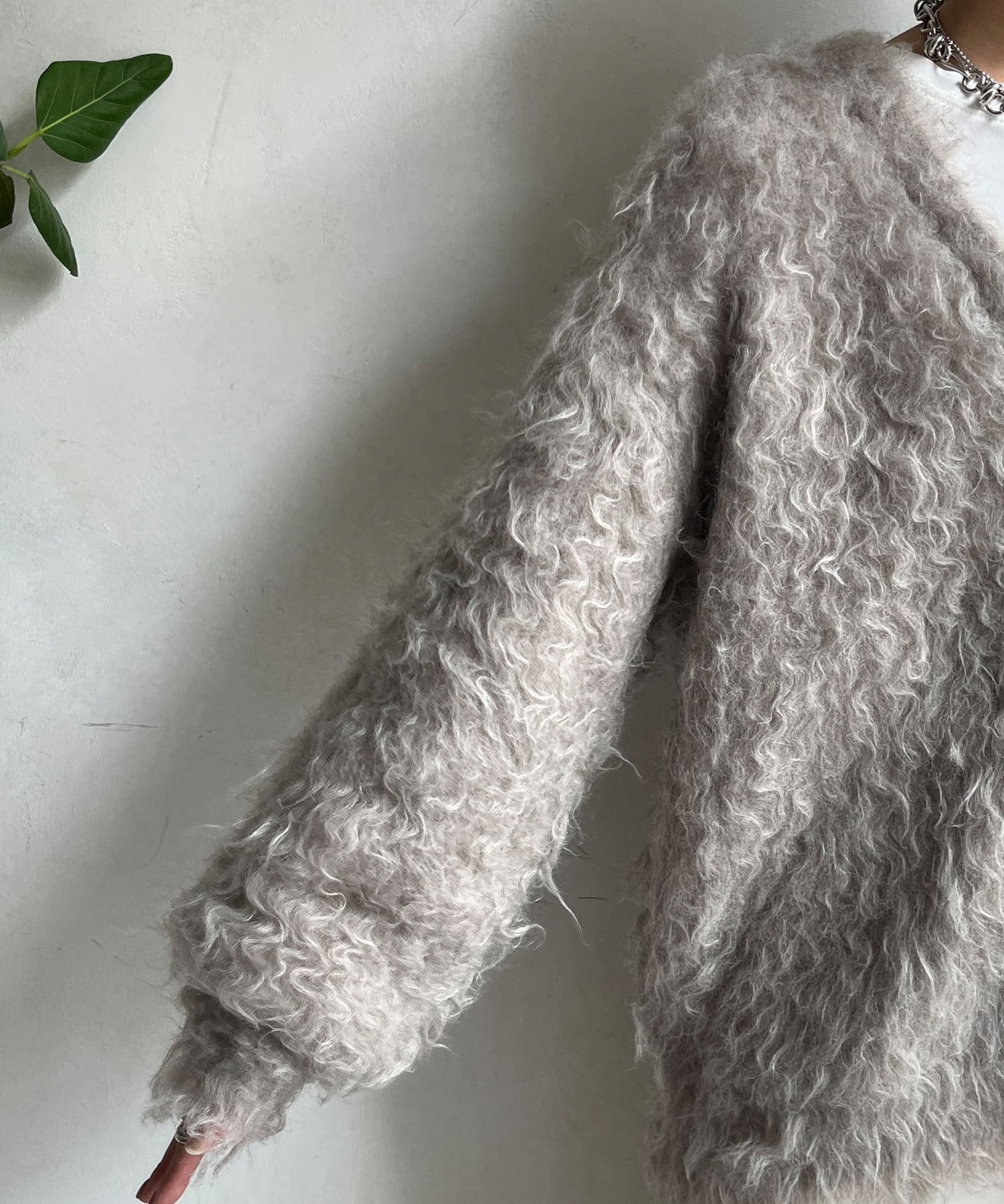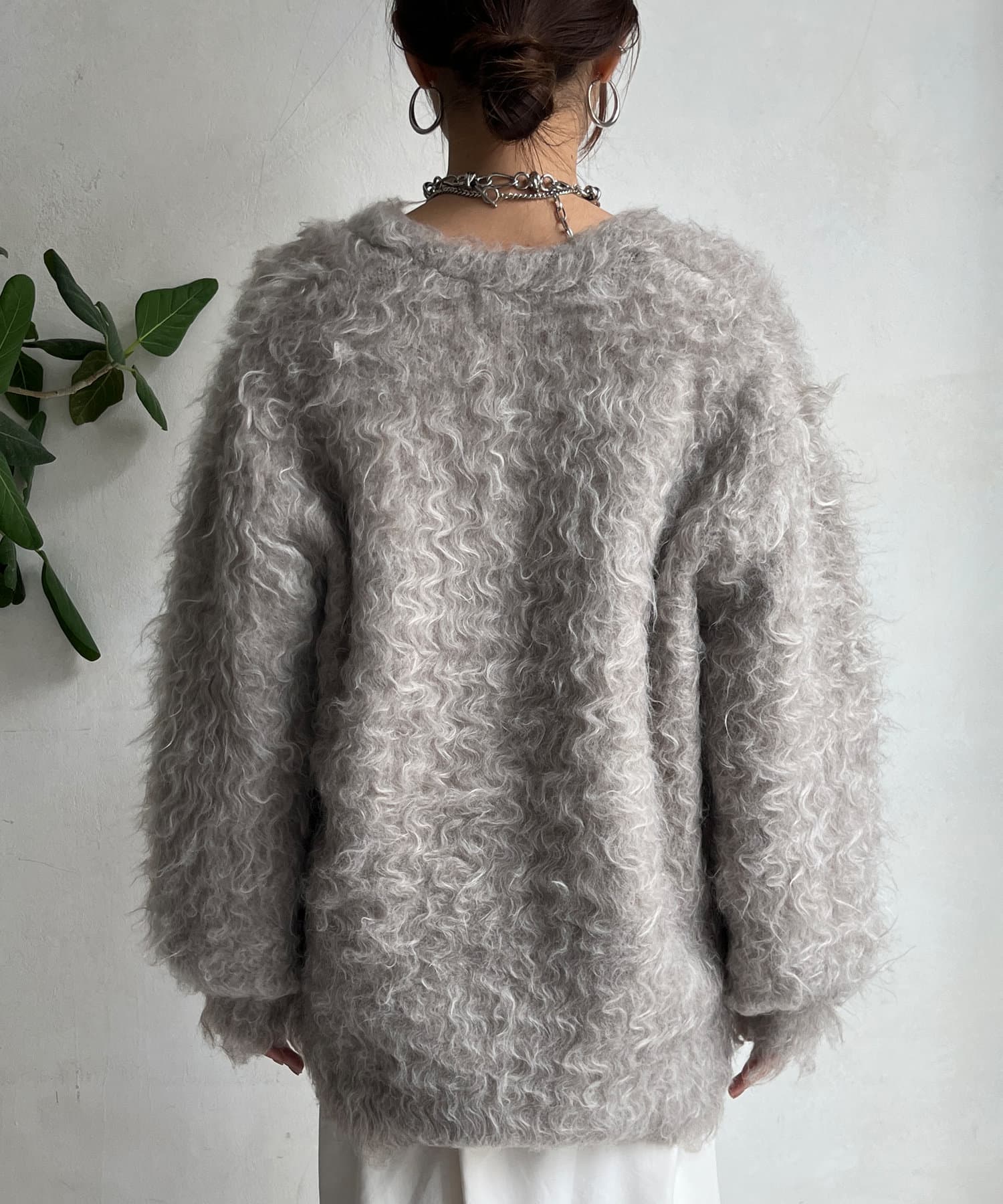 今年気になる毛足感のあるシャギーで仕上げたニットカーディガン。