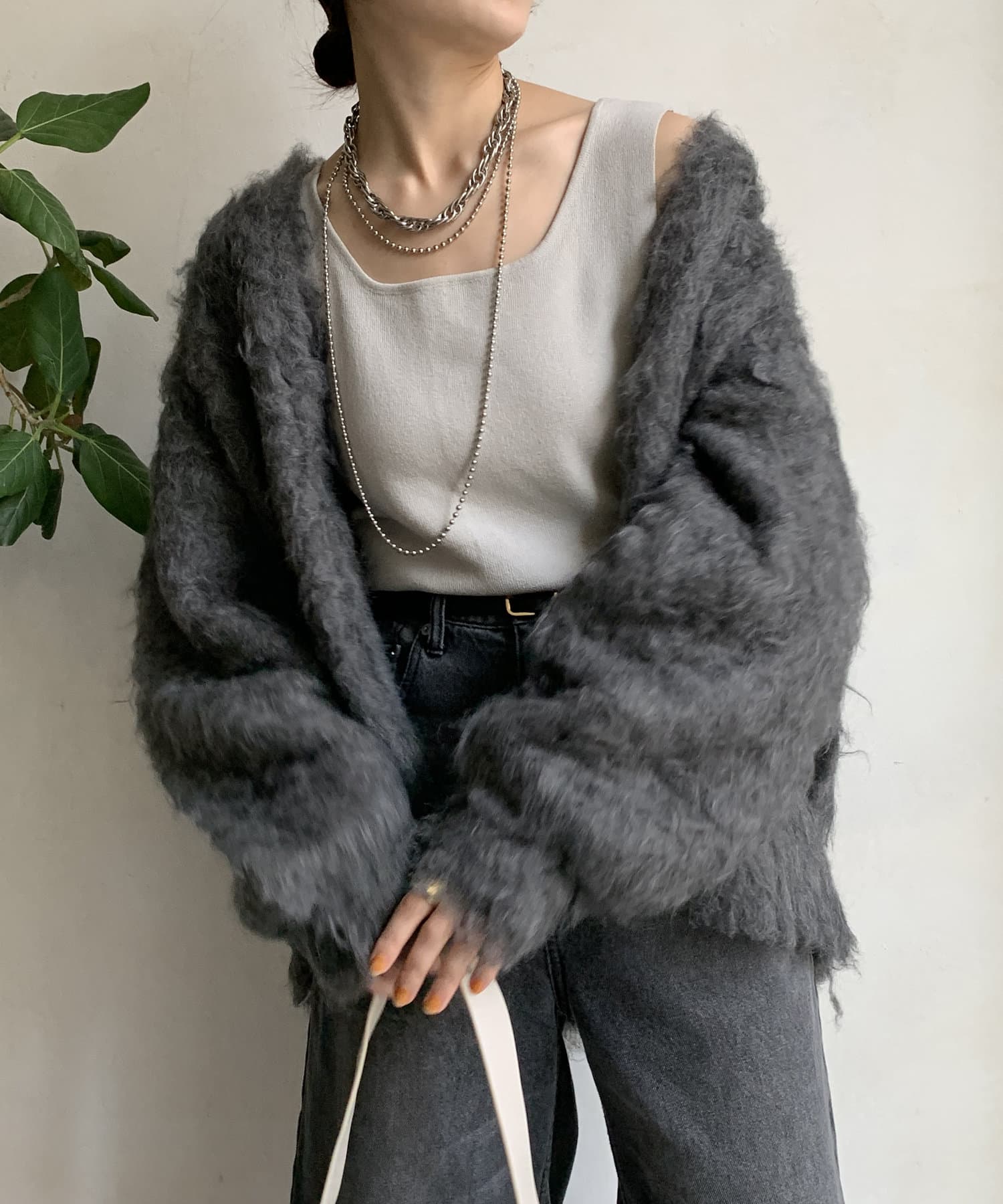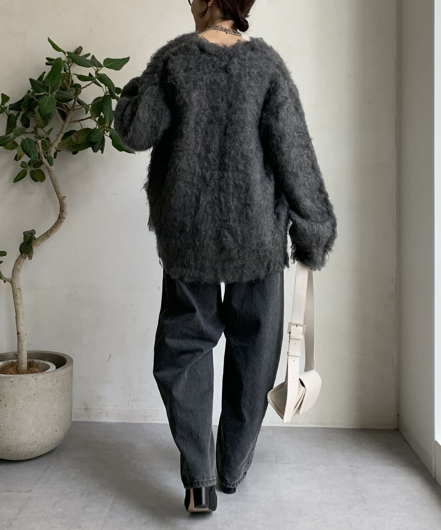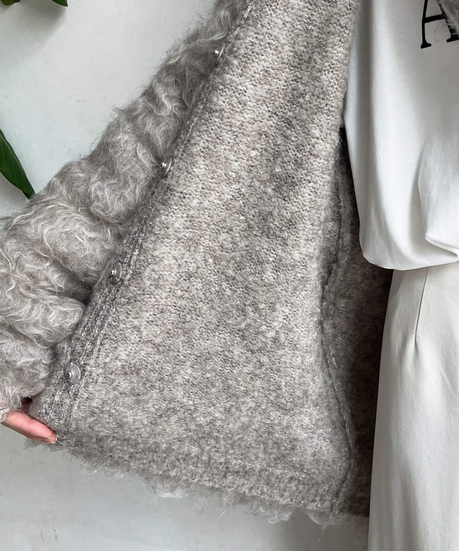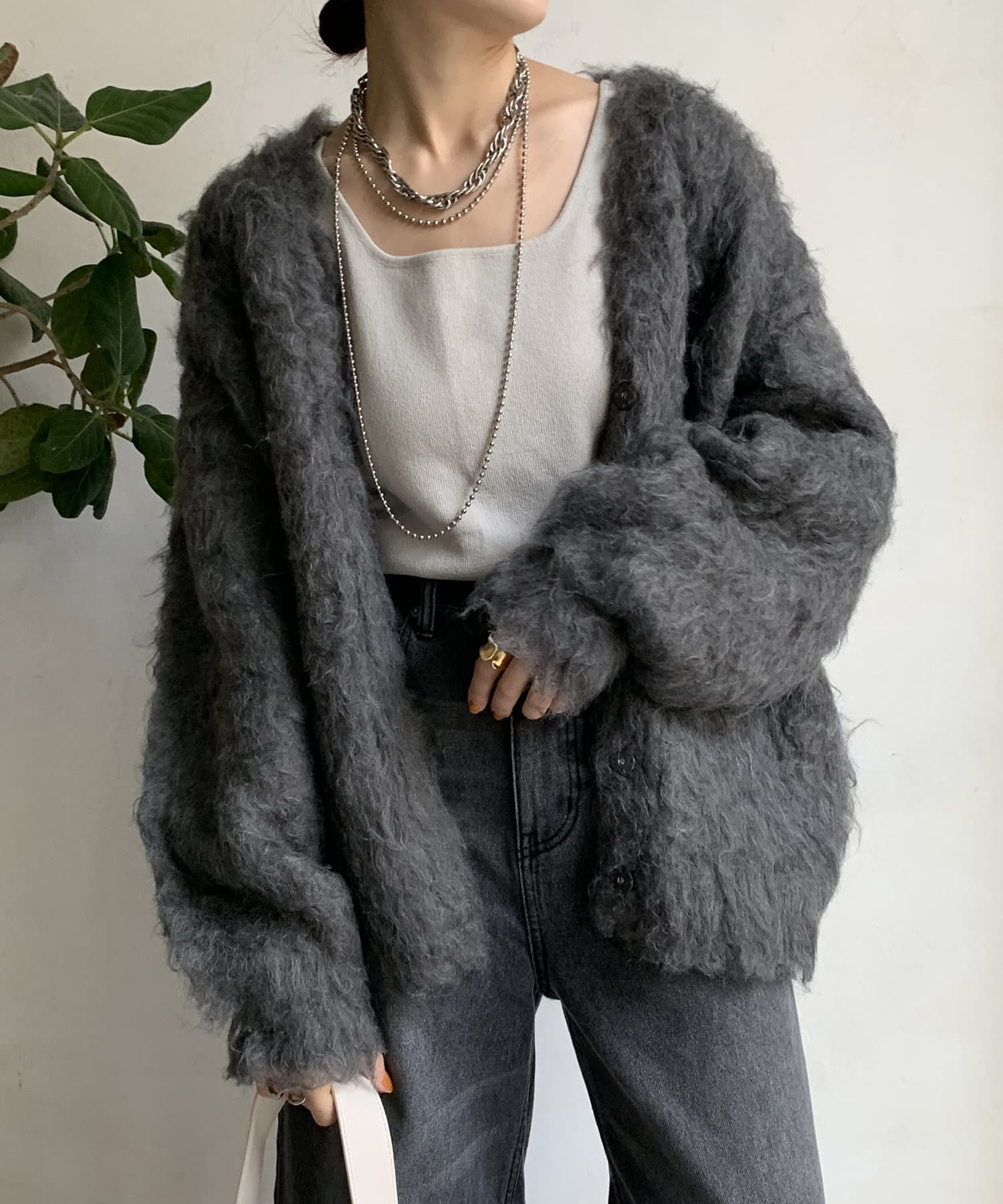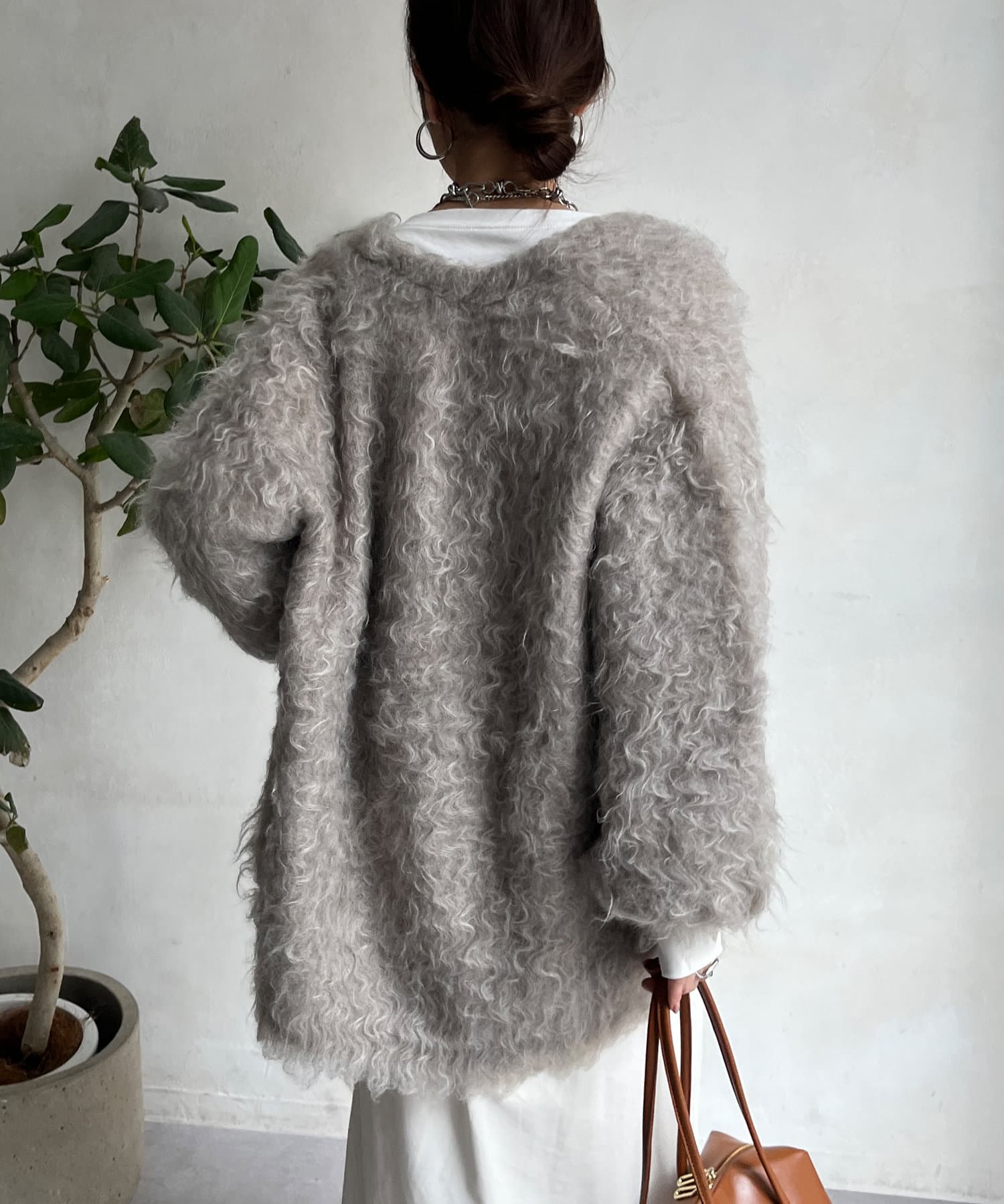今年気になる毛足感のあるシャギーで仕上げたニットカーディガン。