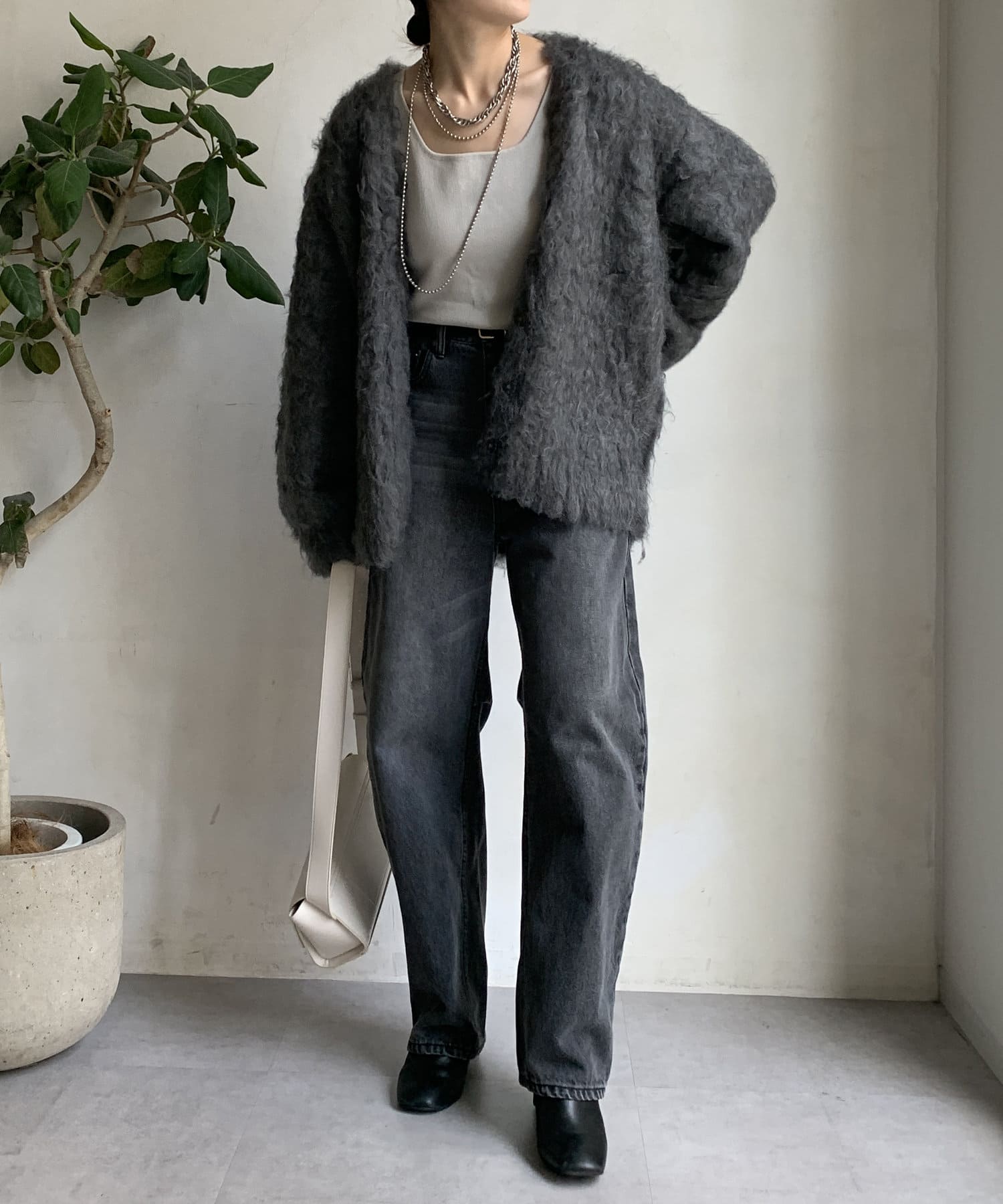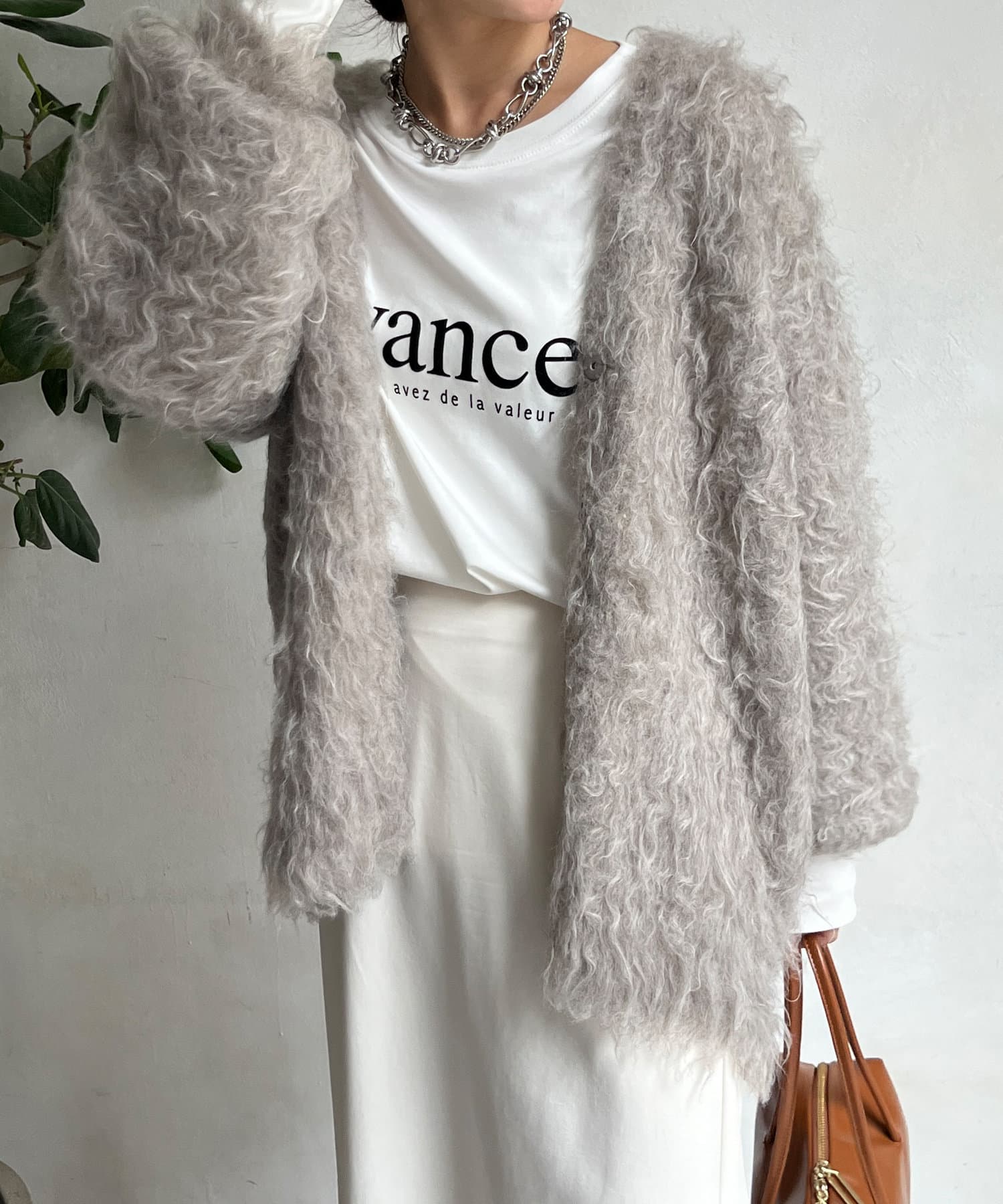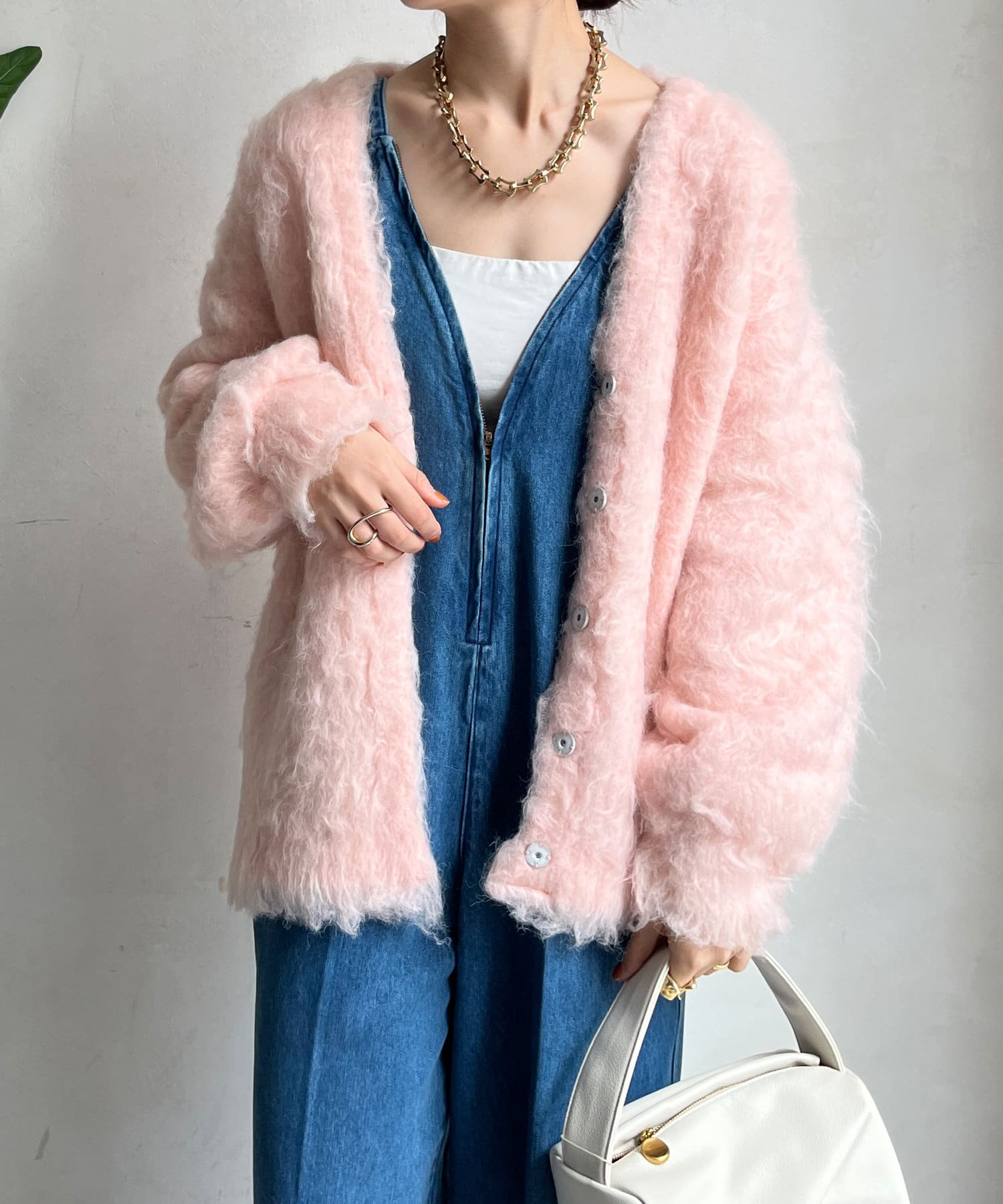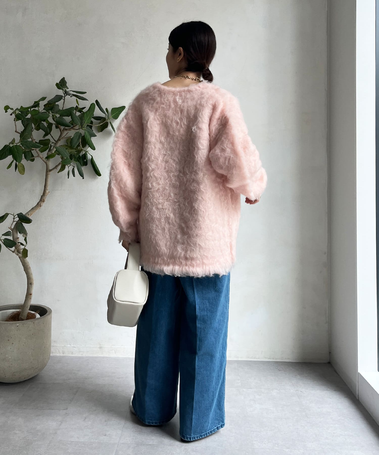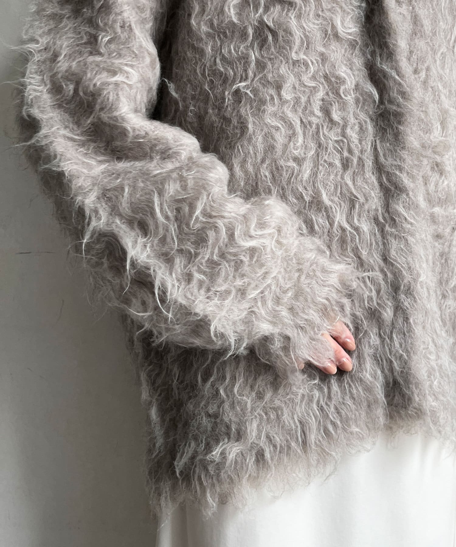 今年気になる毛足感のあるシャギーで仕上げたニットカーディガン。