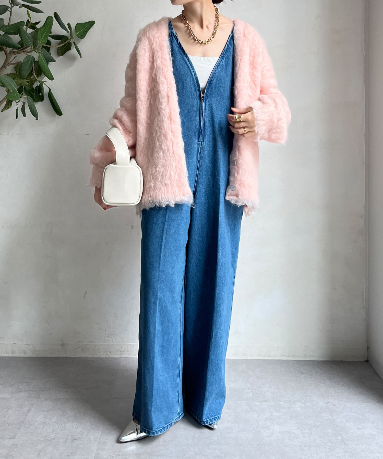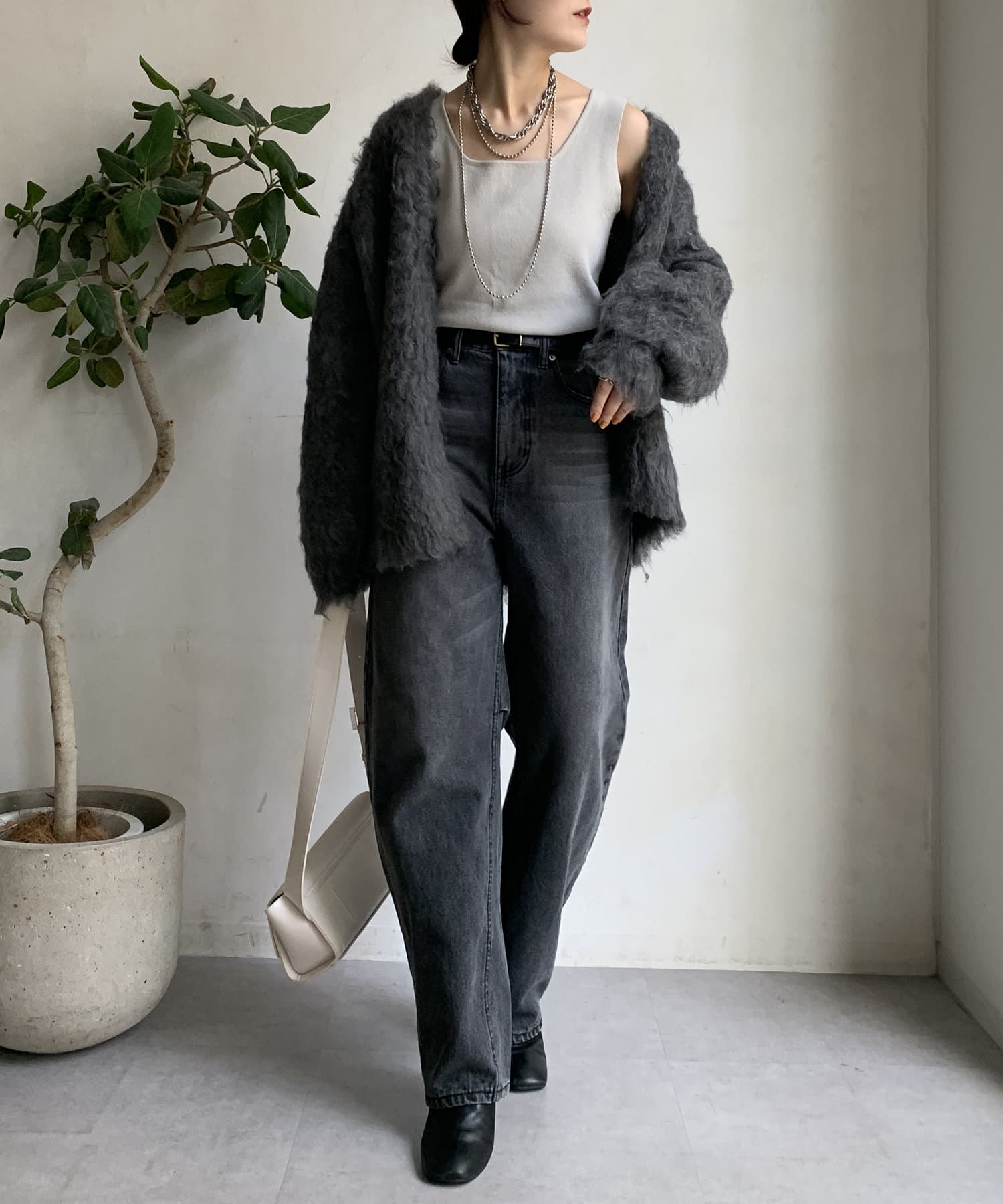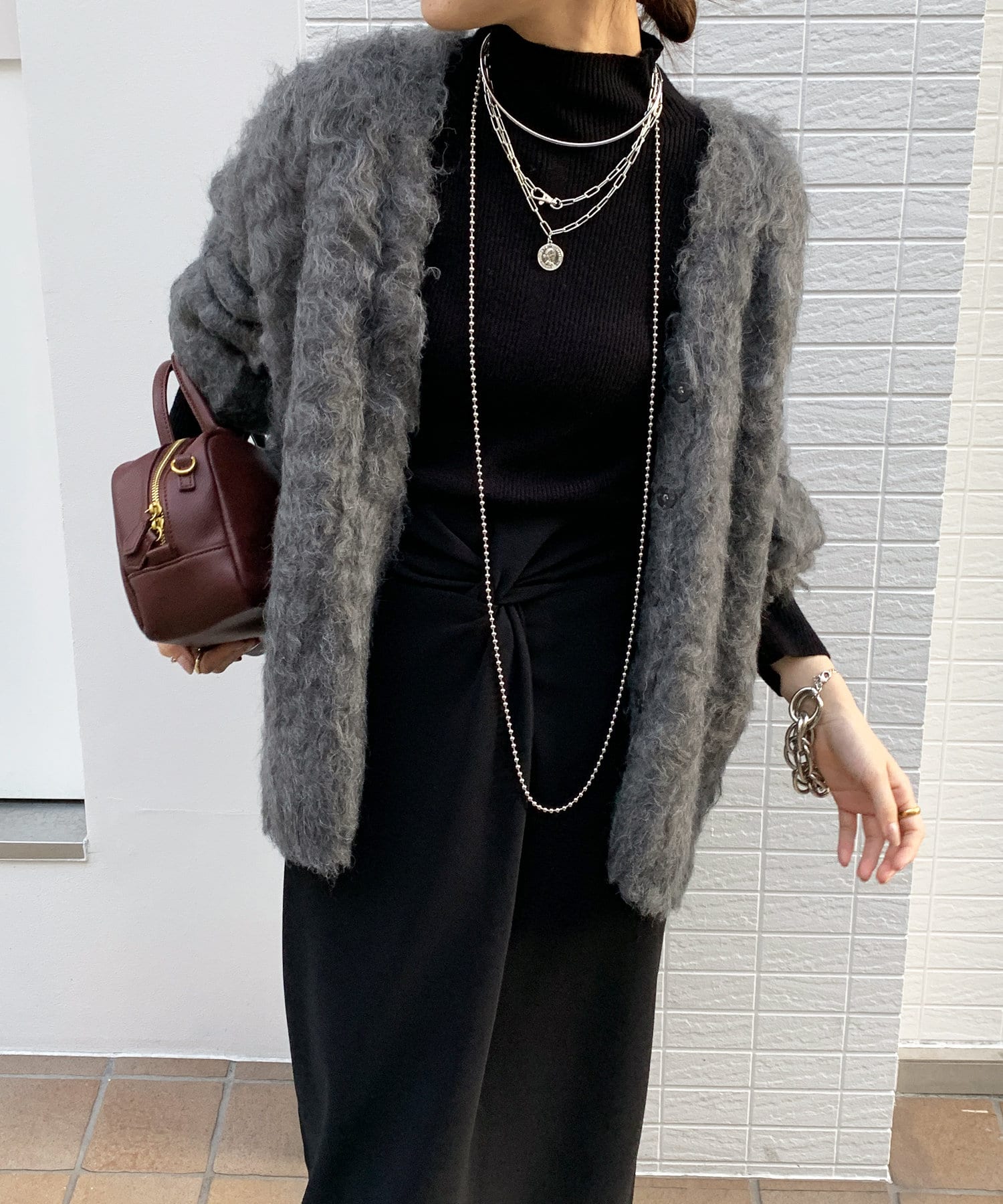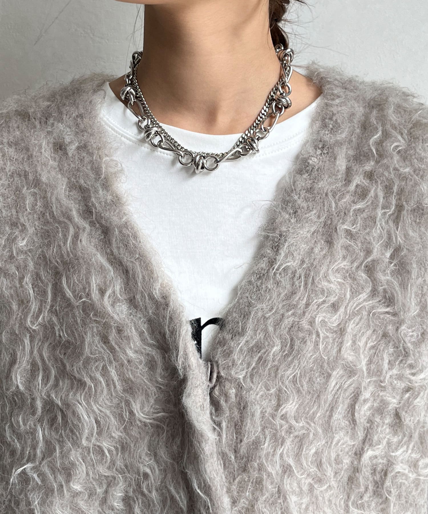 今年気になる毛足感のあるシャギーで仕上げたニットカーディガン。