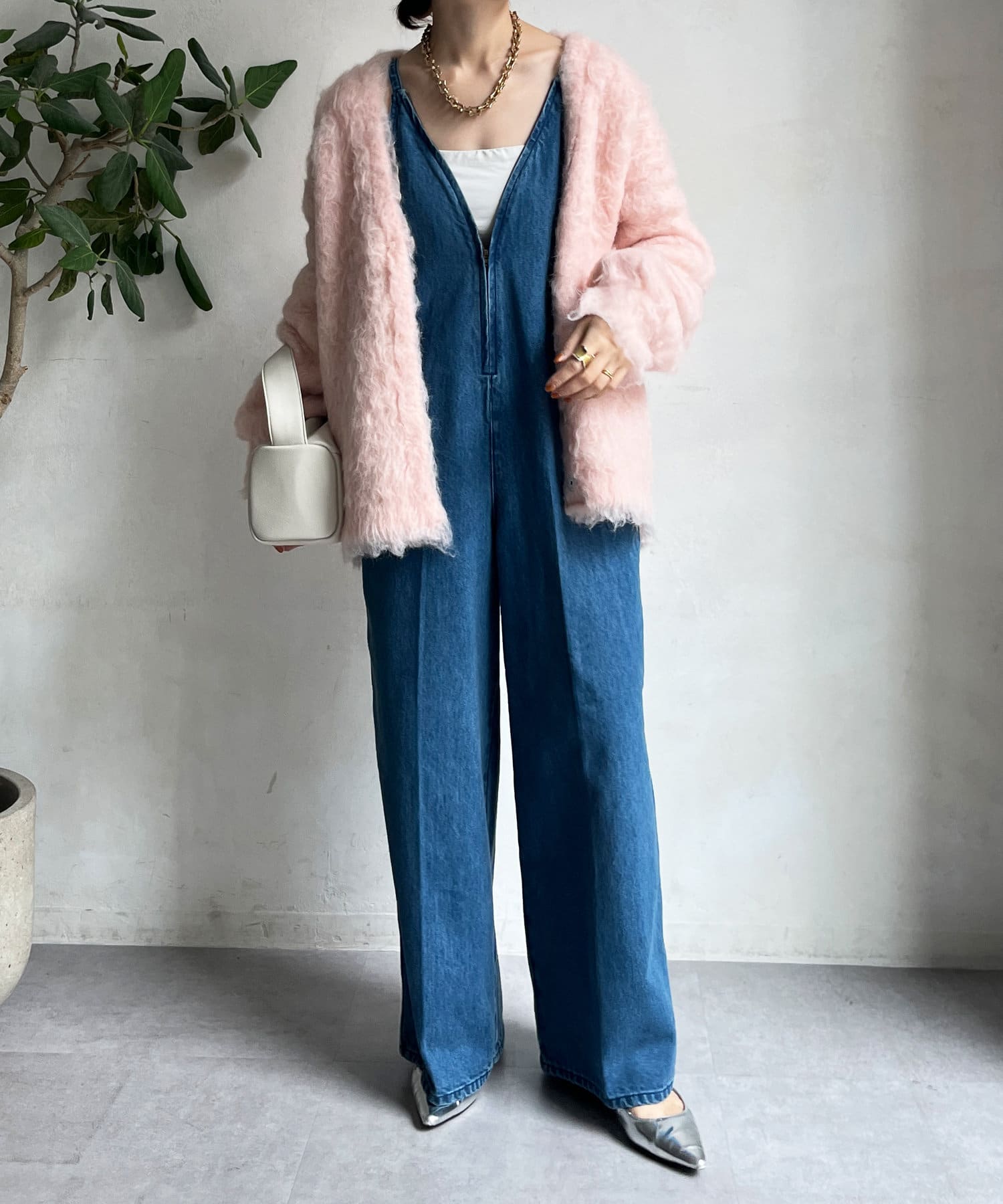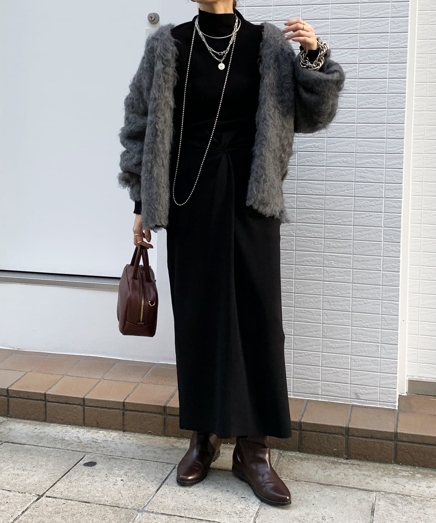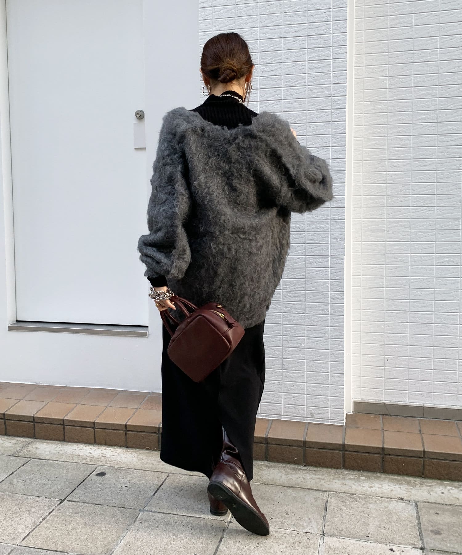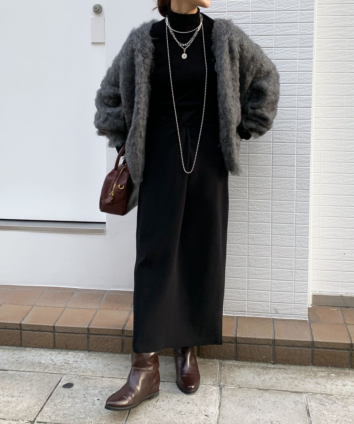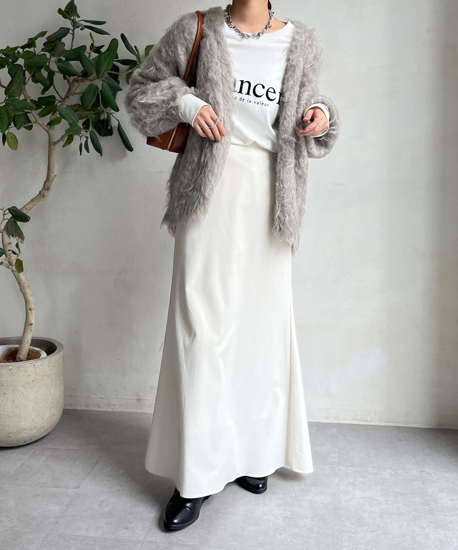 今年気になる毛足感のあるシャギーで仕上げたニットカーディガン。