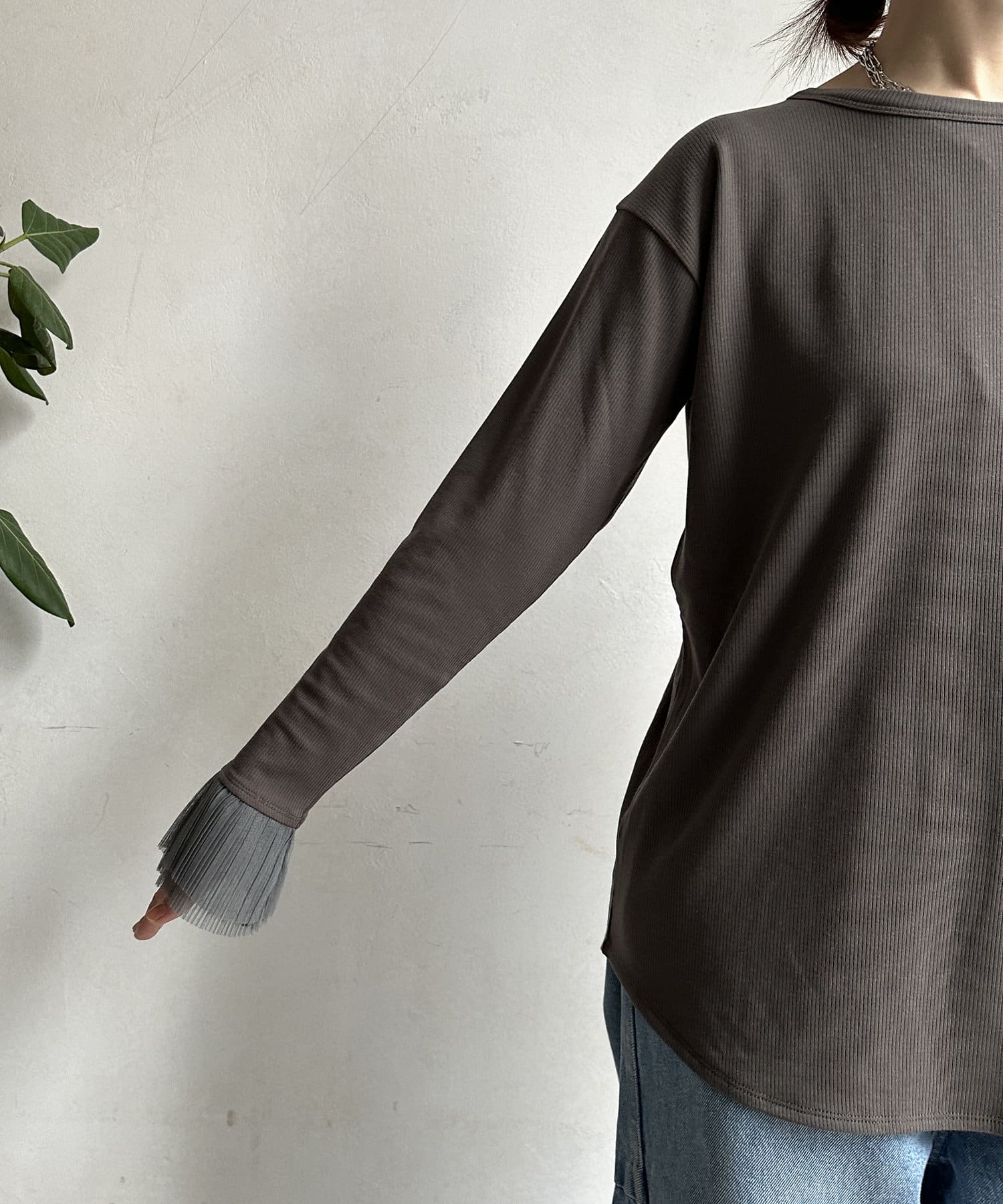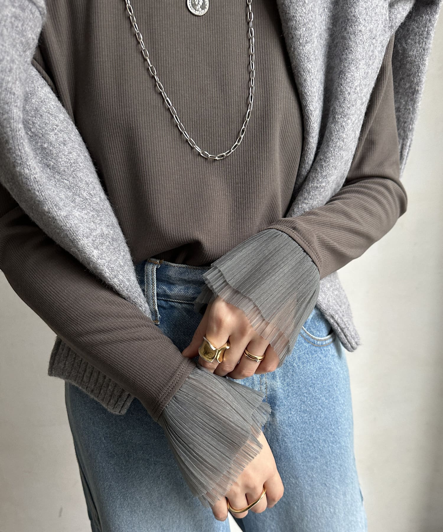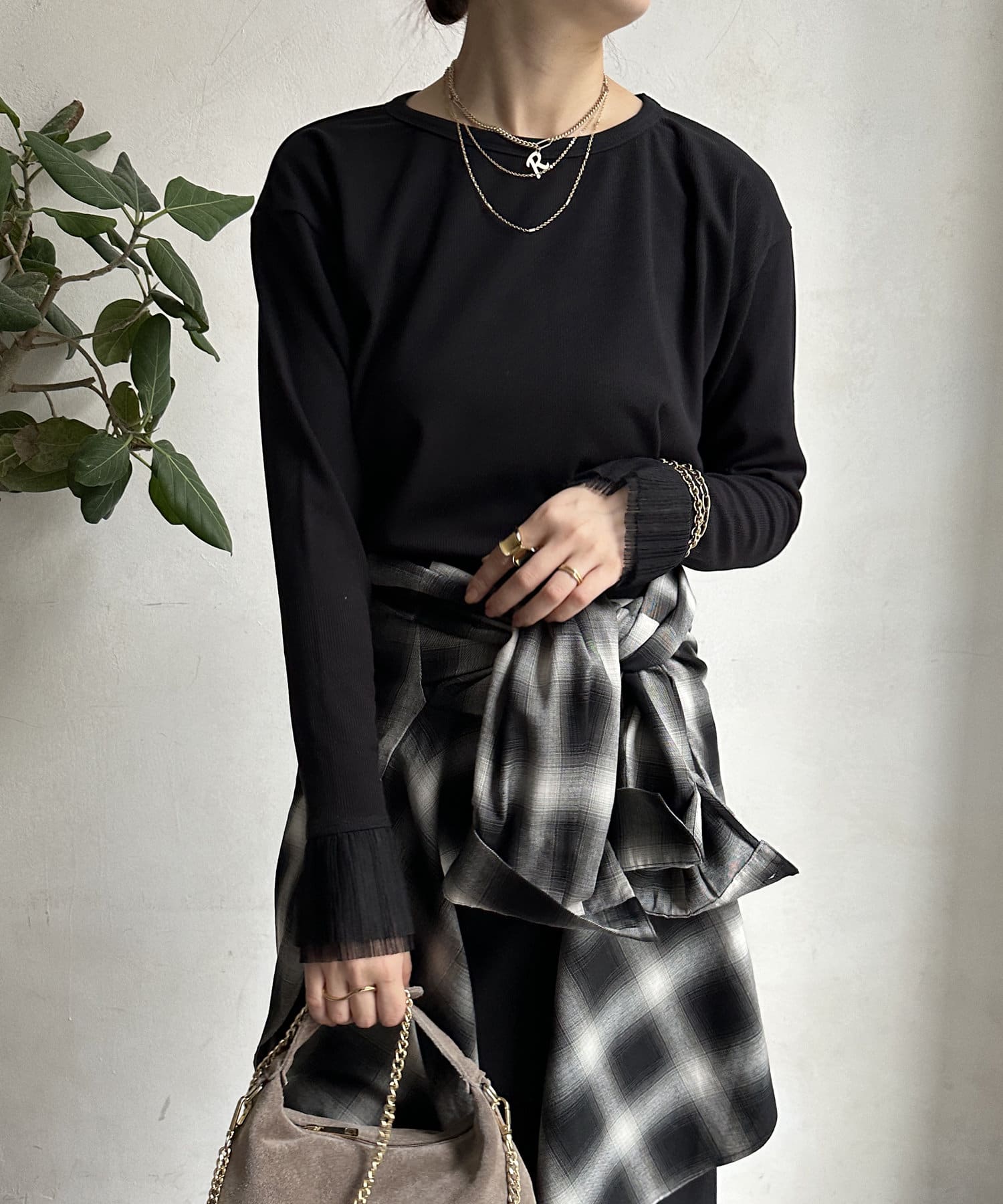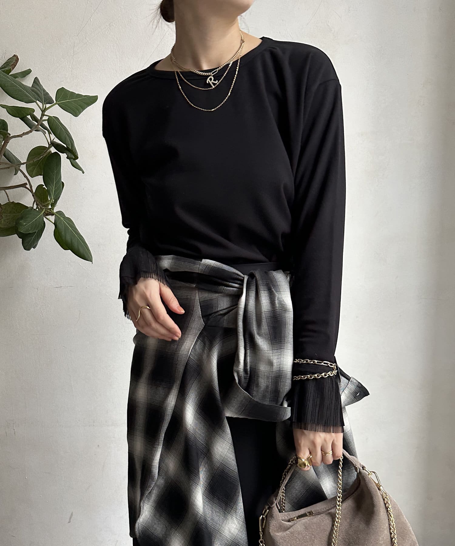 インナーとしてレイヤードをすると、袖口から見えるチュールが
