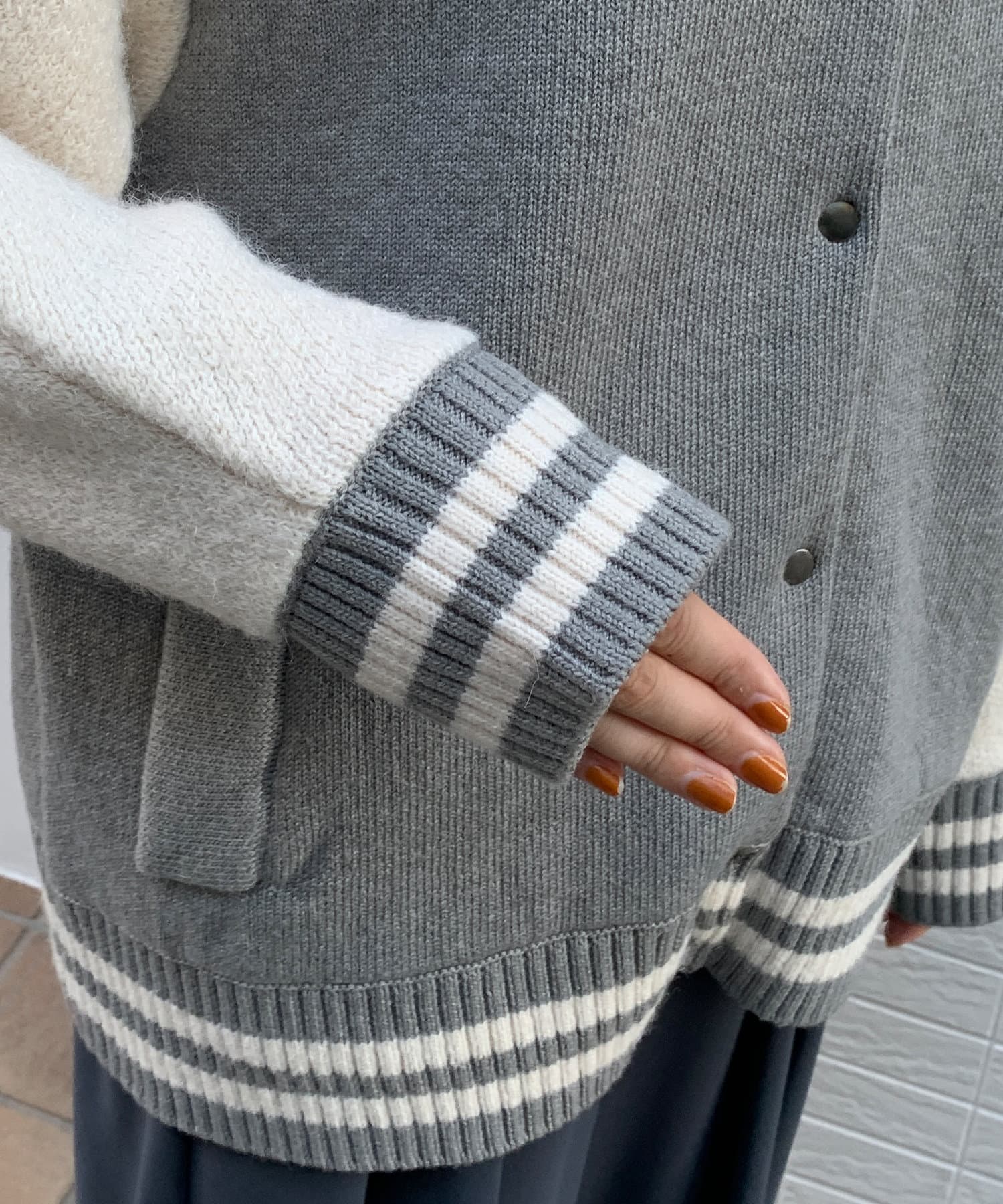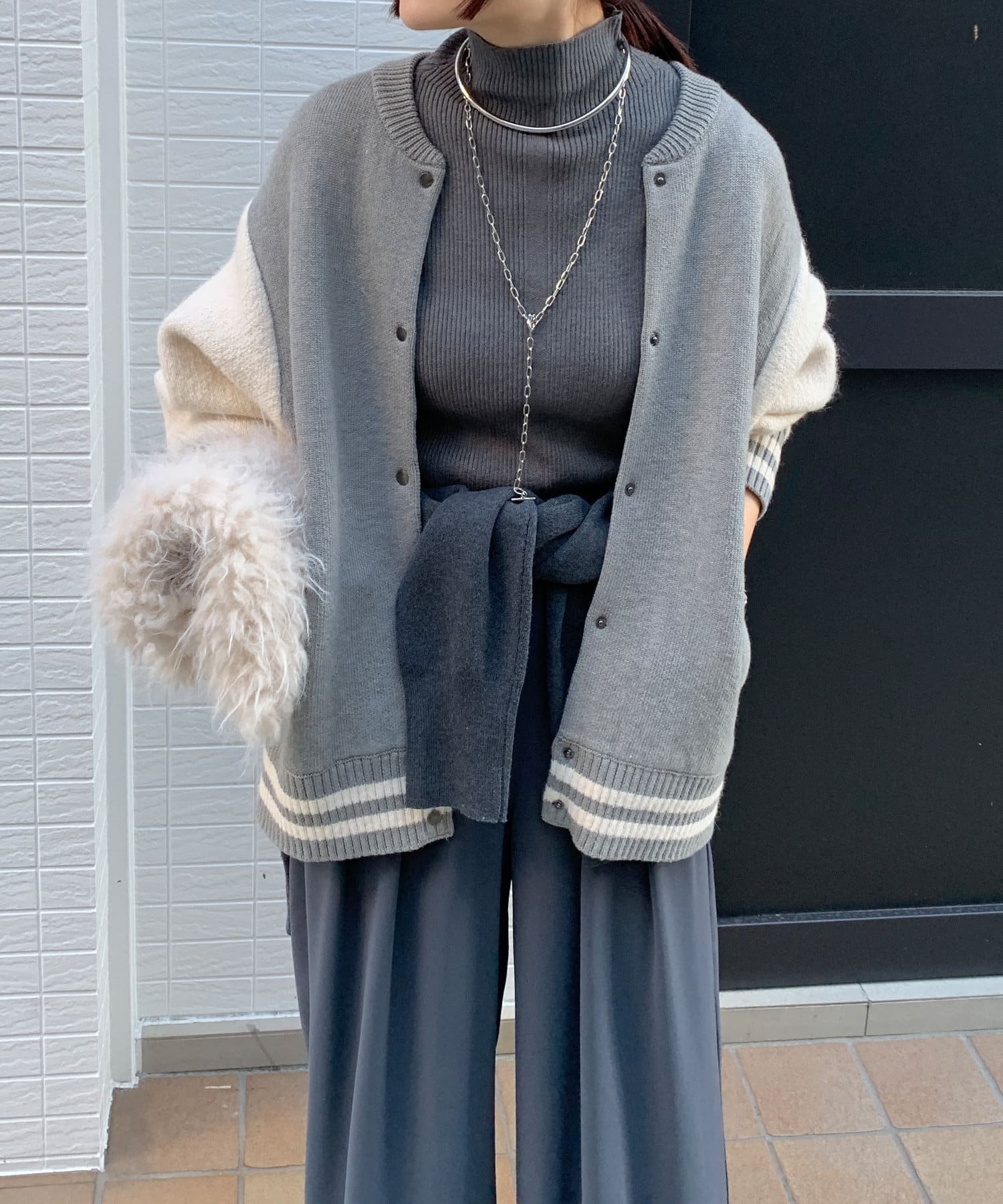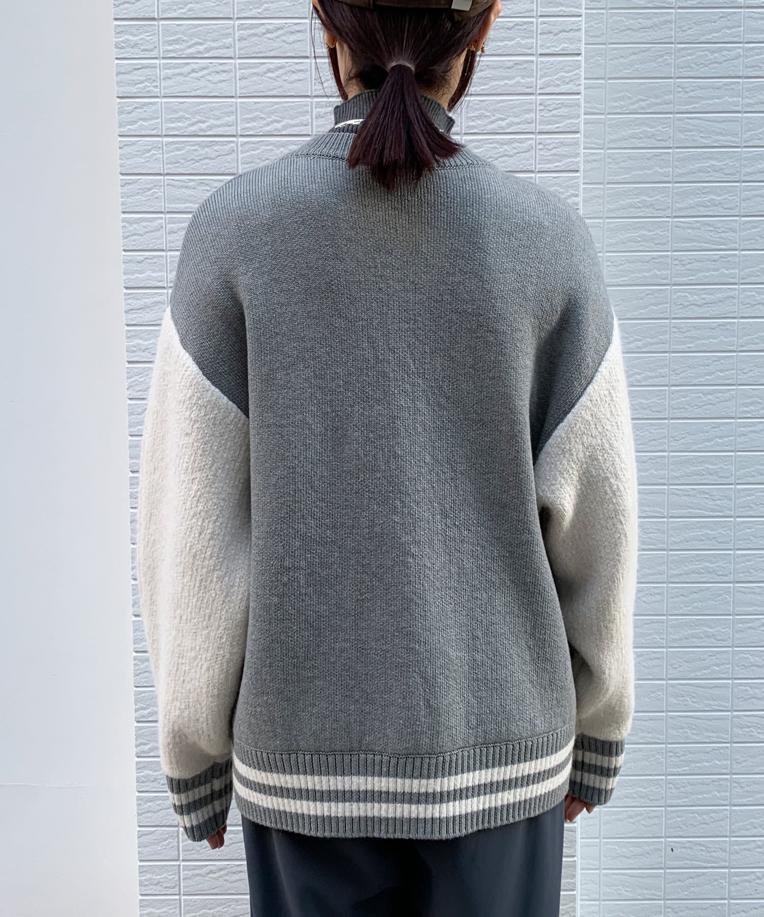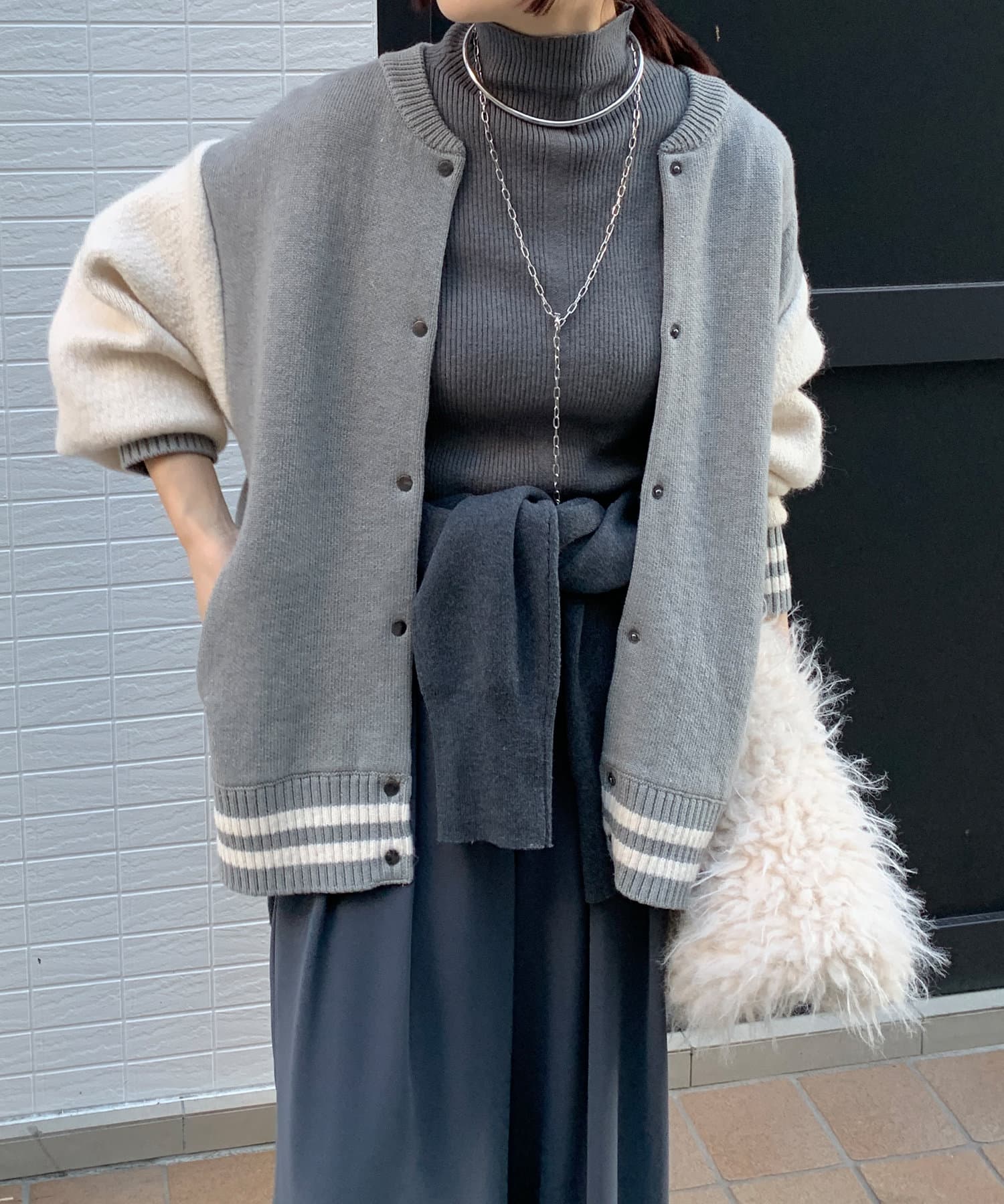 メンズライクなアイテムをニット素材で仕上げることで、スタジャンほどカジュアルすぎず、ニットほどラフ過ぎない絶妙なバランスが完成。コーディネートを大人カジュアルに仕上げてくれます。