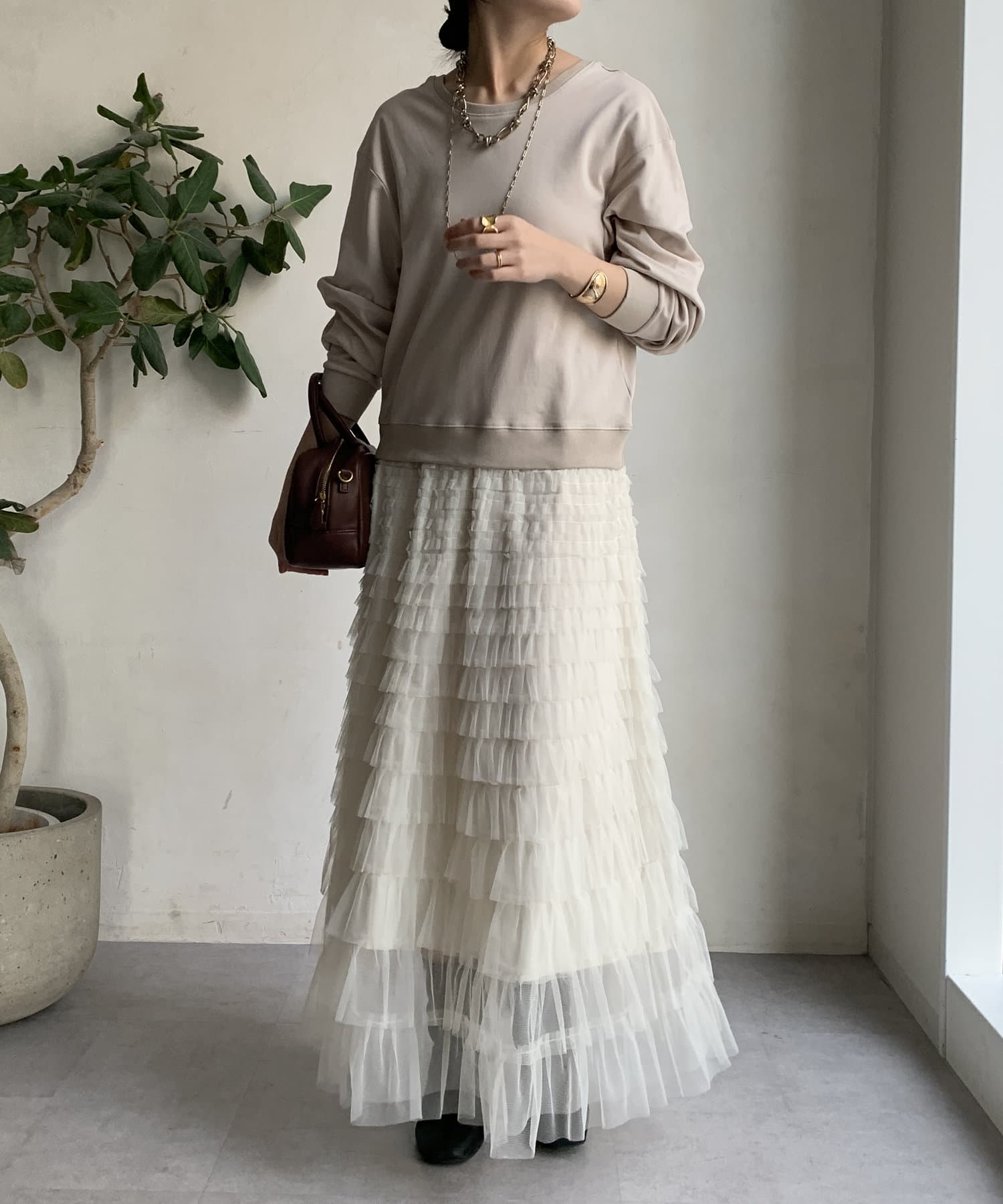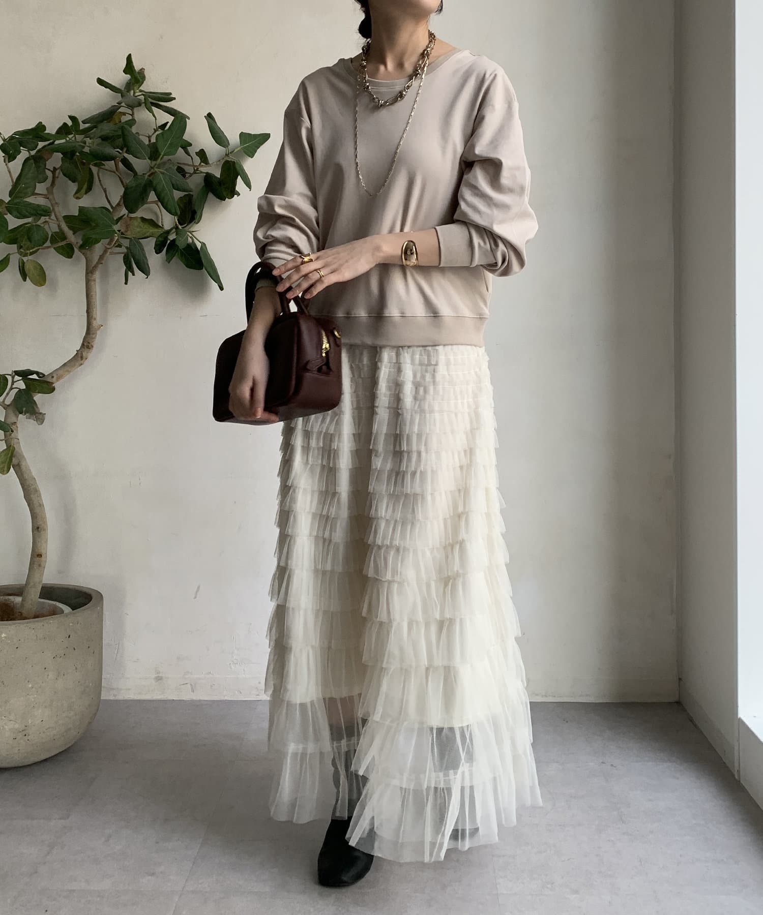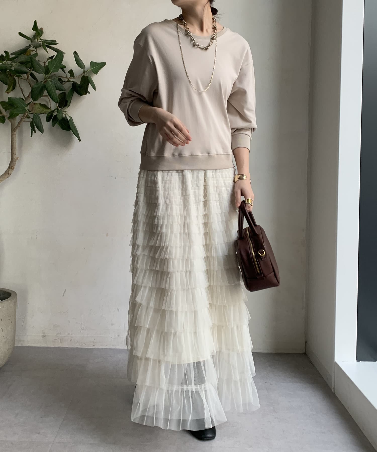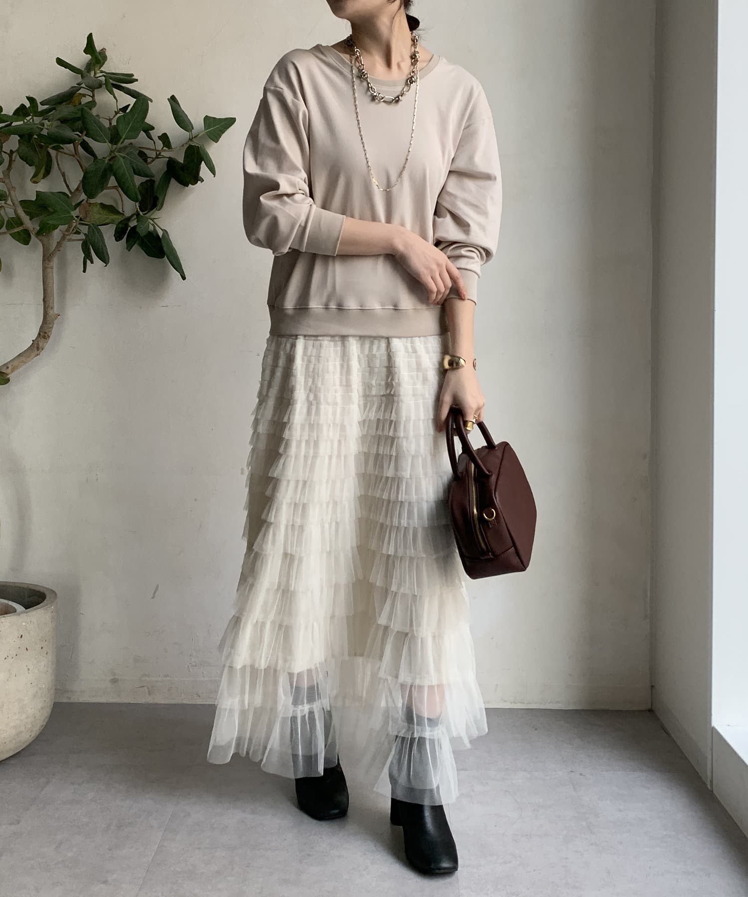 スカートには透け感があるので、女性らしさを出しながら、簡単にスタイリングが