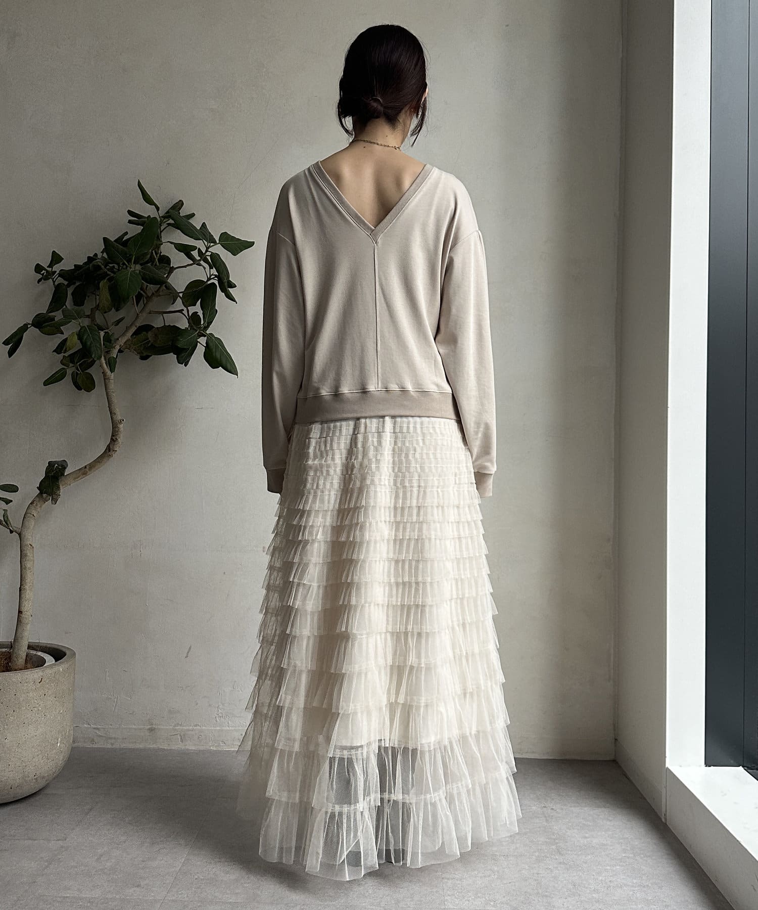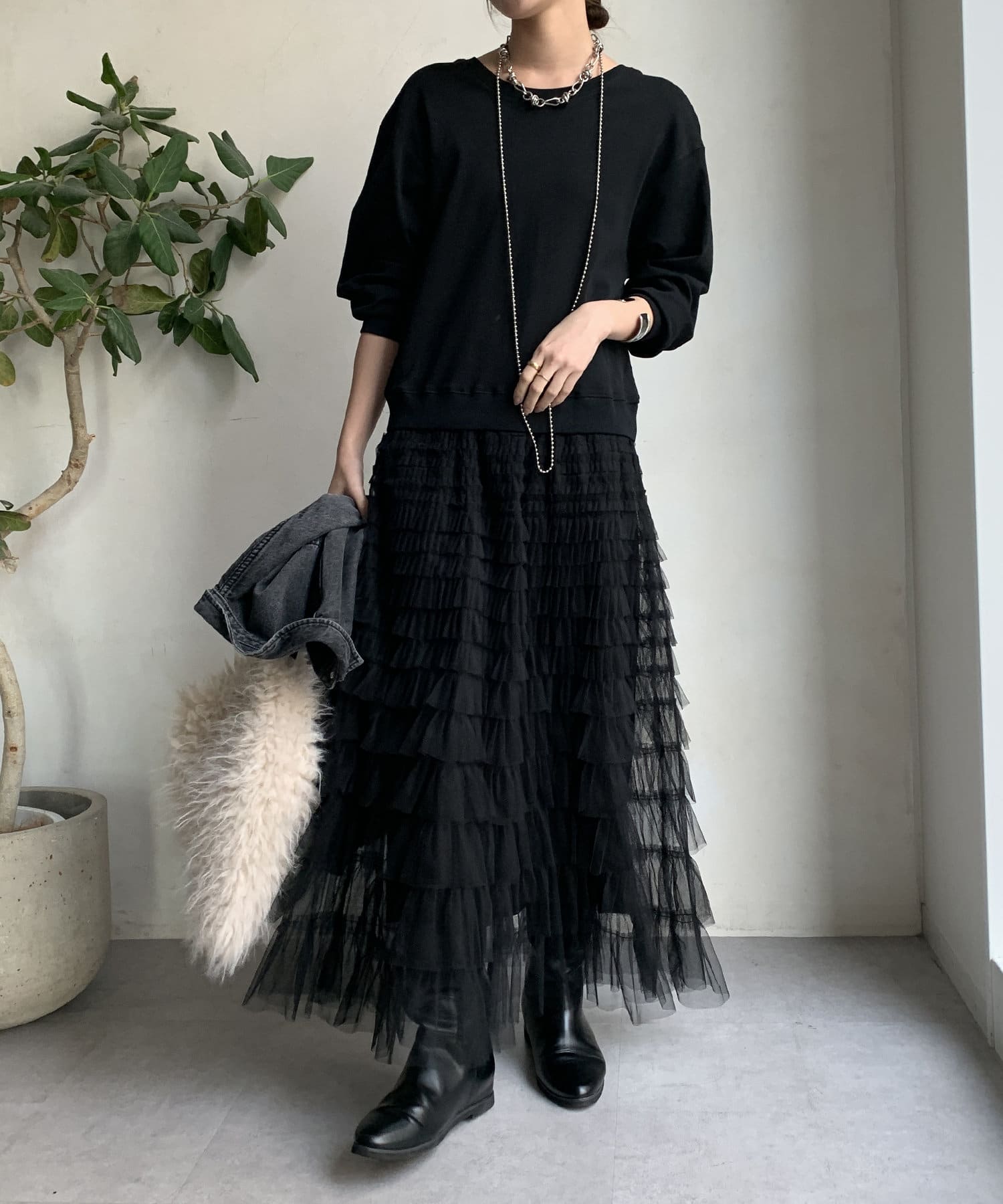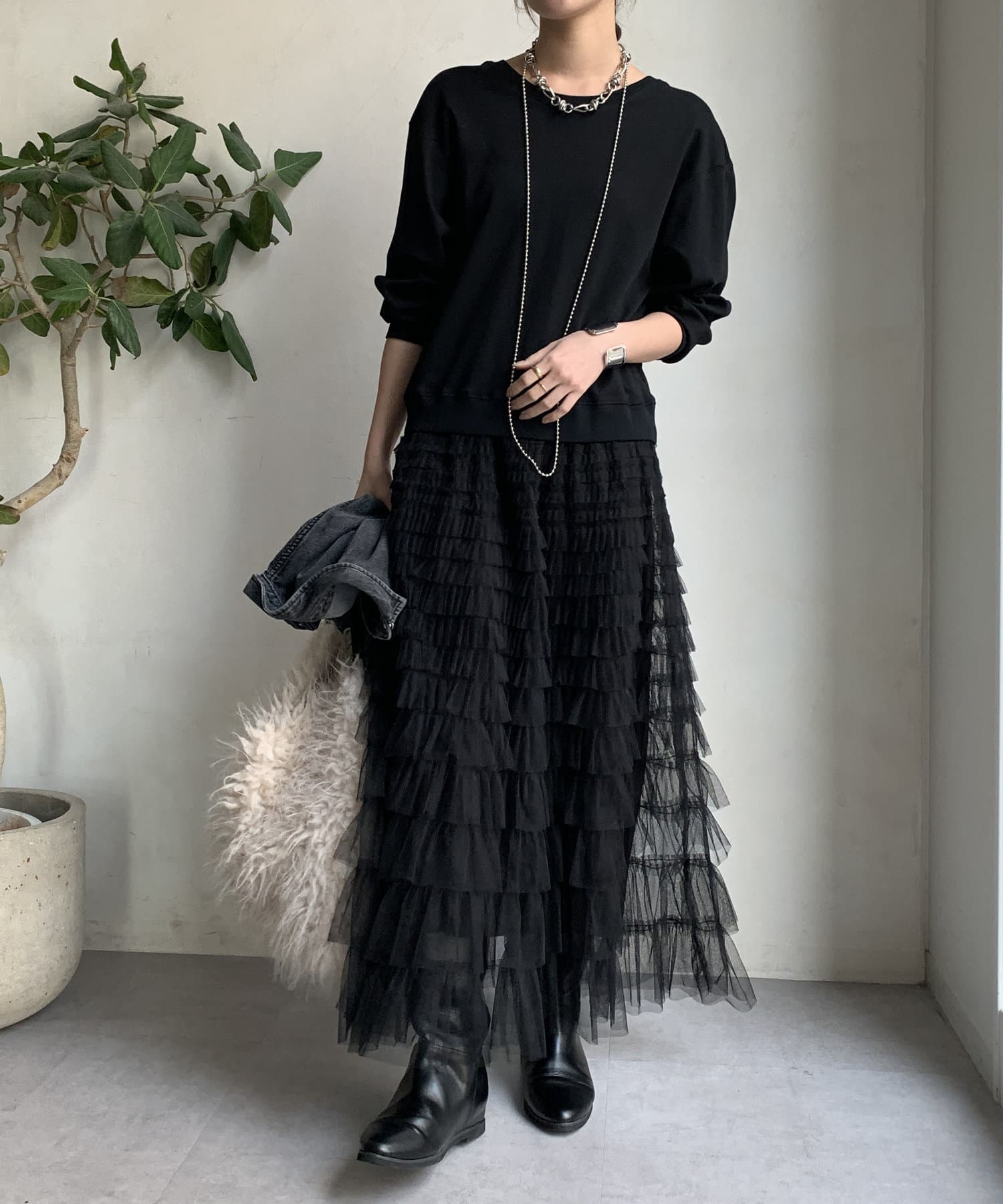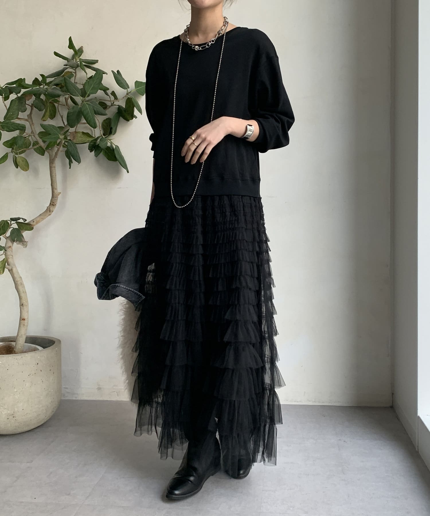 スカートには透け感があるので、女性らしさを出しながら、簡単にスタイリングが