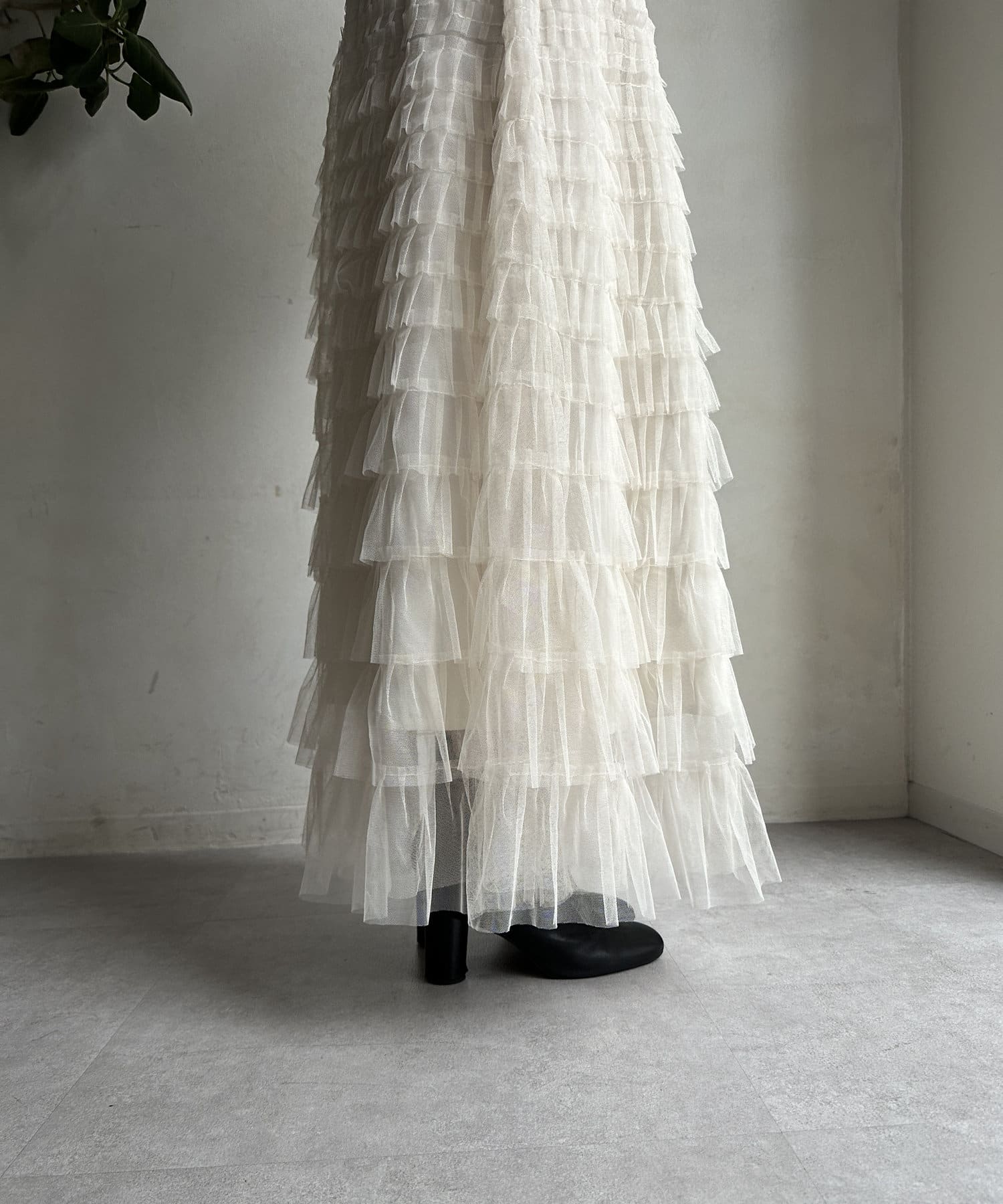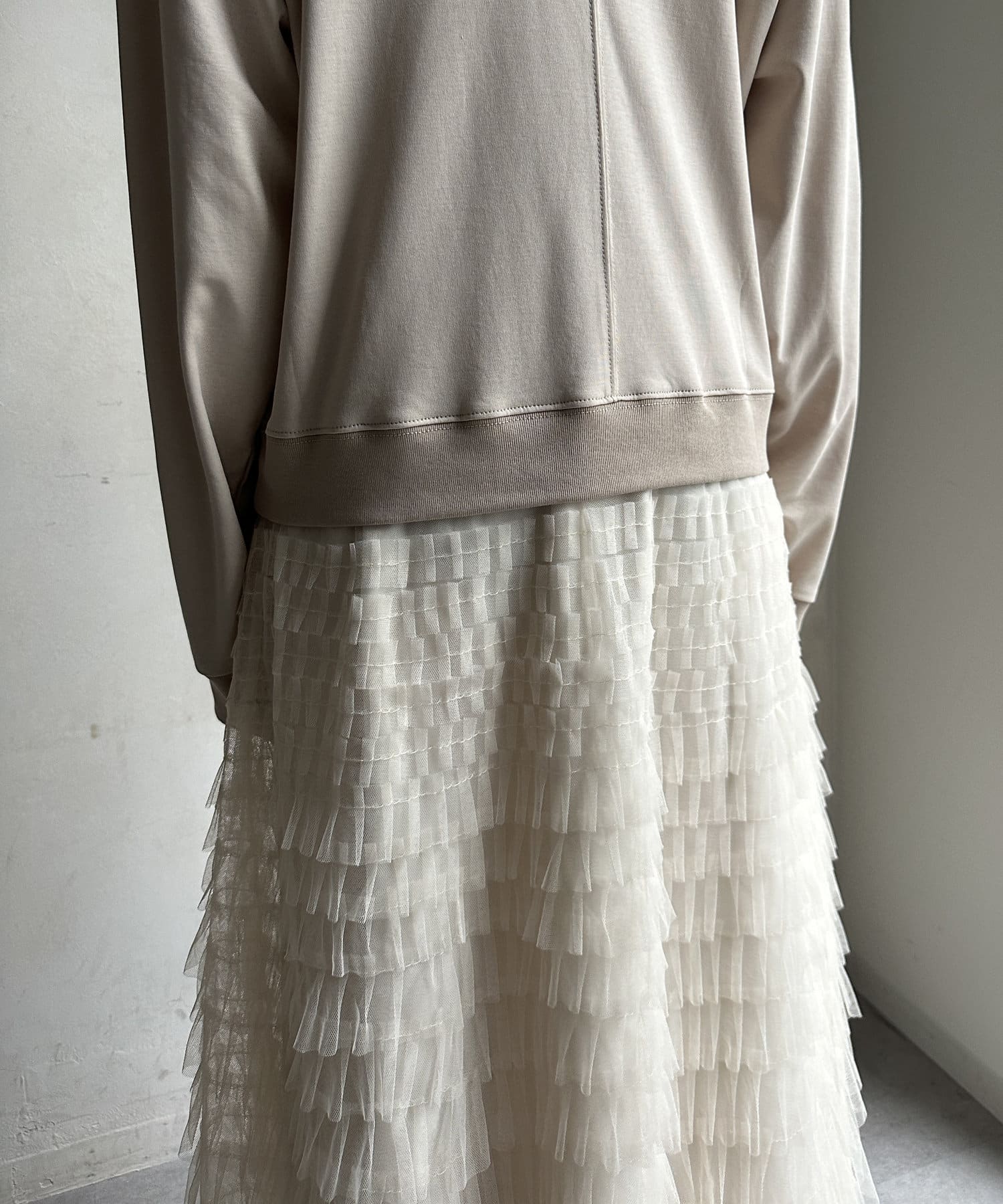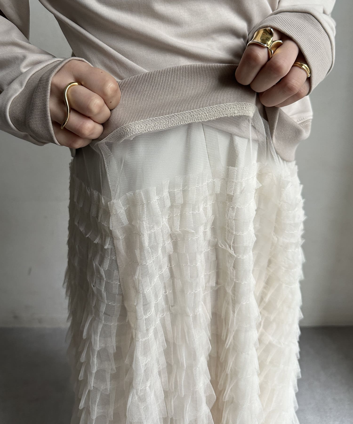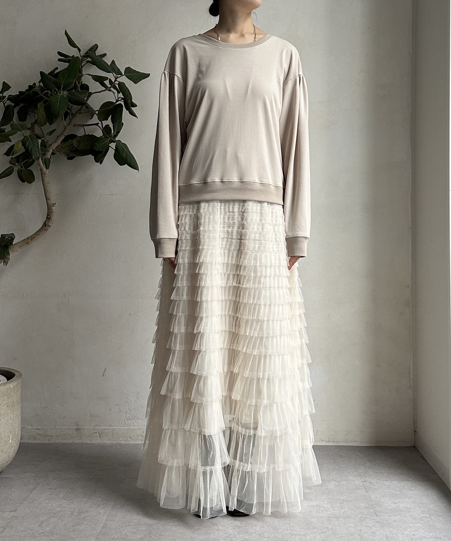 スカートには透け感があるので、女性らしさを出しながら、簡単にスタイリングが