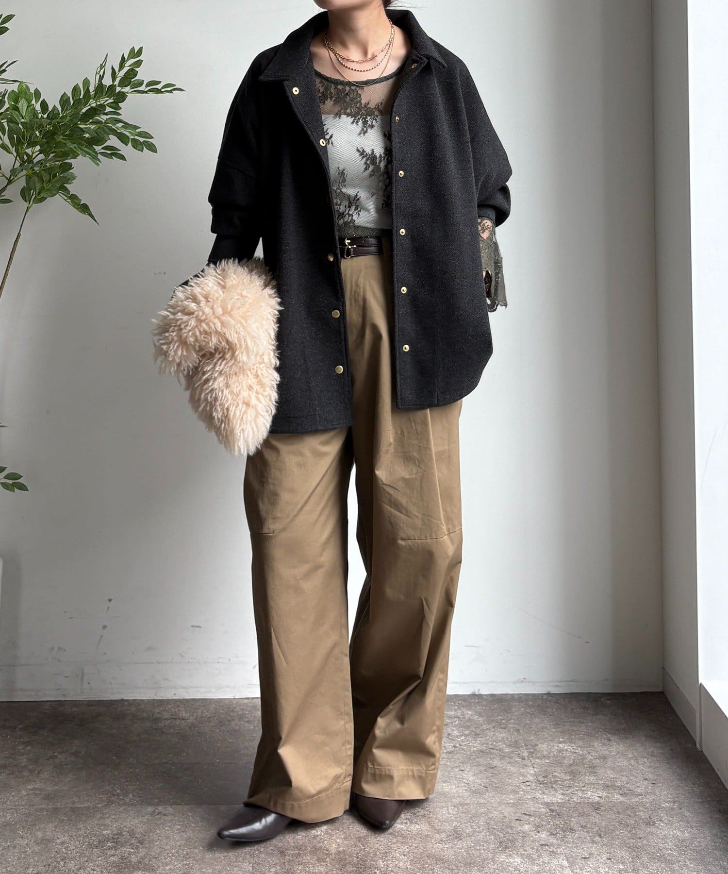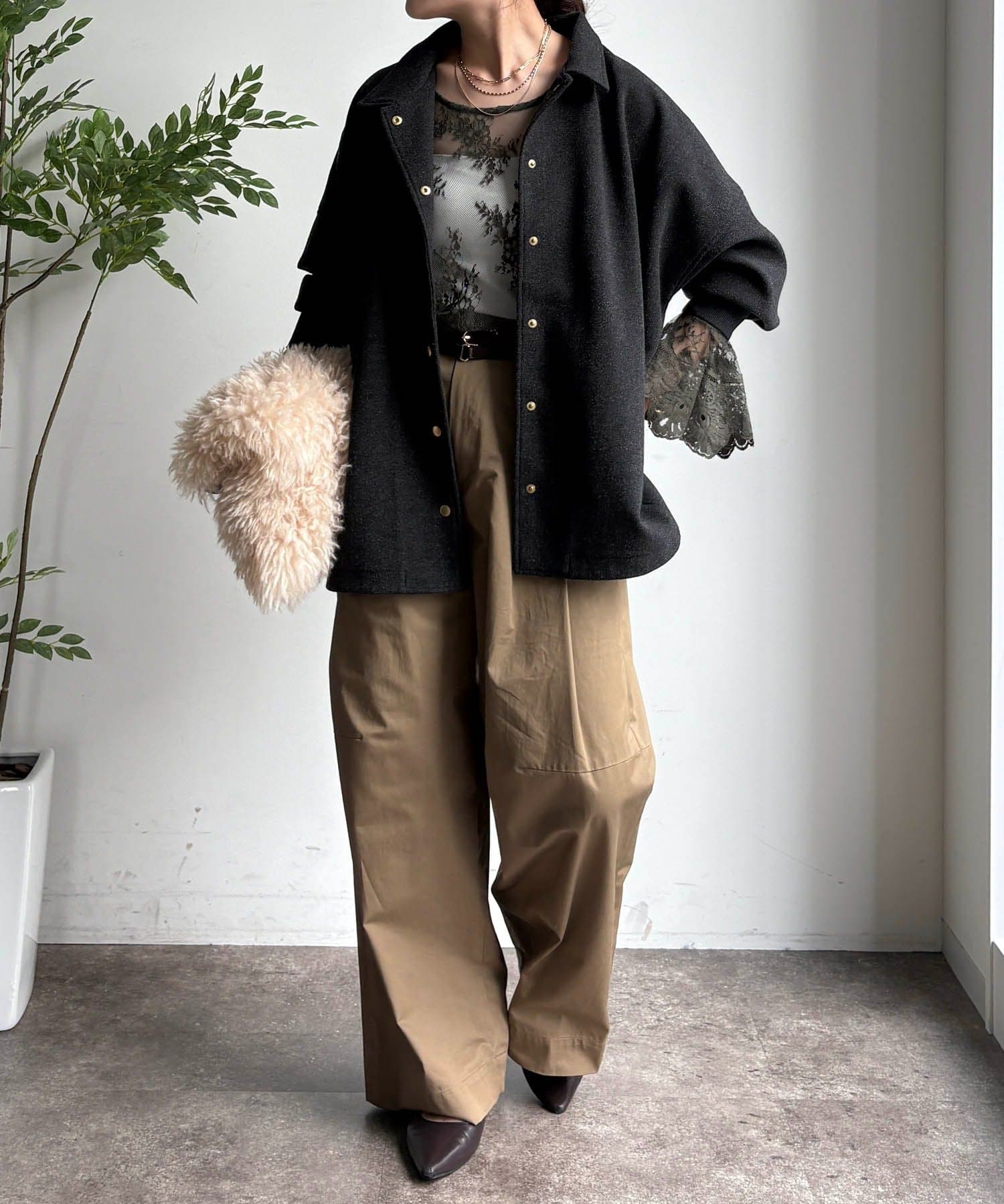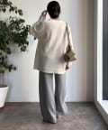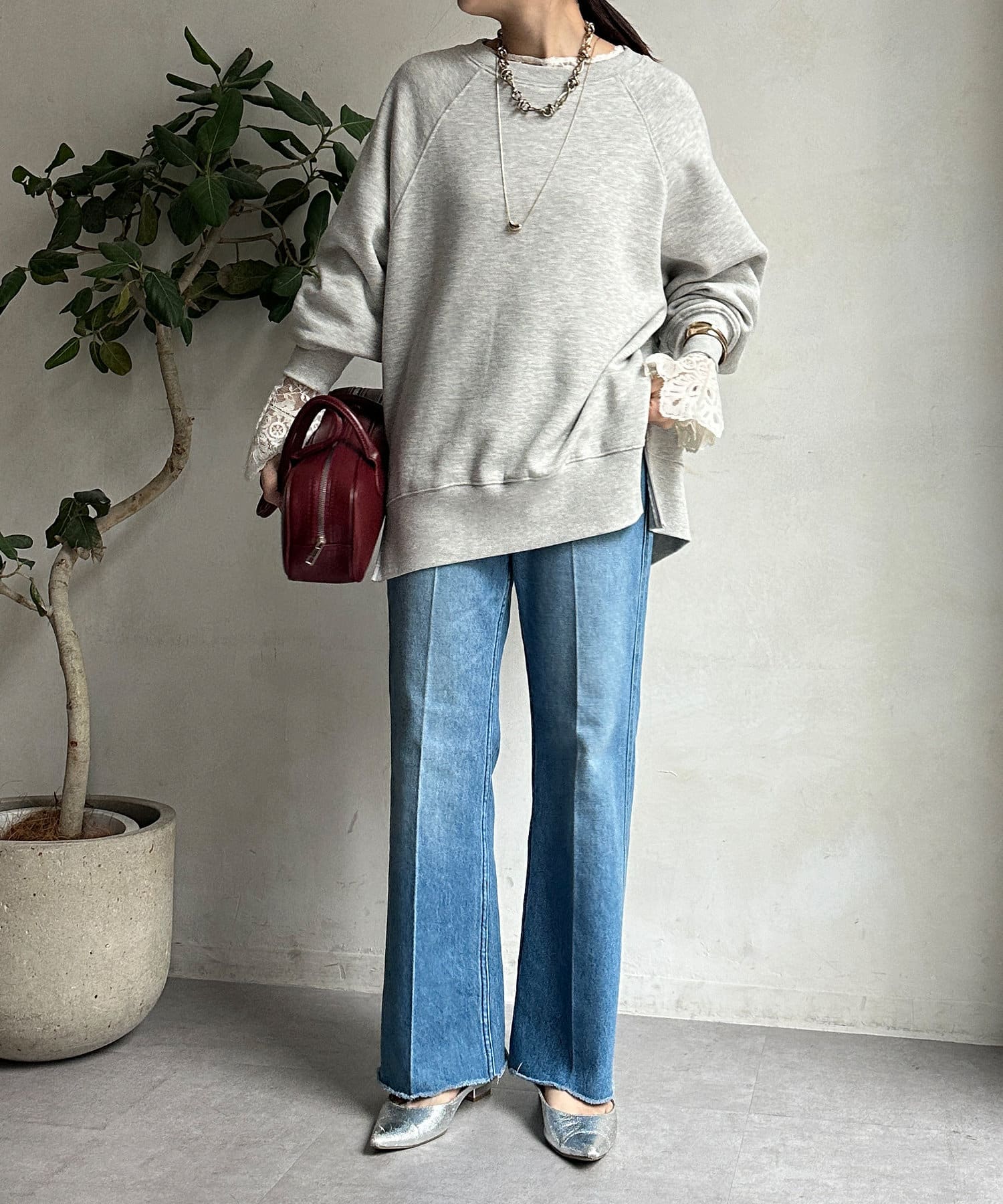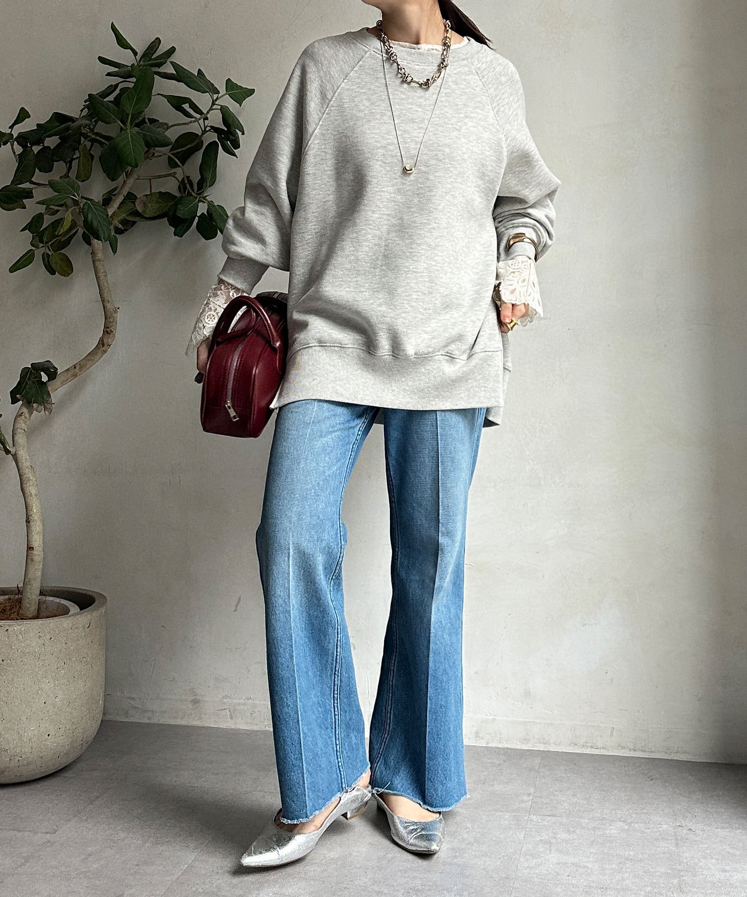 お袖はフレアに広がるシルエットのため、ニットやスウェットからだしたスタイルがおすすめ。