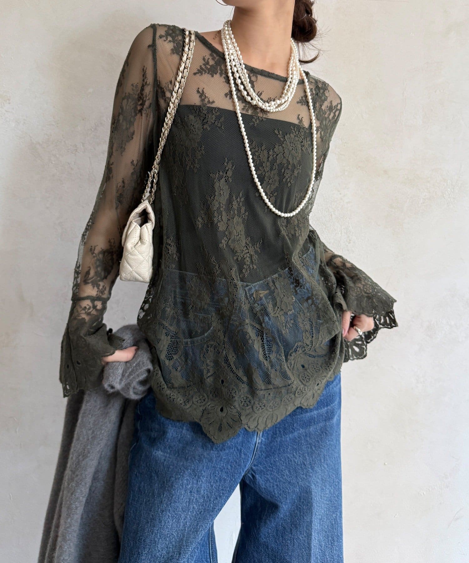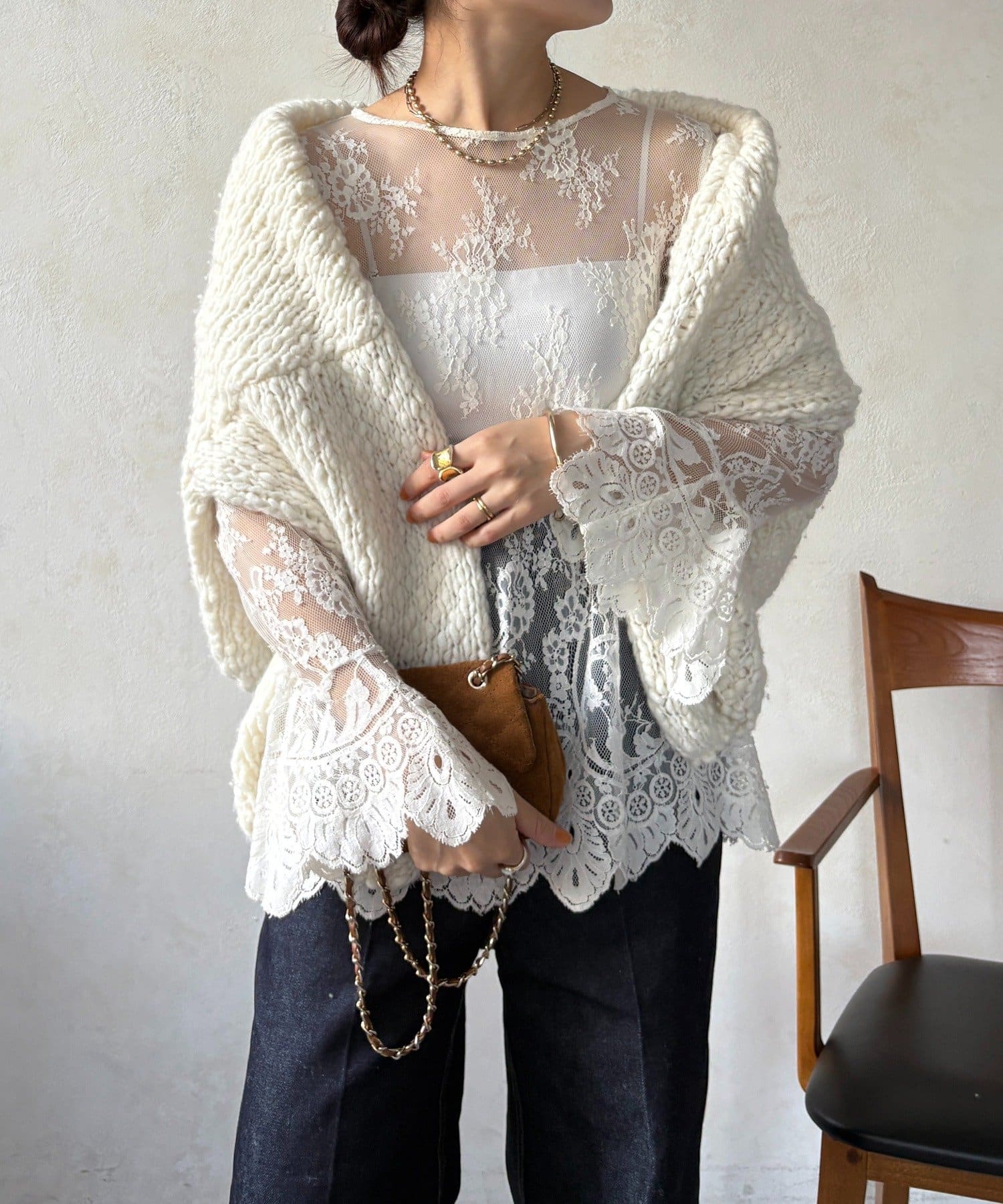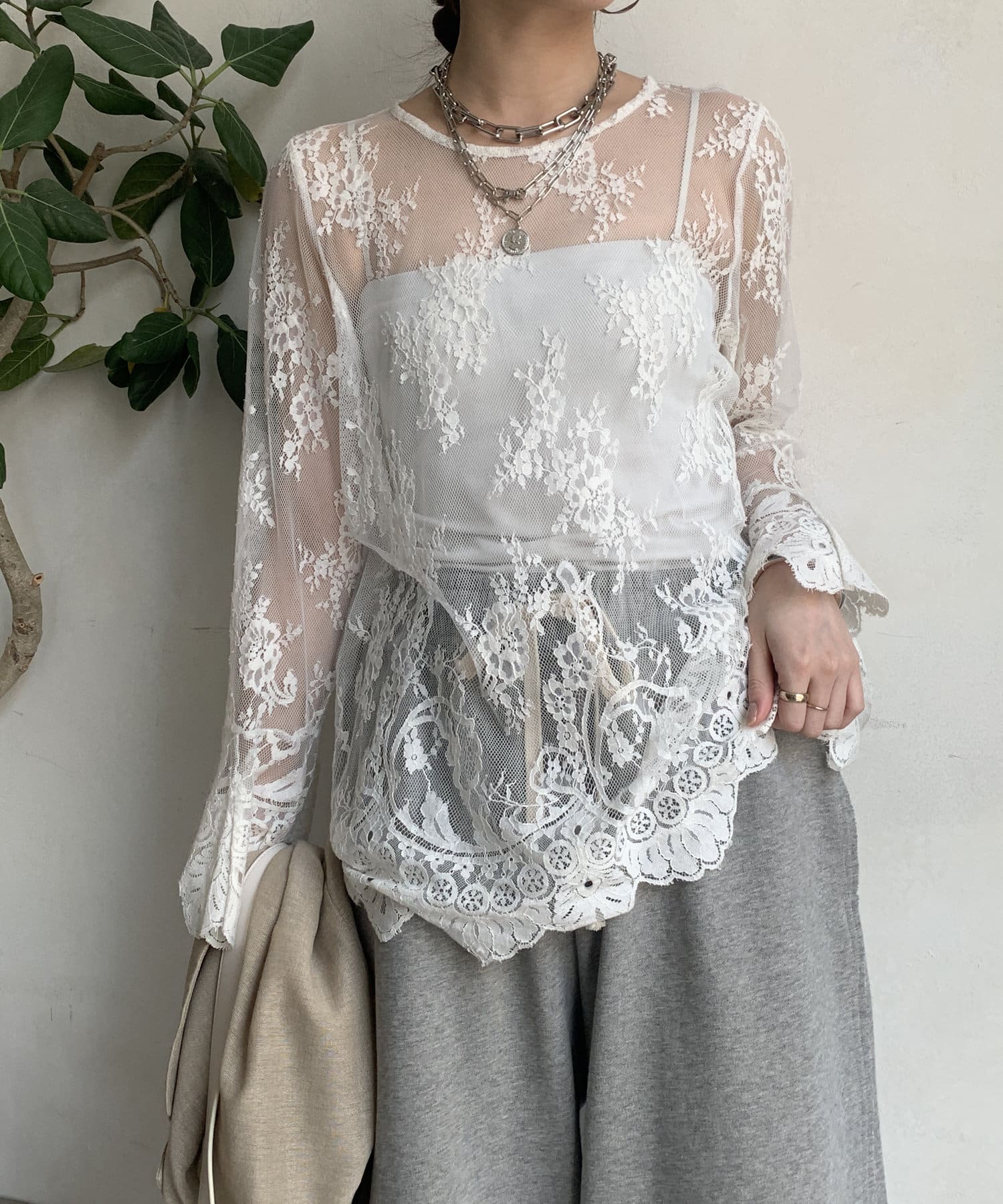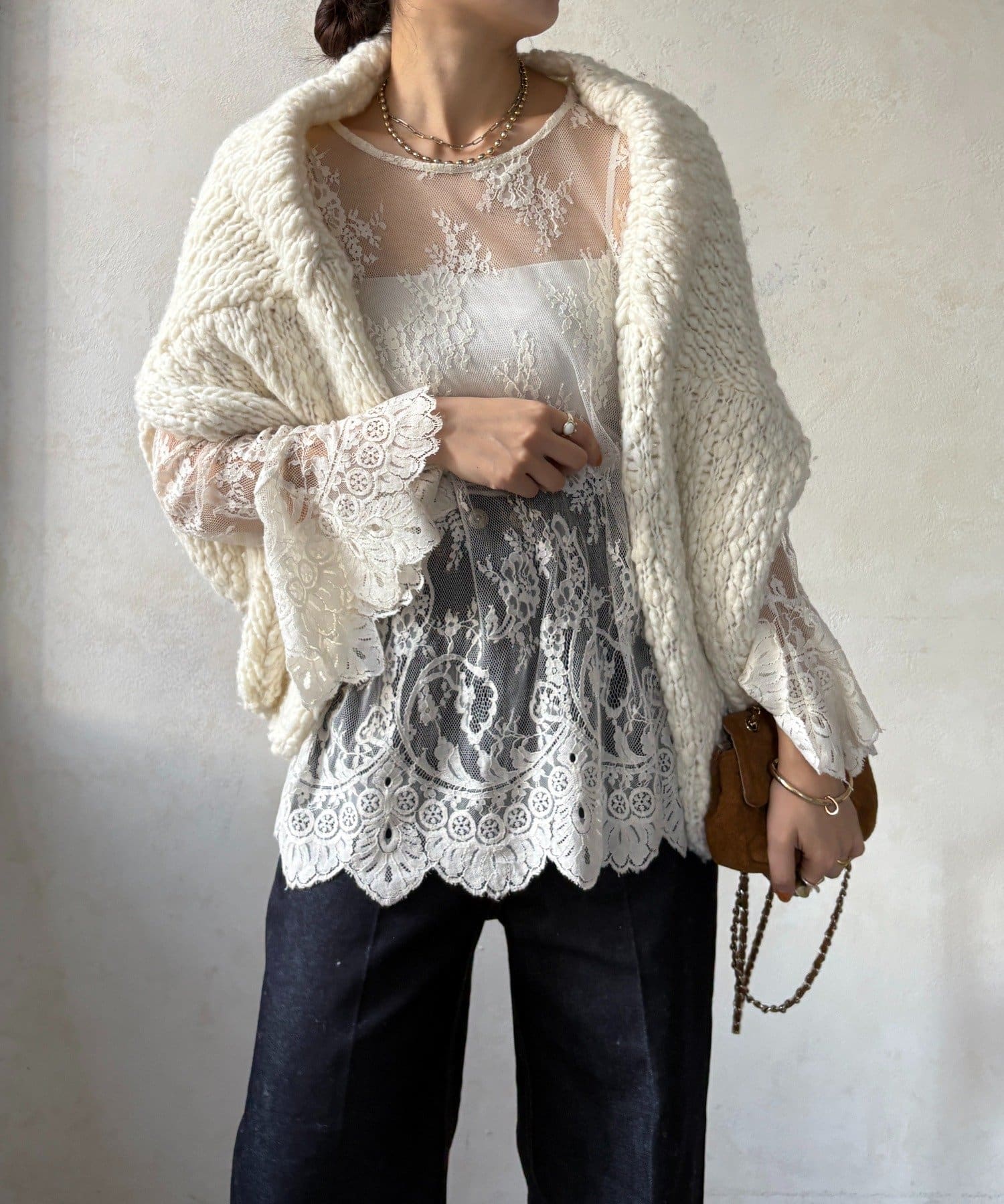 総レースの素材でコーディネートに少し甘めの要素をプラスしてくれます。