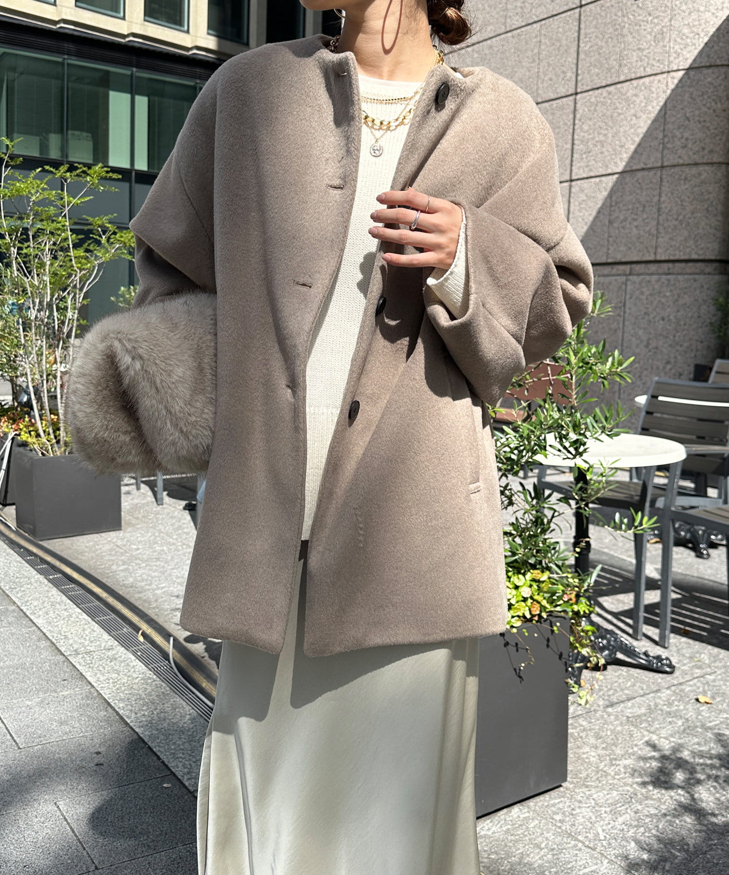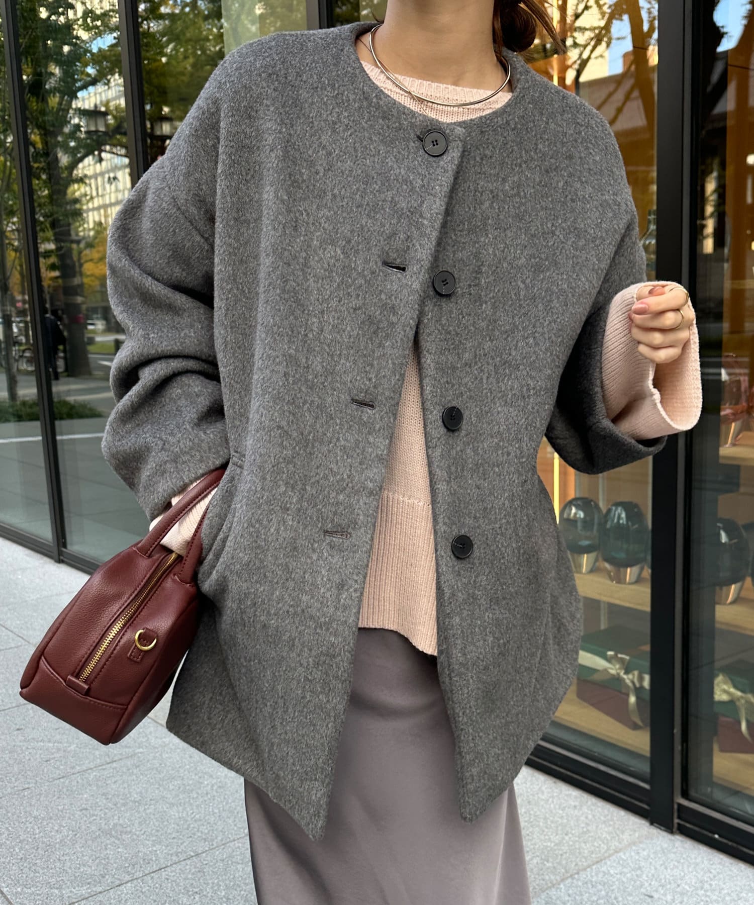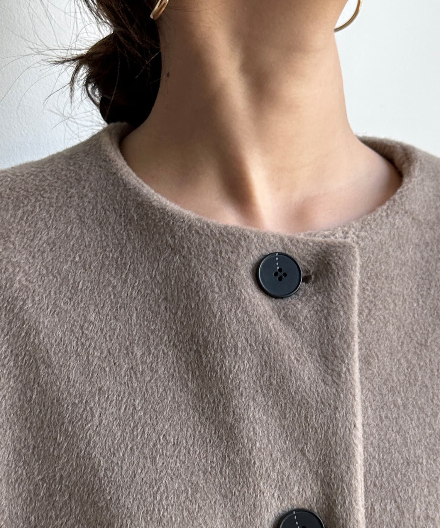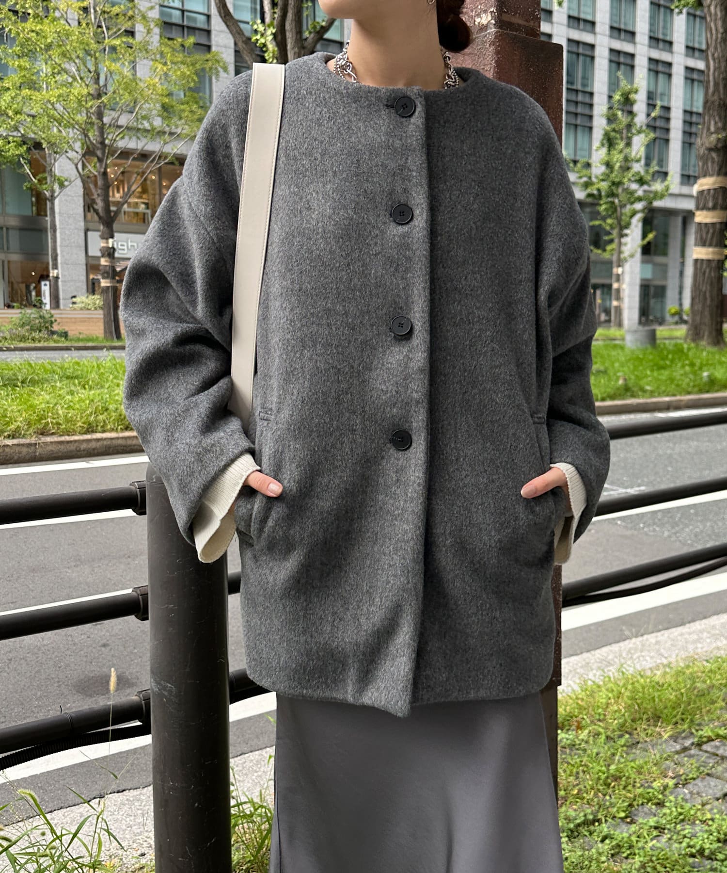 ボタンの開け閉めで印象が変わる大人カジュアルなノーカラーコート。