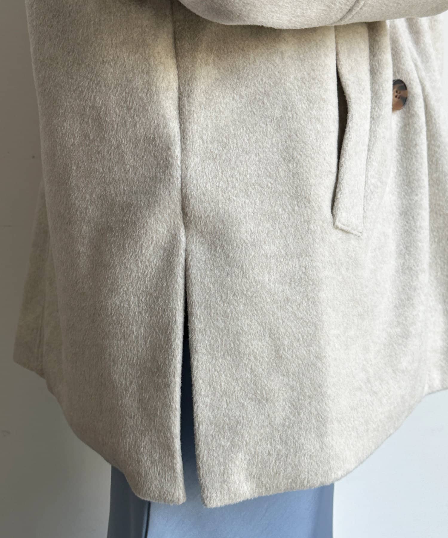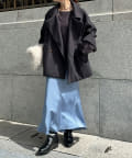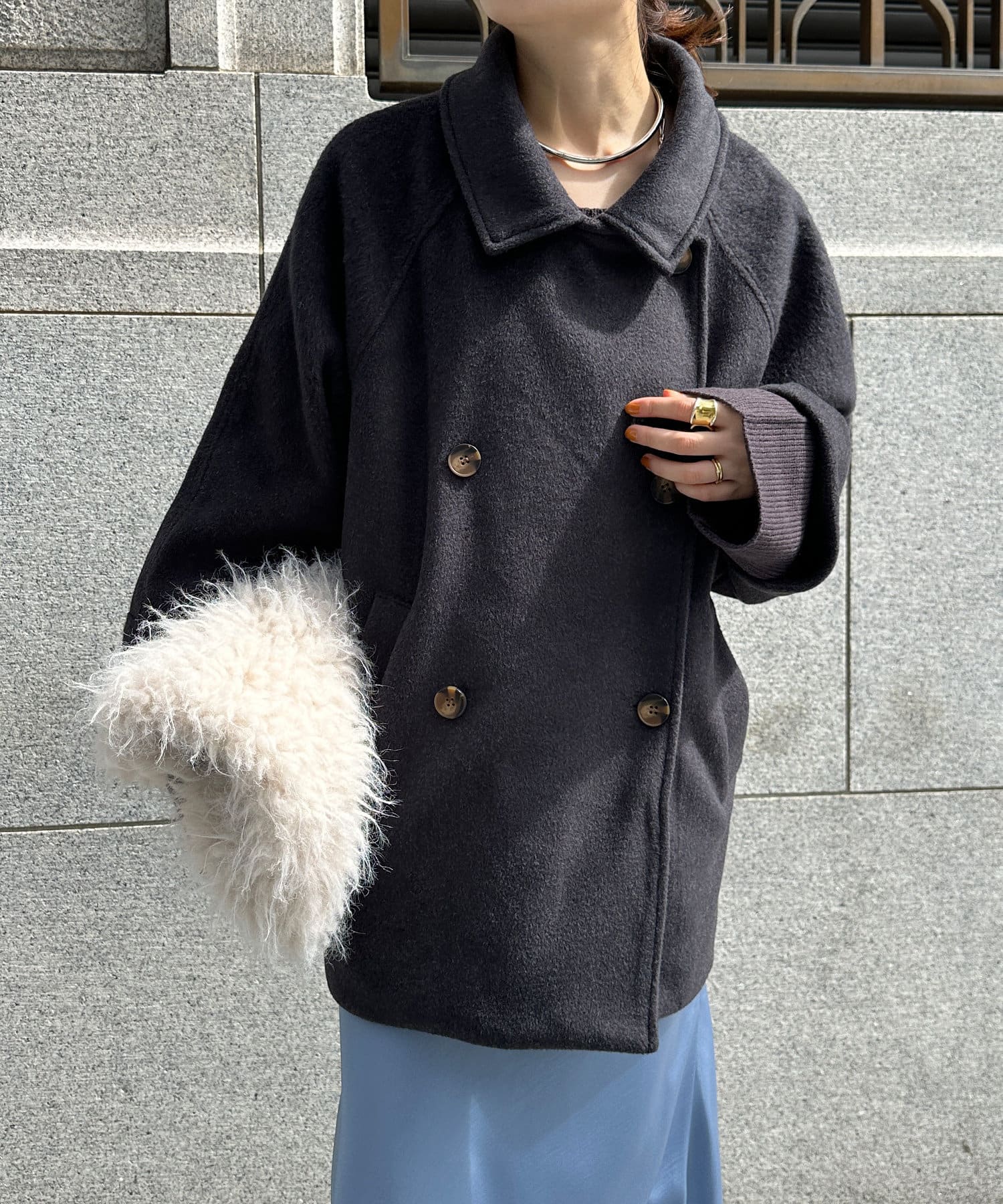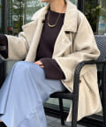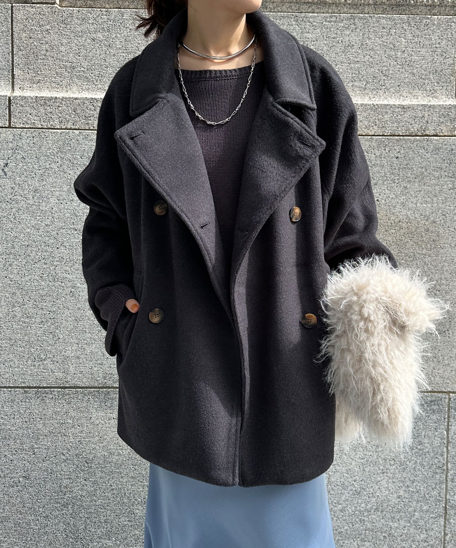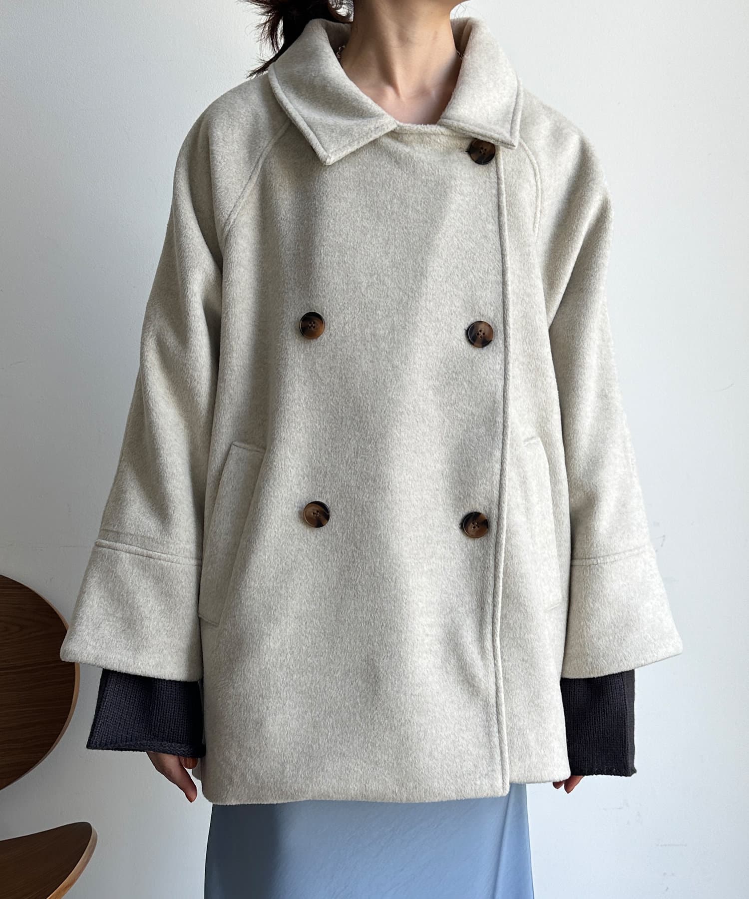 大きめの襟がアクセントになり、大人カジュアルに着こなせるミドル丈Pコート。