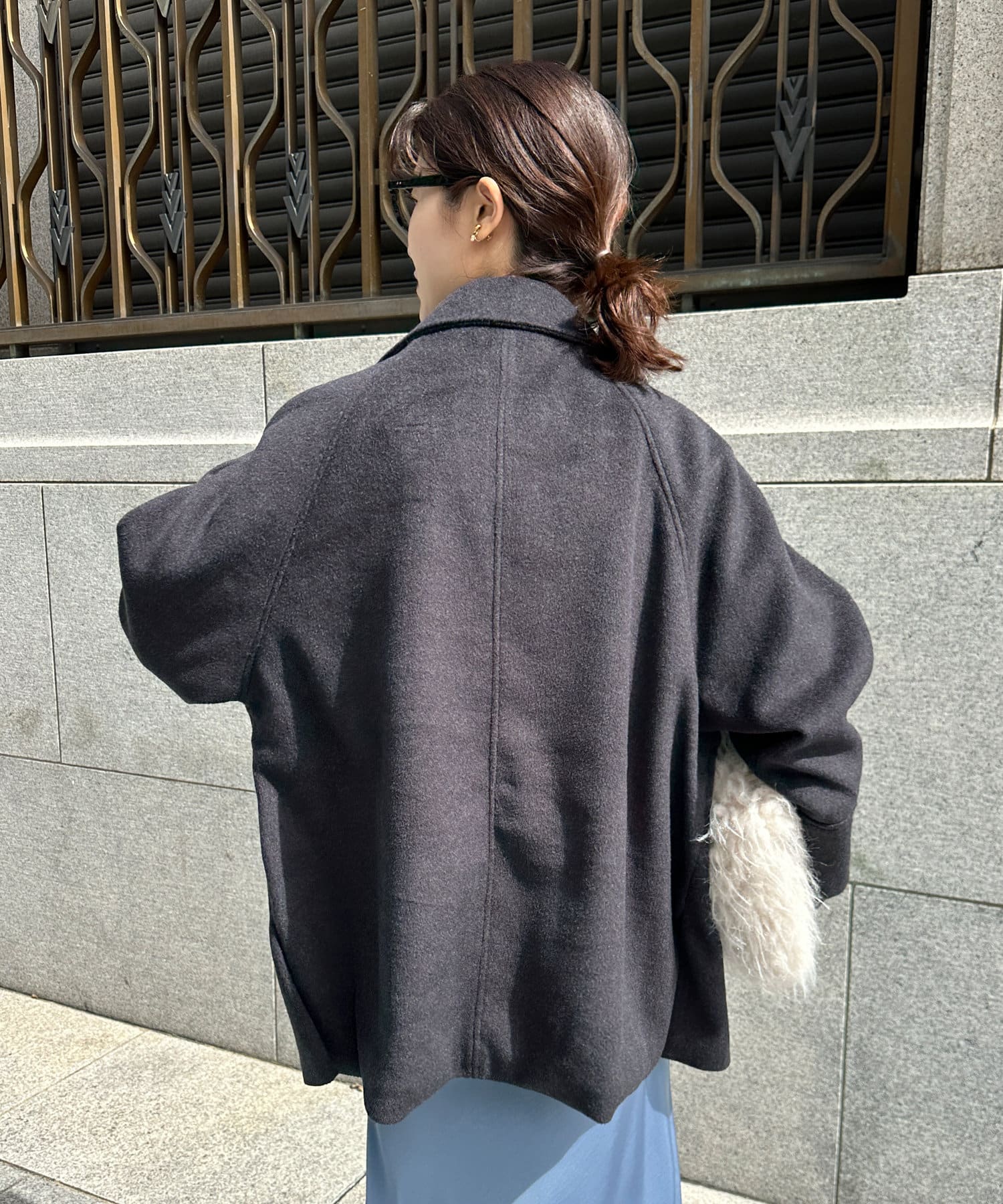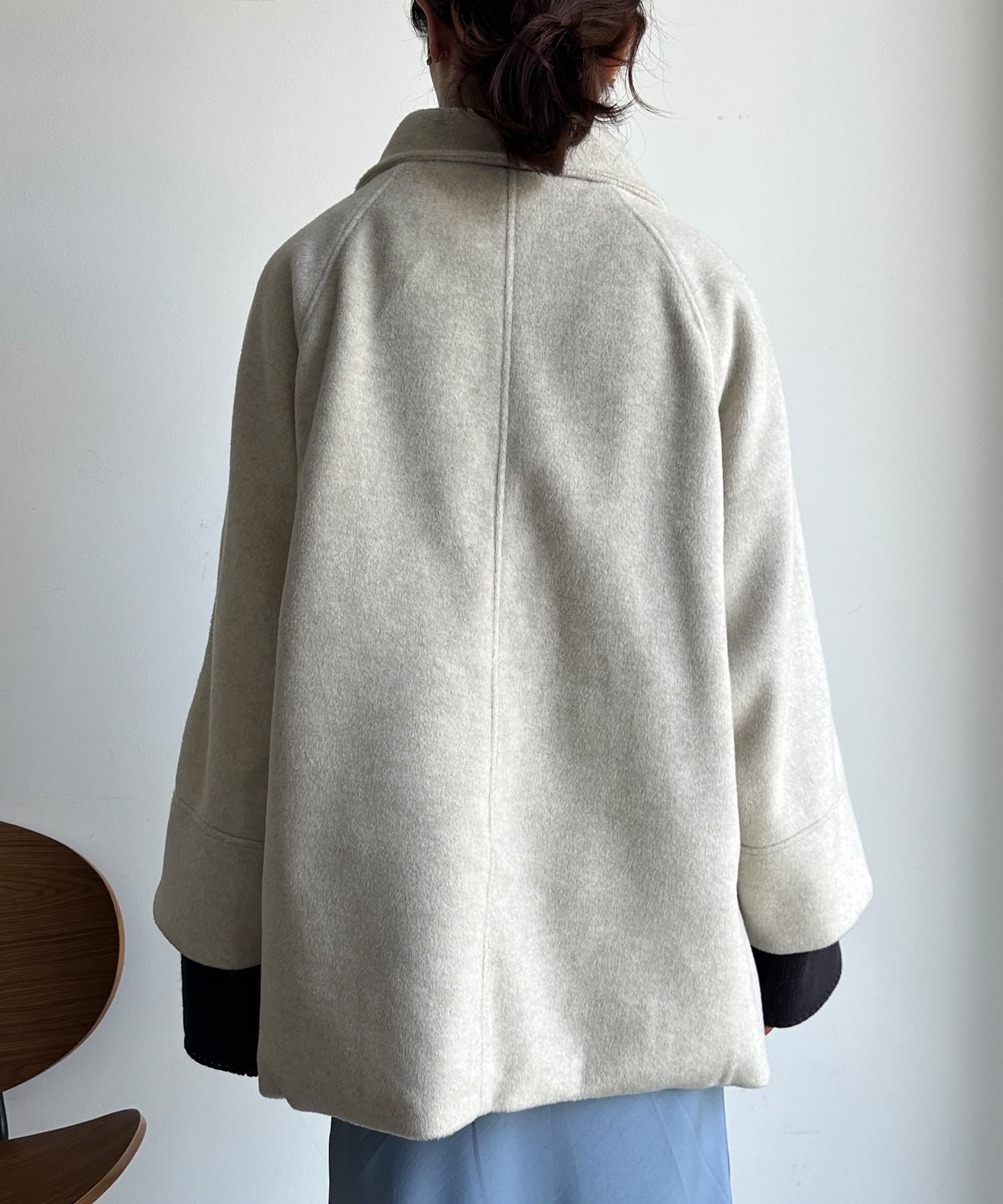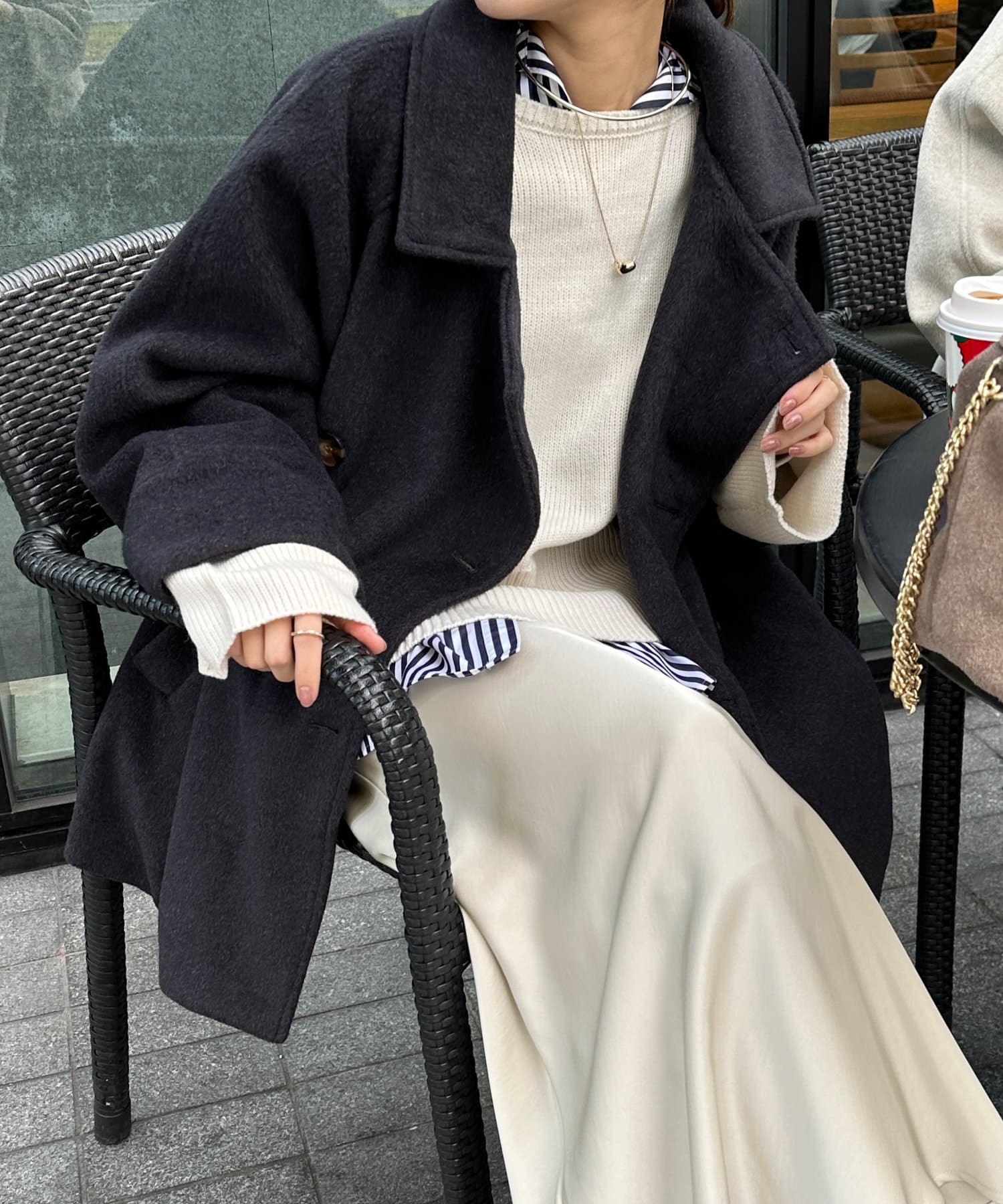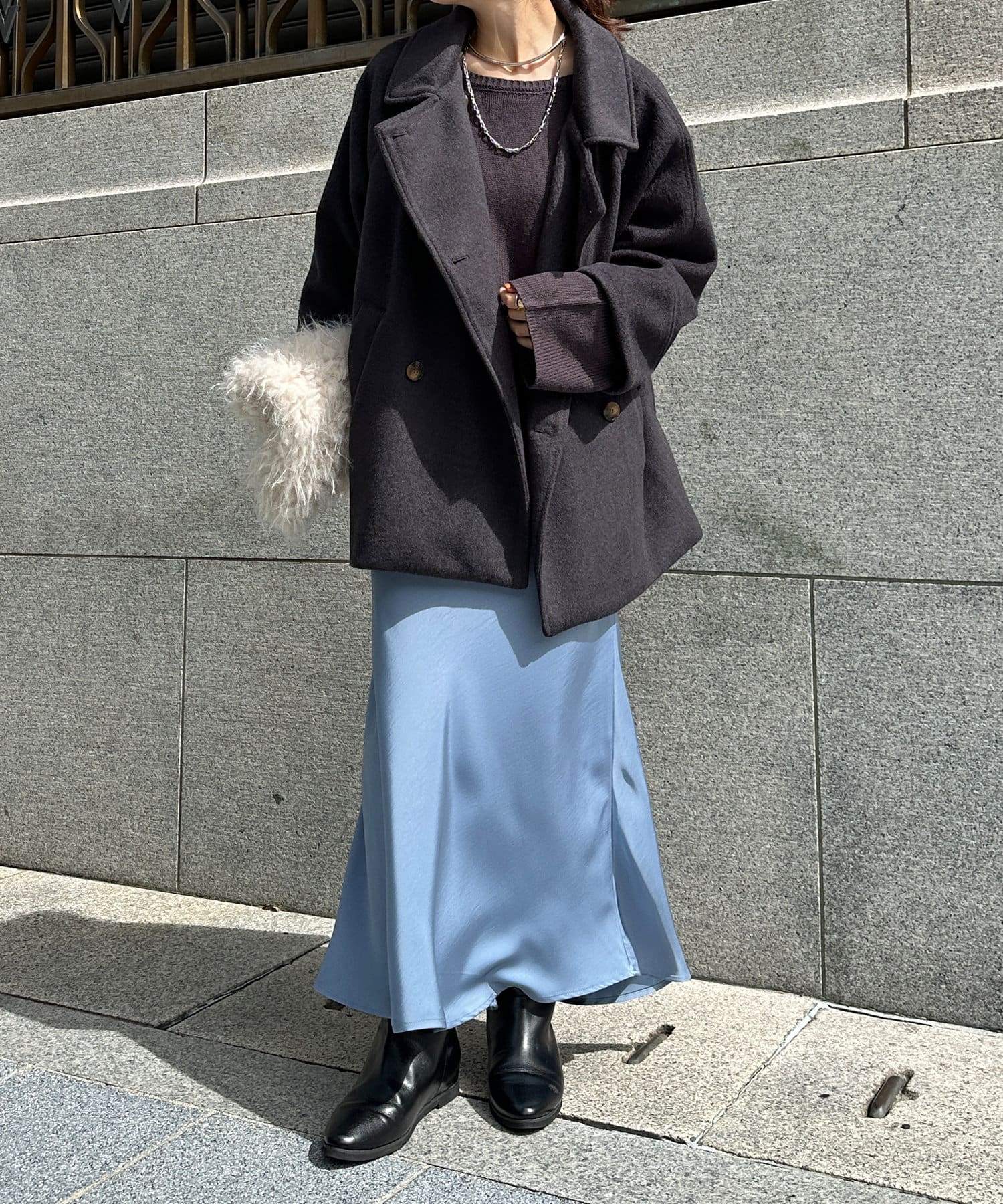 大きめの襟がアクセントになり、大人カジュアルに着こなせるミドル丈Pコート。