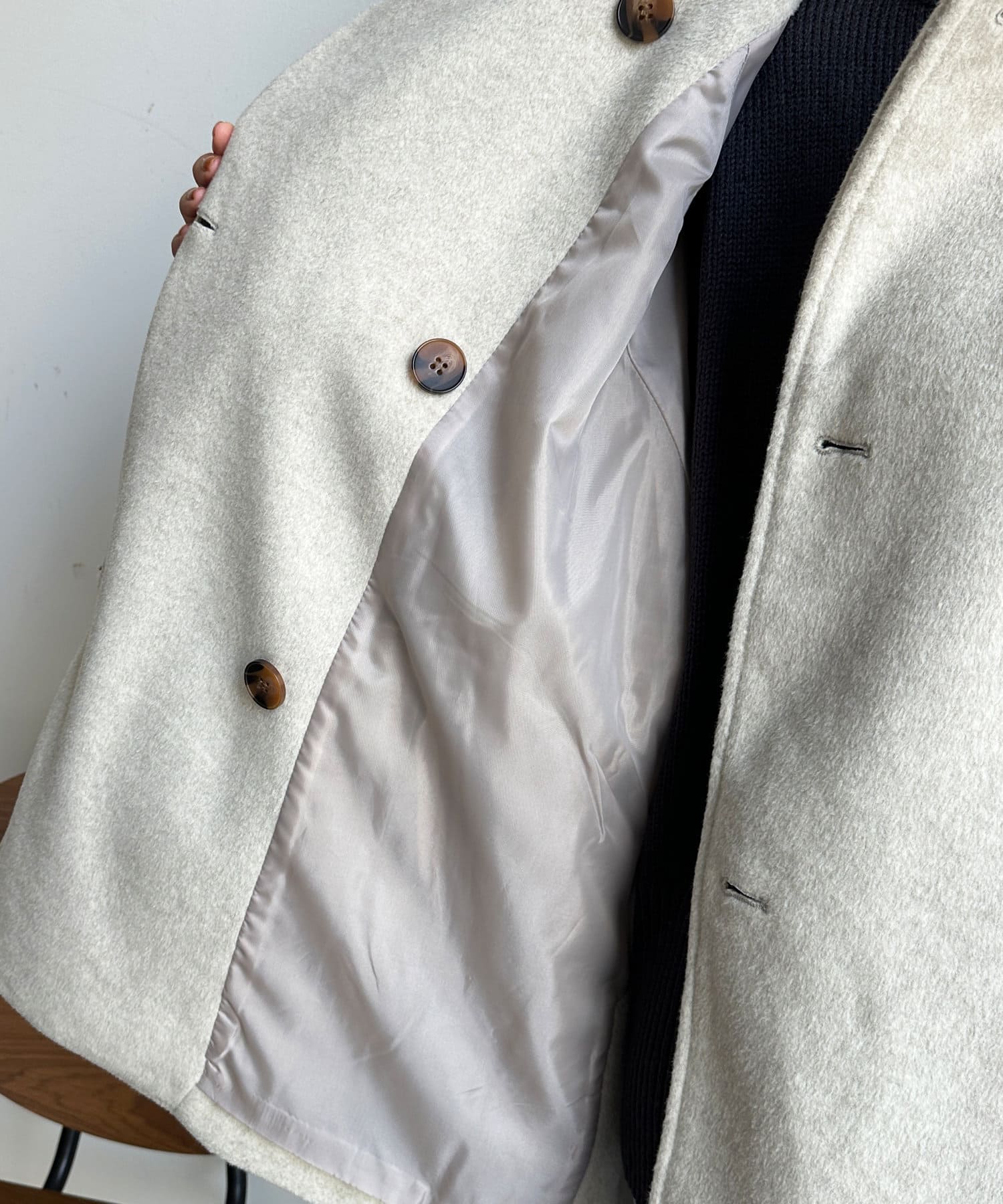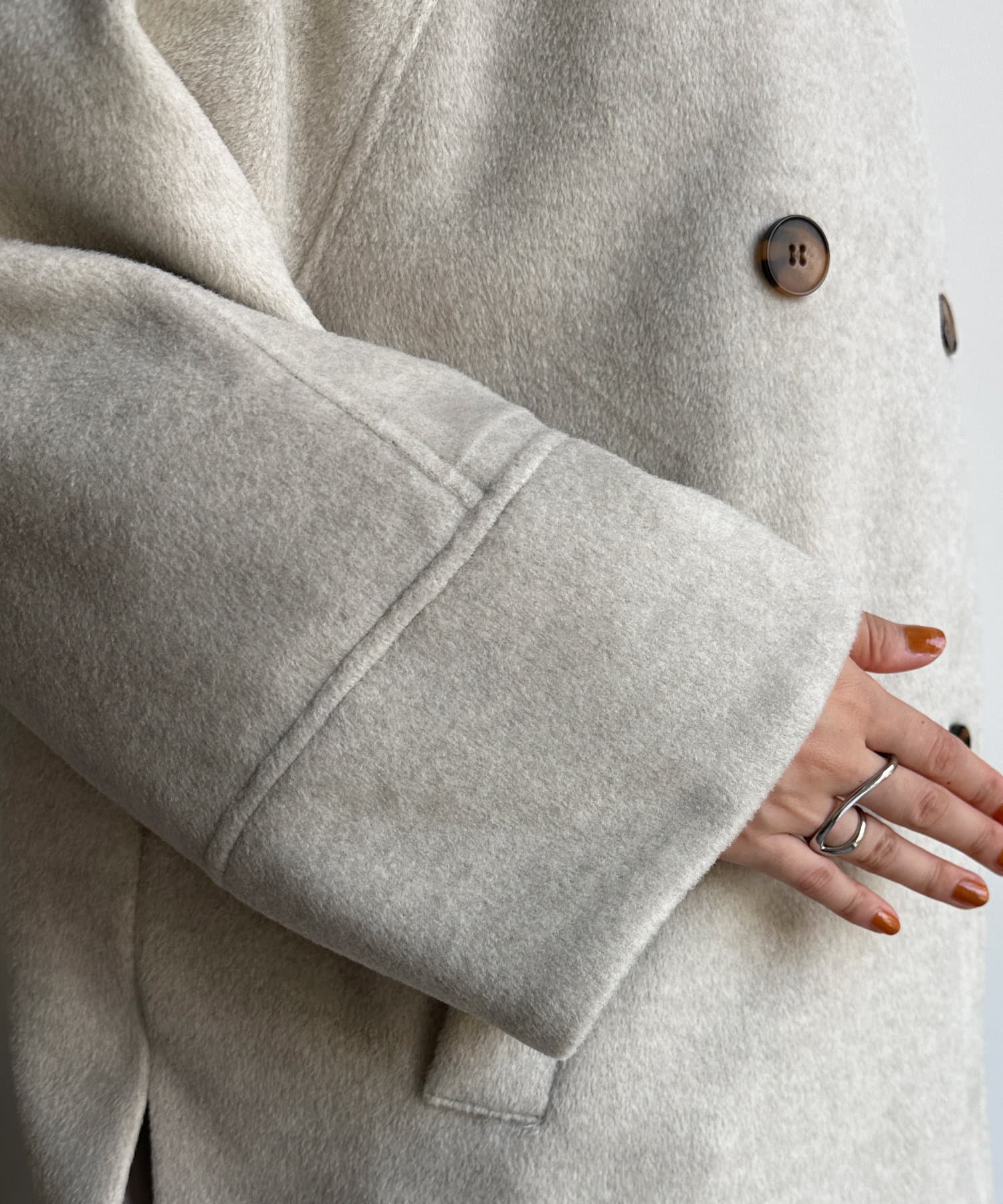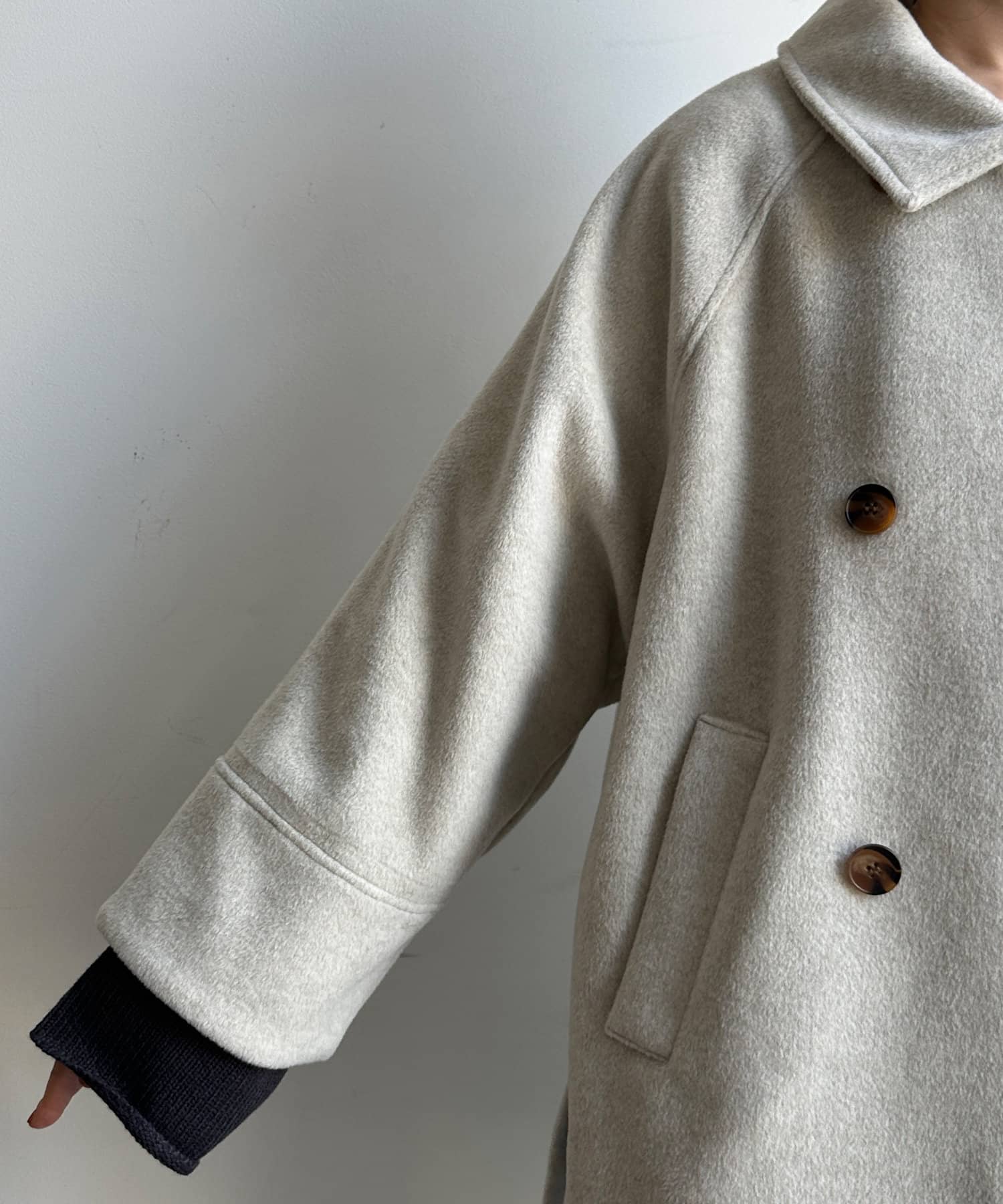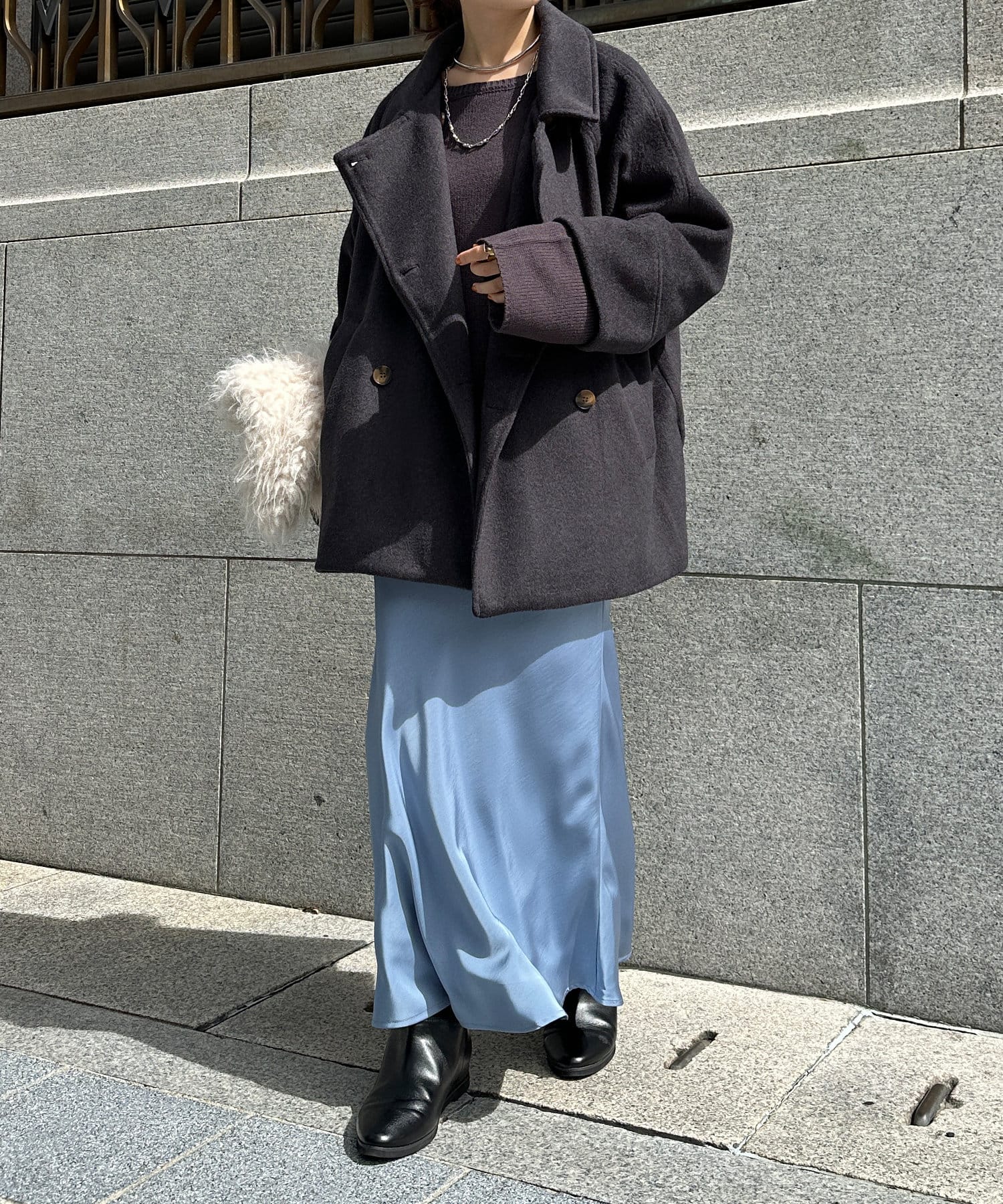 大きめの襟がアクセントになり、大人カジュアルに着こなせるミドル丈Pコート。
