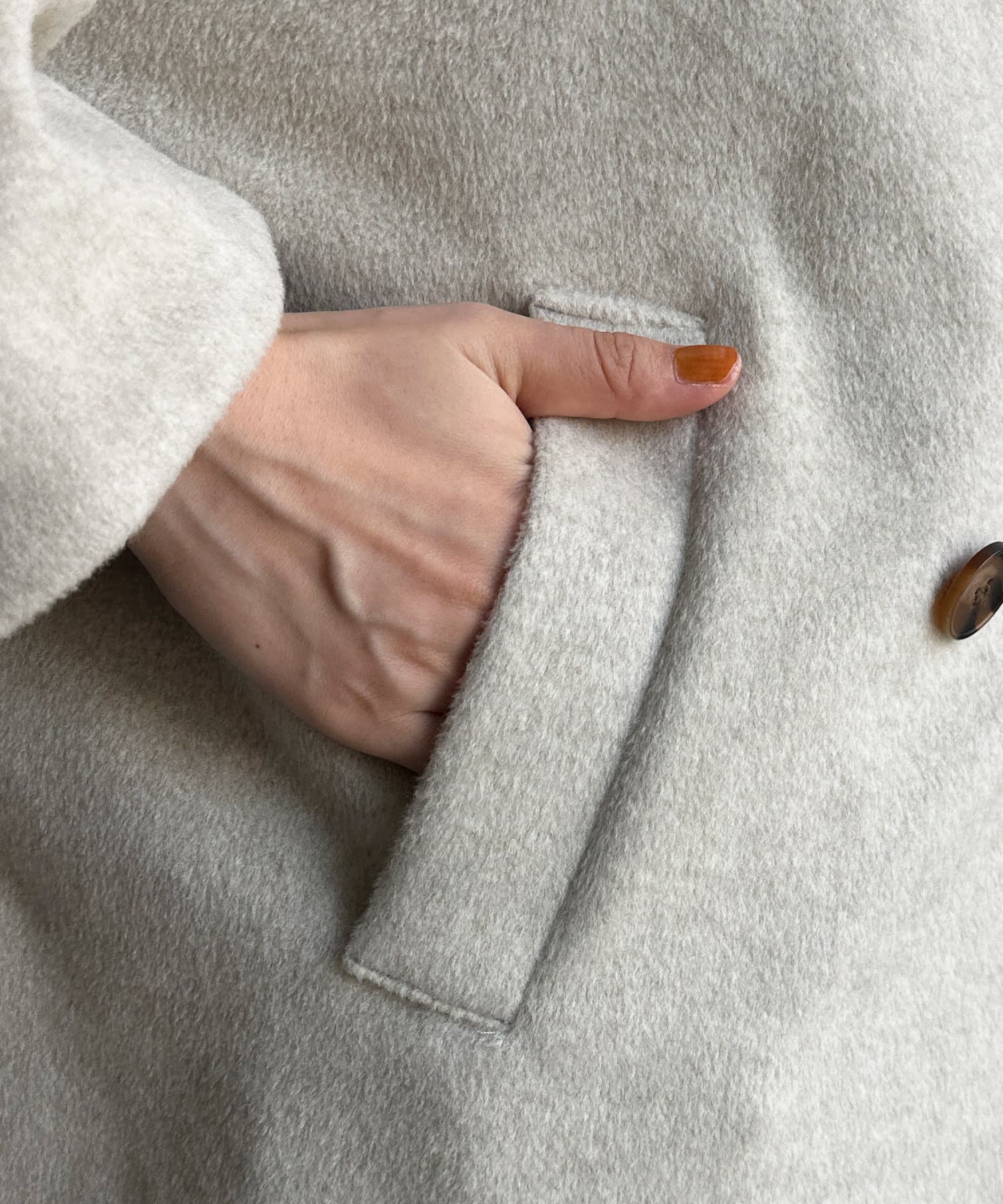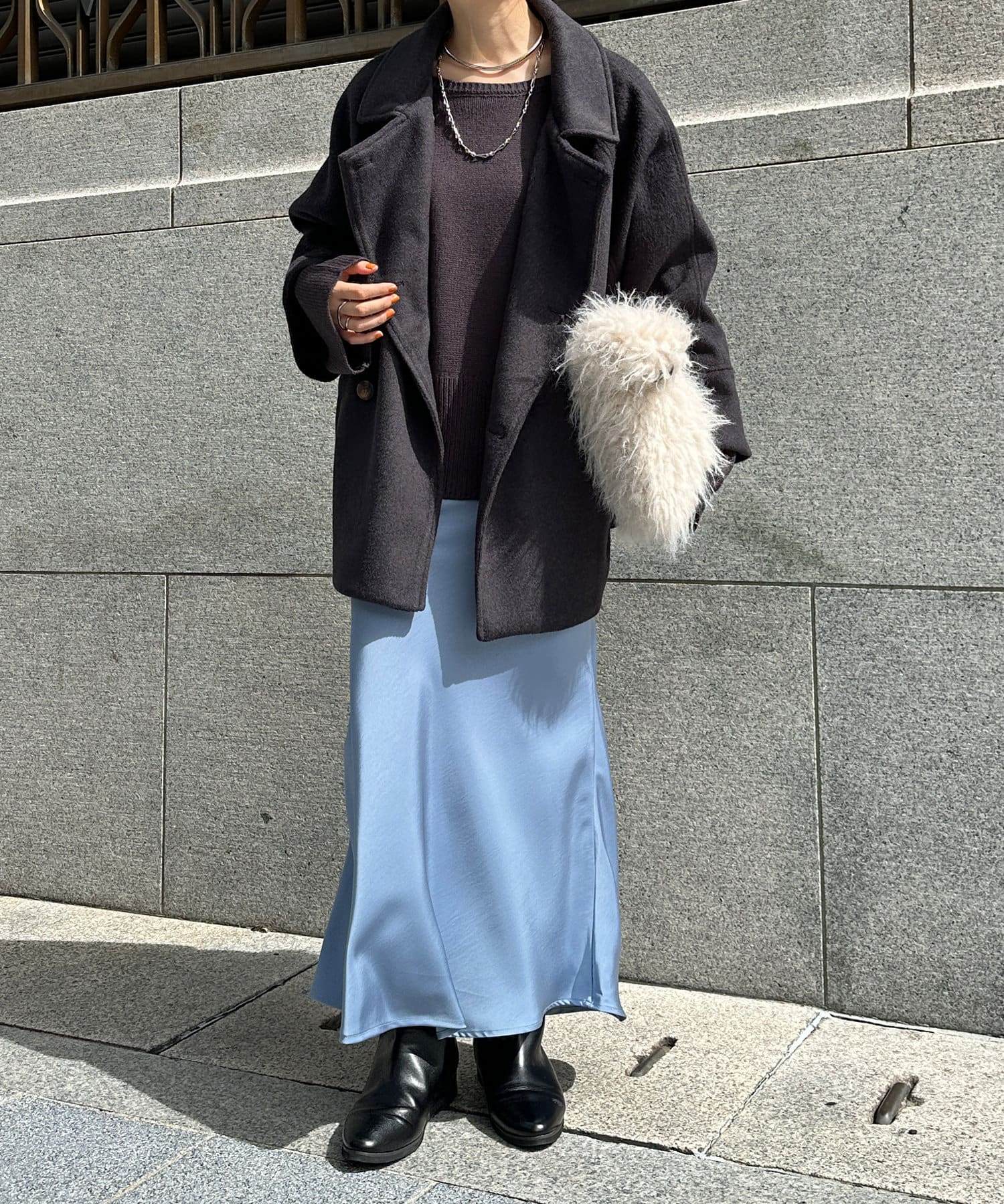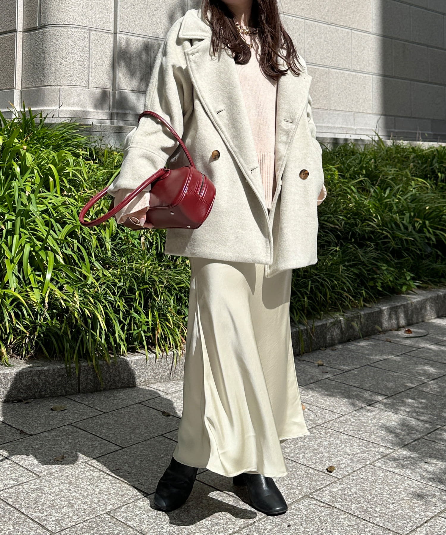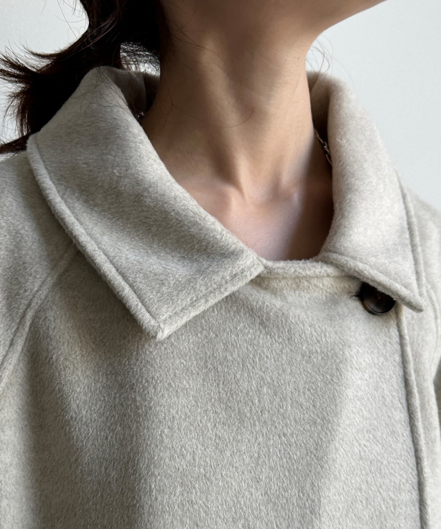 大きめの襟がアクセントになり、大人カジュアルに着こなせるミドル丈Pコート。