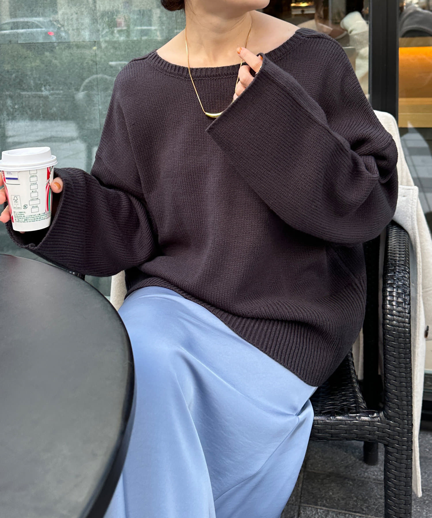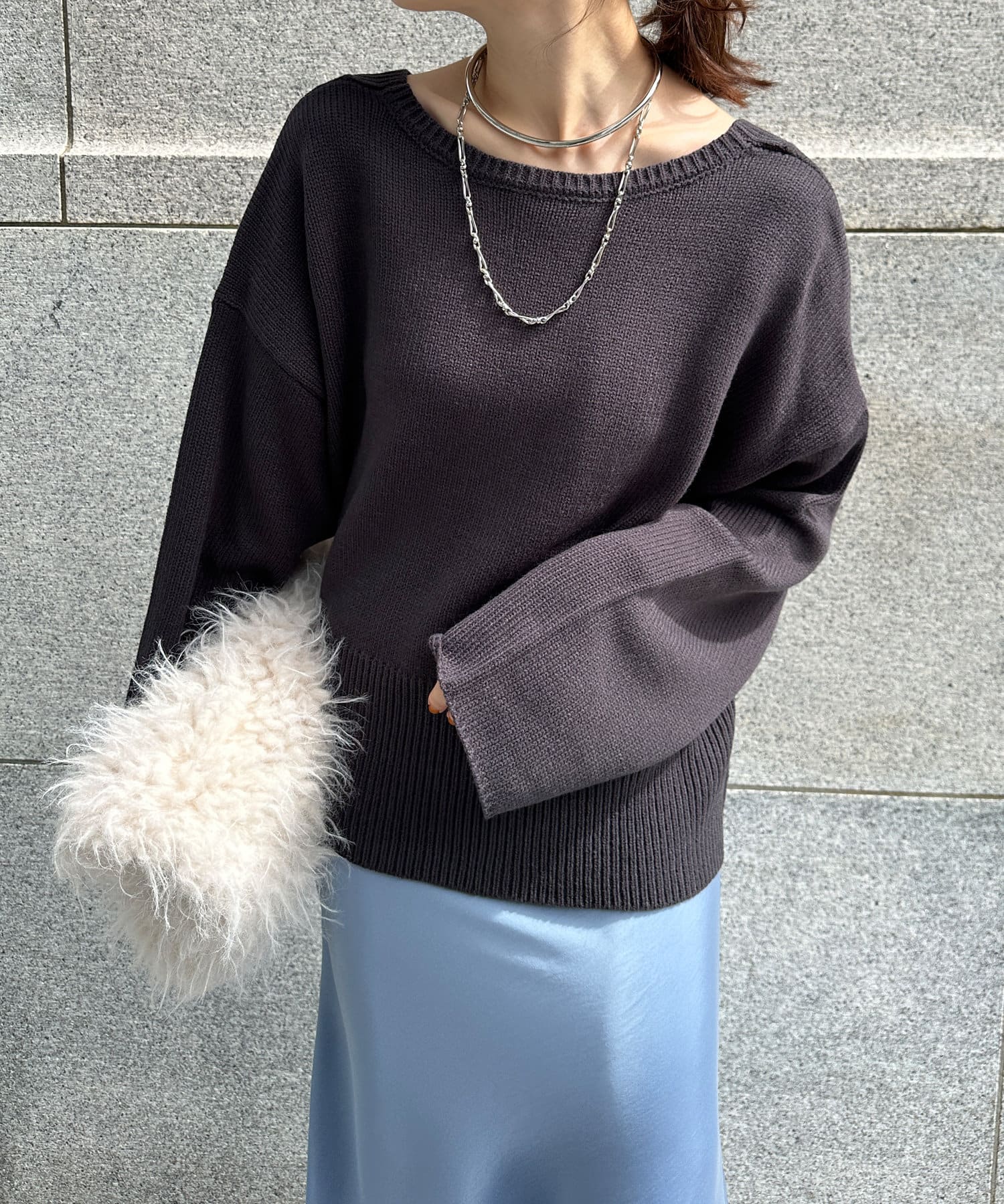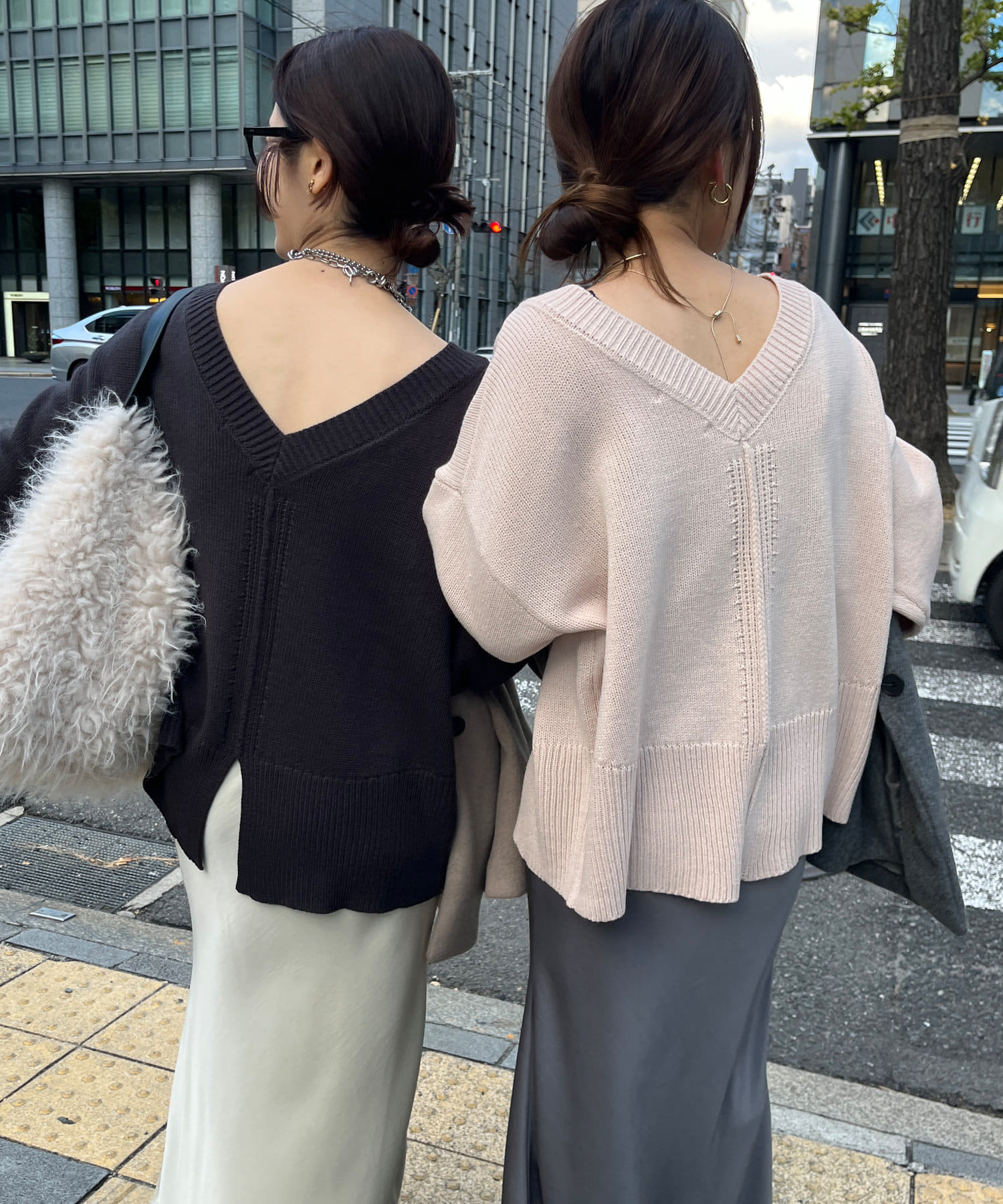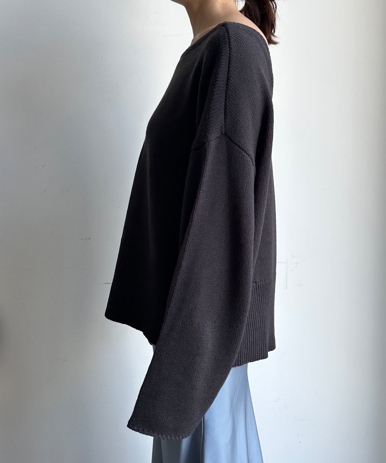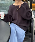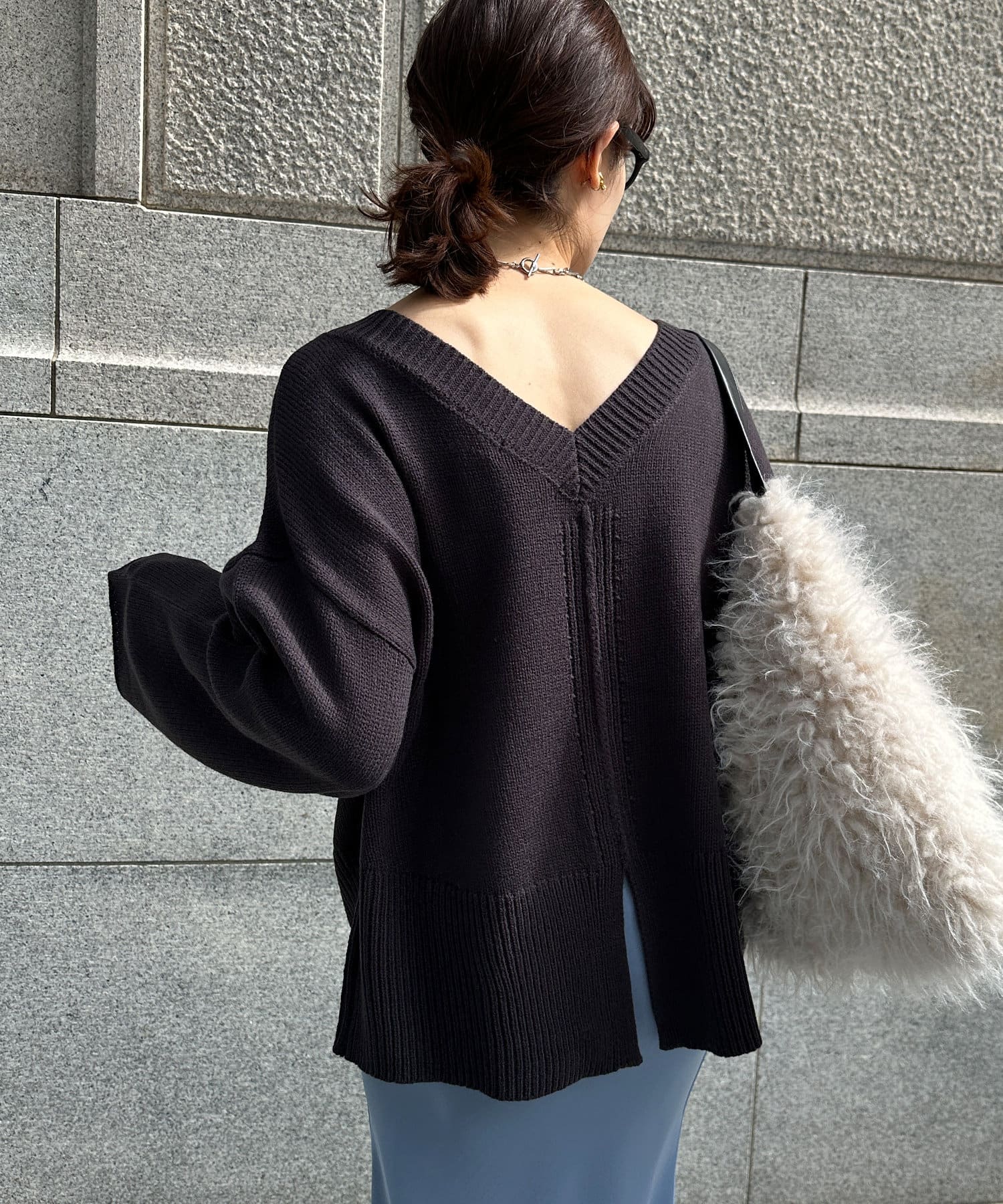 バックのVネックデザインが抜け感たっぷりのニット。