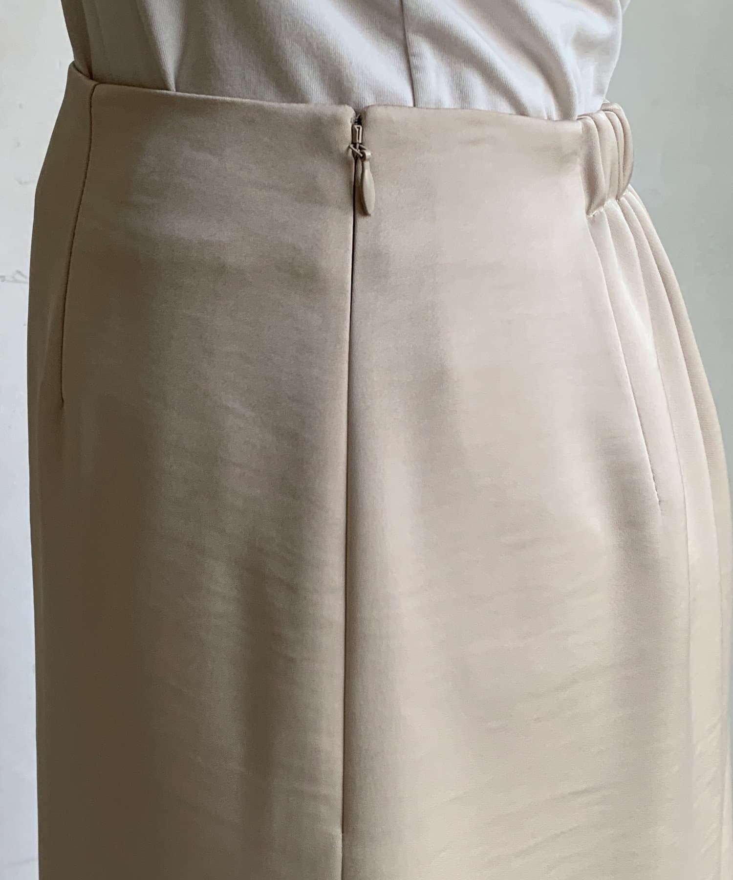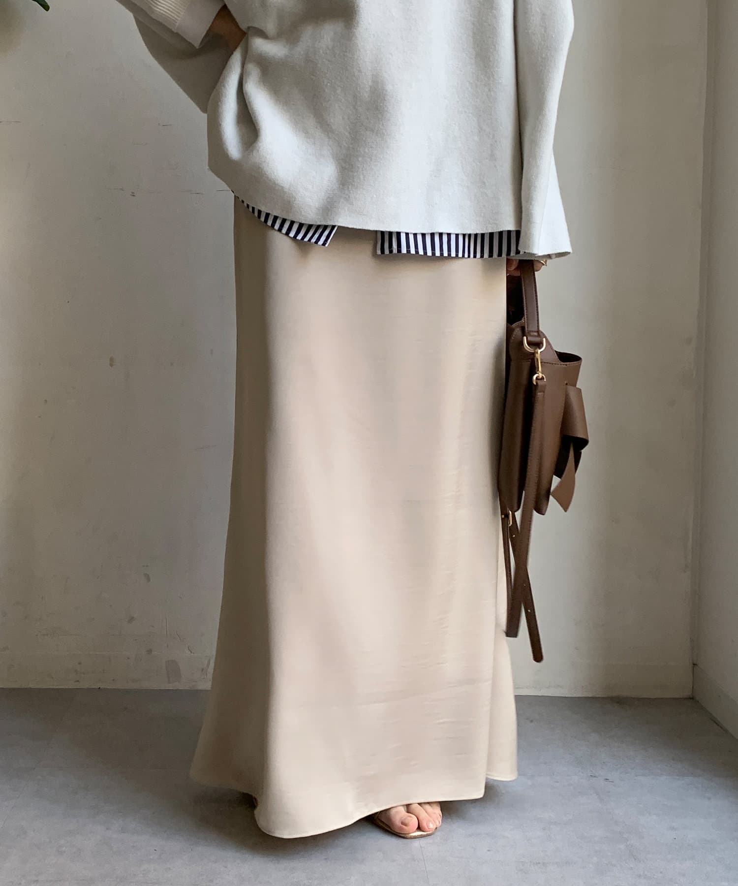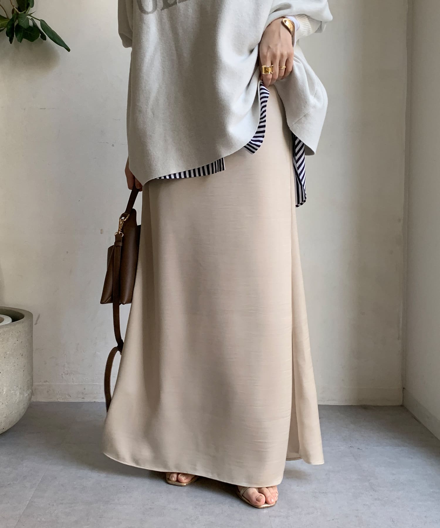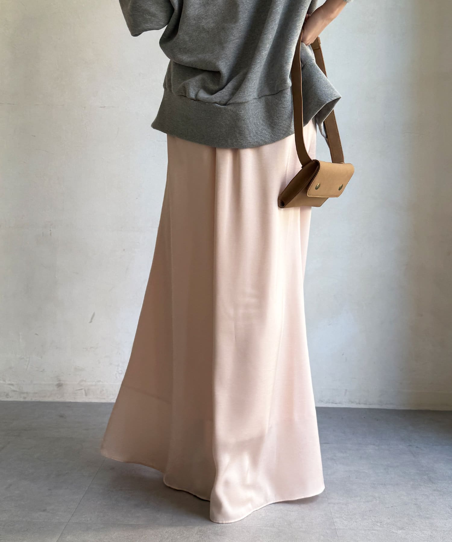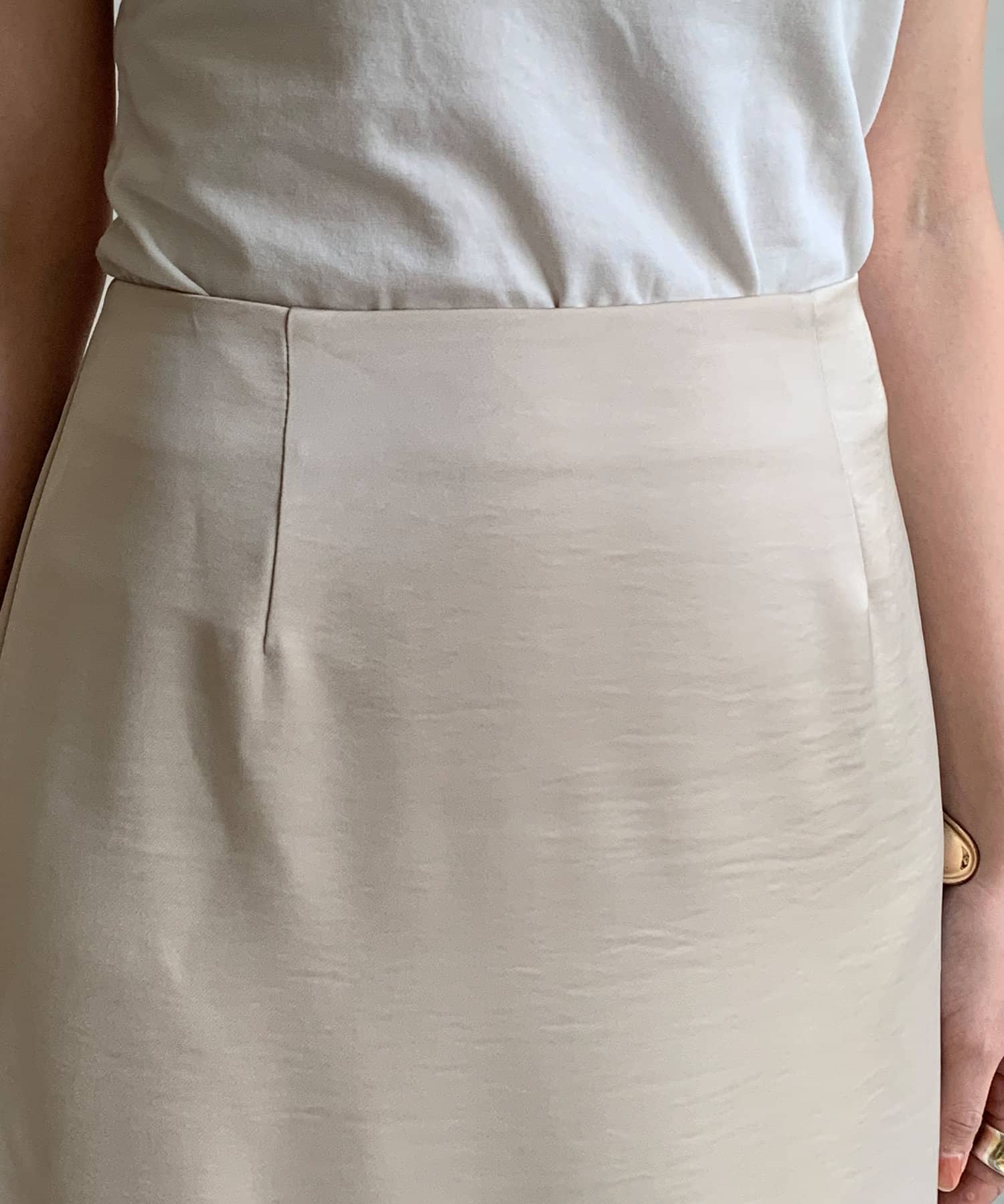 すっきりとした落ち感のある綺麗なシルエットが女性らしい印象を与えてくれるサテンスカート。