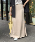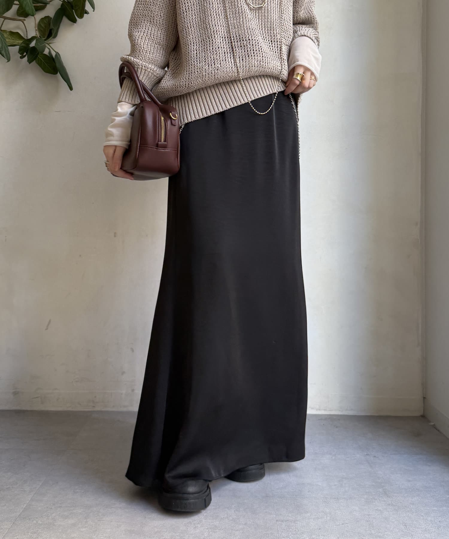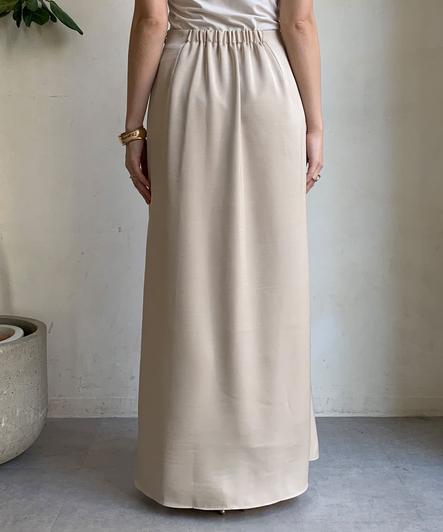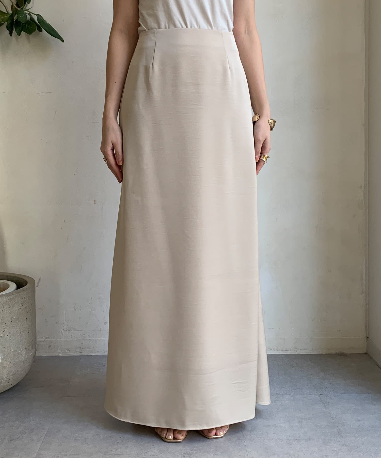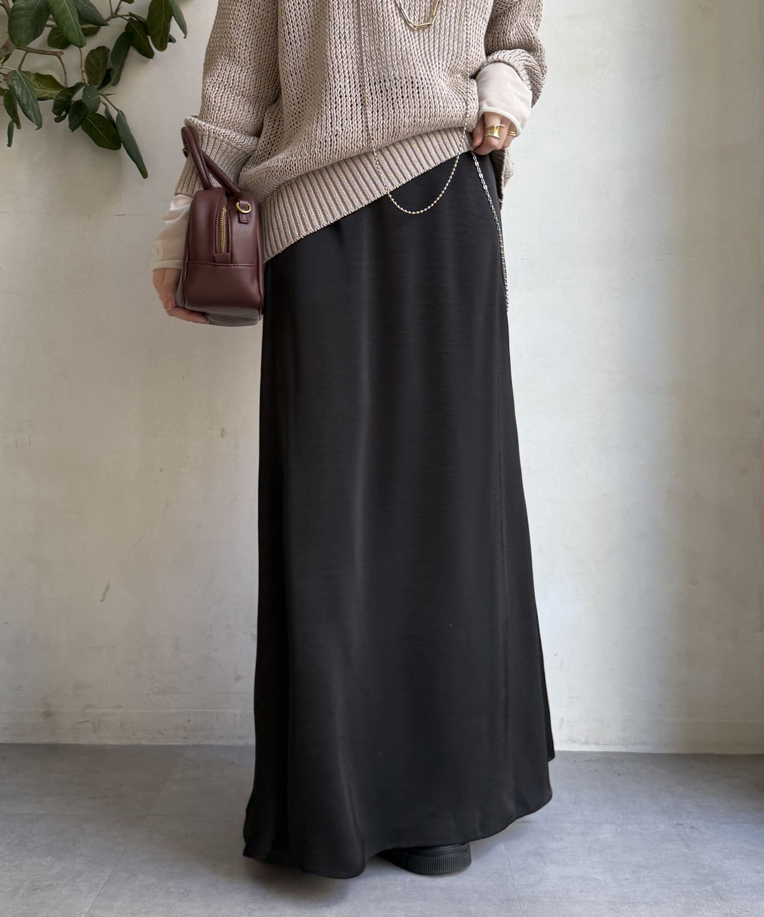 すっきりとした落ち感のある綺麗なシルエットが女性らしい印象を与えてくれるサテンスカート。