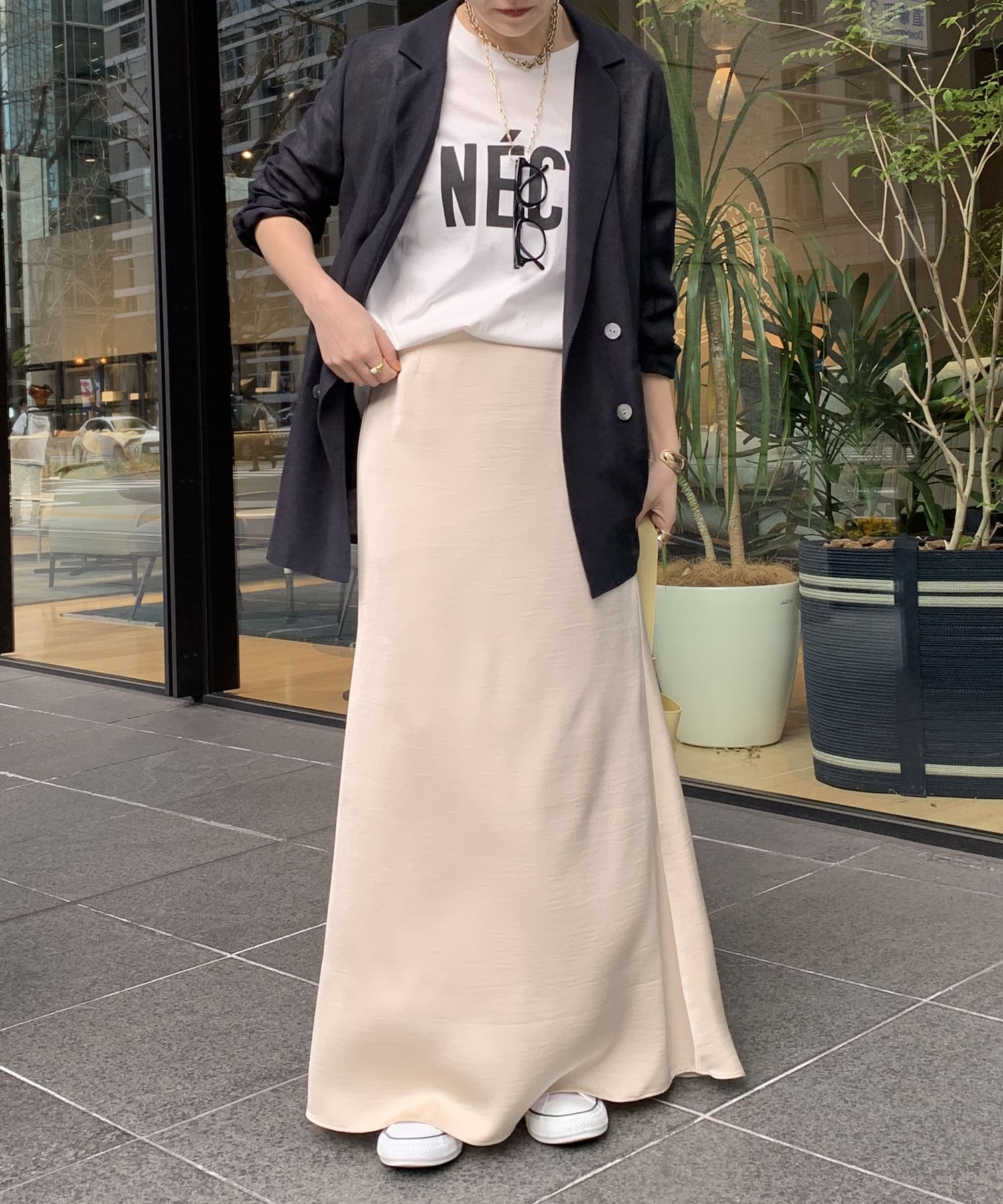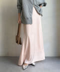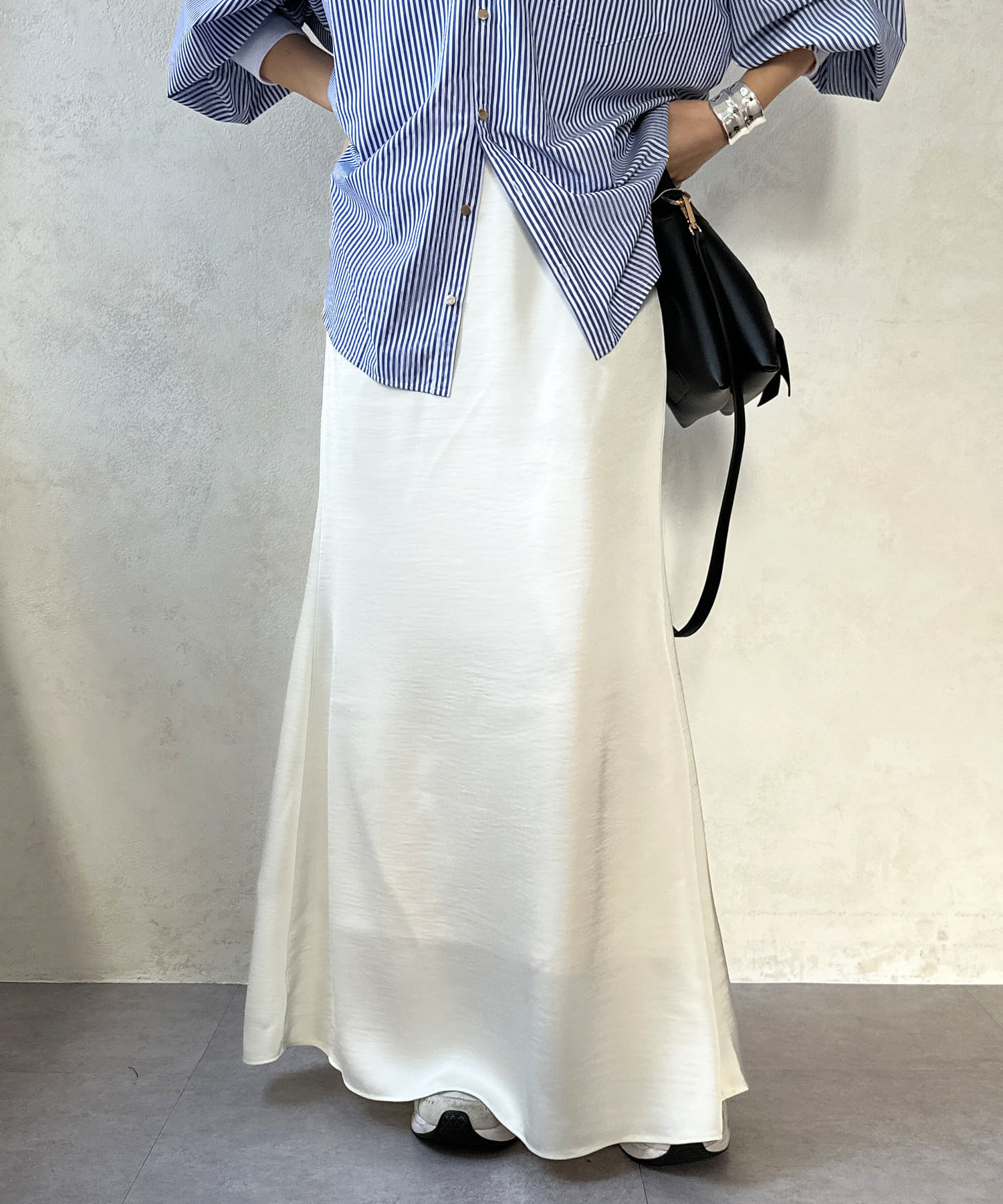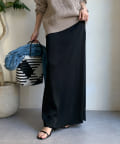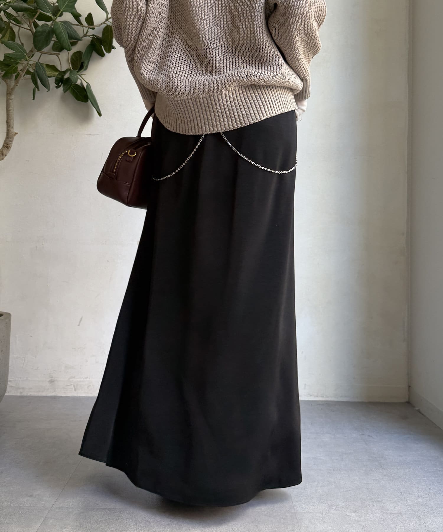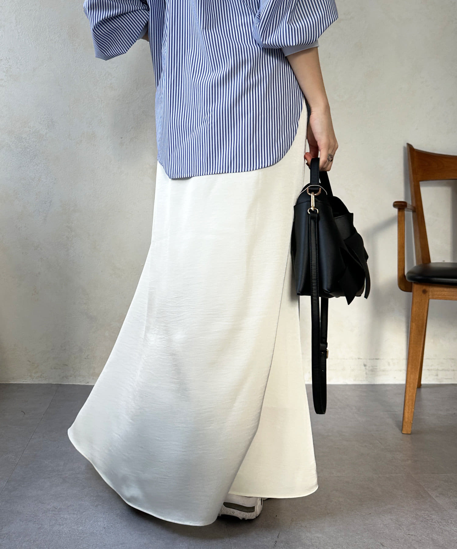 すっきりとした落ち感のある綺麗なシルエットが女性らしい印象を与えてくれるサテンスカート。