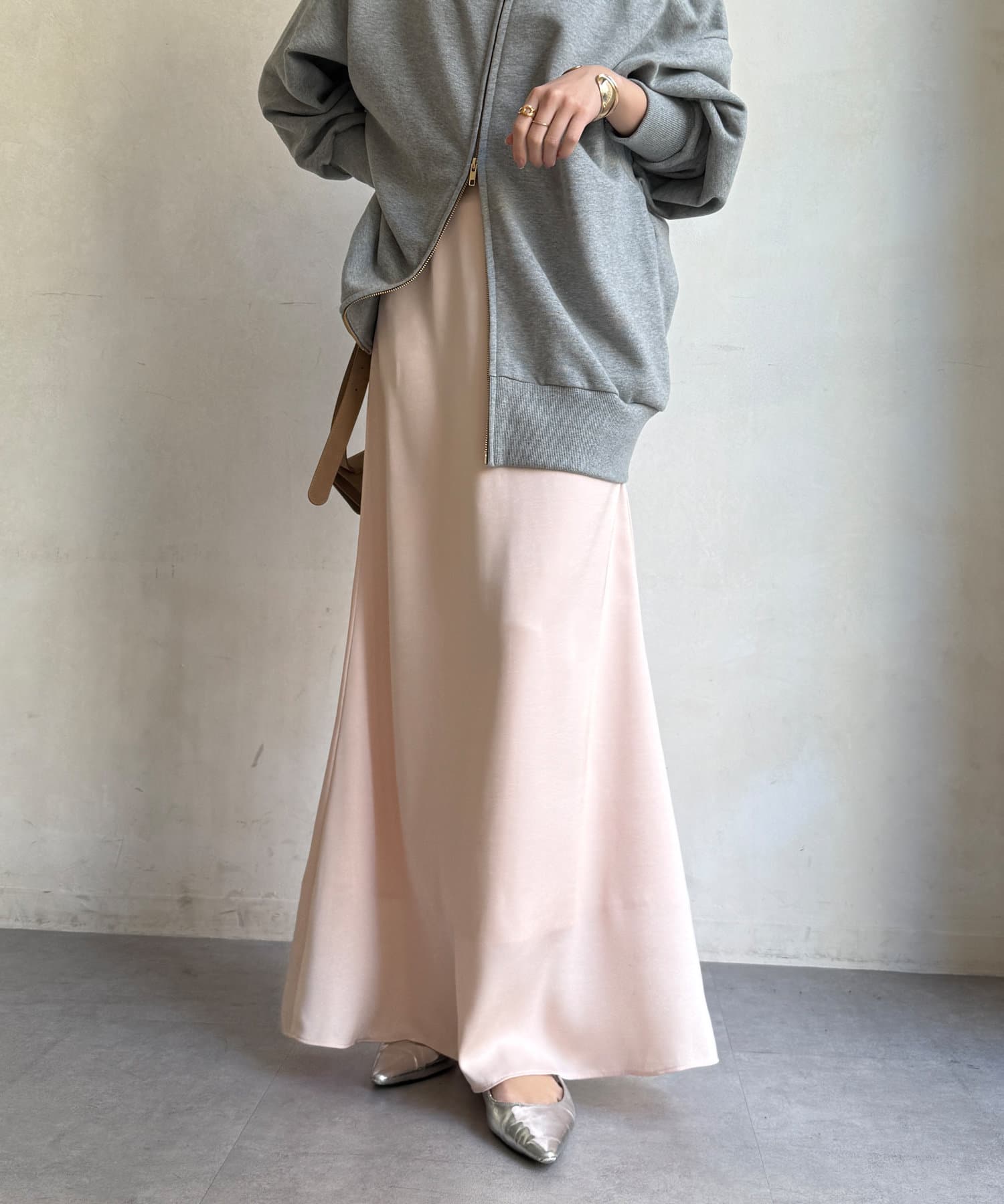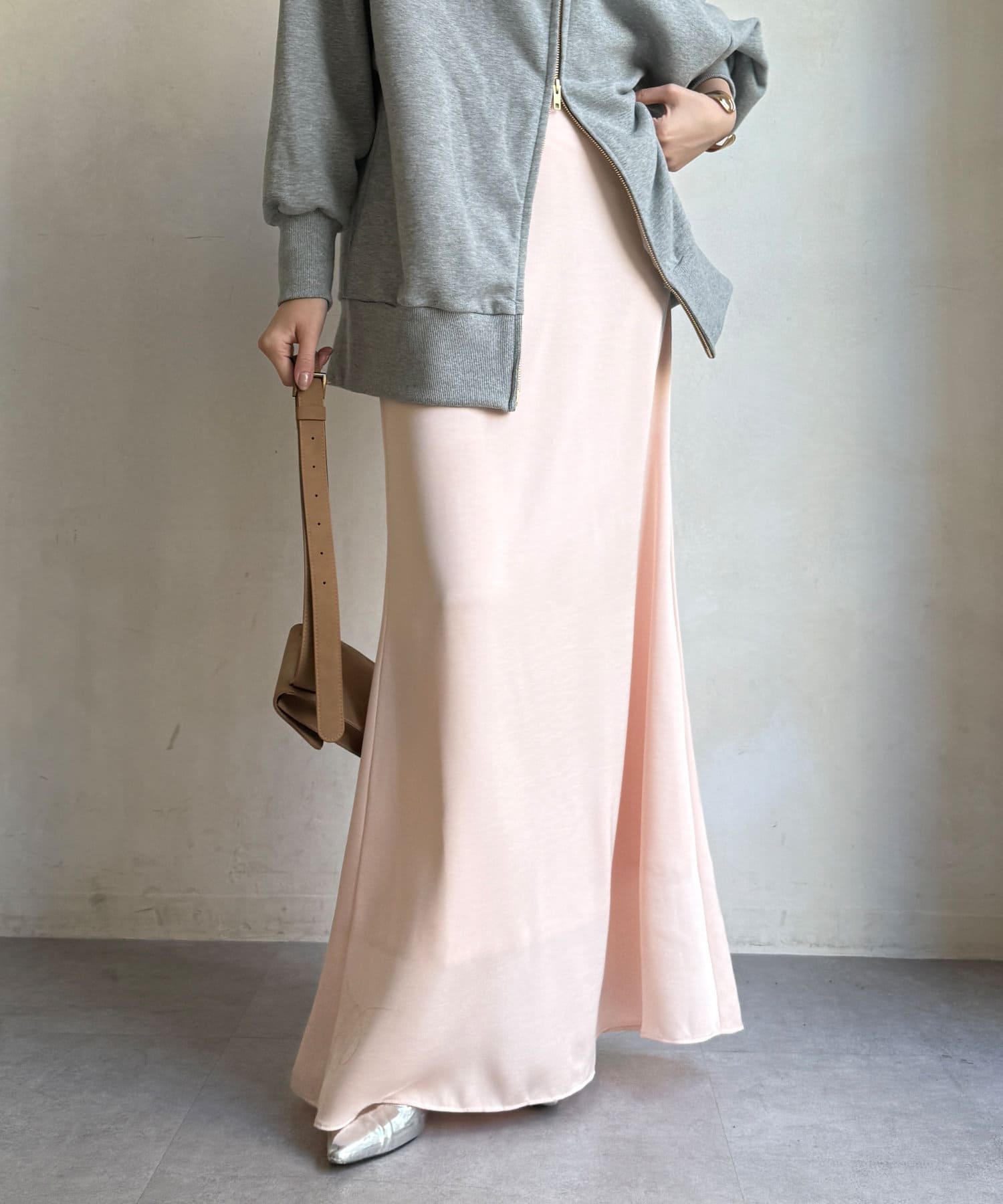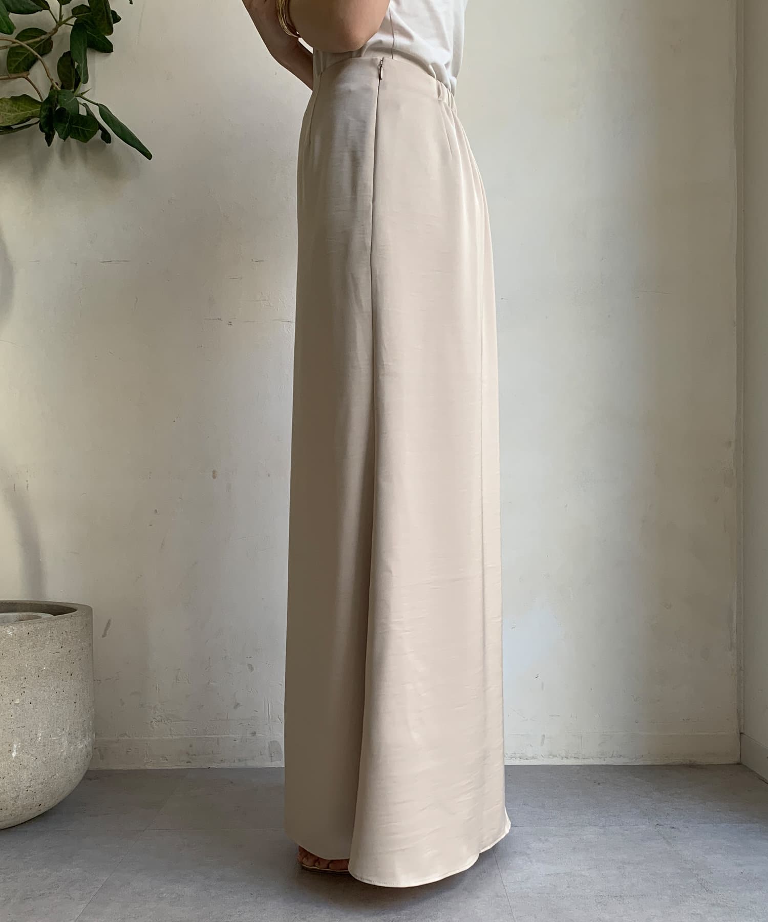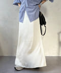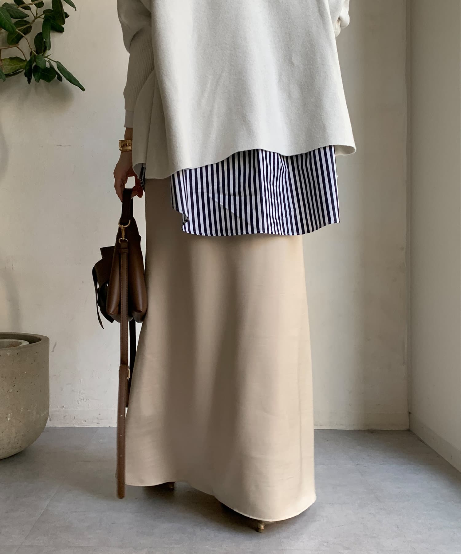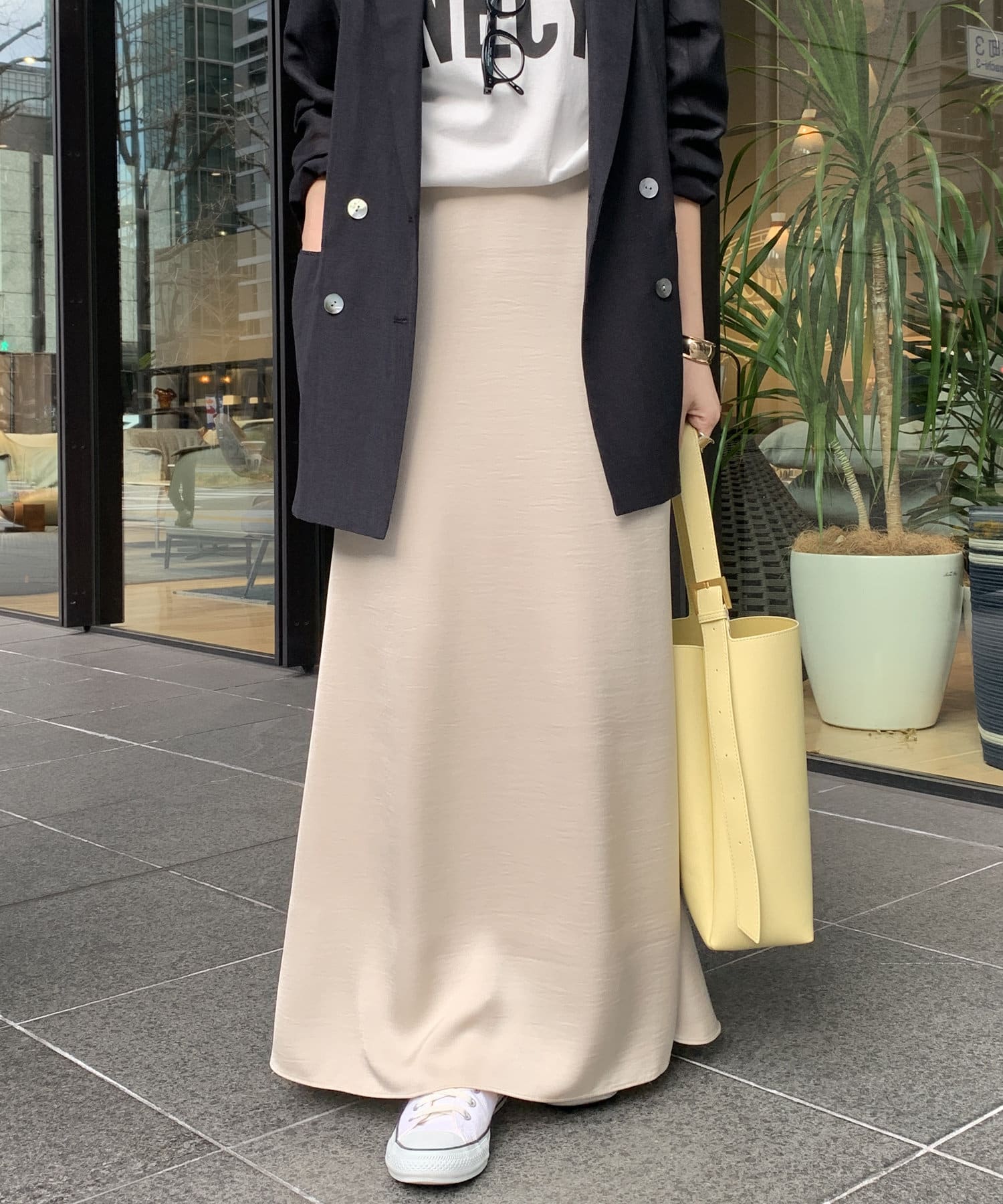 すっきりとした落ち感のある綺麗なシルエットが女性らしい印象を与えてくれるサテンスカート。