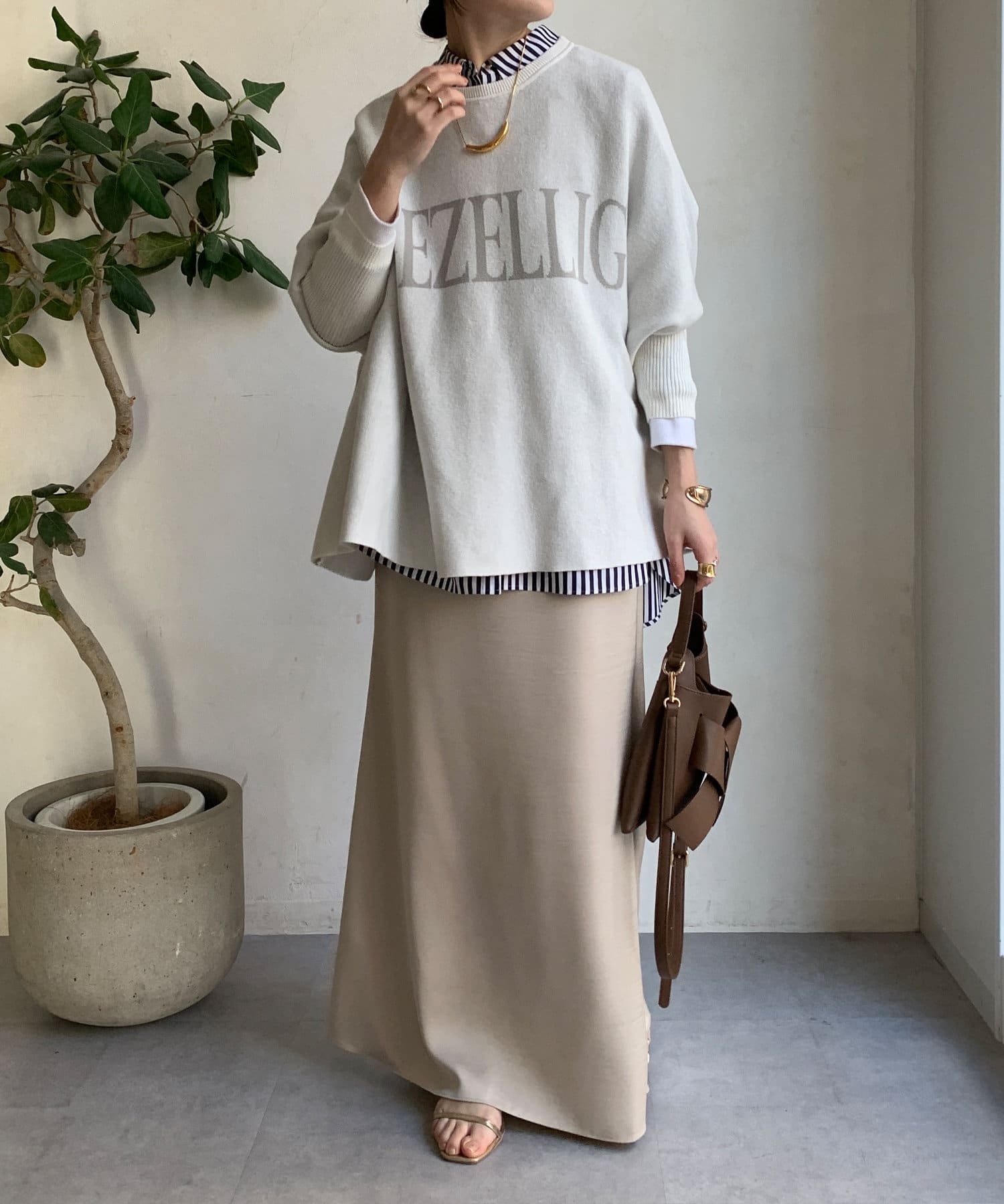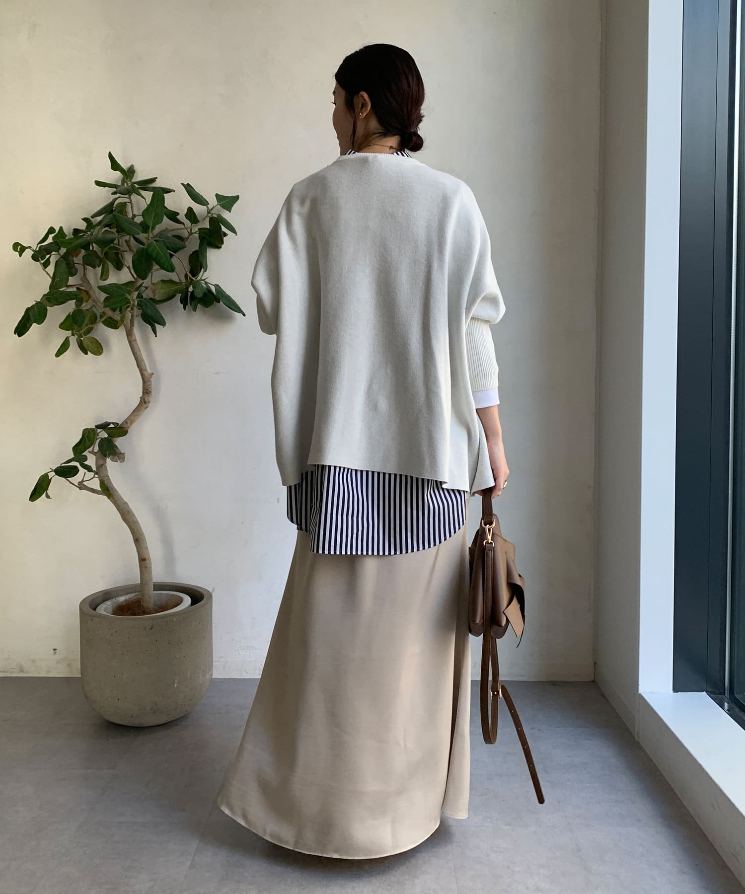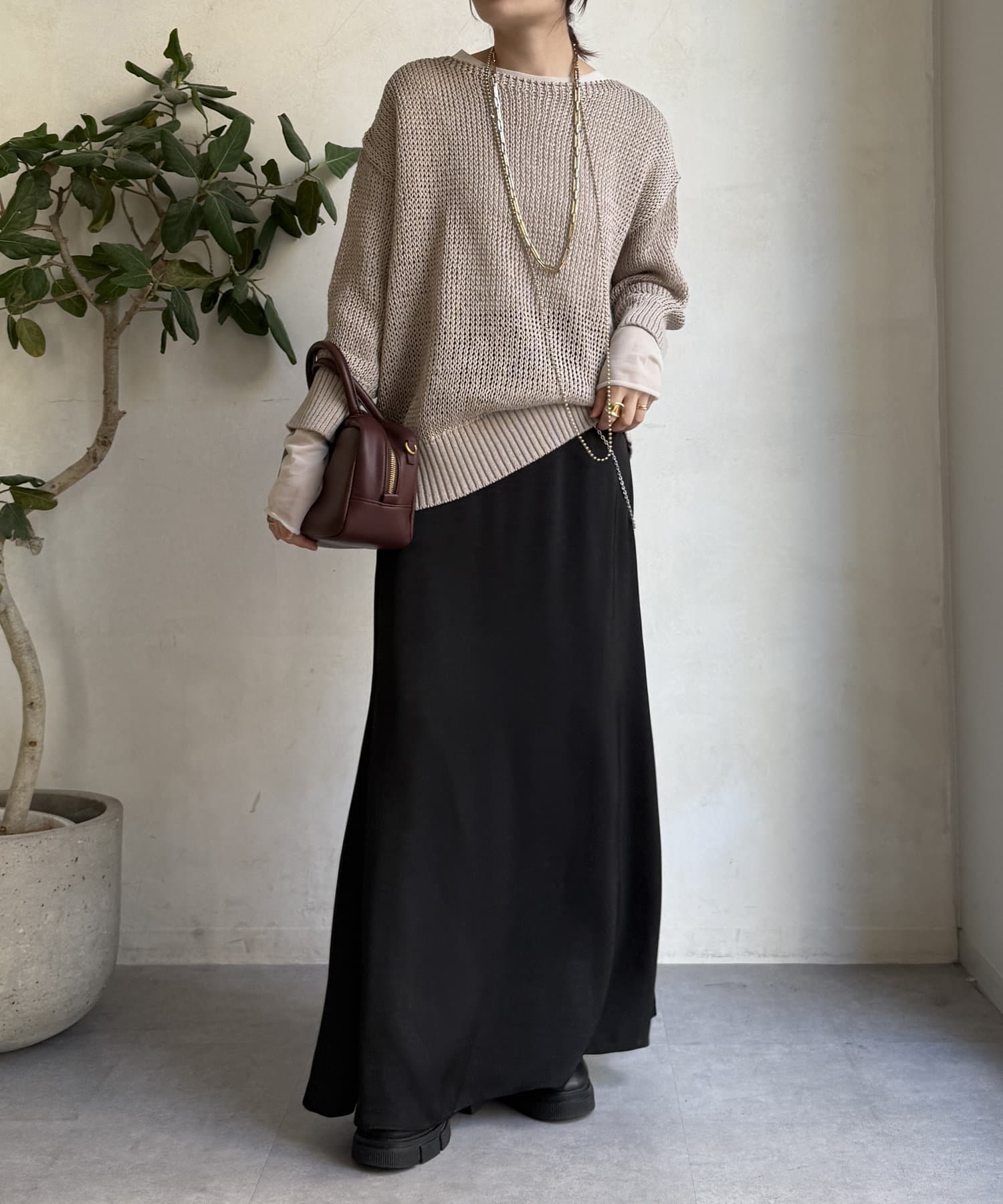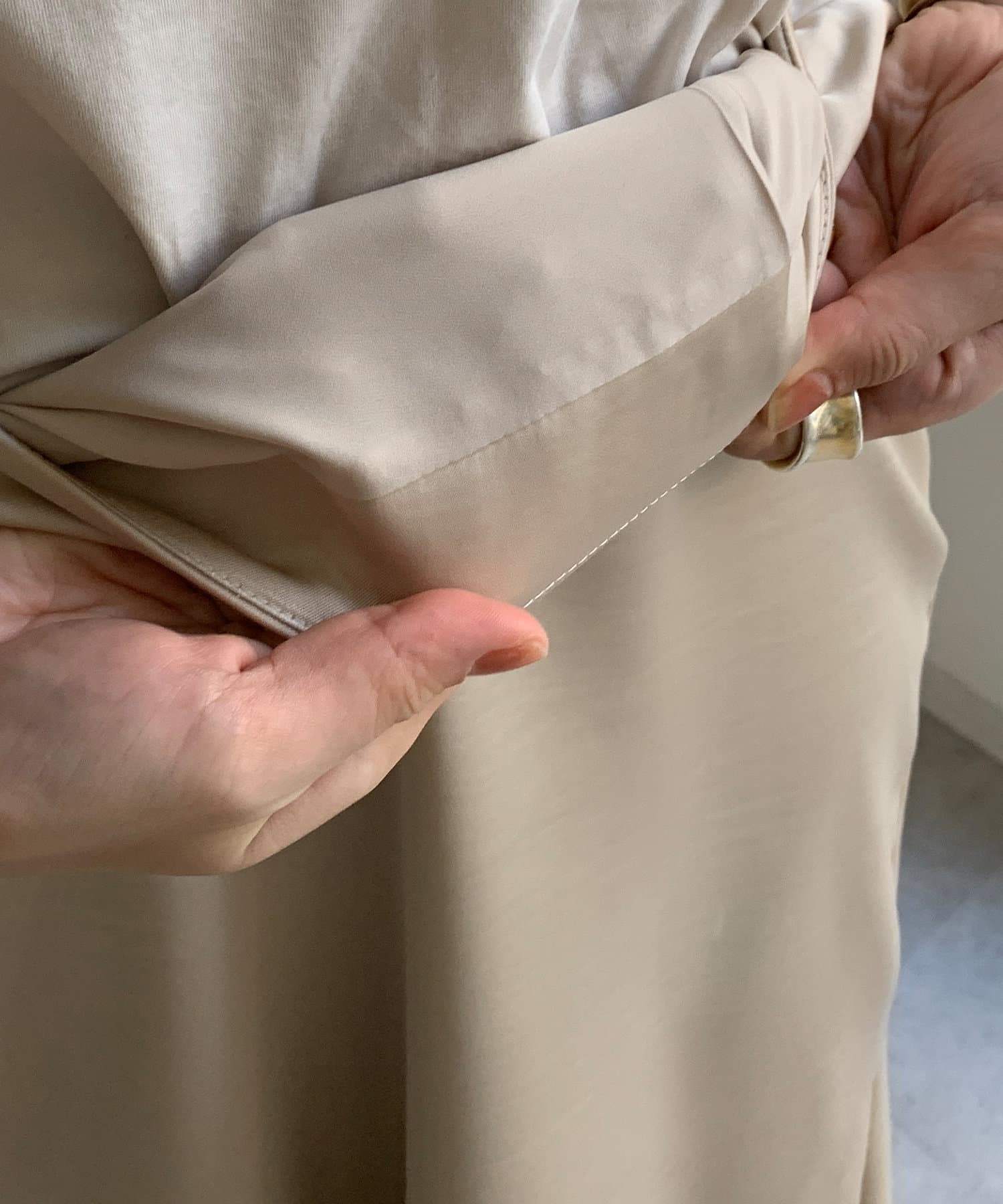 すっきりとした落ち感のある綺麗なシルエットが女性らしい印象を与えてくれるサテンスカート。