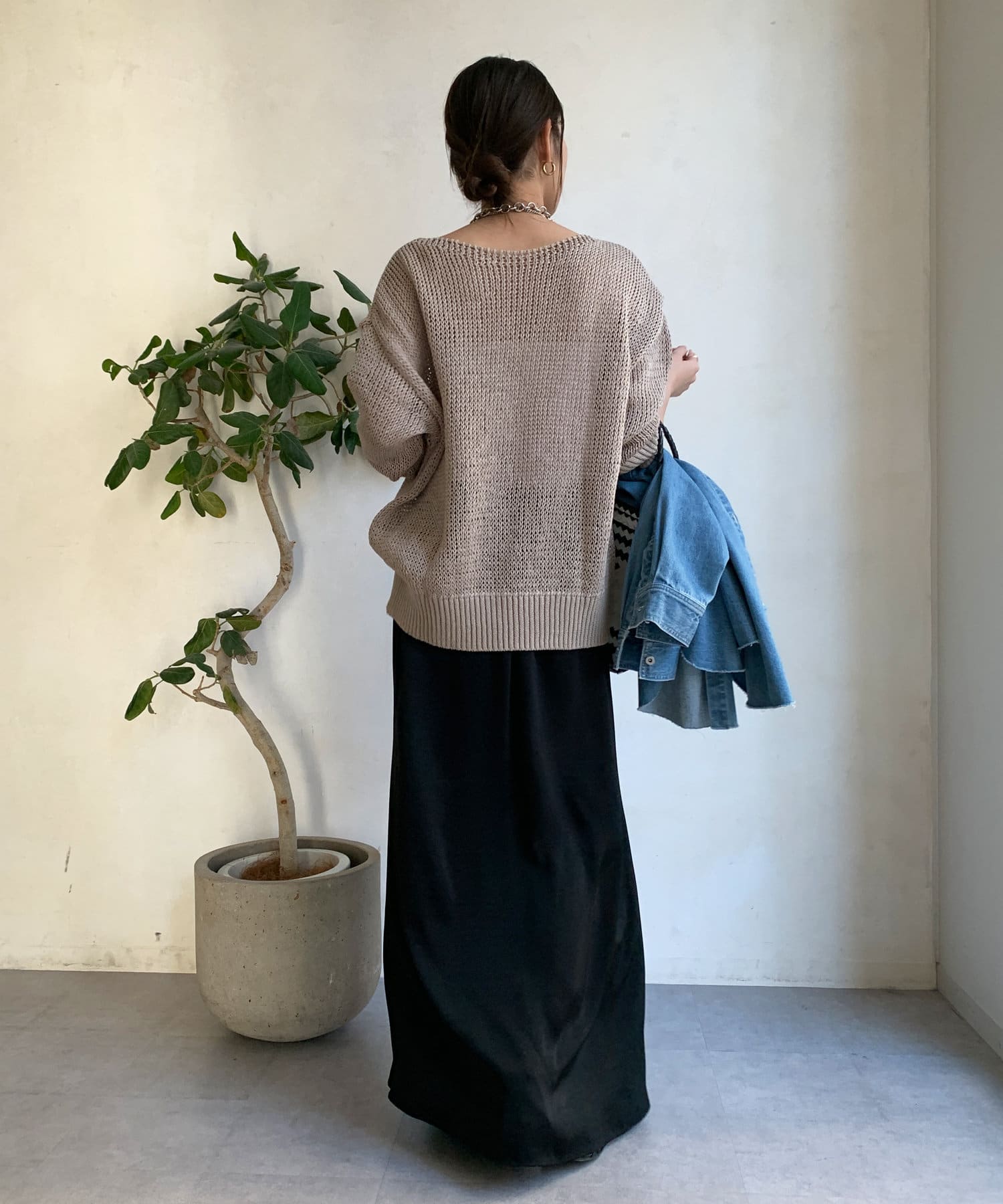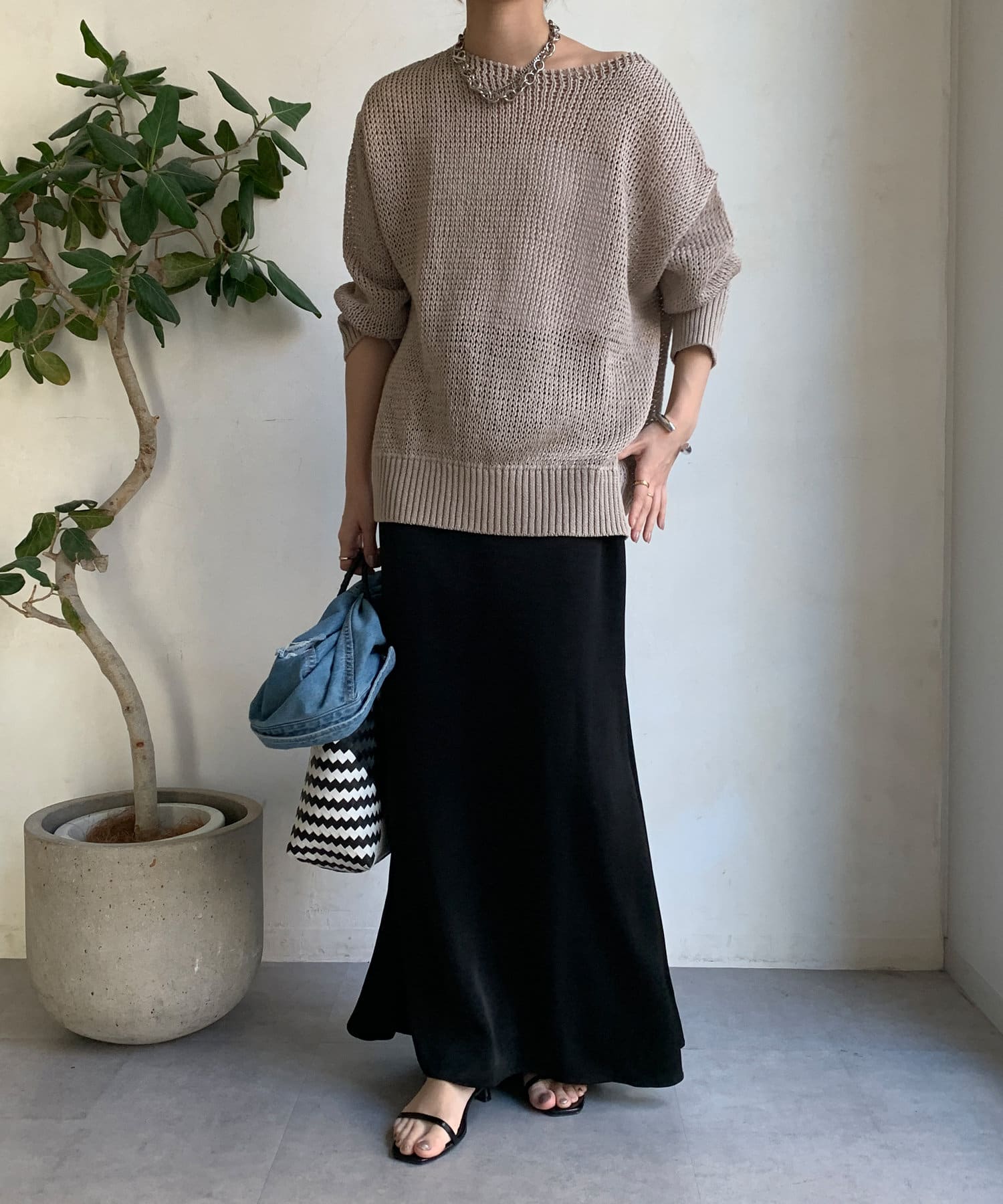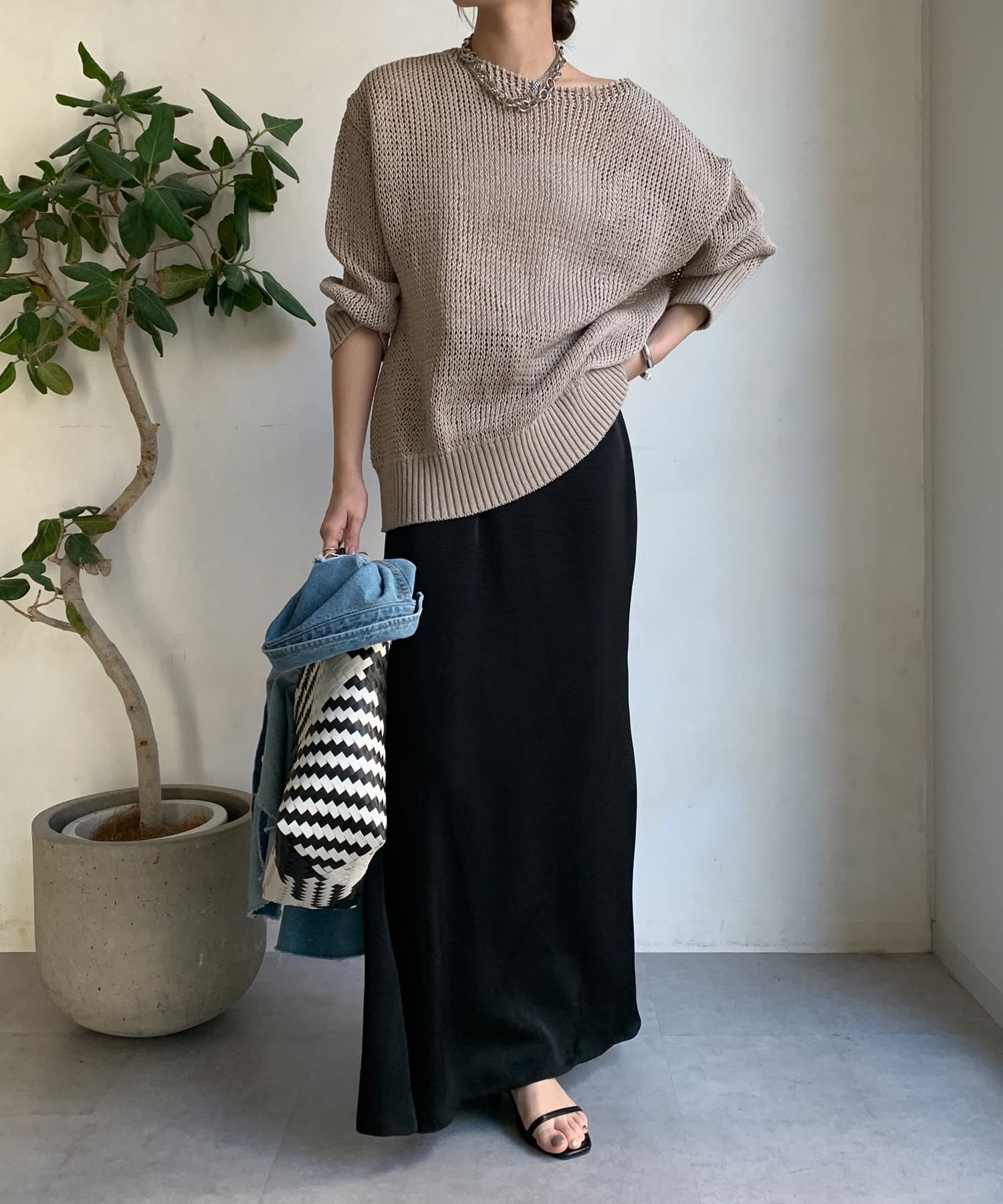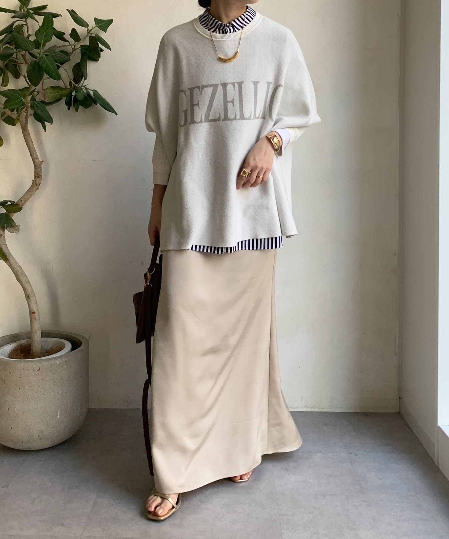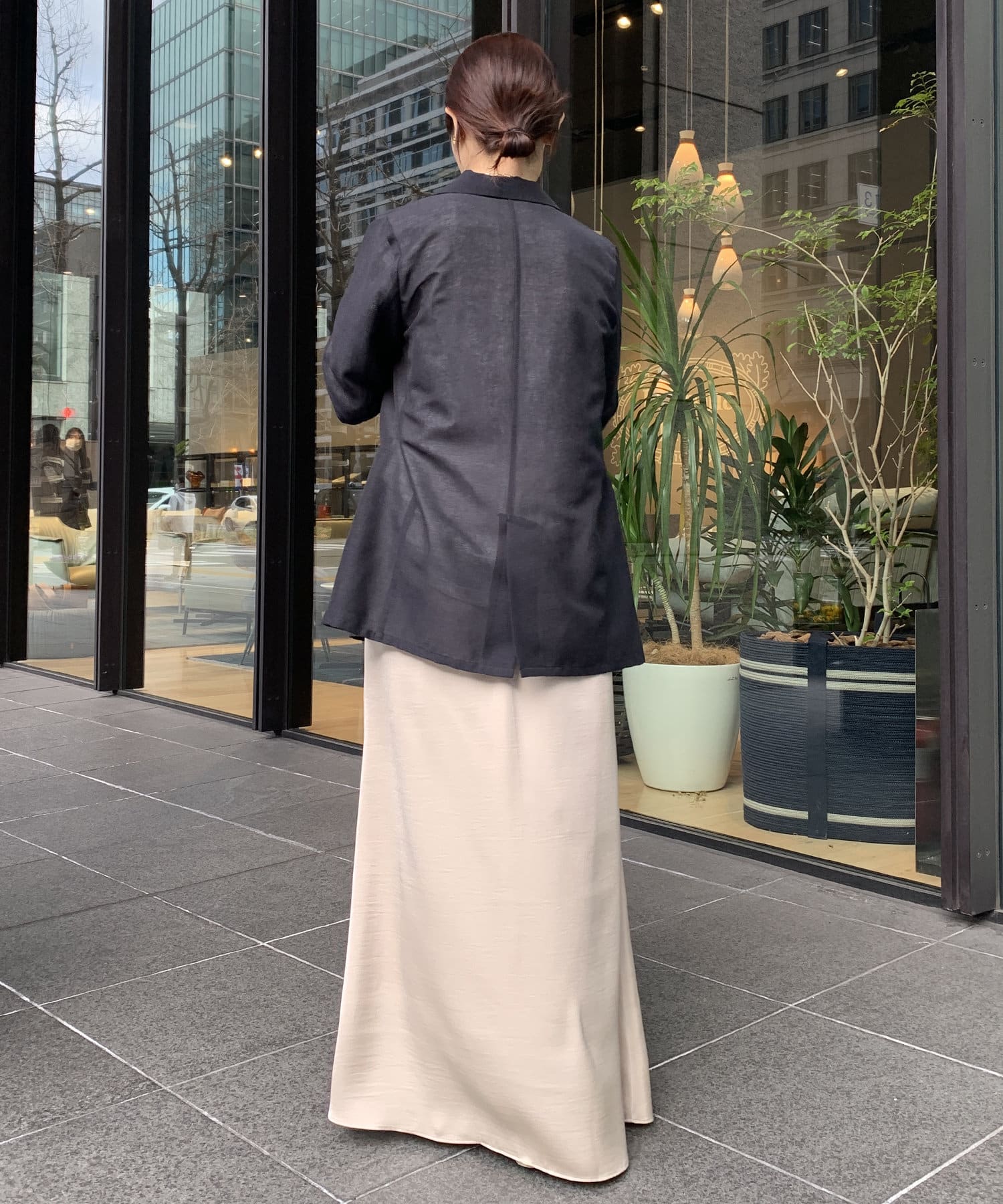 すっきりとした落ち感のある綺麗なシルエットが女性らしい印象を与えてくれるサテンスカート。