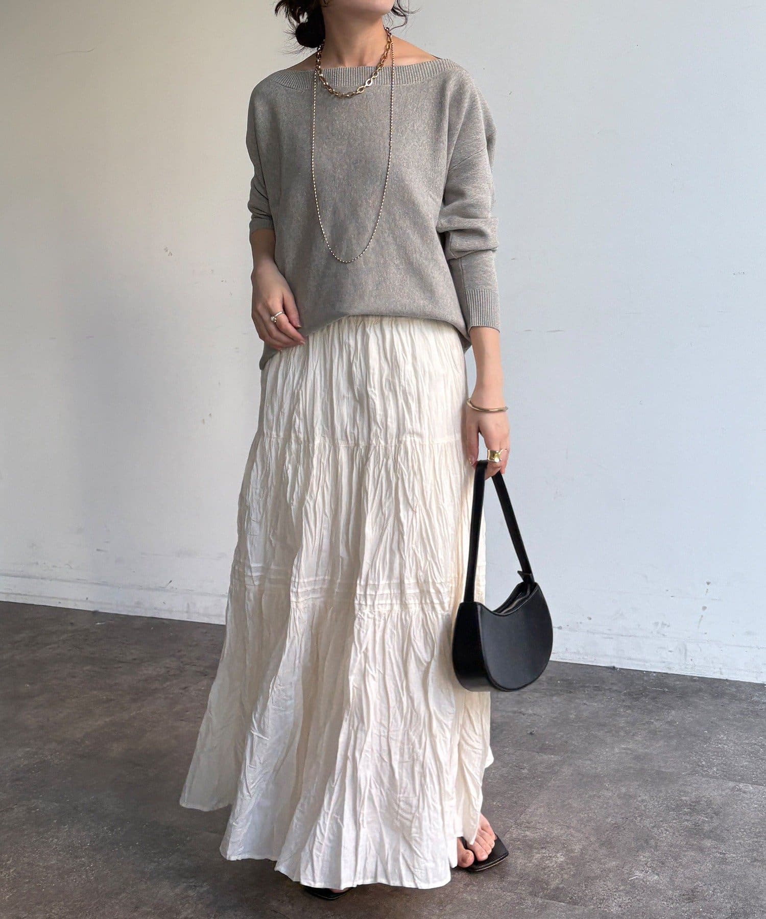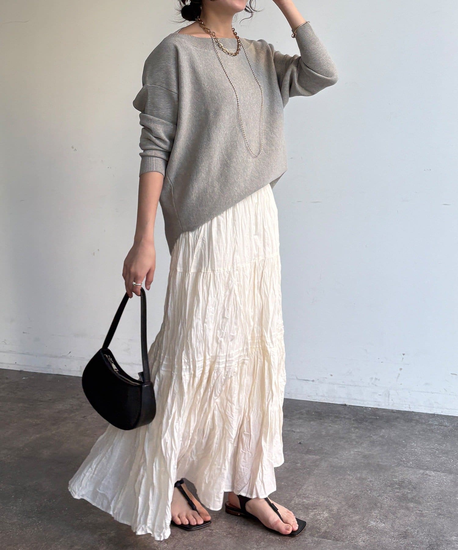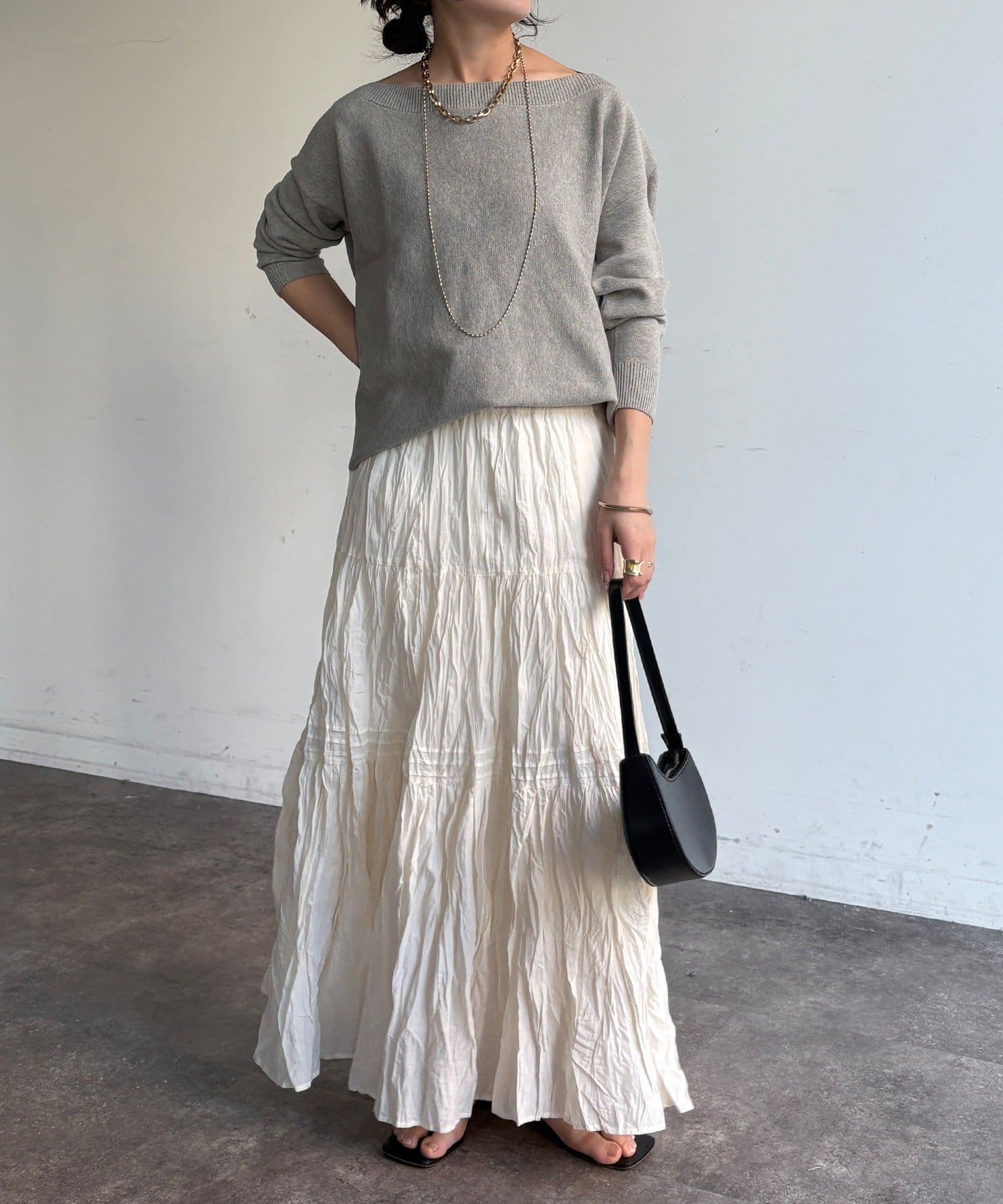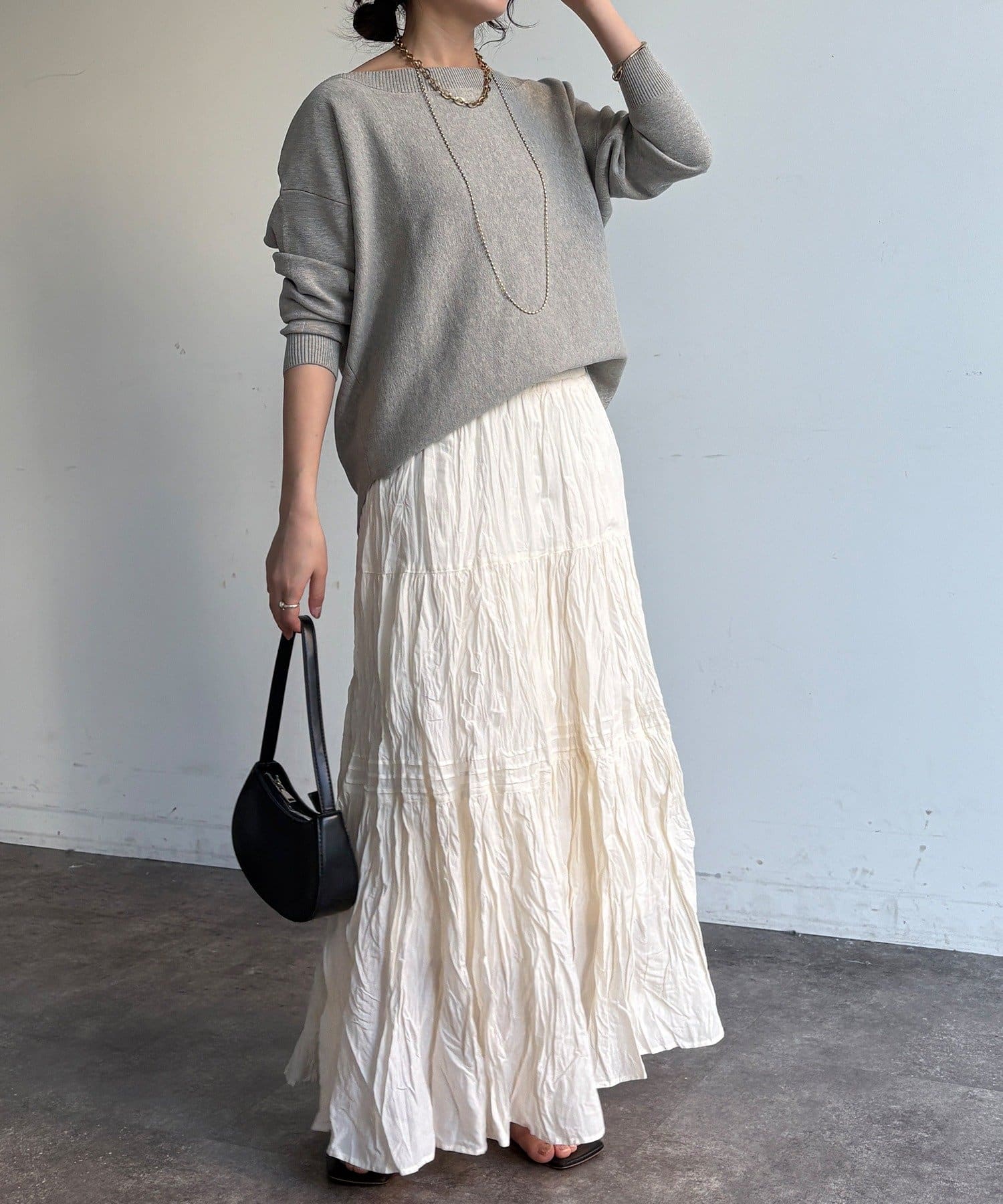 生地にくしゃくしゃとした細かいシワを施した、立体感のあるナチュラルな表情が特徴のスカート。