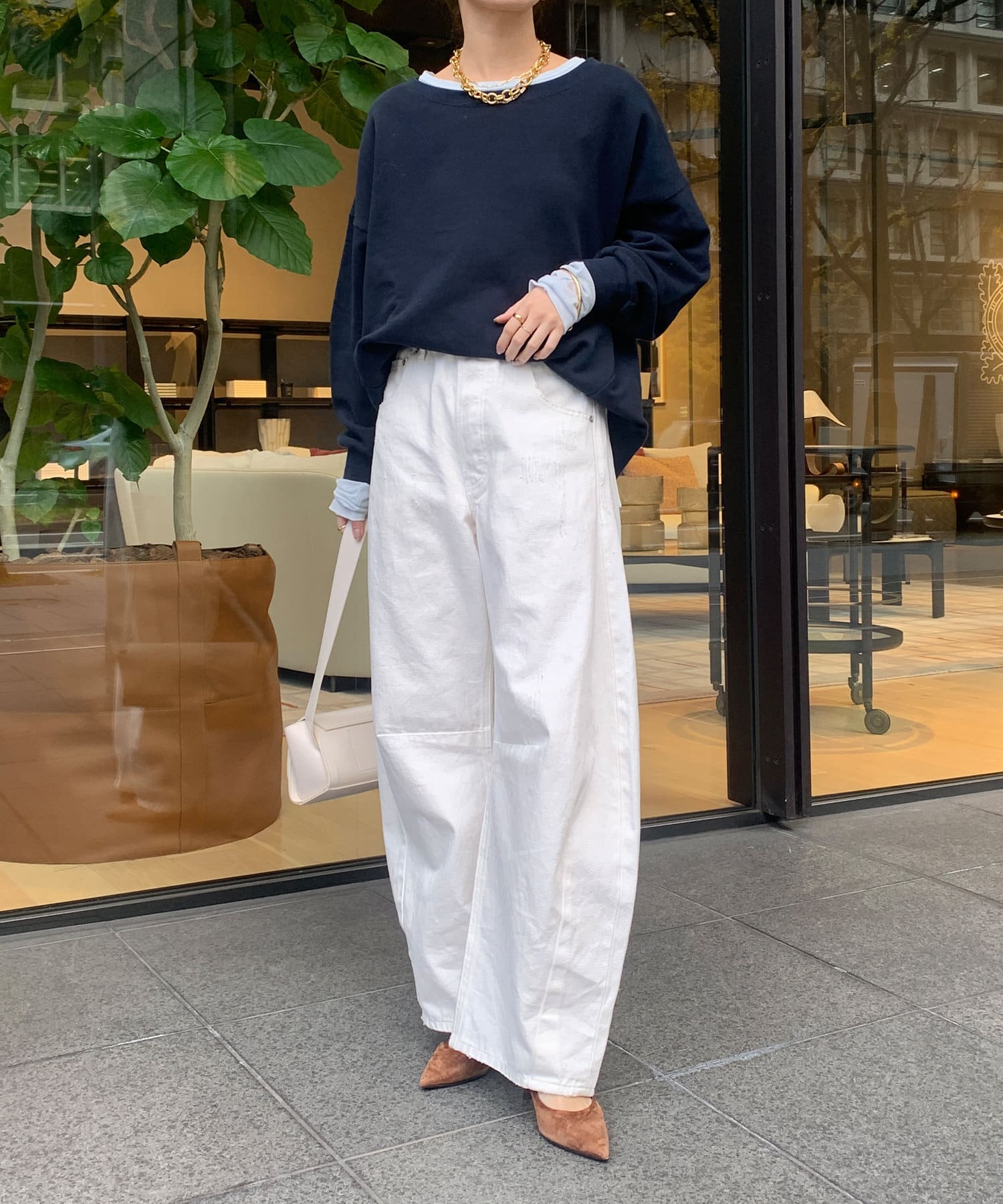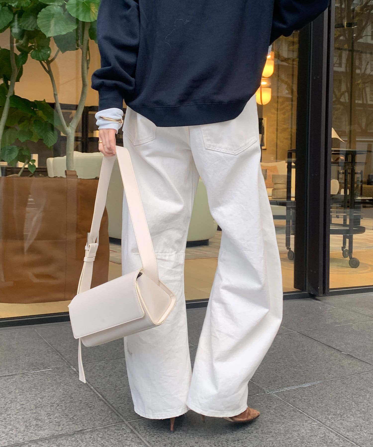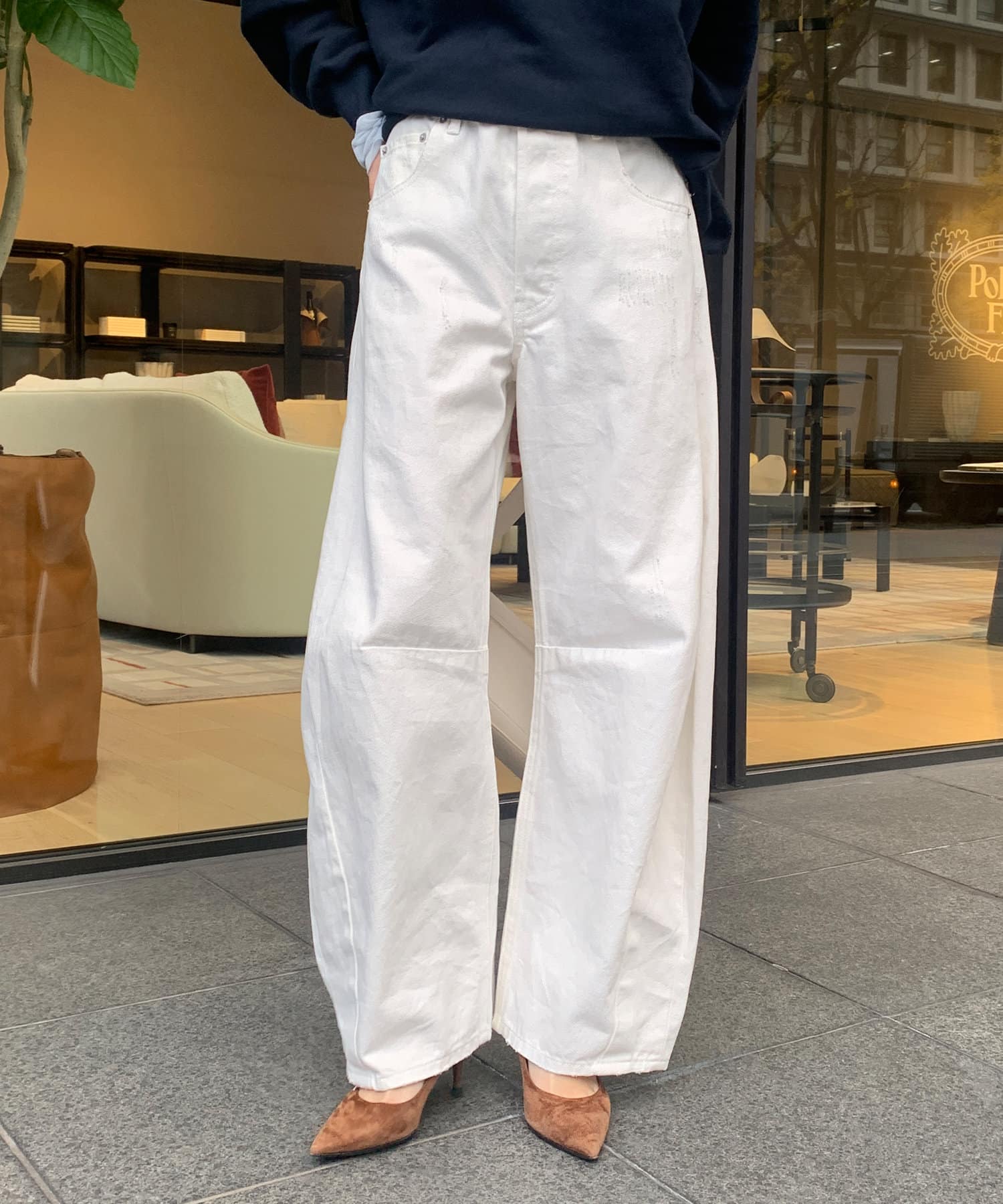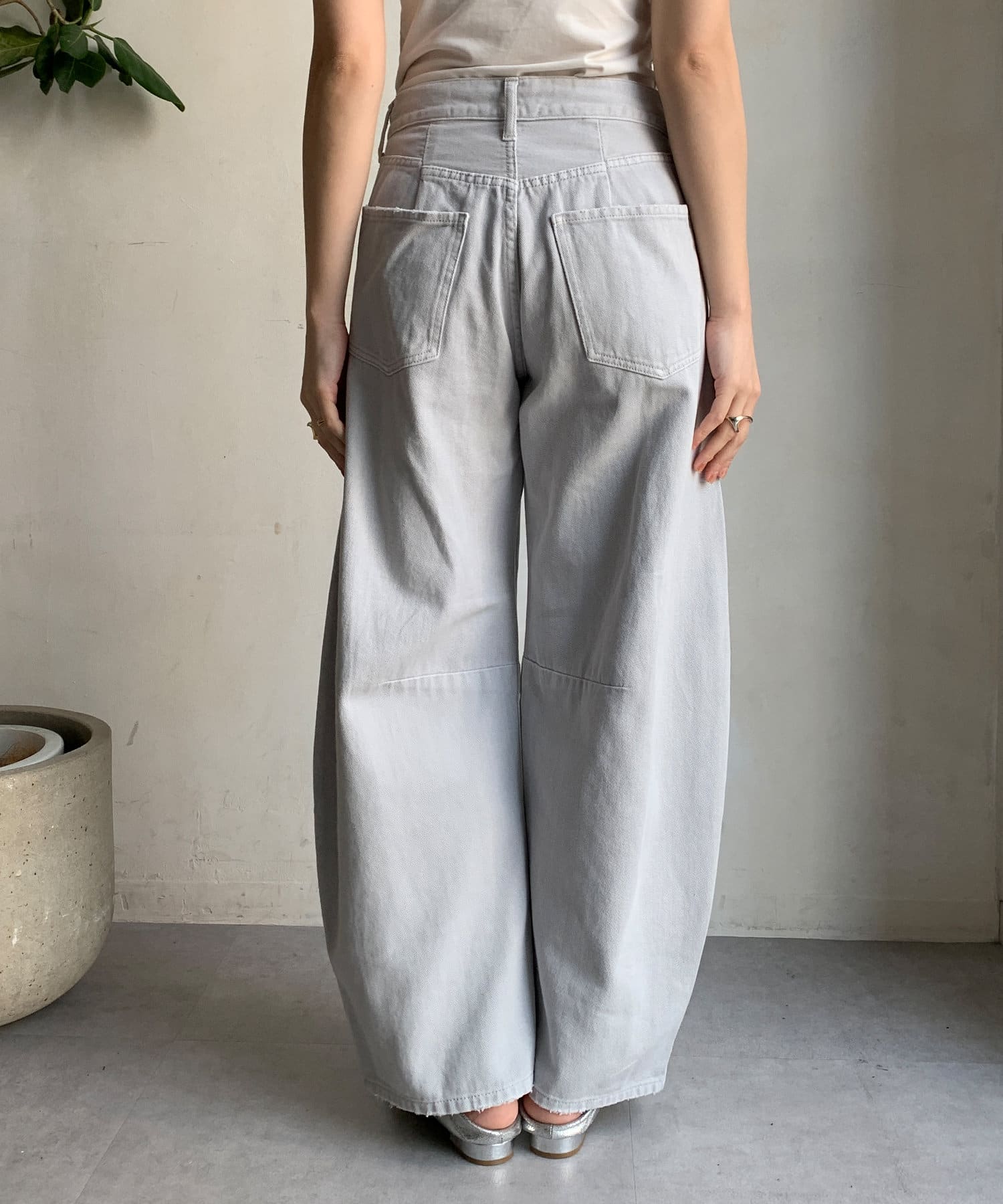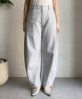 カーブしたレッグラインが特徴のデニムパンツ。
