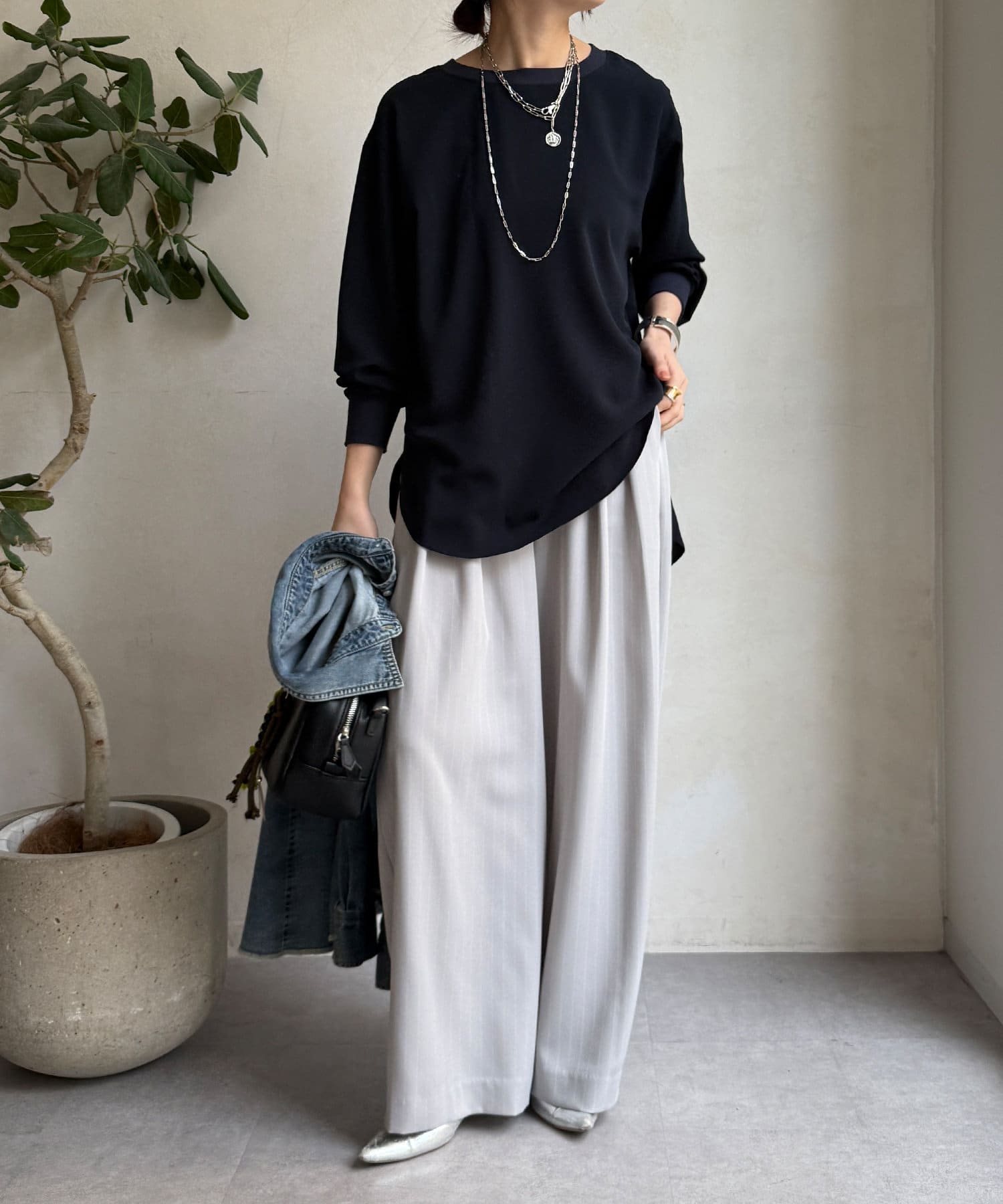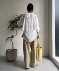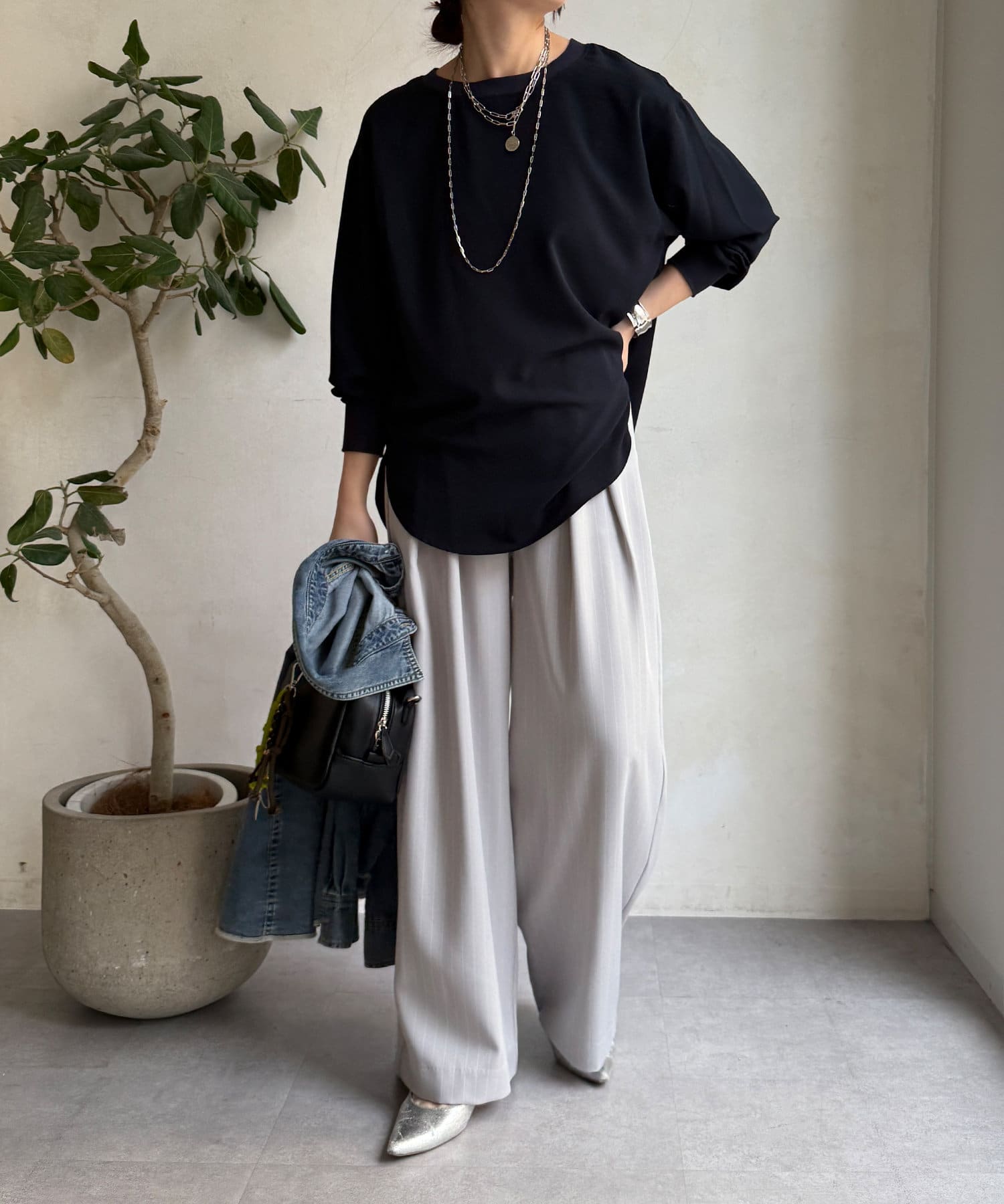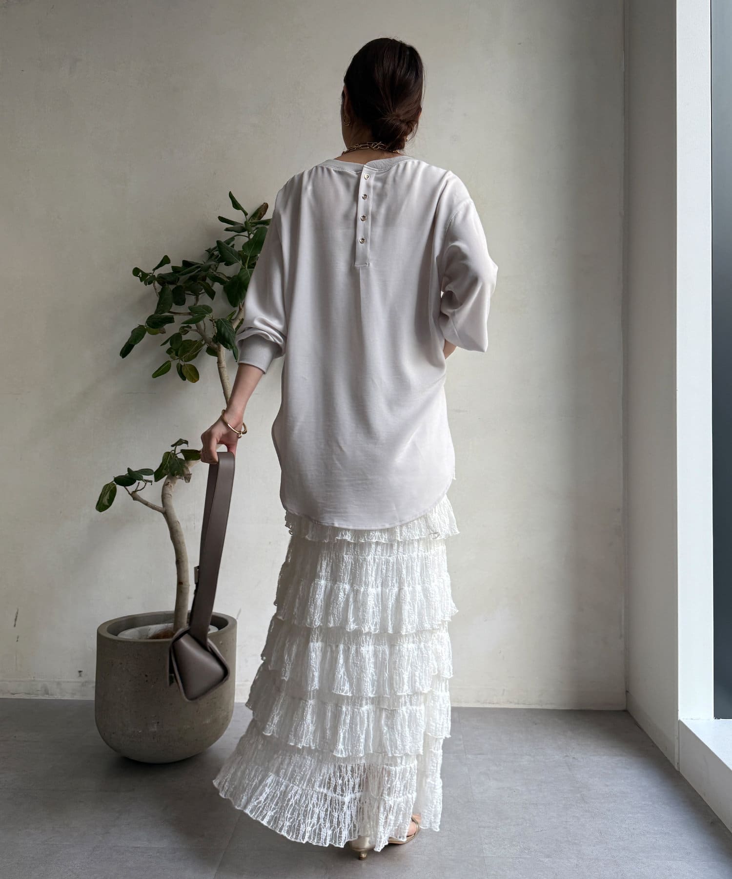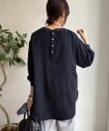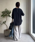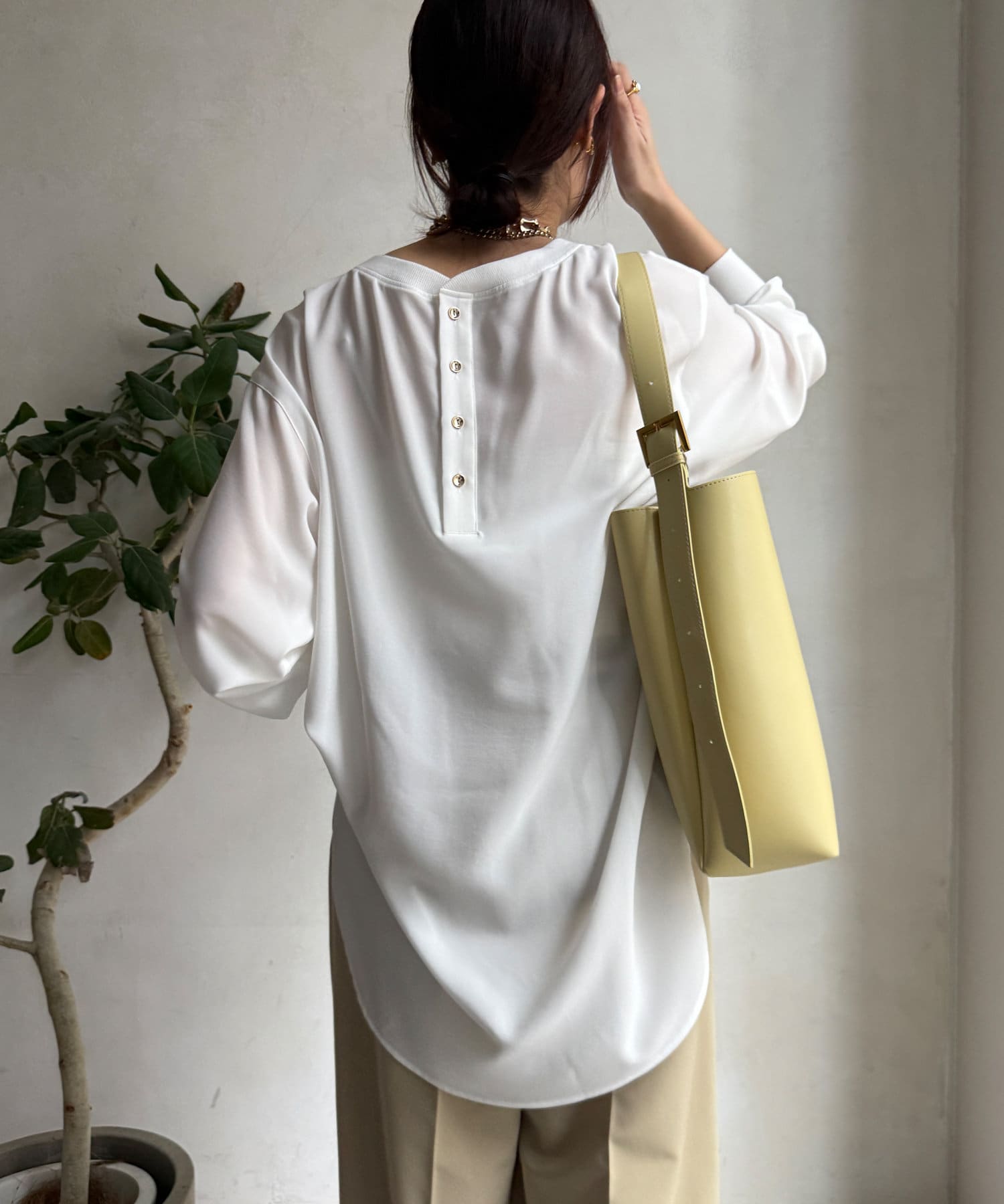 そして、バックネック部分のボタンデザインや裾のカットなどで程よく抜け感のあるカジュアルさをプラスします。