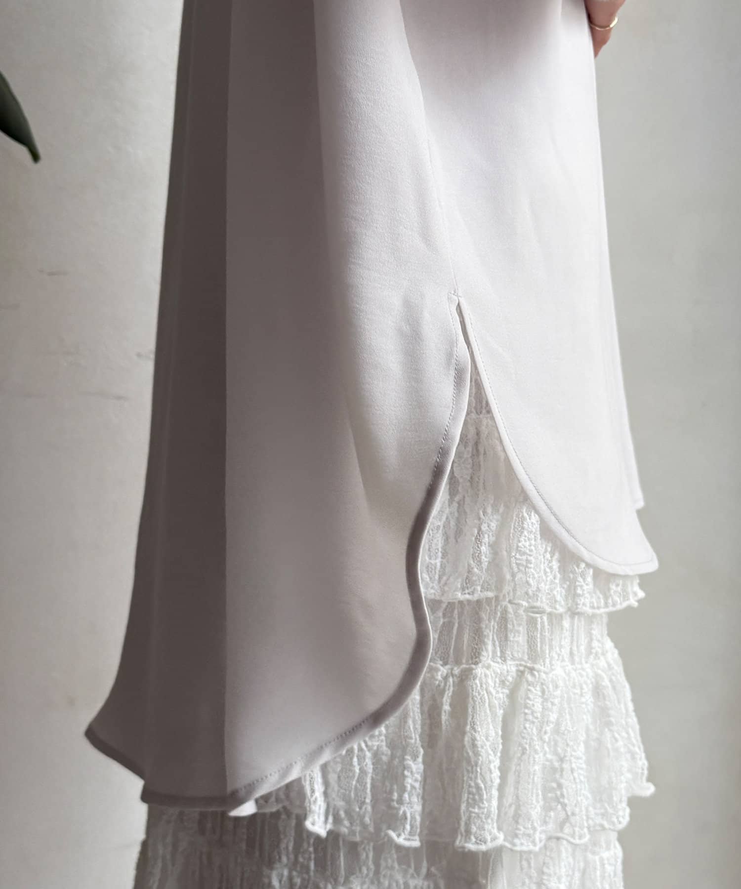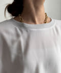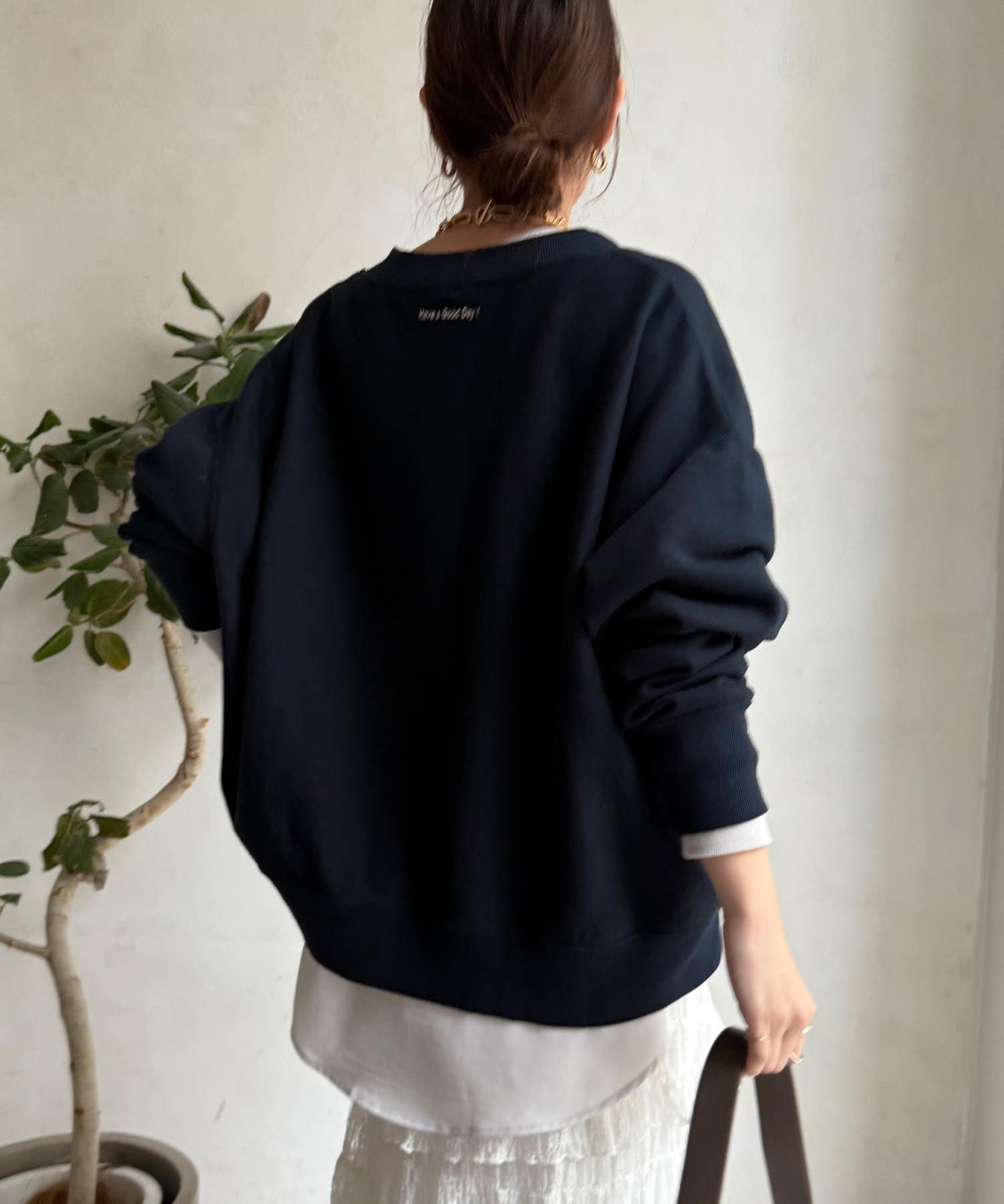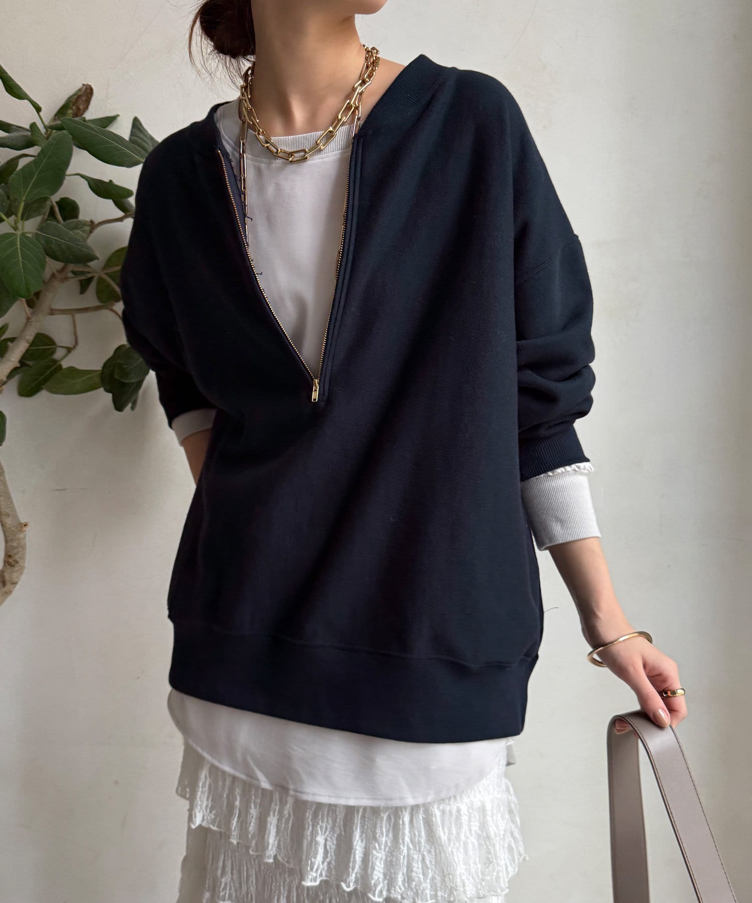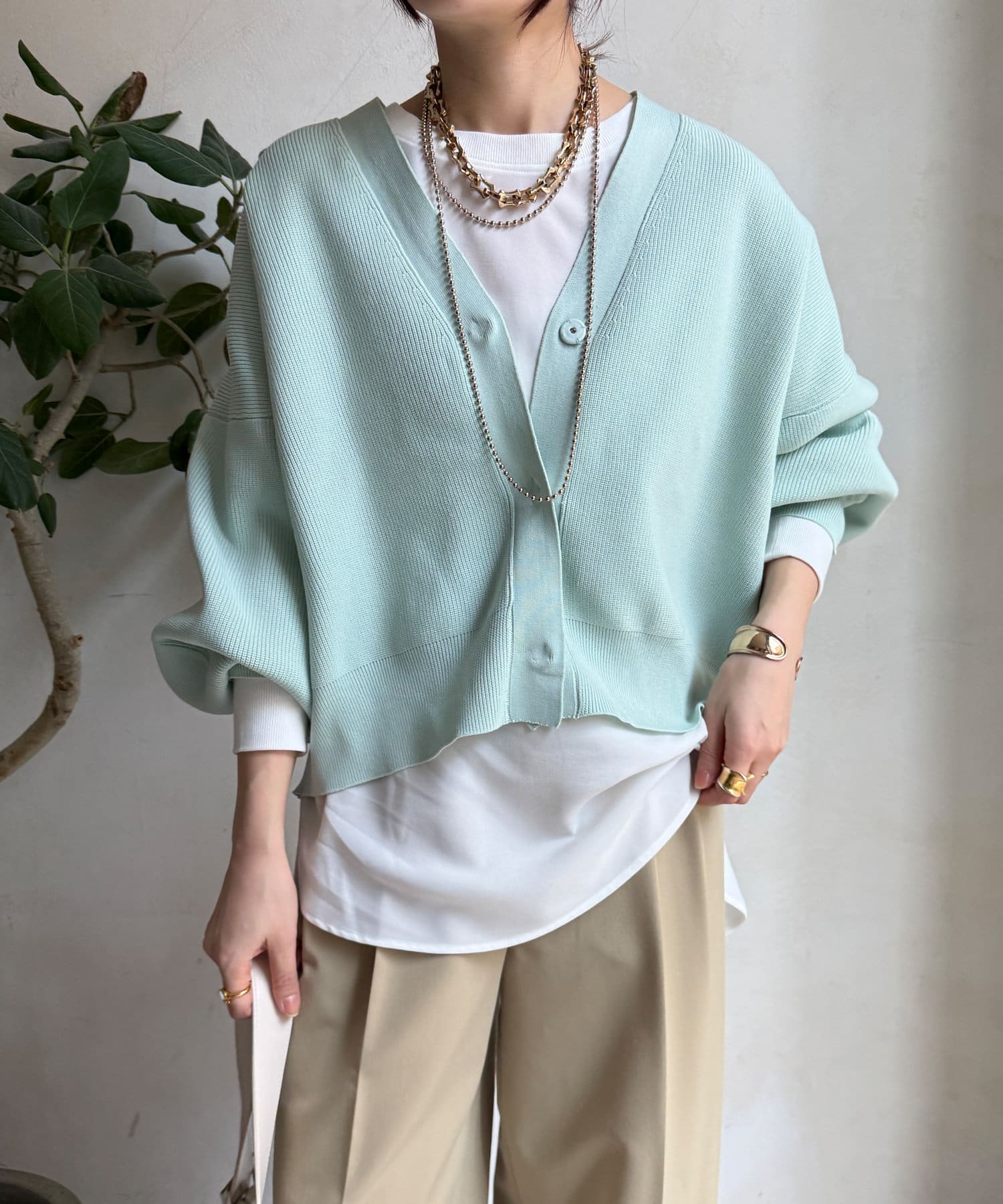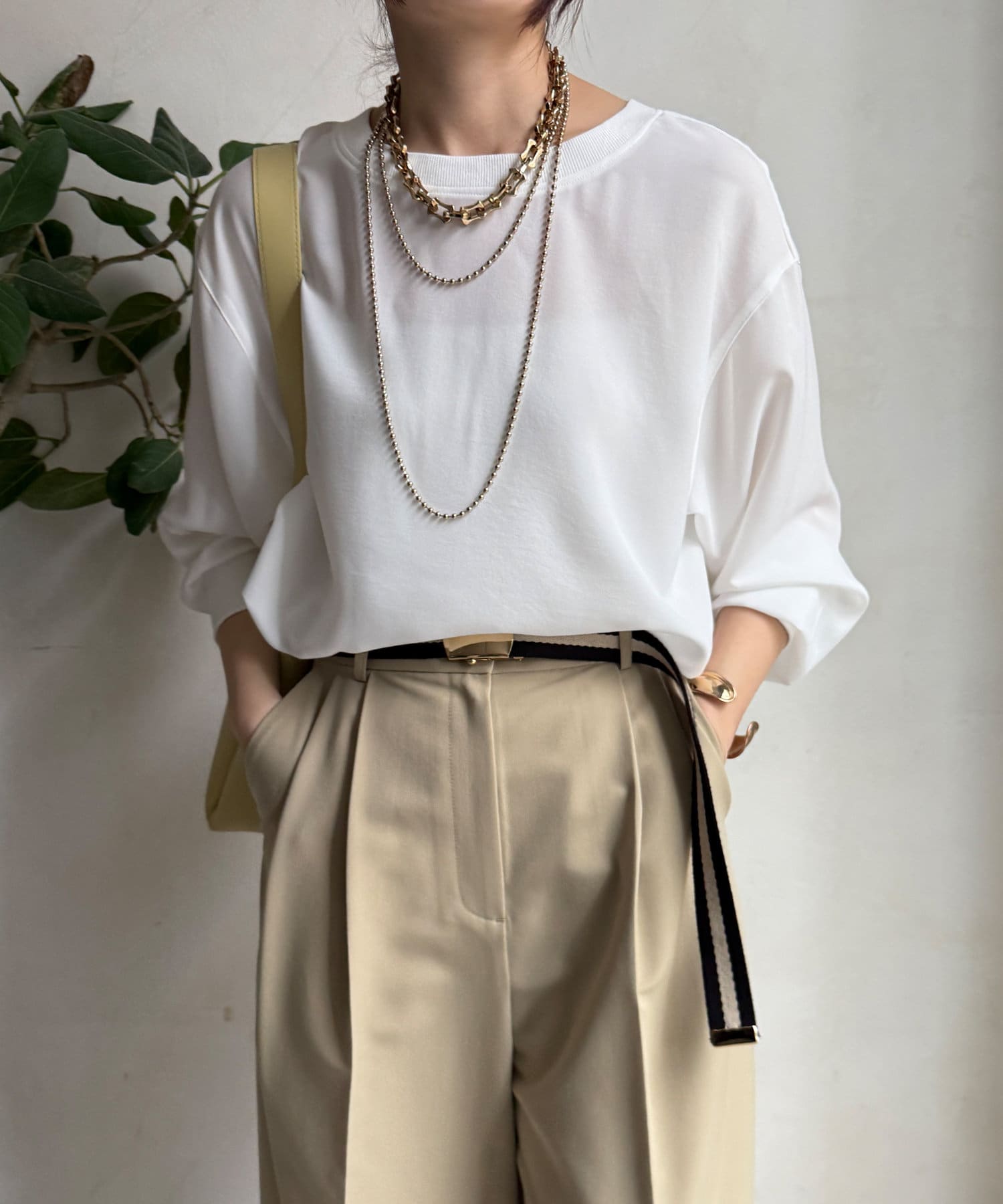 そして、バックネック部分のボタンデザインや裾のカットなどで程よく抜け感のあるカジュアルさをプラスします。