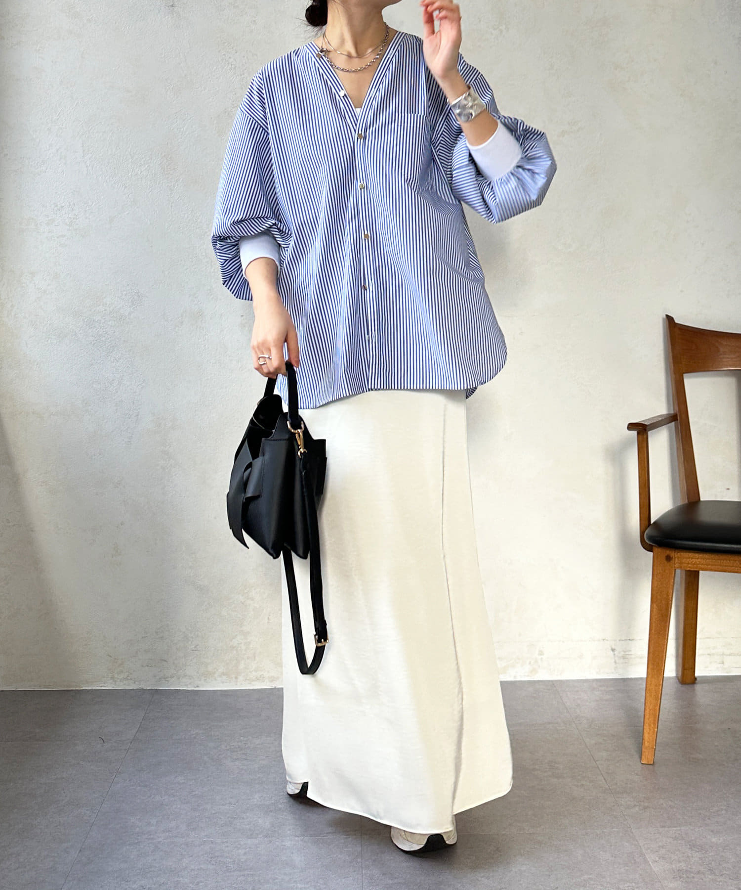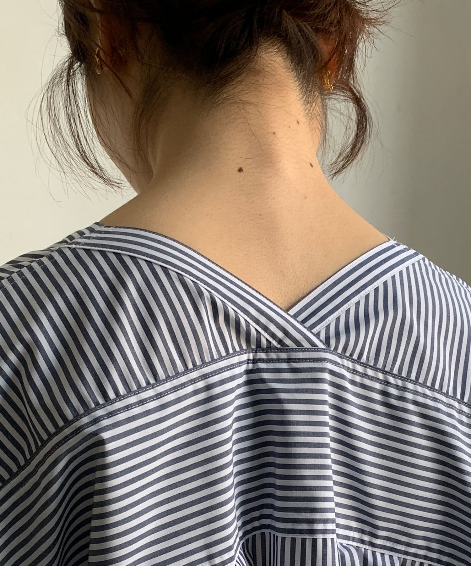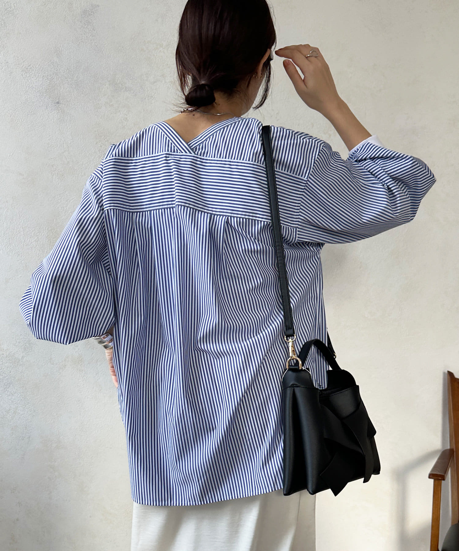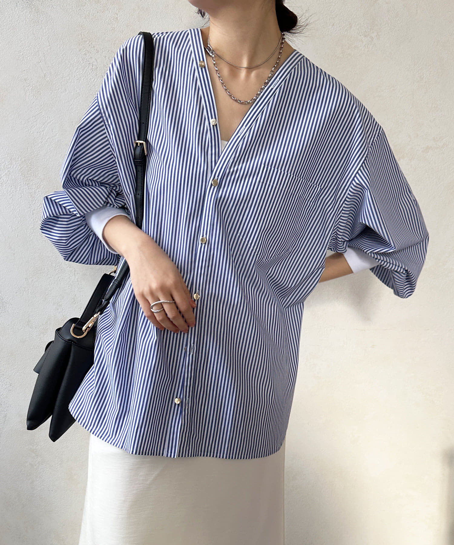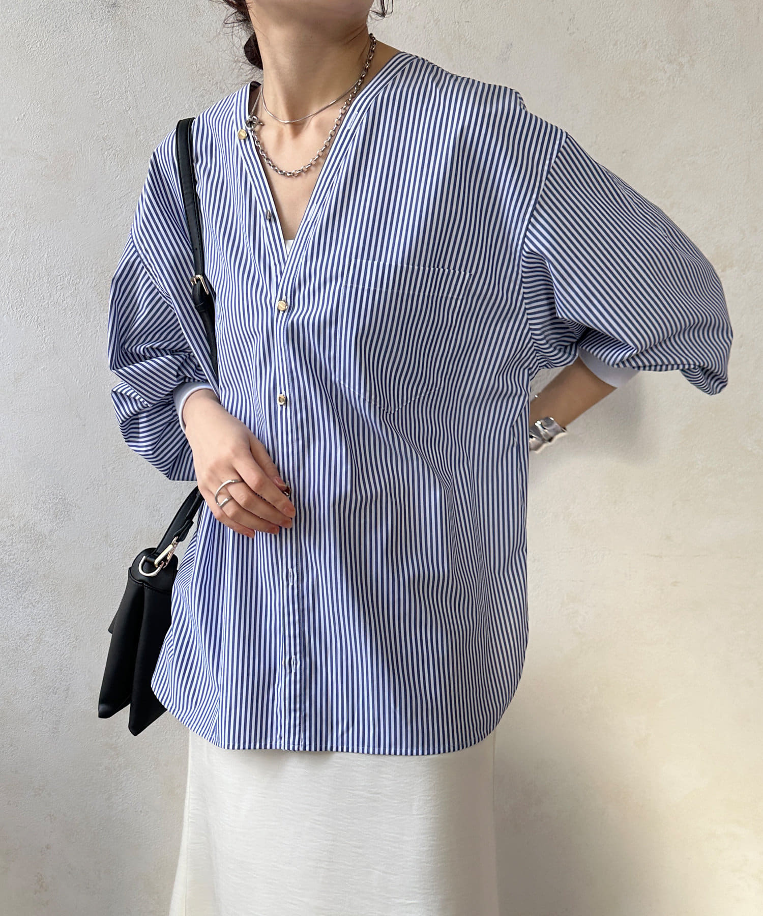 商品名が "VVシャツ" というだけあって、前後ともにVネックのデザインに。お顔周りのすっきり見えを叶えてくれます。