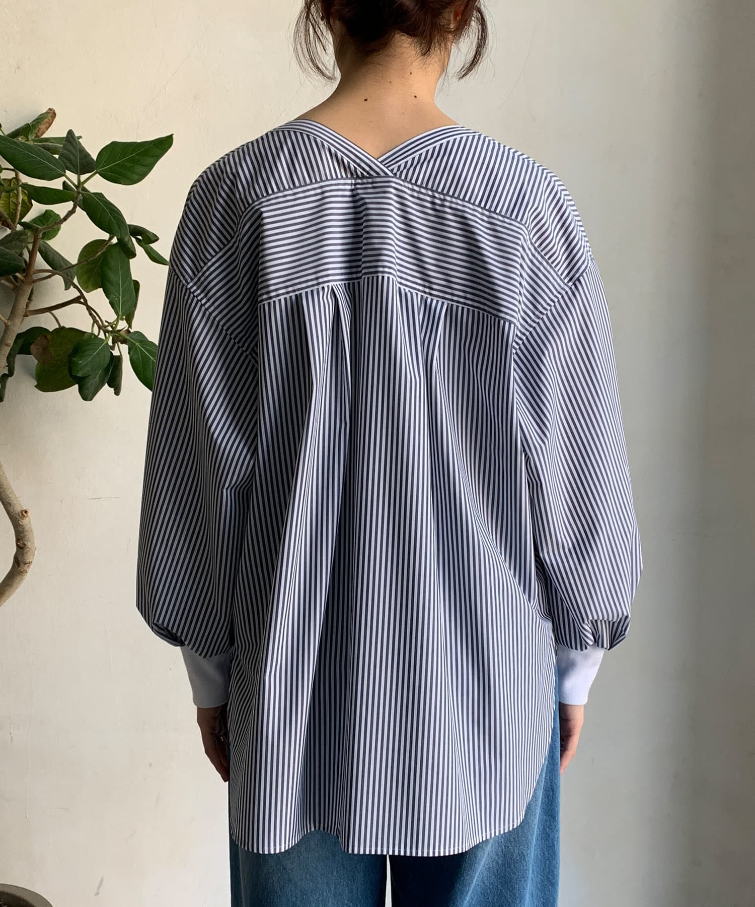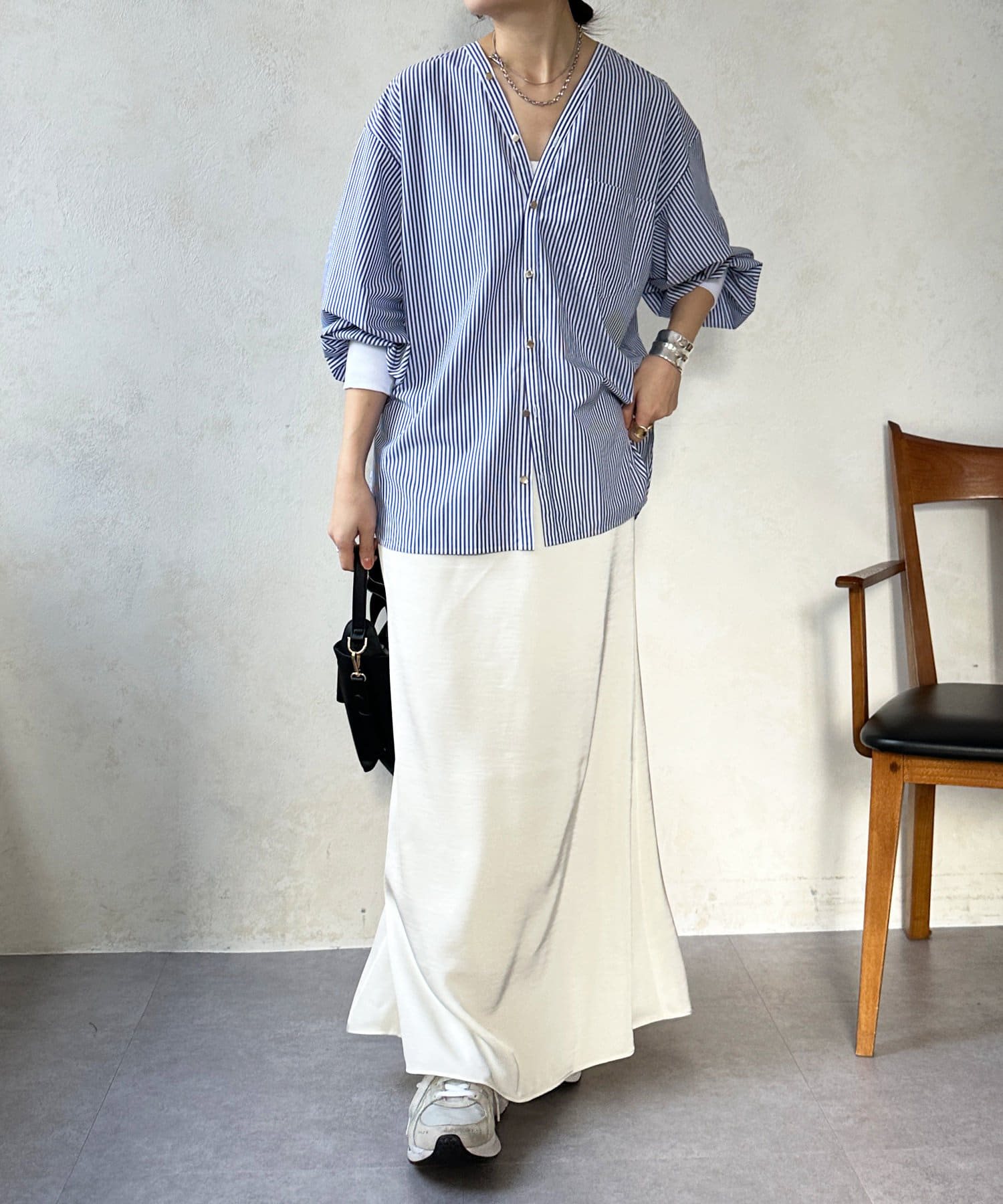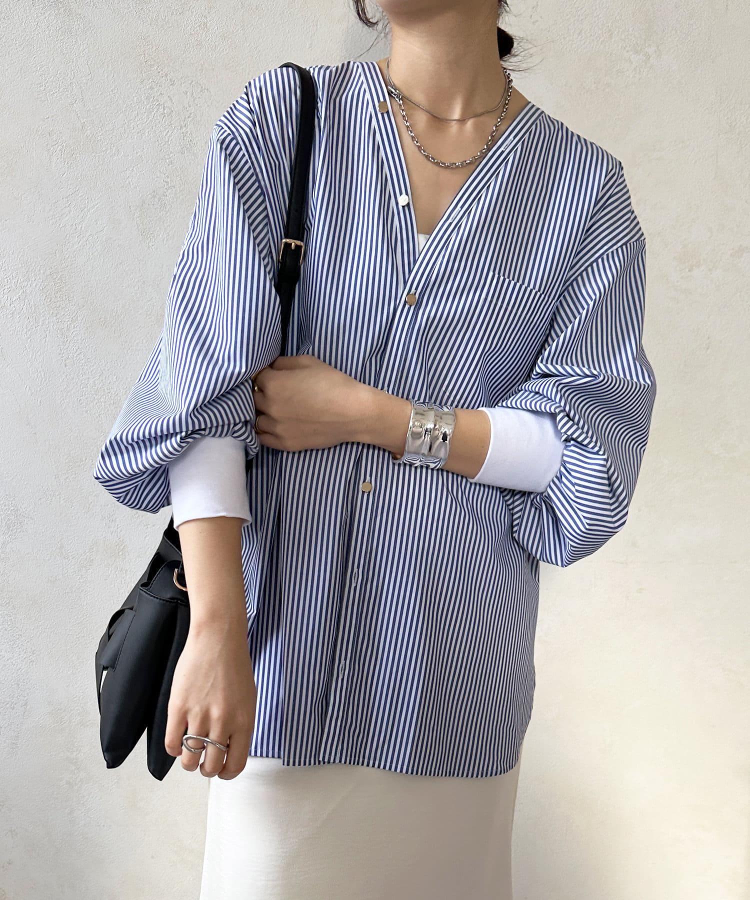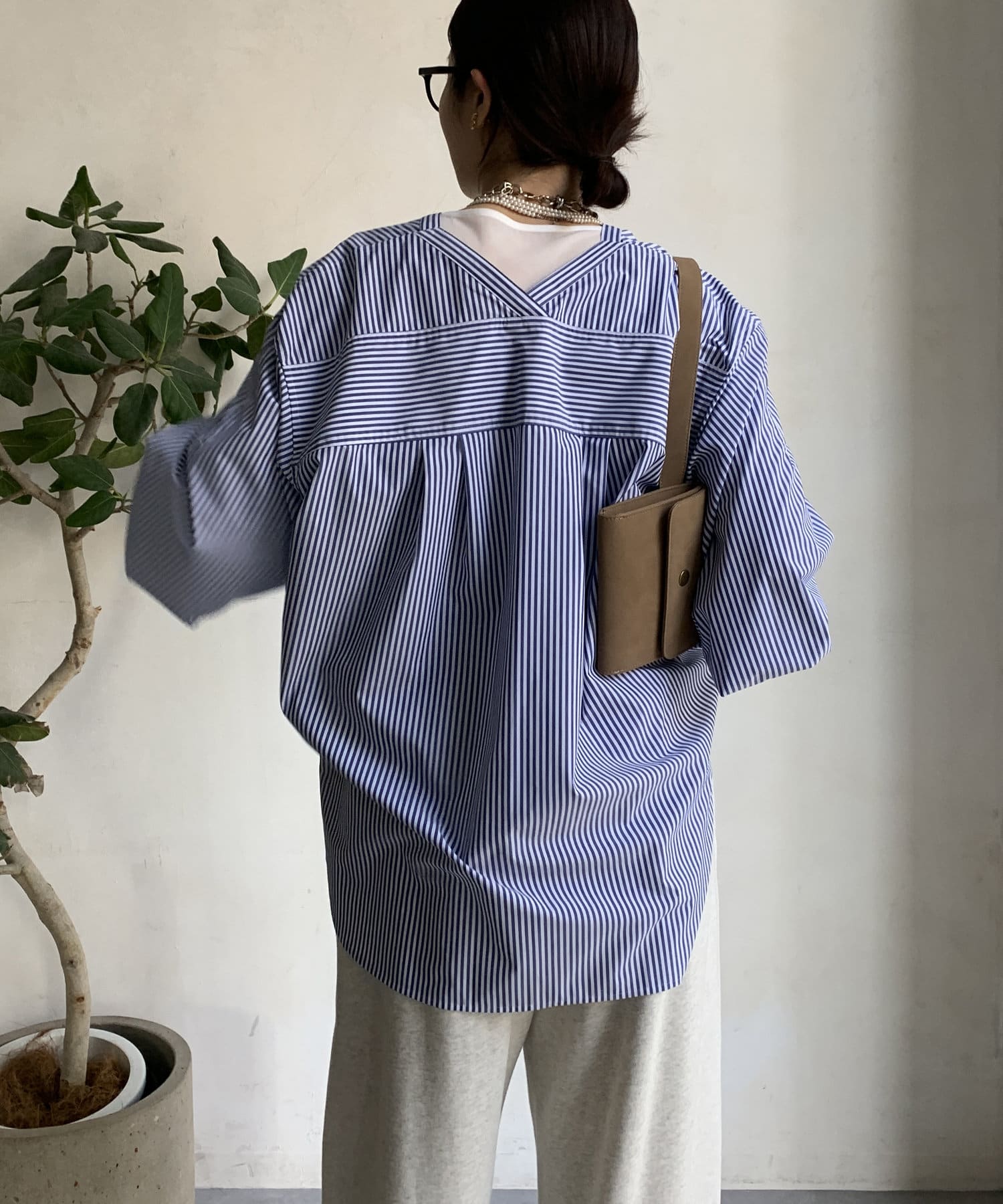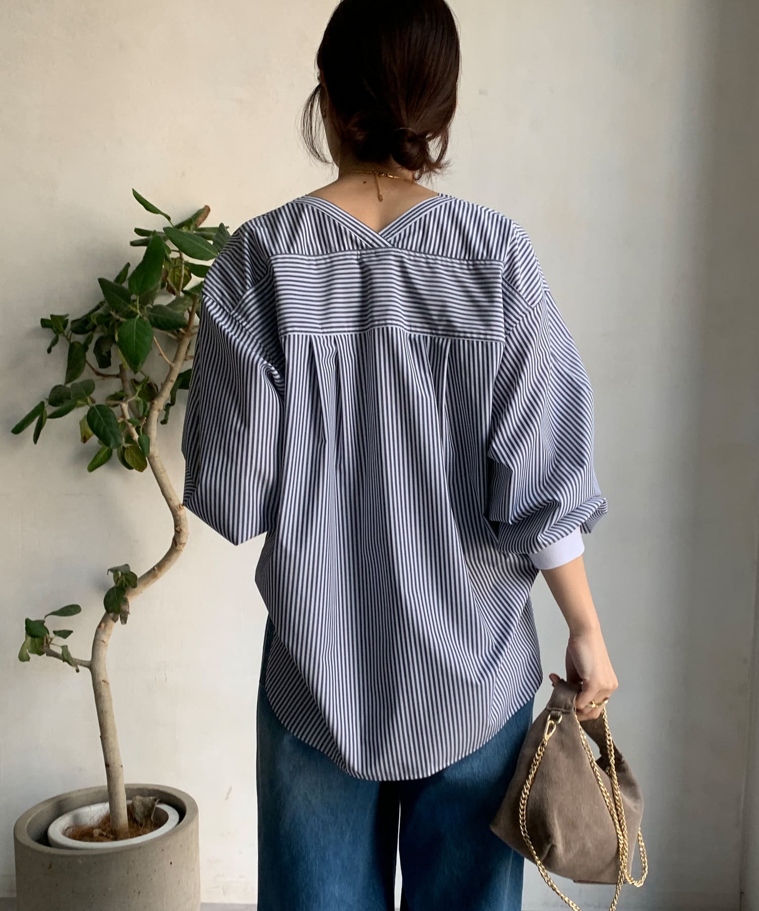 商品名が "VVシャツ" というだけあって、前後ともにVネックのデザインに。お顔周りのすっきり見えを叶えてくれます。