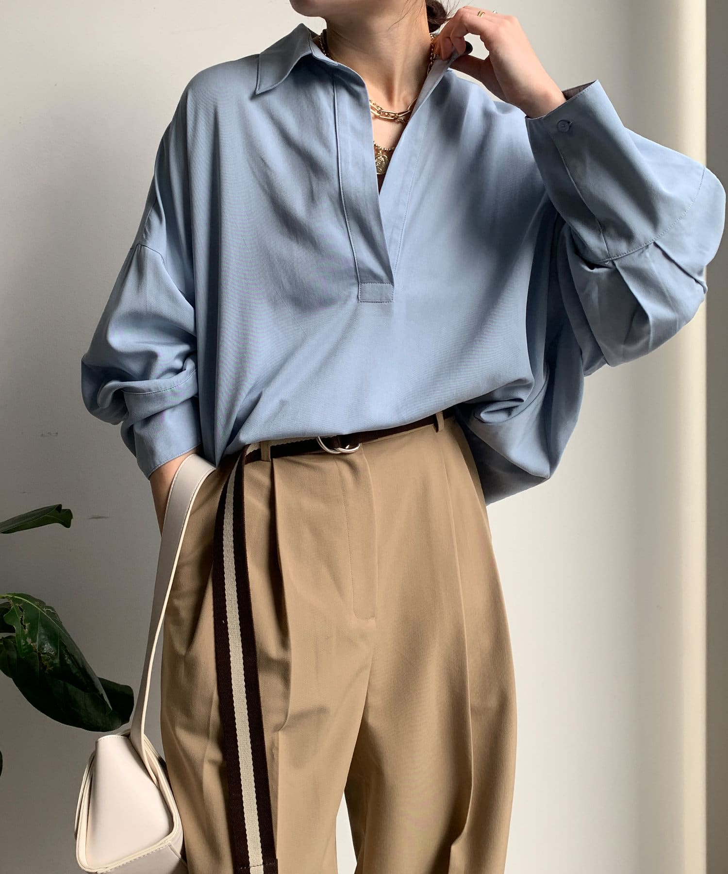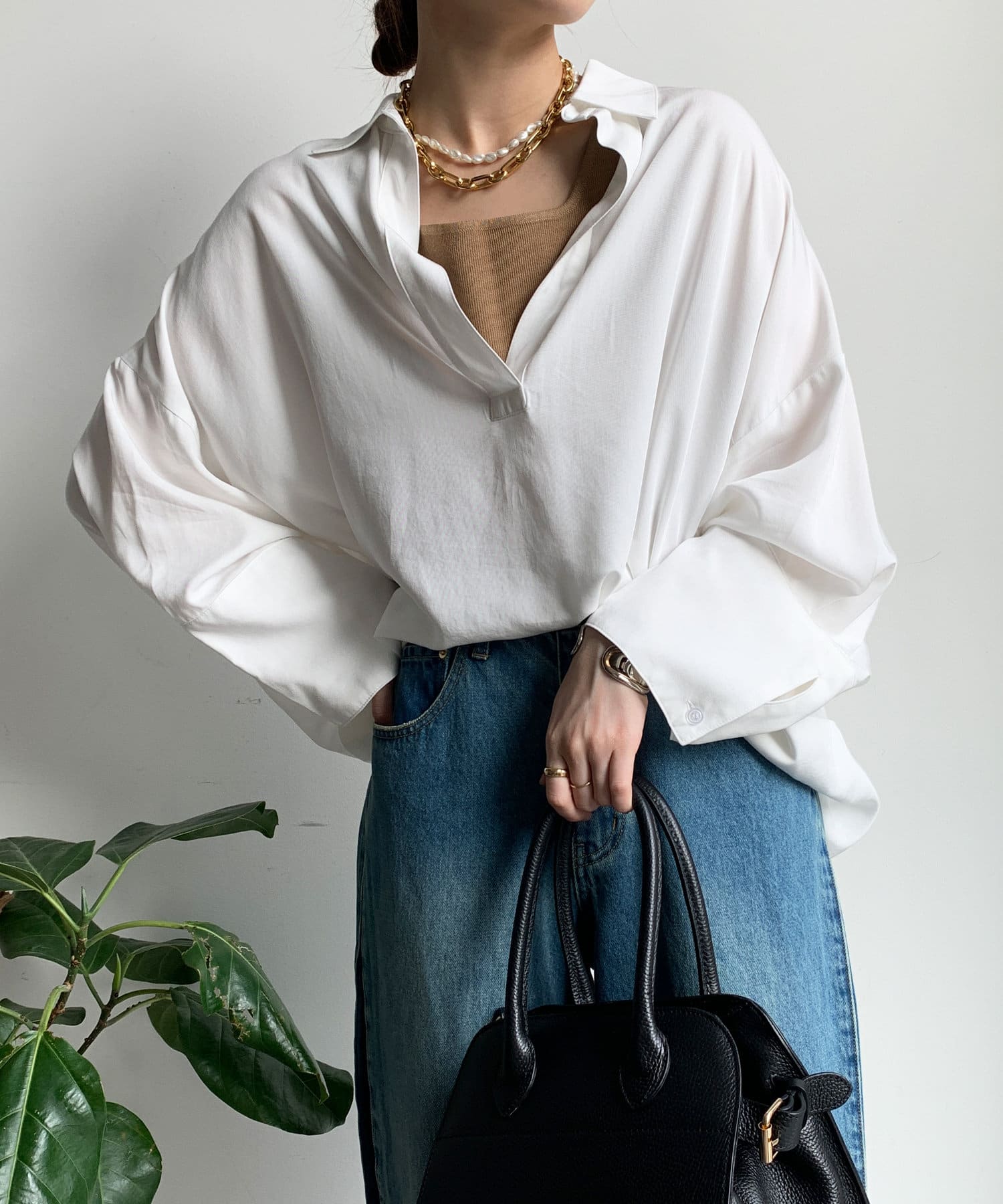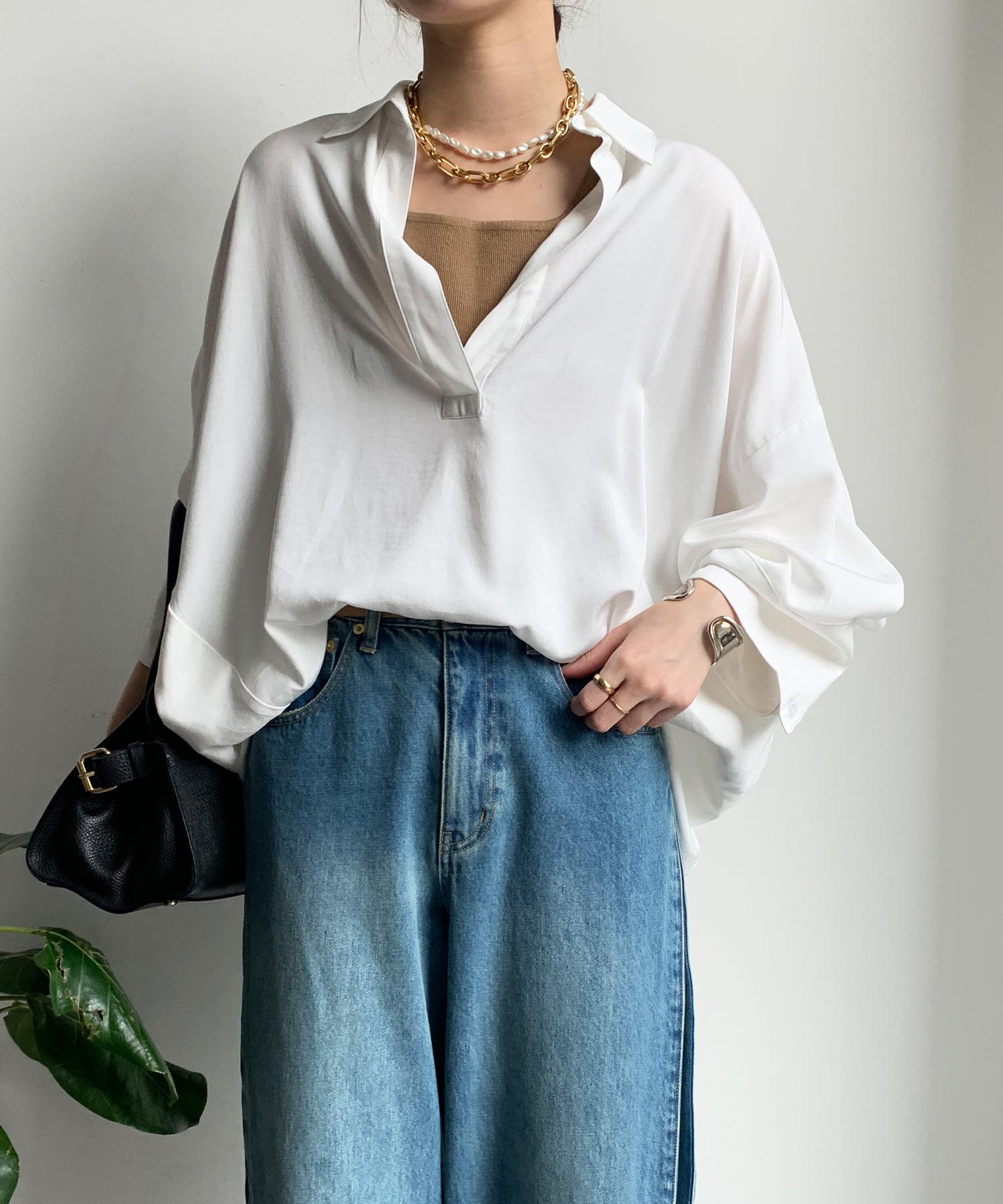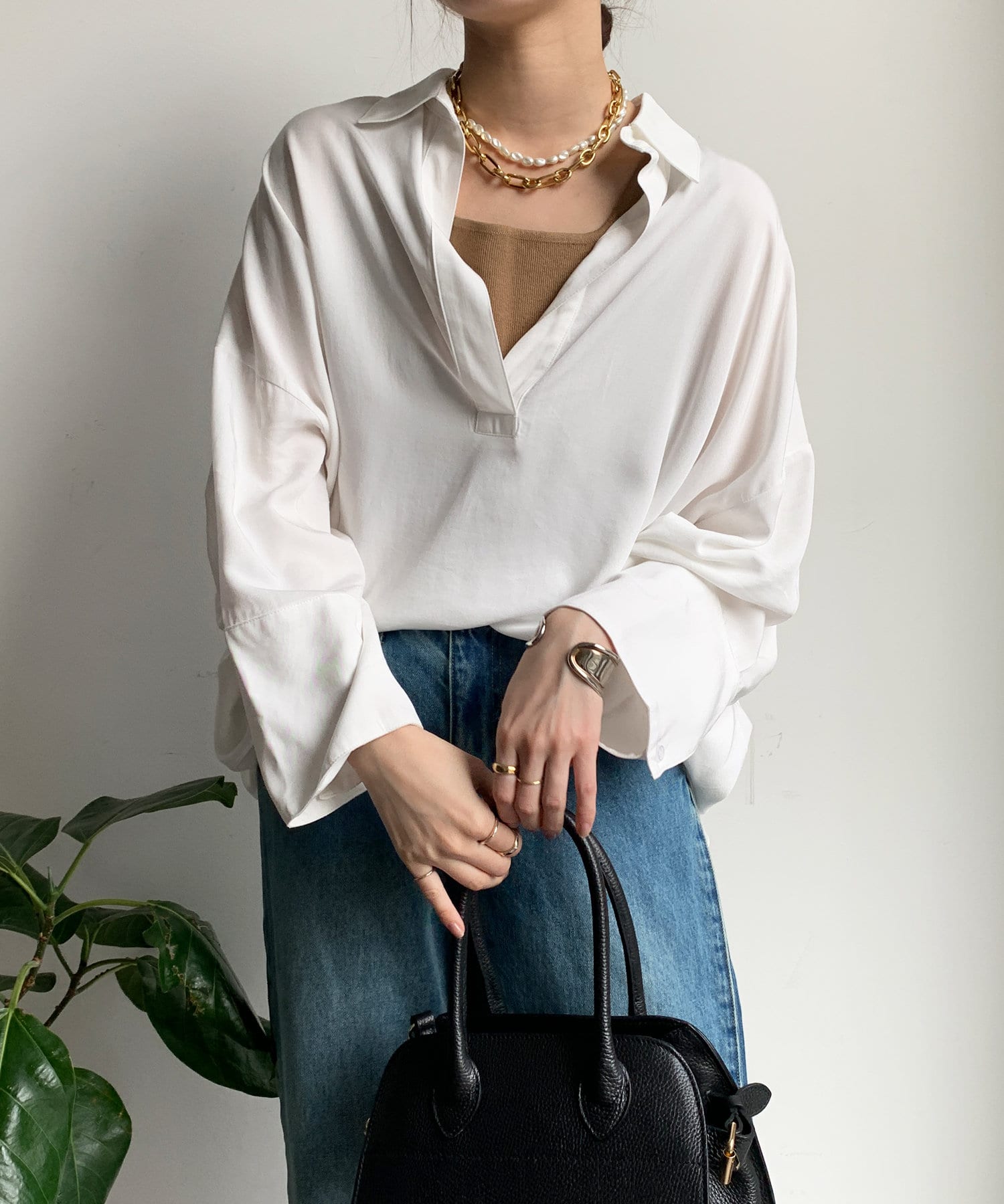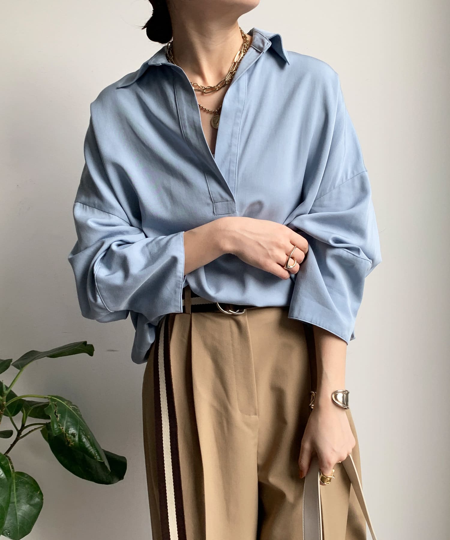 首元のスキッパーデザインは大人な雰囲気を醸し、ショートネックレスなどとも相性抜群。