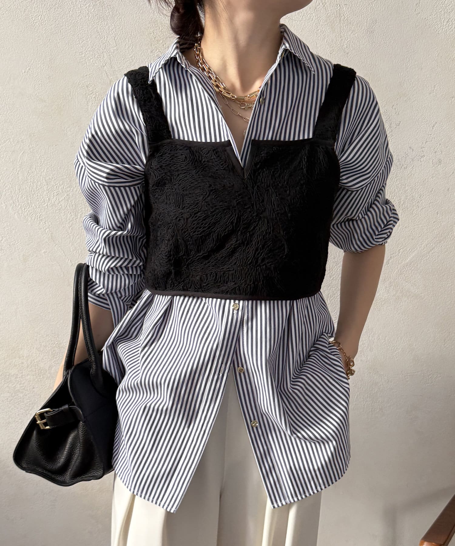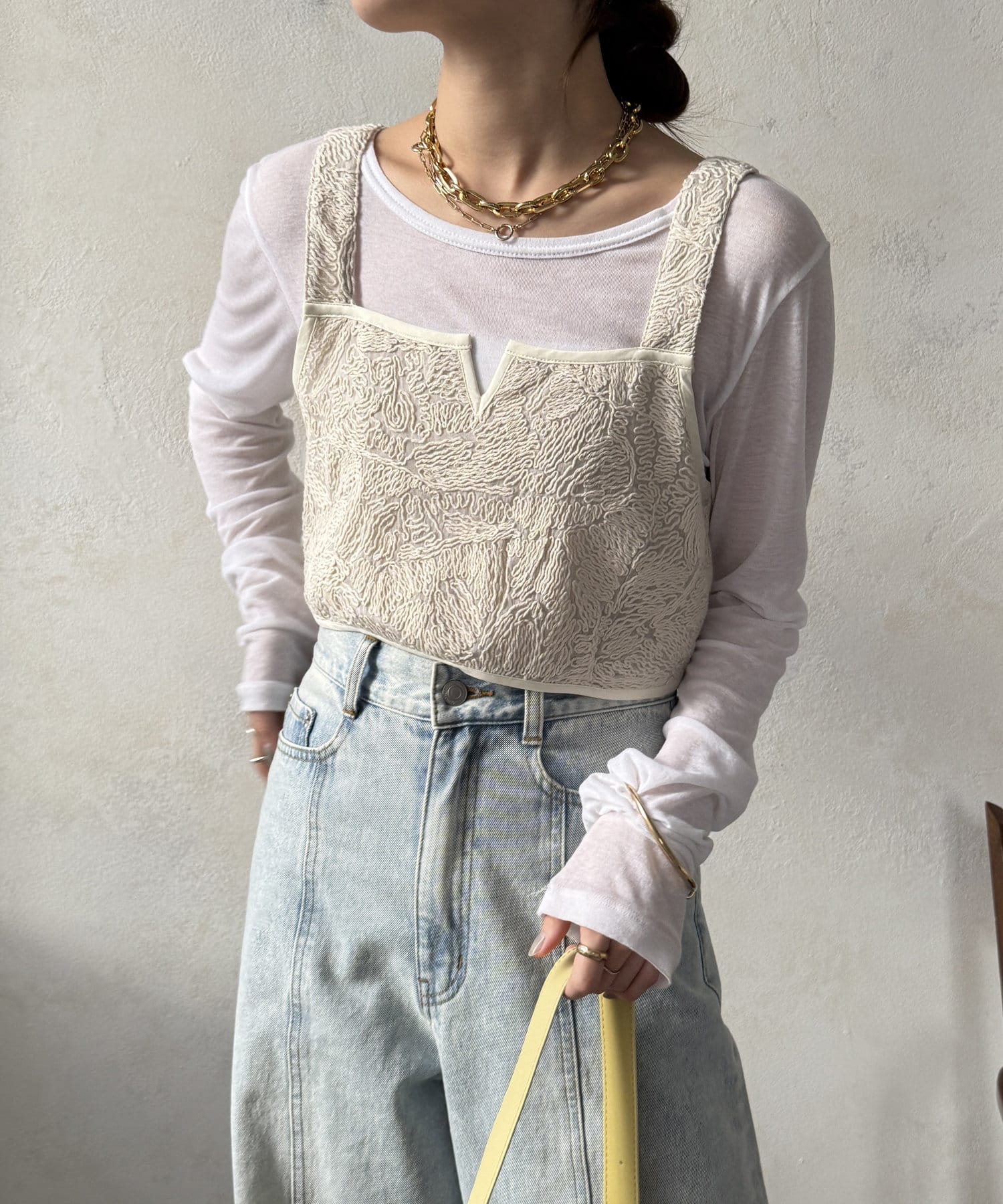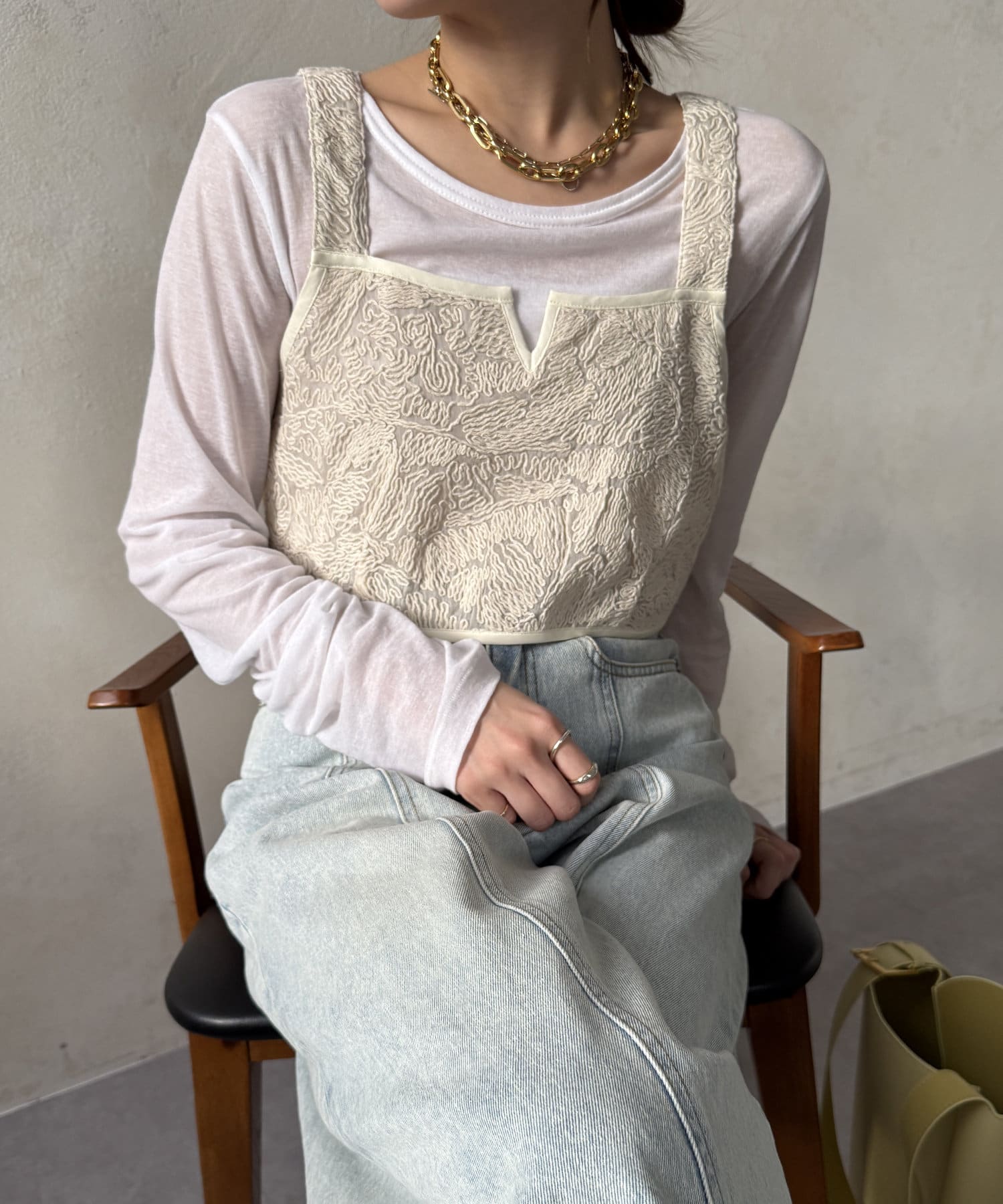 ベースにテープ刺繍が施されることで甘くなりすぎず、